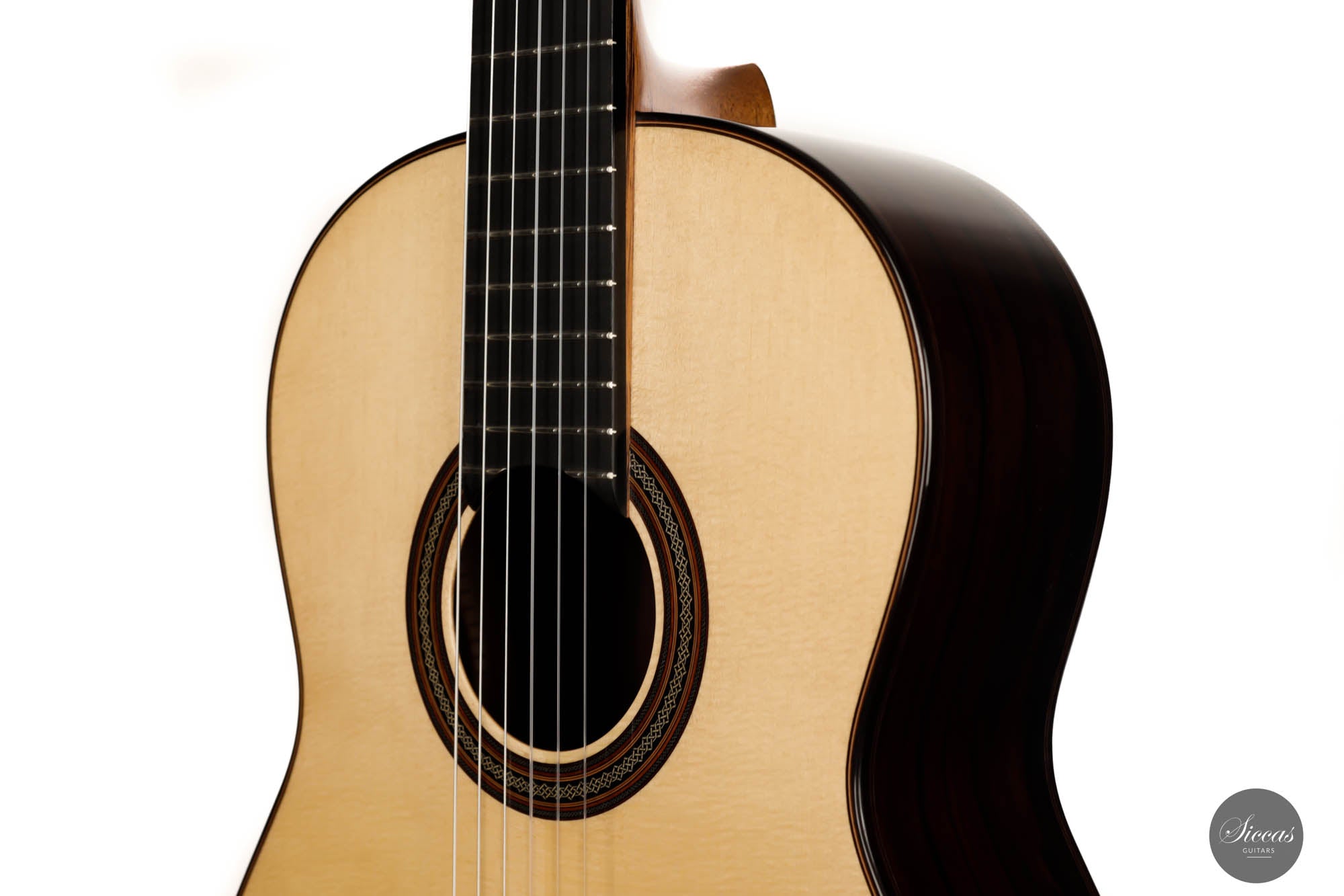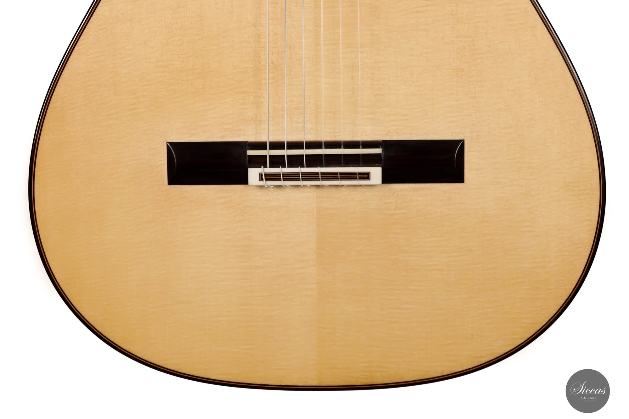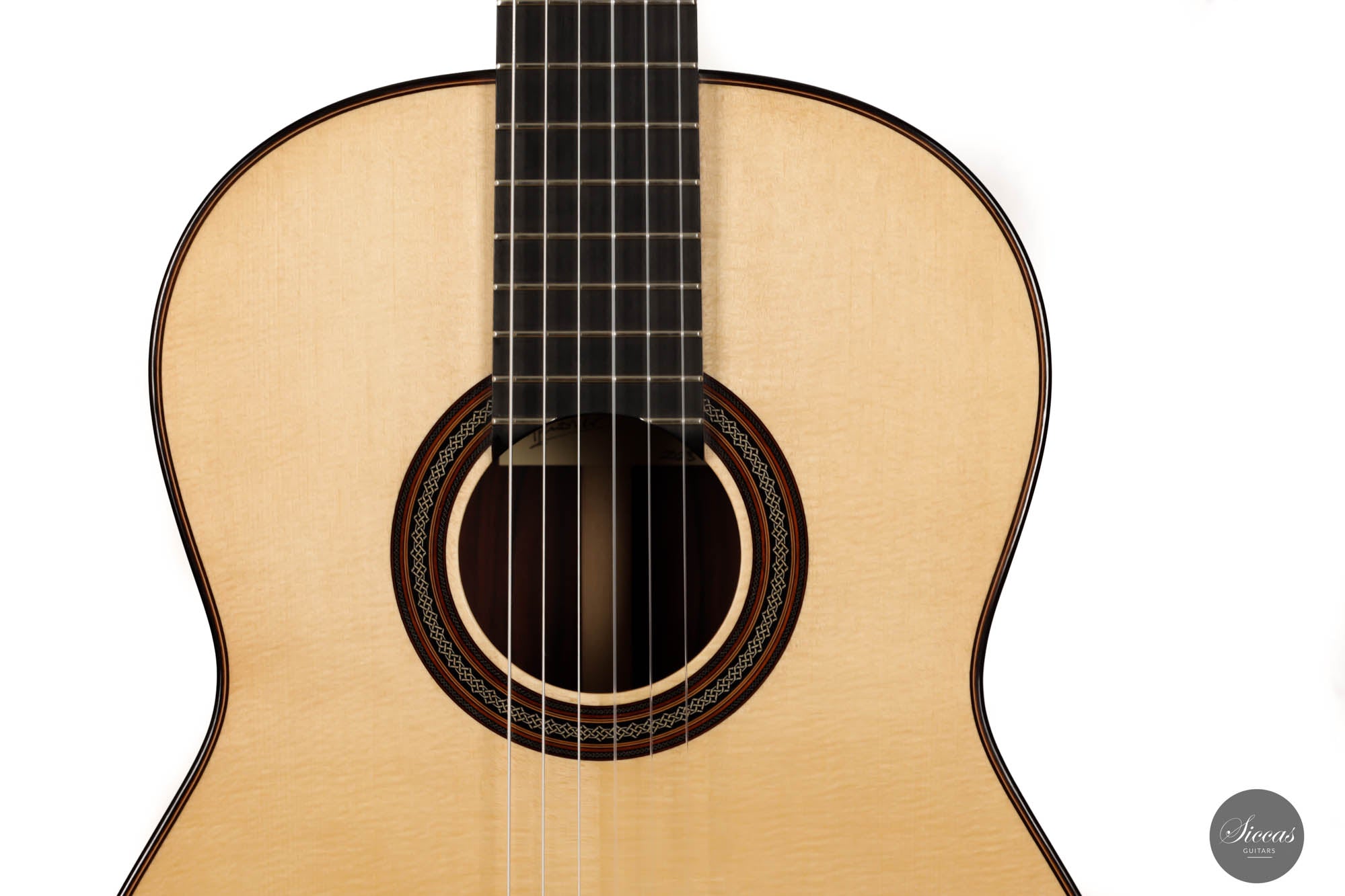 To craft this extraordinary instrument, Dietmar Heubner decided to refrain from using machines and to get as close as possible to the wood. He shaped the top, back, and sides using hand planes and scraper blades. This masterly feat of craftsmanship allowed him to control the thickness of the wood, adjust spontaneously to its characteristics, and take advantage of the possibilities and opportunities inherent in any craft. This approach is ideal in line with Dietmar’s philosophy, emphasizing that traditional construction still offers unlimited possibilities for development in terms of sound aesthetics, projection, and everything else that makes the guitar such an exceptional instrument.