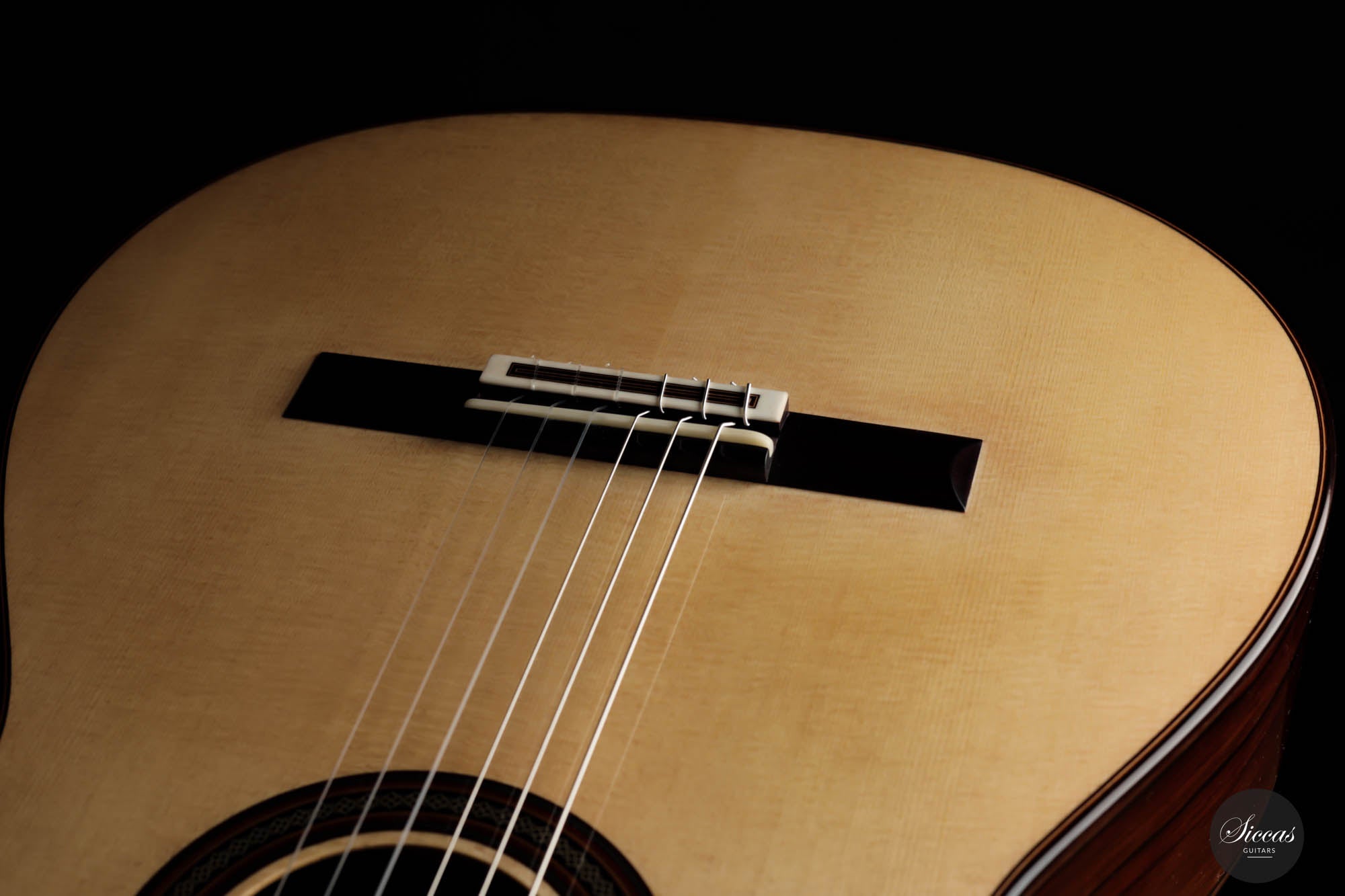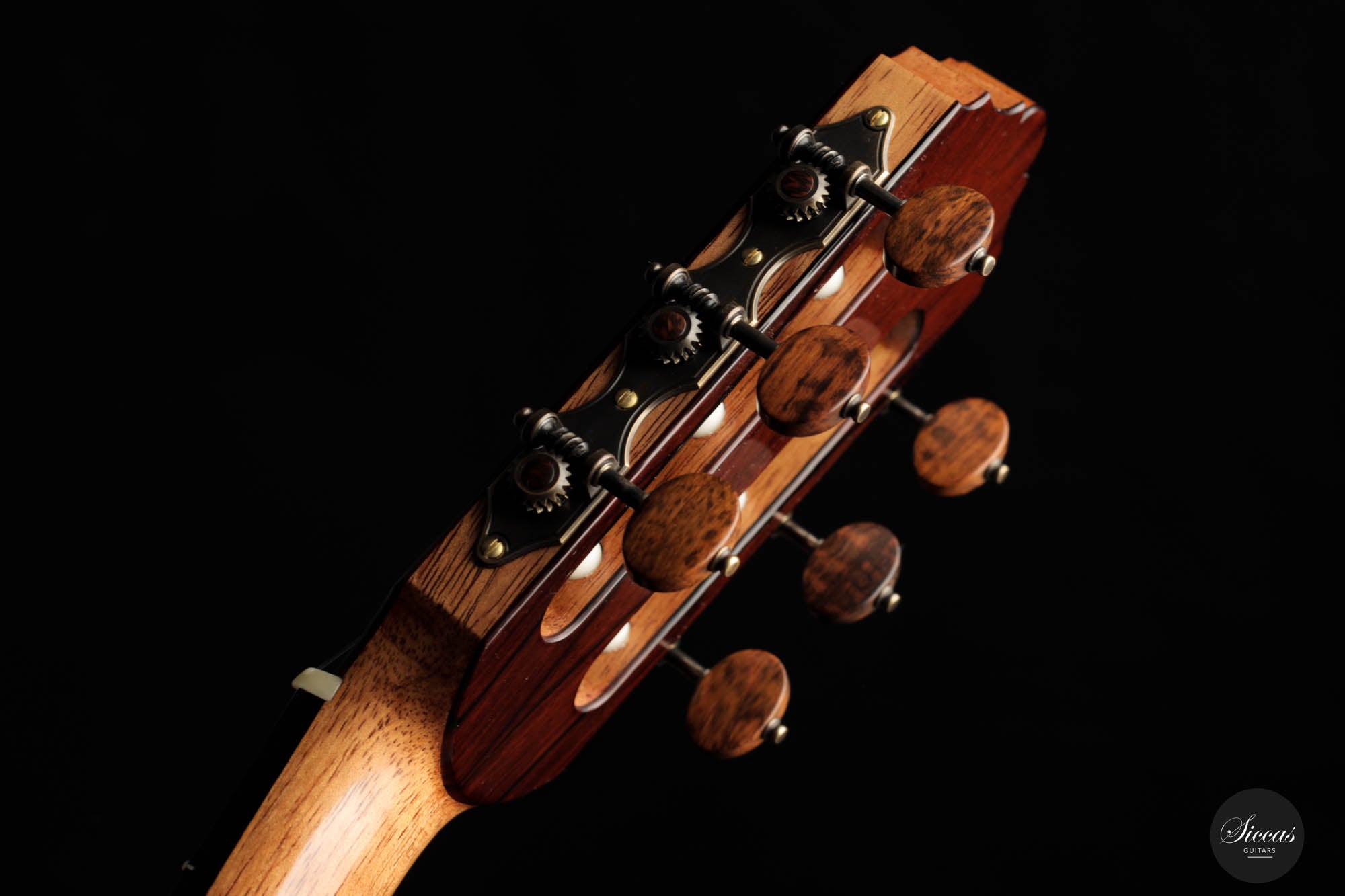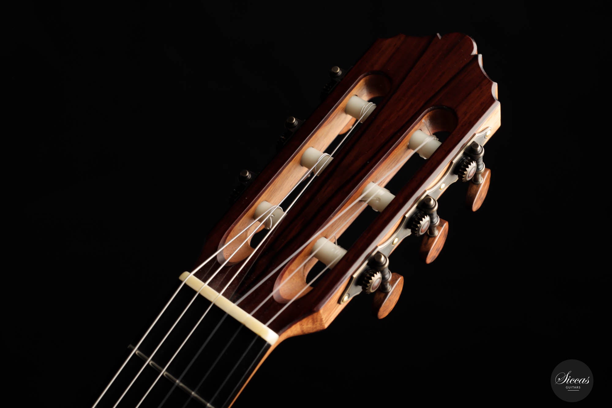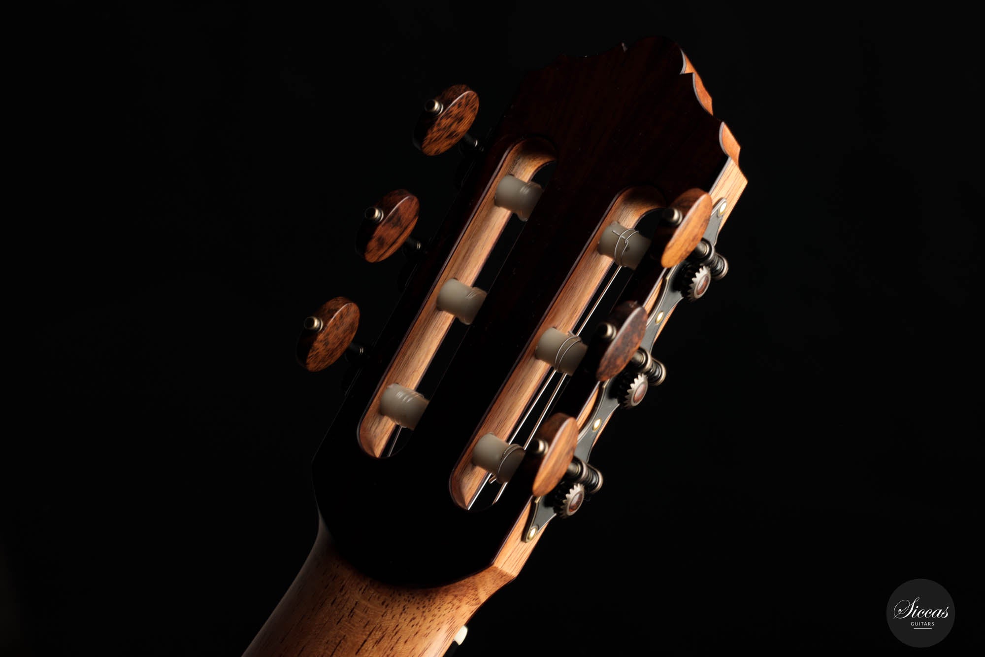 To craft this extraordinary instrument, Dietmar Heubner decided to refrain from using machines and to get as close as possible to the wood. He shaped the top, back, and sides using hand planes and scraper blades. This masterly feat of craftsmanship allowed him to control the thickness of the wood, adjust spontaneously to its characteristics, and take advantage of the possibilities and opportunities inherent in any craft. This approach is ideal in line with Dietmar’s philosophy, emphasizing that traditional construction still offers unlimited possibilities for development in terms of sound aesthetics, projection, and everything else that makes the guitar such an exceptional instrument.