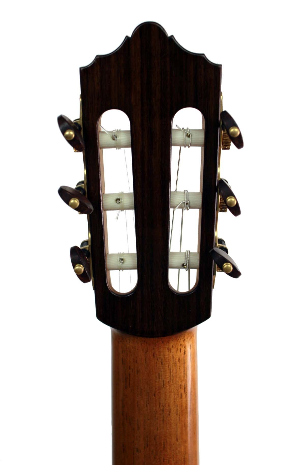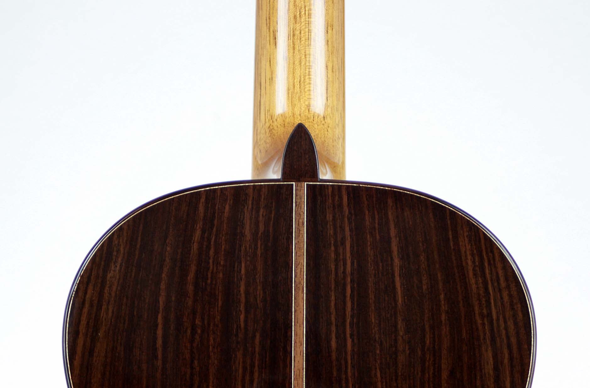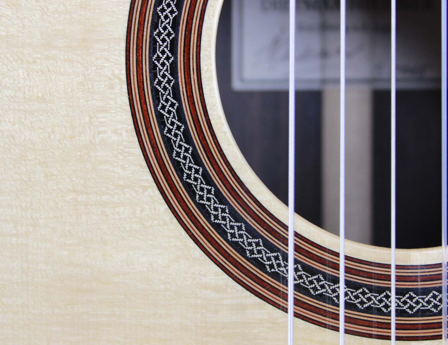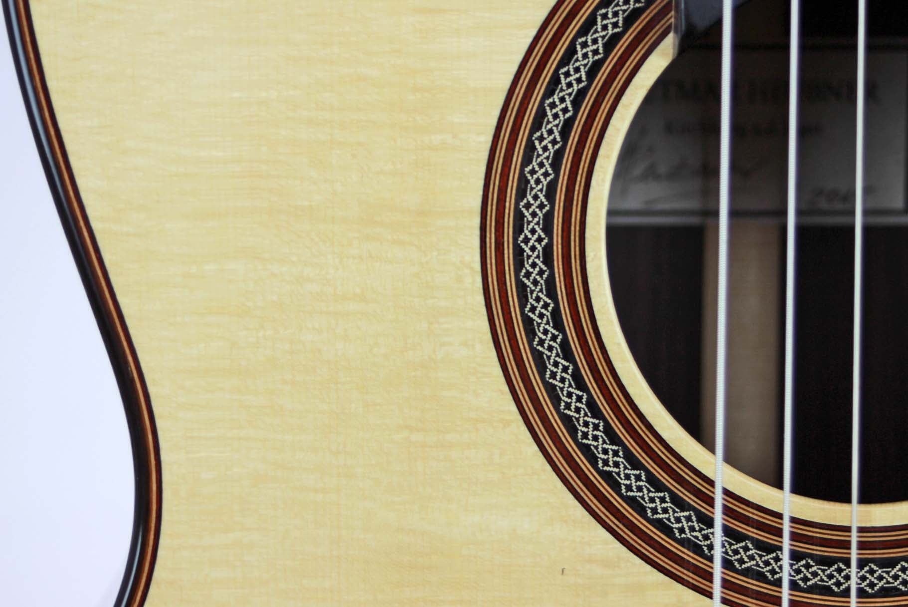 This guitar was finished by Dietmar in August 2015 and has a hazel spruce top. Finest Indian rosewood was chosen for back and sides. As a special feature the neck was reinforced internally with an additional wooden bar. The fretboard is modestly elevated to improve the playability of higher notes. The rosette is decorated with celtic ornaments that are also found on the 12 tie block. The quality machine tuners are made by Scheller.