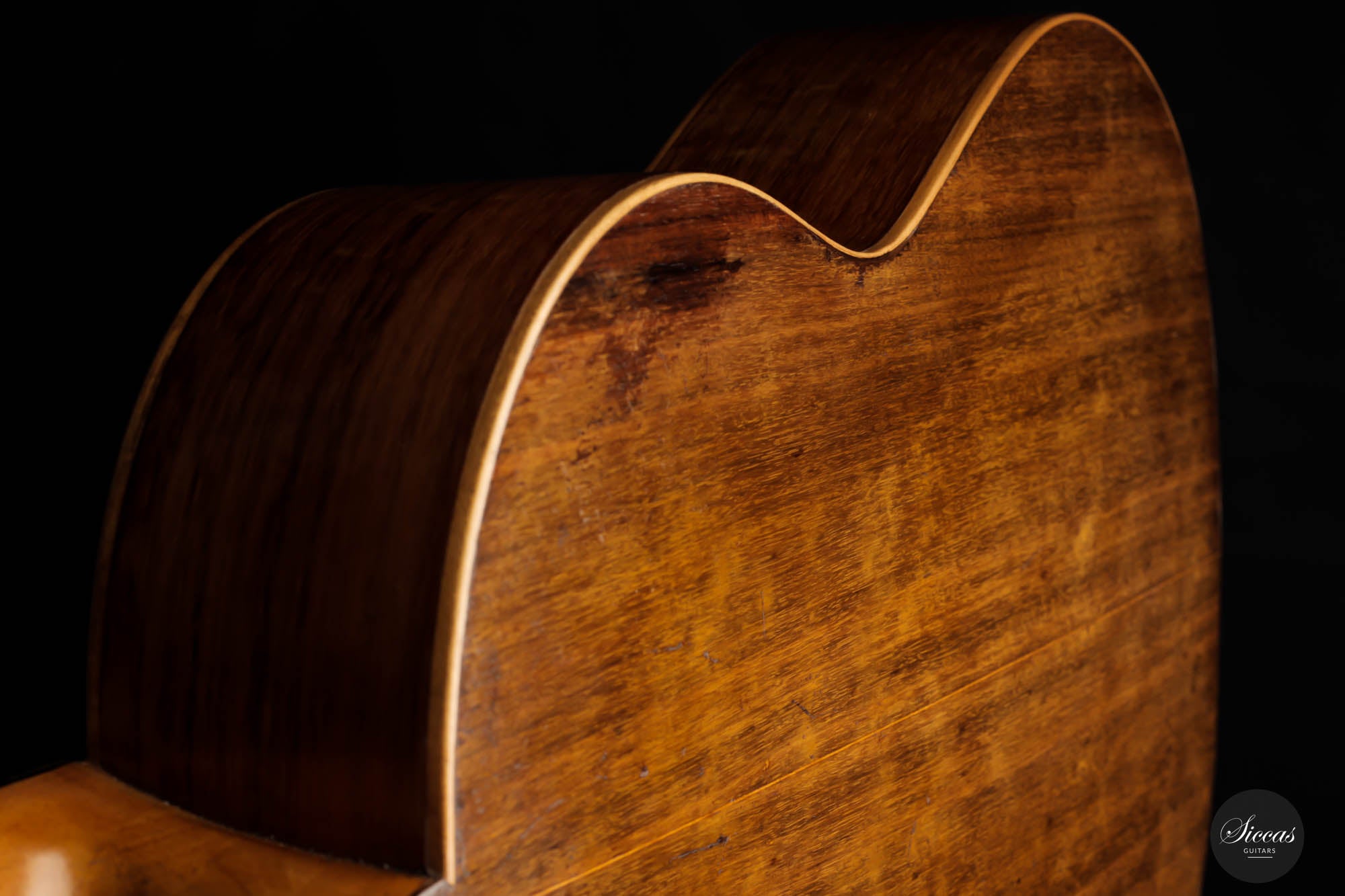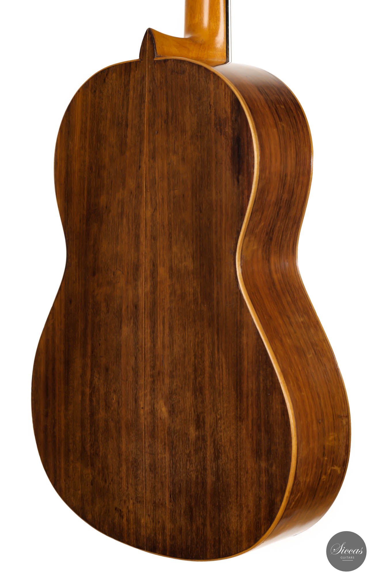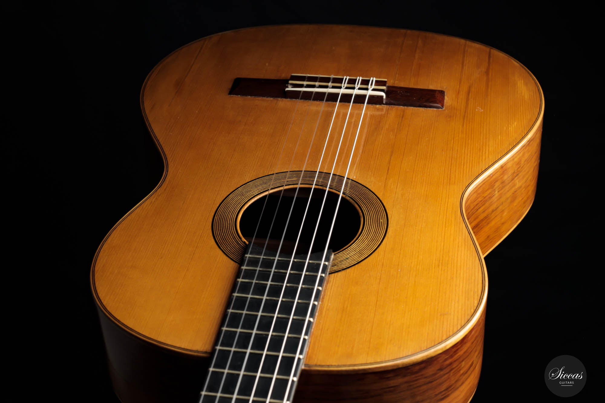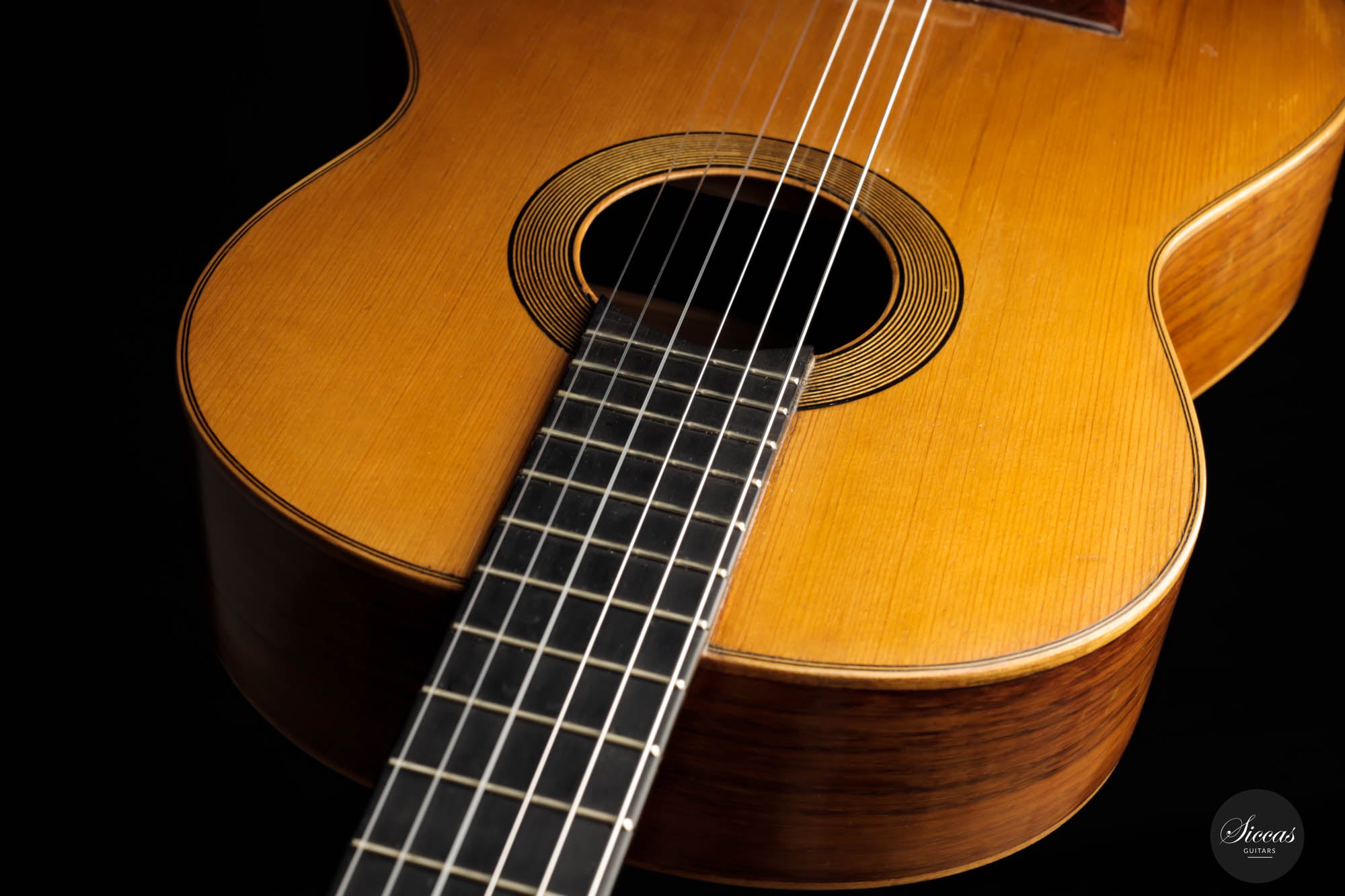 Im Jahr 1930, im Alter von 48 Jahren, baute Domingo Esteso diese großartige Gitarre auf dem Höhepunkt seiner Karriere. Es ist ein seltenes Modell mit Boden und Zargen aus Rio-Palisander, das Estesos berühmtes puristisches Design mit einfachen und sehr ansprechenden Linien und Einlagen aufweist. Die Rosette im französischen Stil ist von höchster Eleganz, und die Kopfplatte ist die aufwendigste von Estesos Modellen, die an die wertvollsten Modelle aus der Werkstatt von Manuel Ramirez erinnert. Diese Gitarre wurde von dem renommierten italienischen Geigenbauer Gabriele Lodi in Carpi wunderschön restauriert. Der Steg wurde ersetzt und die Risse wurden fachmännisch mit sehr dünnen Fichtenflicken repariert. Die Restaurierung ist eine meisterhafte Arbeit, bei der es gelungen ist, den fantastischen und authentischen Klang dieser Domingo Esteso sowie ihre phänomenale Ansprache zu bewahren.