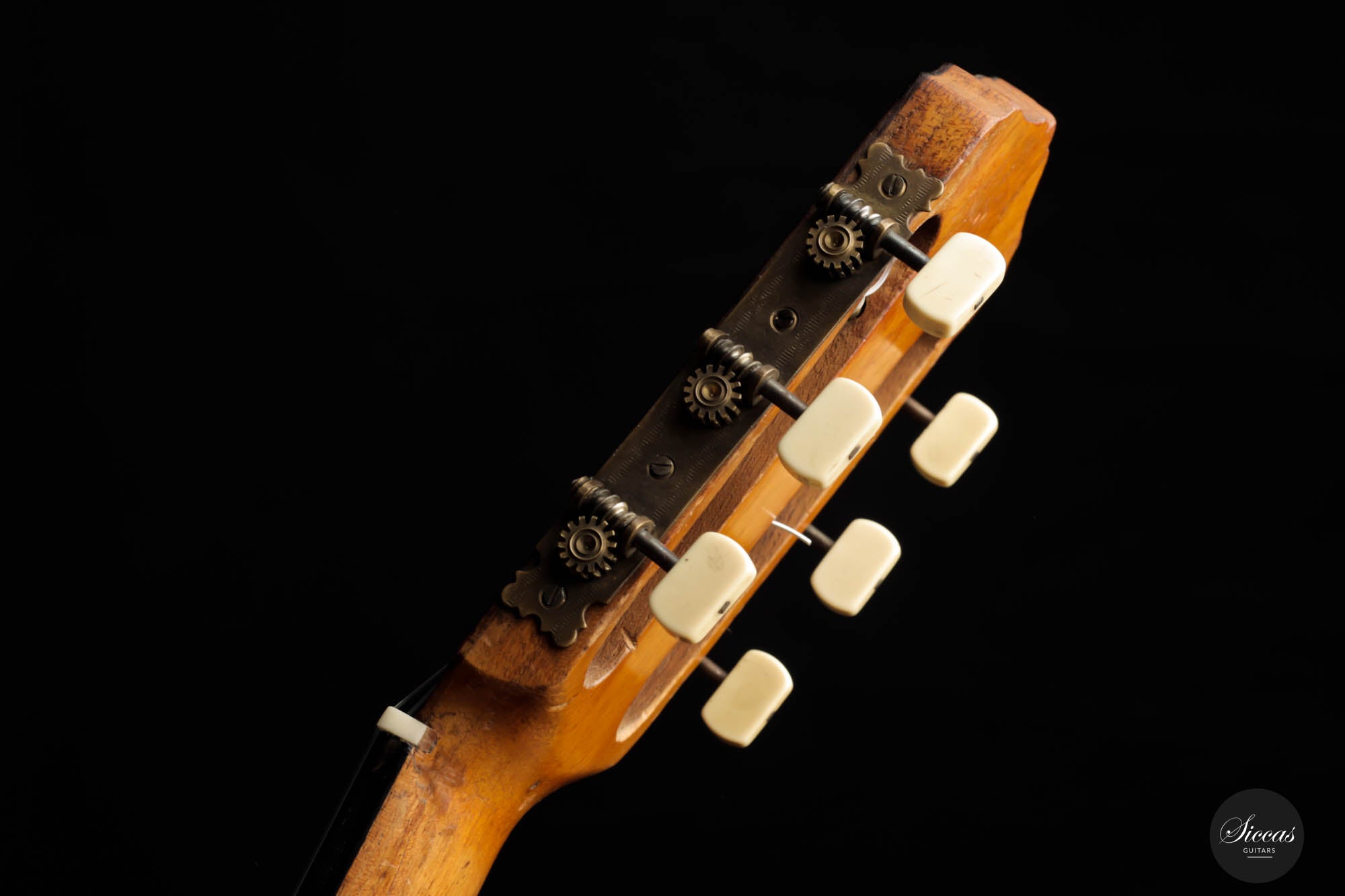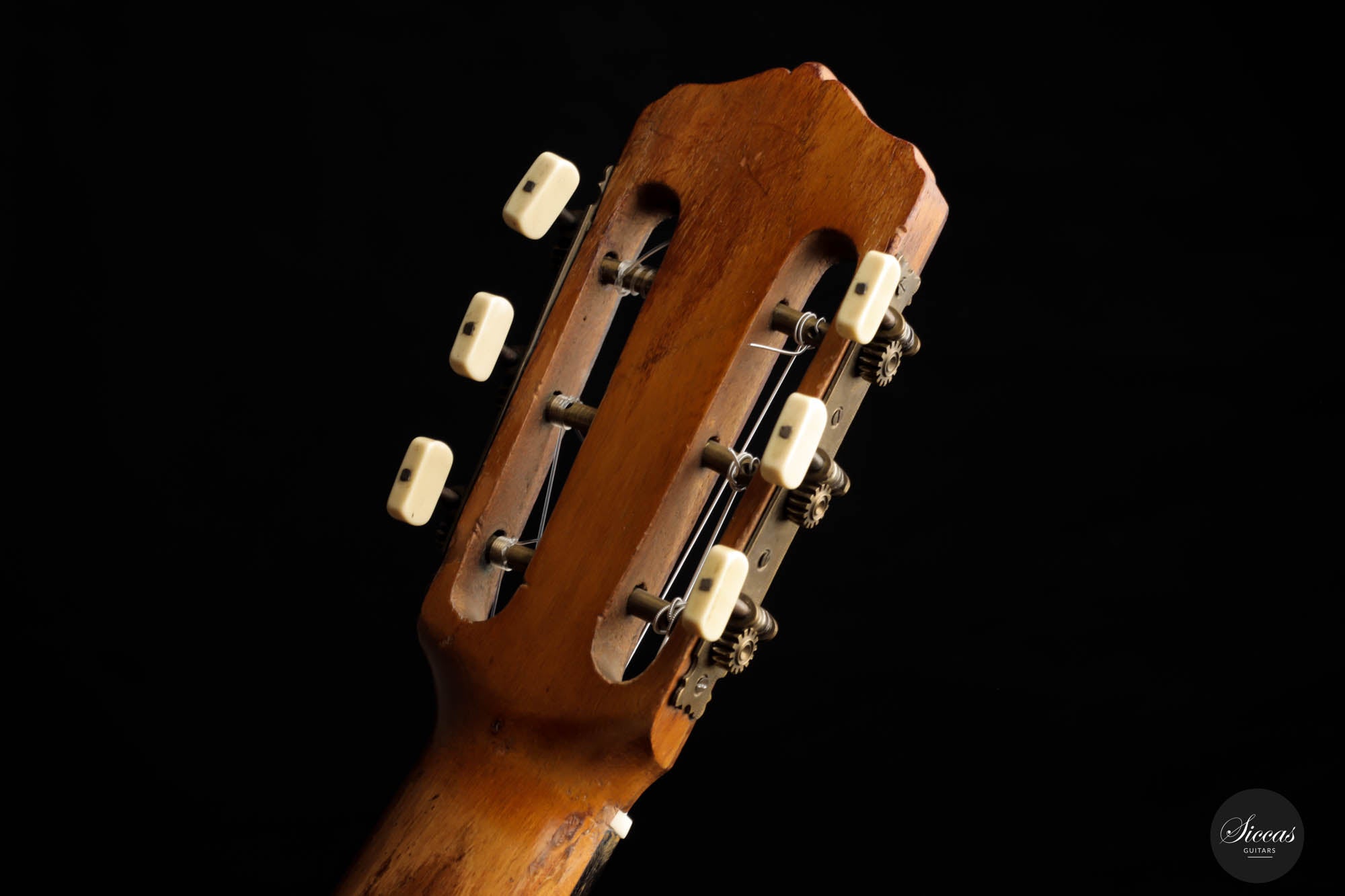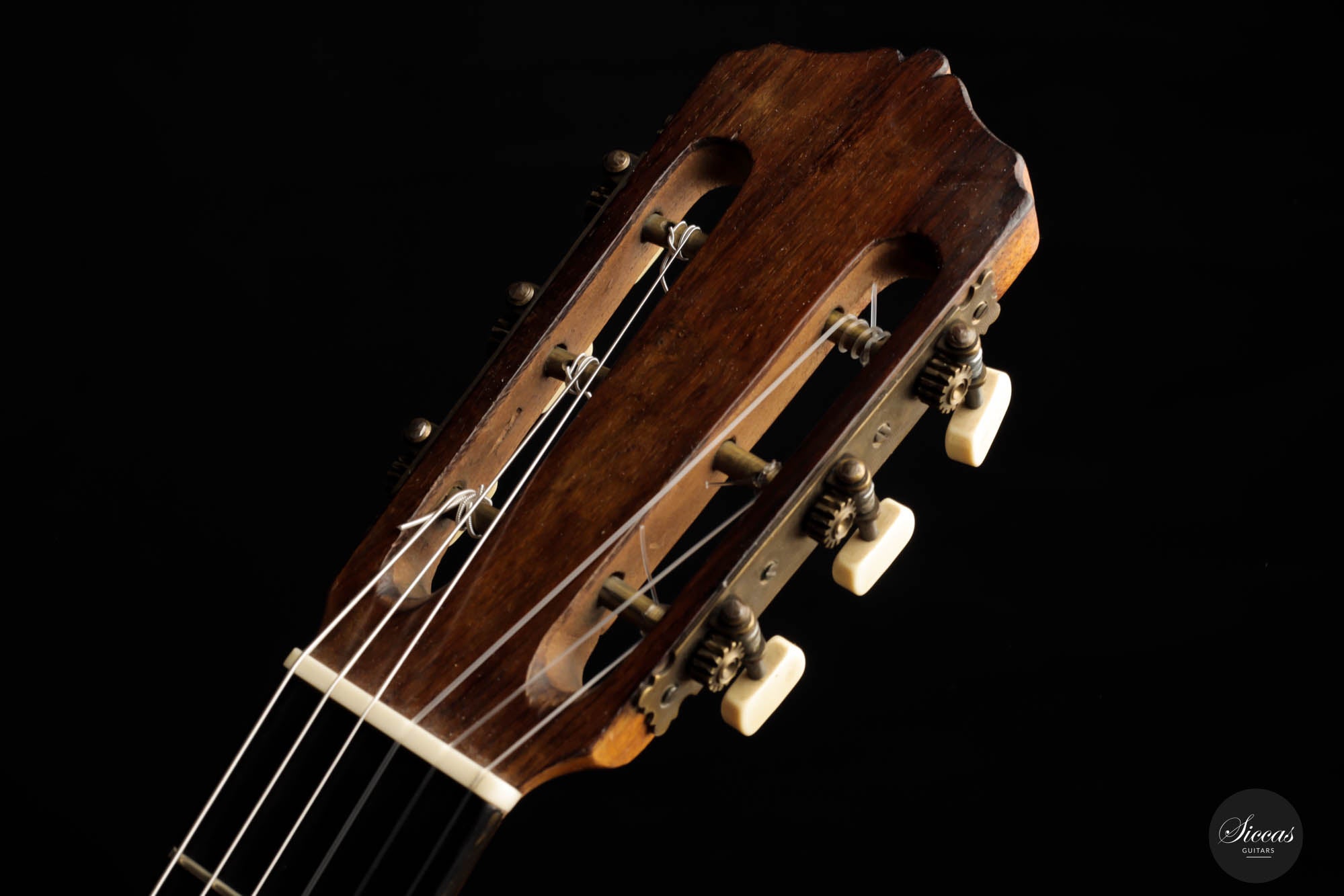Dieses Instrument ist so lebendig, verspielt und reich an Klangfarben, dass man kaum glauben kann, dass es bald ein ganzes Jahrhundert alt ist. Der Kopf ist mit Mechaniken aus der Entstehungszeit ausgestattet, könnte aber ursprünglich ein Wirbelkopf gewesen sein, der bald nach dem Bau geändert wurde. Alles in allem ist sie ein Meisterwerk der Handwerkskunst und klanglich sicherlich eine der besten Domingo Esteso, die wir je spielen durften, mit einem Wort, die Quintessenz des spanischen Klangs zu Beginn des 20. Jahrhunderts.