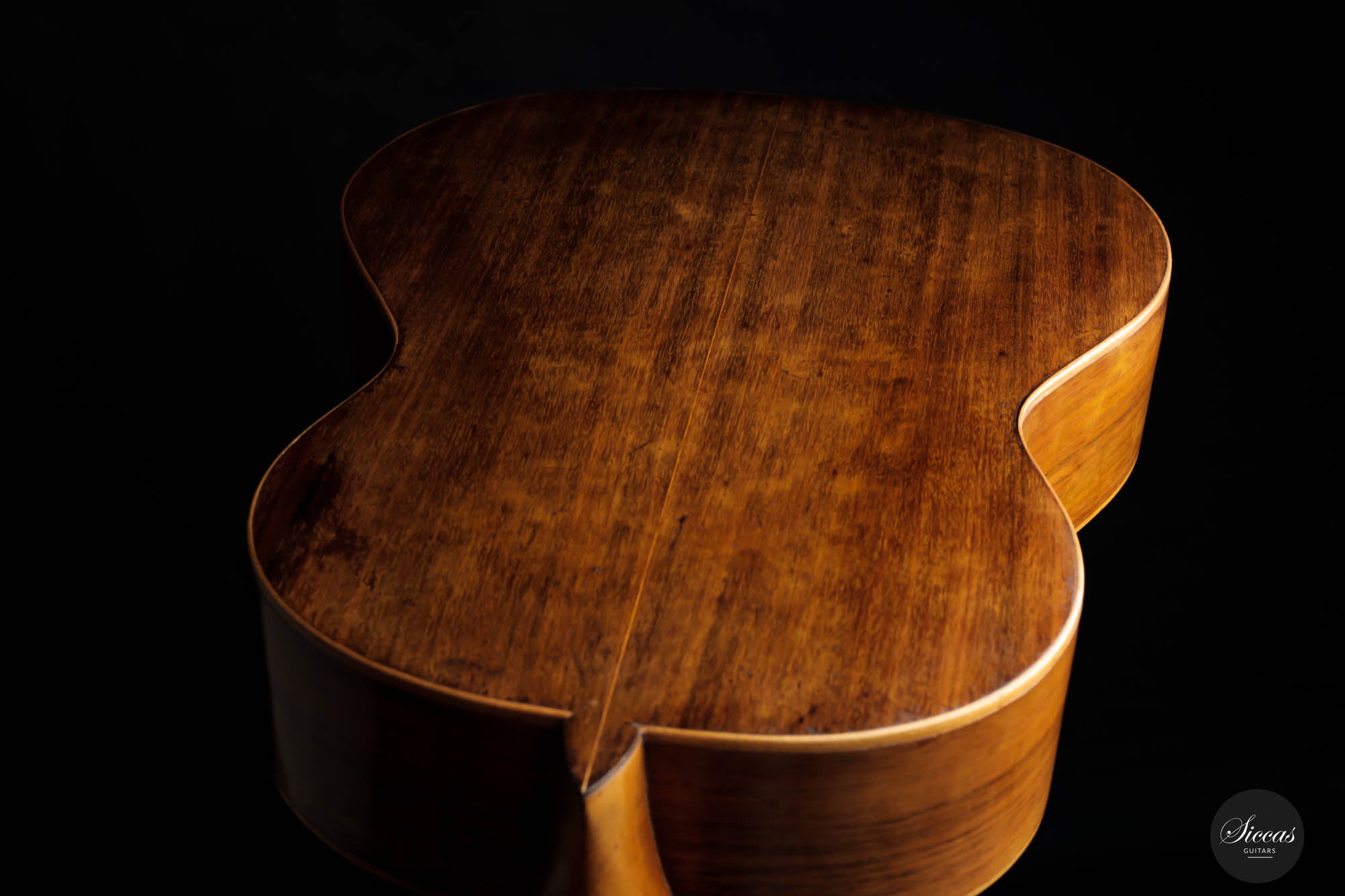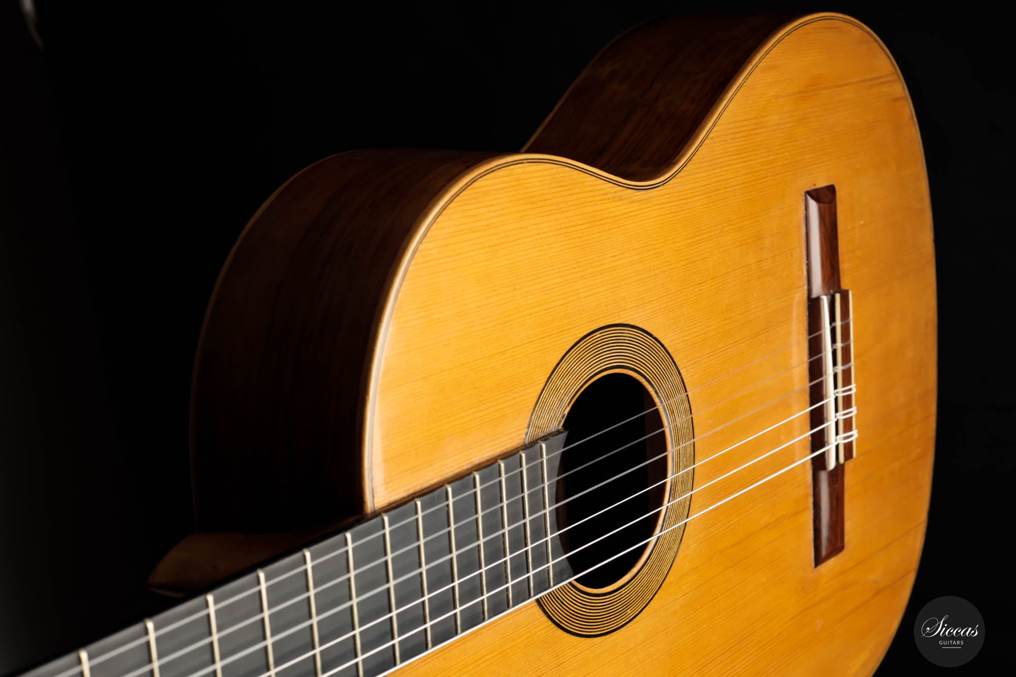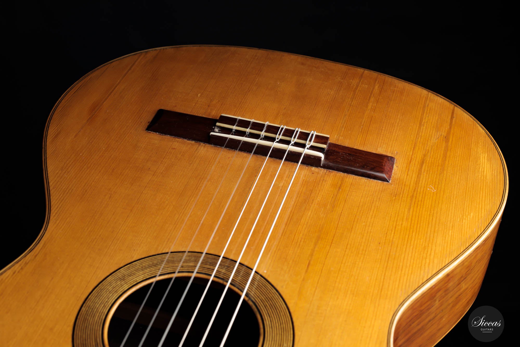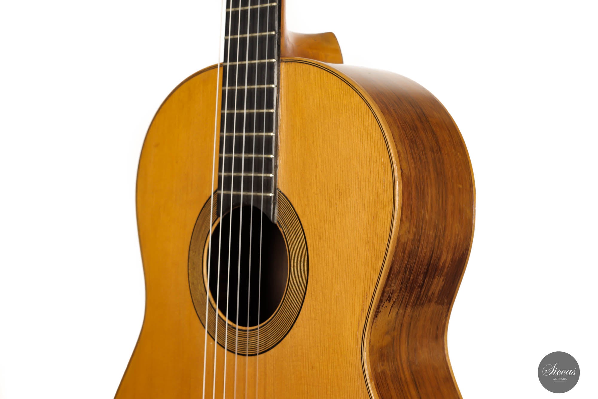 Dieses Instrument ist so lebendig, verspielt und reich an Klangfarben, dass man kaum glauben kann, dass es bald ein ganzes Jahrhundert alt ist. Der Kopf ist mit Mechaniken aus der Entstehungszeit ausgestattet, könnte aber ursprünglich ein Wirbelkopf gewesen sein, der bald nach dem Bau geändert wurde. Alles in allem ist sie ein Meisterwerk der Handwerkskunst und klanglich sicherlich eine der besten Domingo Esteso, die wir je spielen durften, mit einem Wort, die Quintessenz des spanischen Klangs zu Beginn des 20. Jahrhunderts.