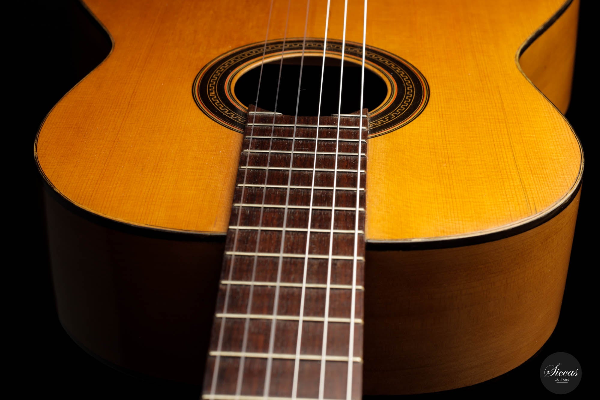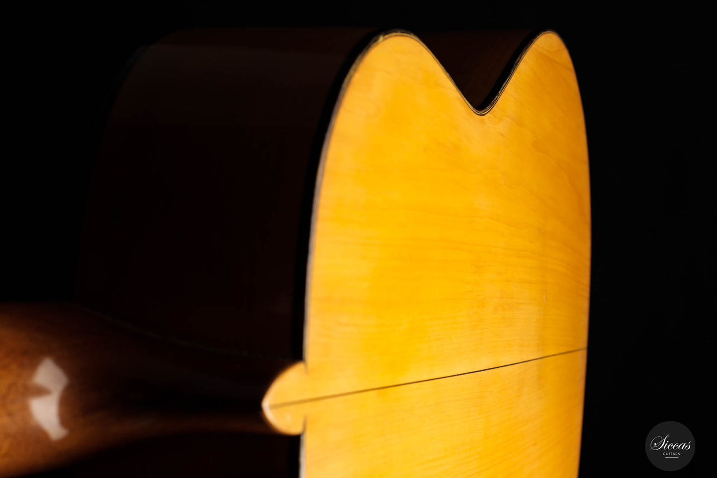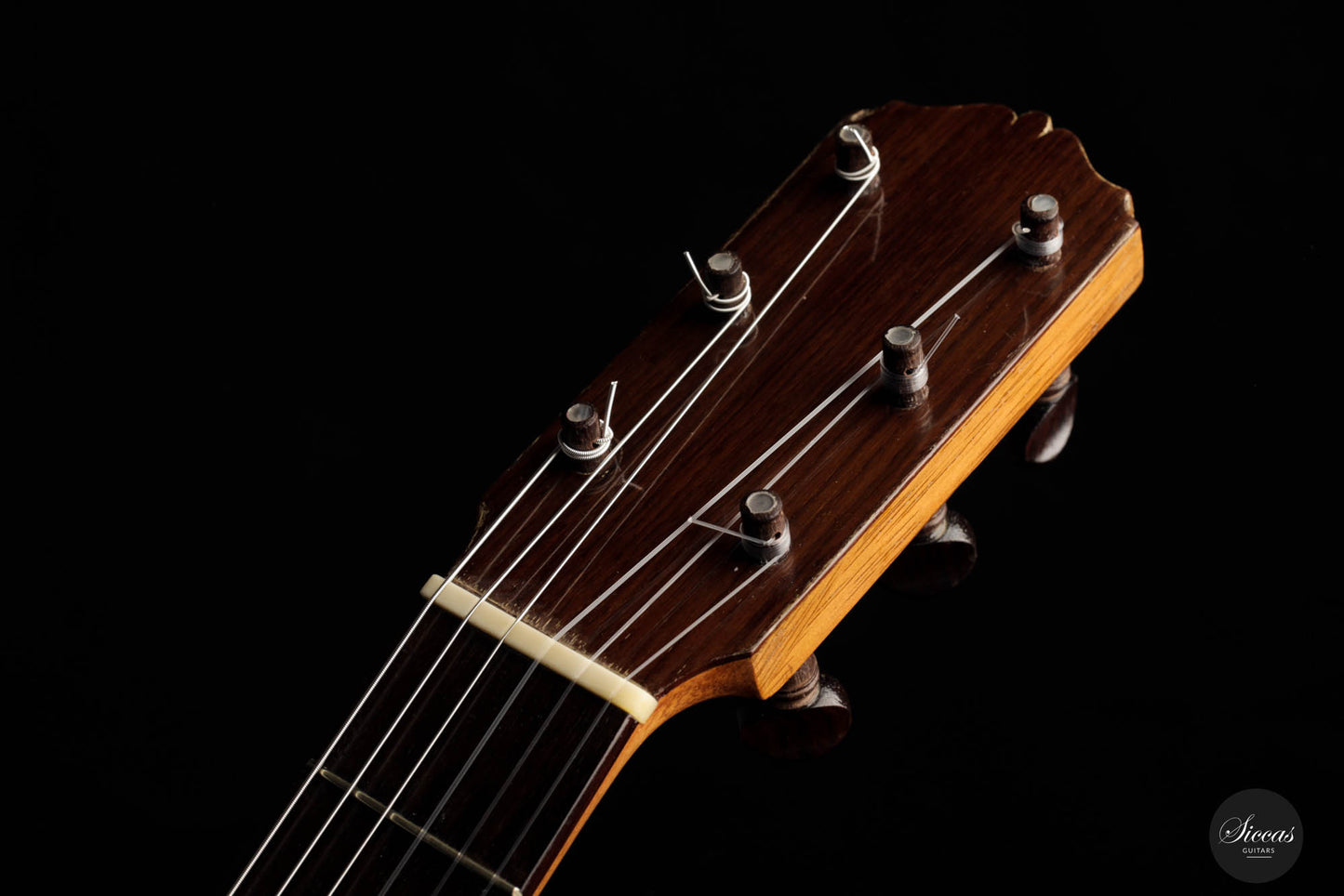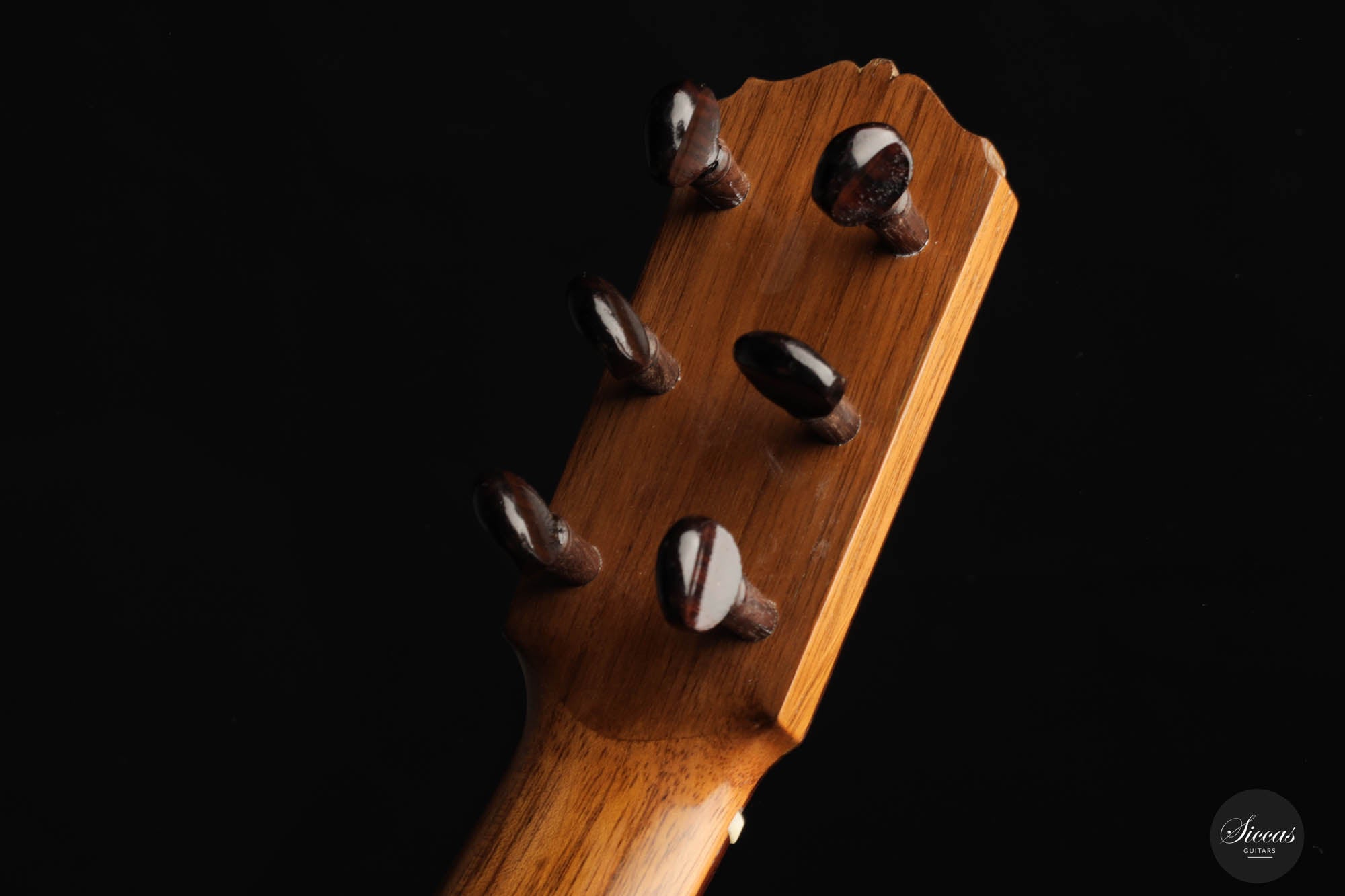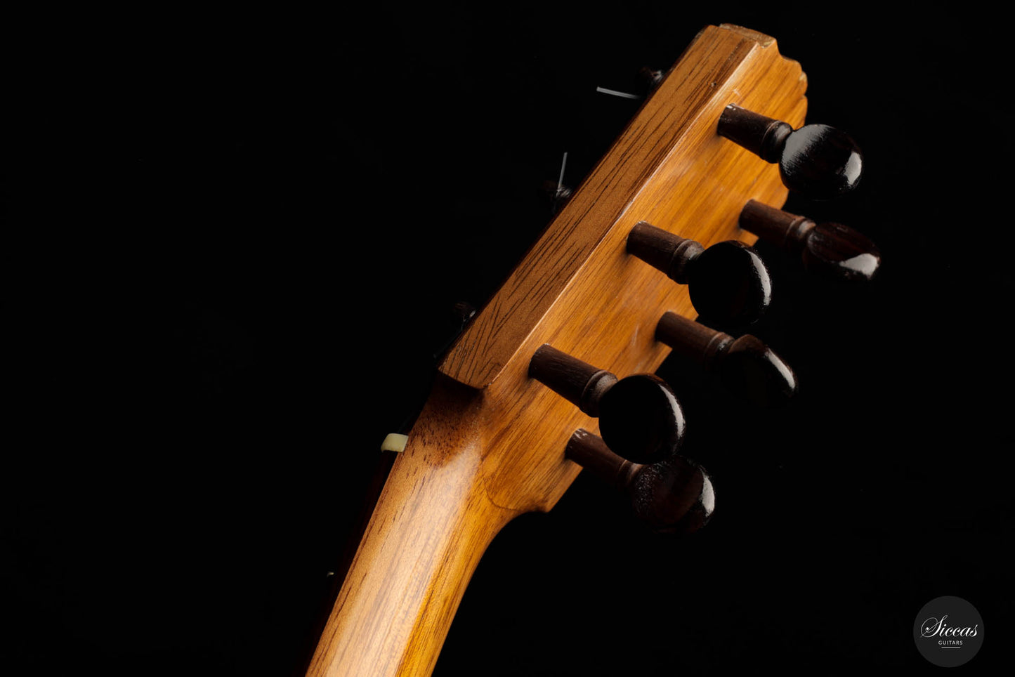 Trotz ihres Alters ist die Gitarre von Domingo Esteso aus dem Jahr 1931 strukturell einwandfrei. Die Decke weist vier reparierte und geleimte Risse auf, von denen zwei durch dünne Holzlatten verstärkt sind. Auch der Boden weist zwei geleimte Risse auf, die alle von erfahrenen Fachleuten sorgfältig stabilisiert und restauriert wurden. Mit einem Gewicht von nur 1115 Gramm bietet diese leichte Gitarre ein sehr angenehmes Spielerlebnis. Ihre Hauptresonanz von F/F# zeichnet sich durch satte, dunkle Bässe und zarte, luftige Höhen aus, die zu einer fesselnden Klangbalance beitragen. Das Instrument zeichnet sich außerdem durch seine hölzernen Wirbelköpfe im Flamenco-Stil aus, eine Anspielung auf die traditionelle spanische Ästhetik.