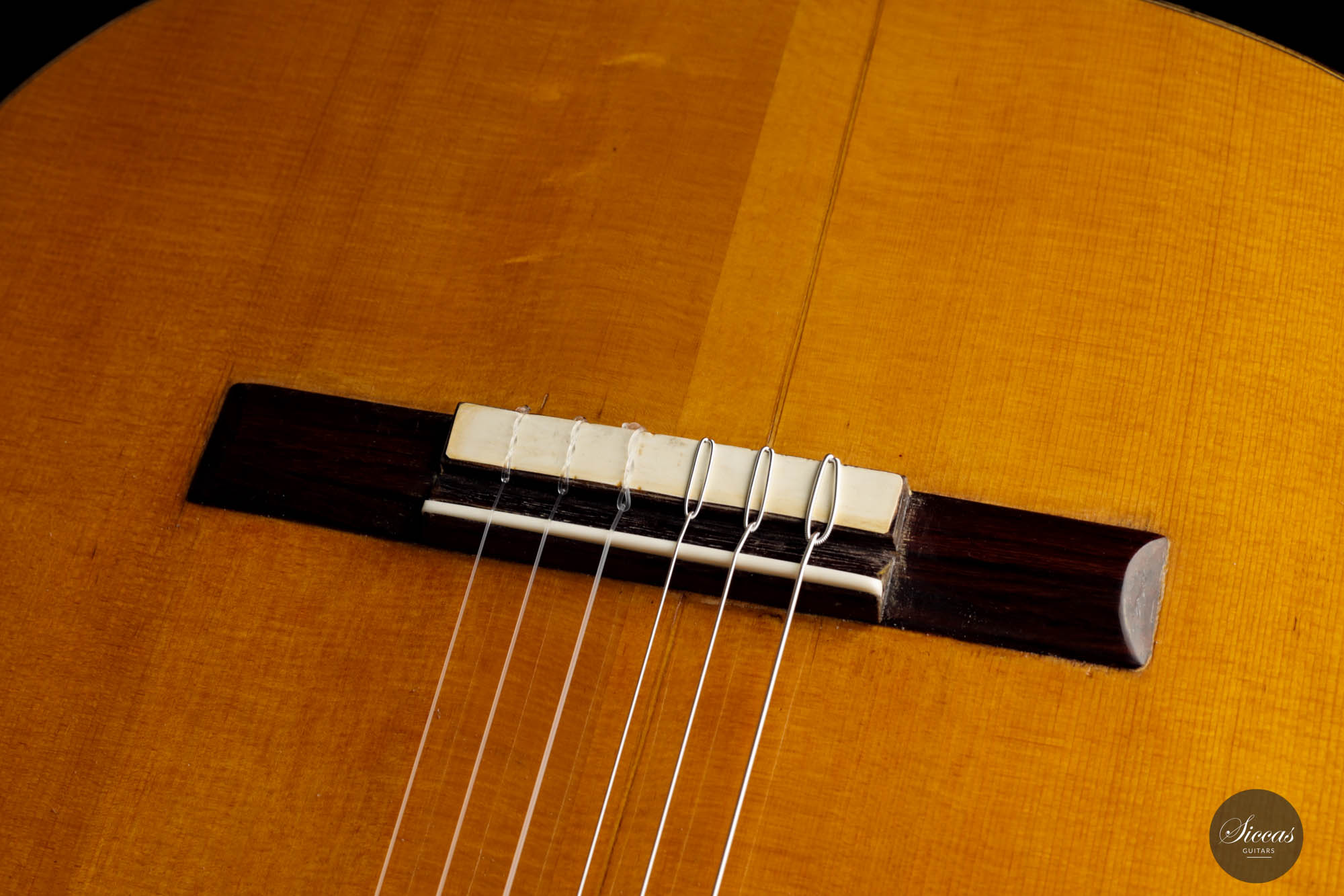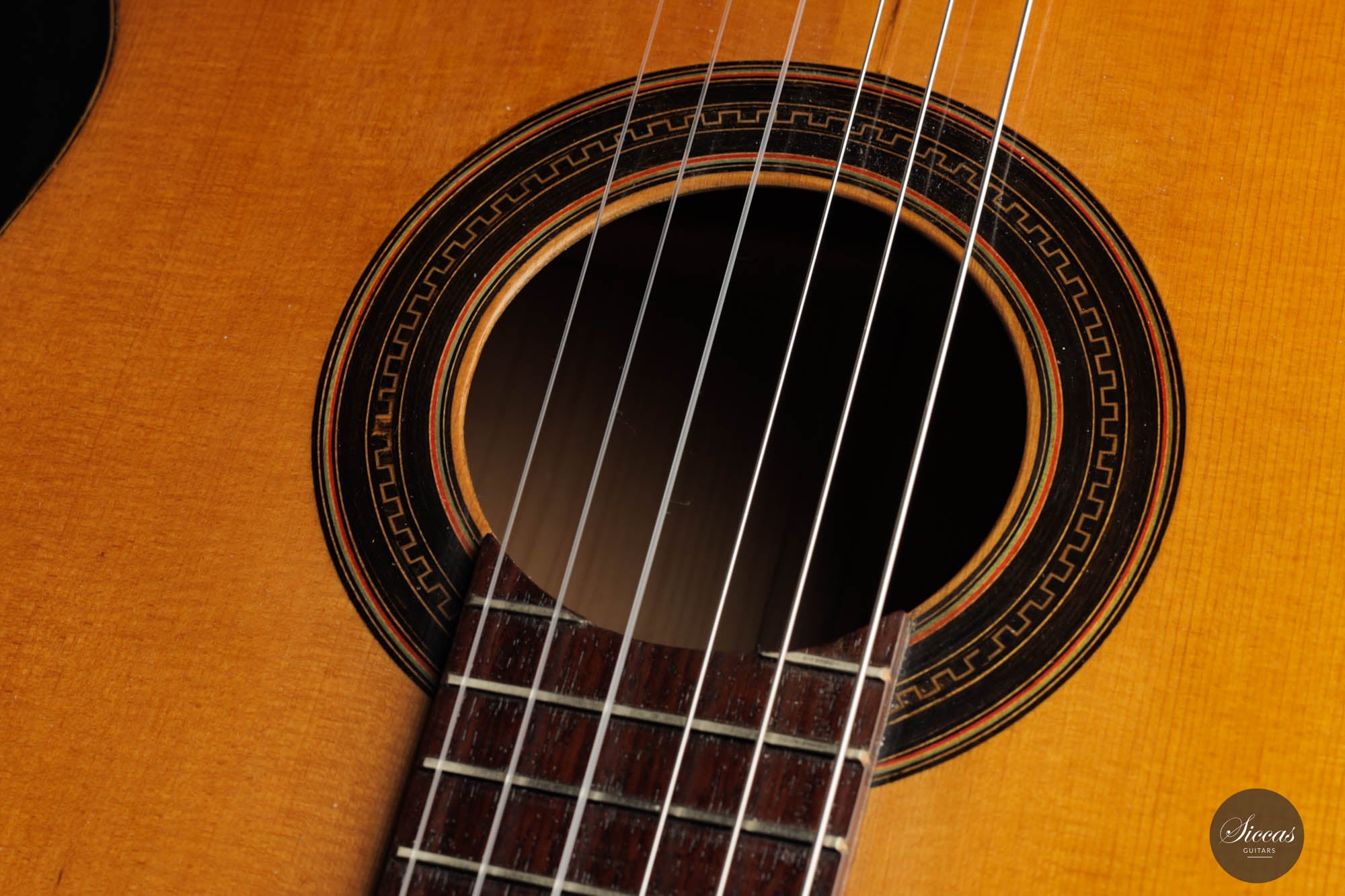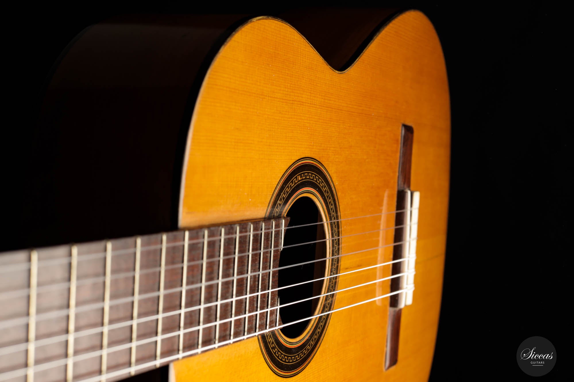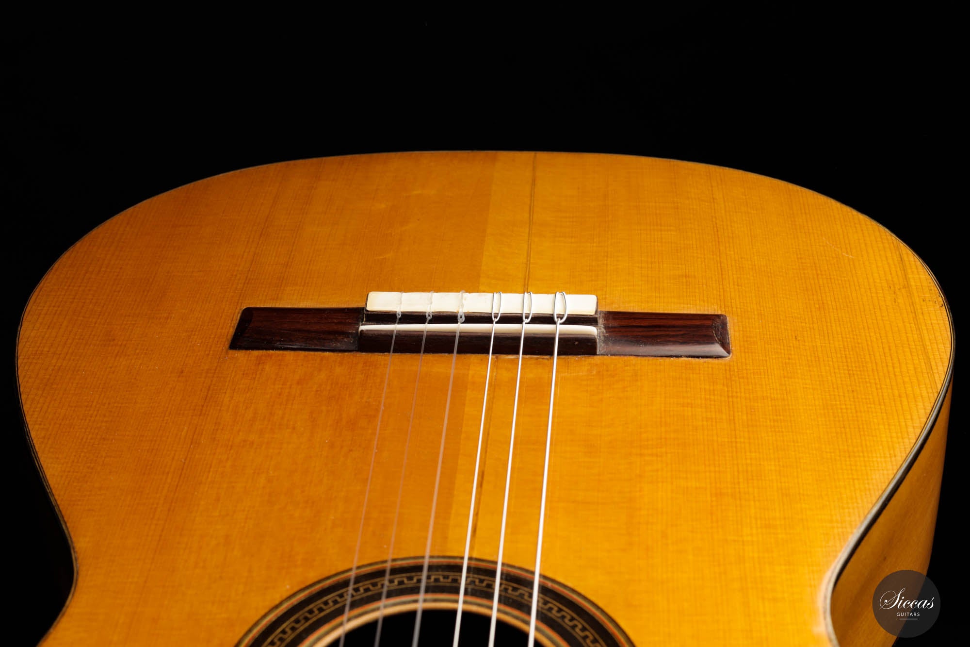 Trotz ihres Alters ist die Gitarre von Domingo Esteso aus dem Jahr 1931 strukturell einwandfrei. Die Decke weist vier reparierte und geleimte Risse auf, von denen zwei durch dünne Holzlatten verstärkt sind. Auch der Boden weist zwei geleimte Risse auf, die alle von erfahrenen Fachleuten sorgfältig stabilisiert und restauriert wurden. Mit einem Gewicht von nur 1115 Gramm bietet diese leichte Gitarre ein sehr angenehmes Spielerlebnis. Ihre Hauptresonanz von F/F# zeichnet sich durch satte, dunkle Bässe und zarte, luftige Höhen aus, die zu einer fesselnden Klangbalance beitragen. Das Instrument zeichnet sich außerdem durch seine hölzernen Wirbelköpfe im Flamenco-Stil aus, eine Anspielung auf die traditionelle spanische Ästhetik.