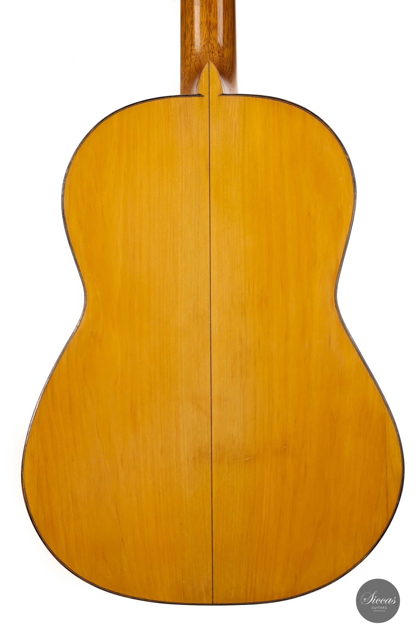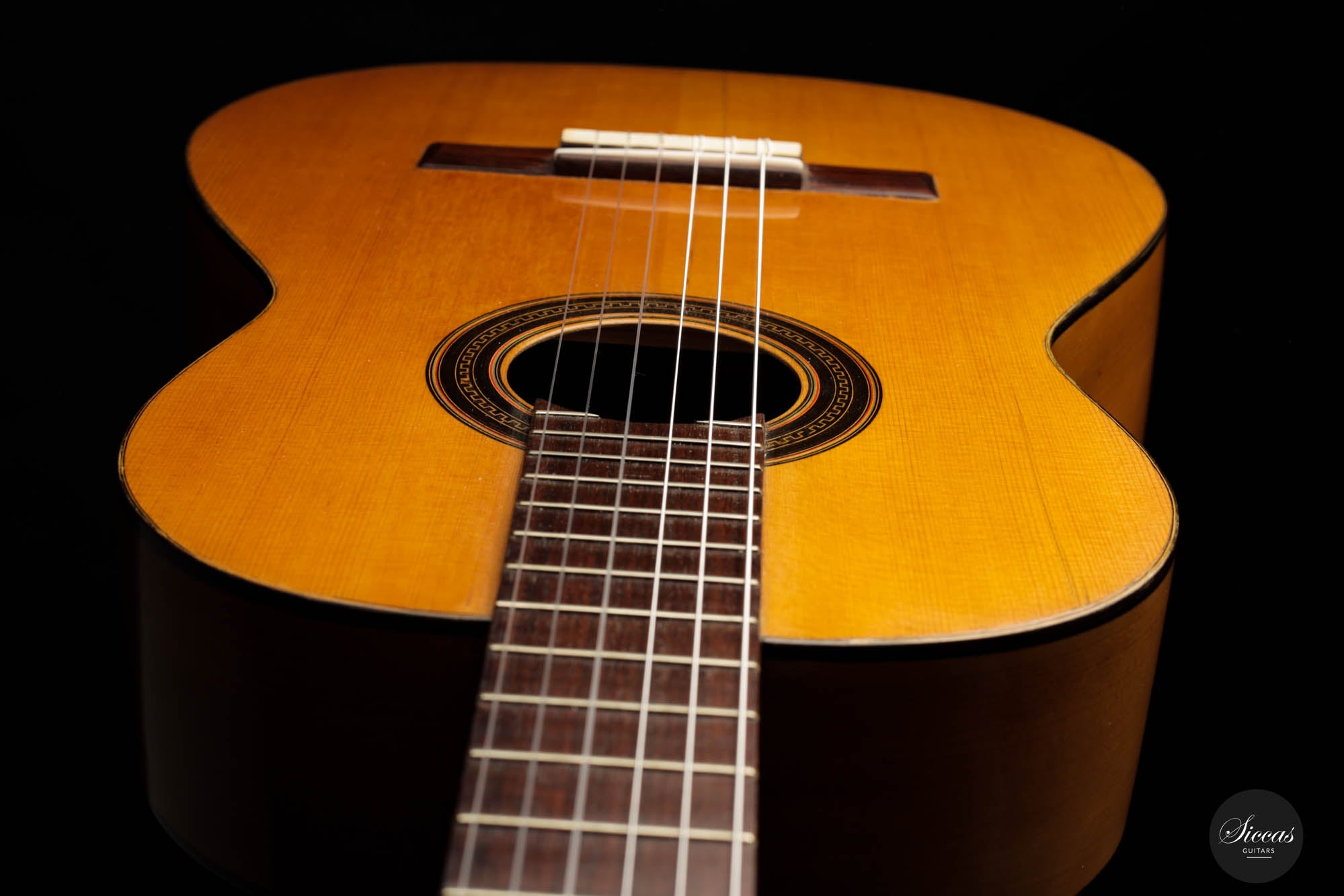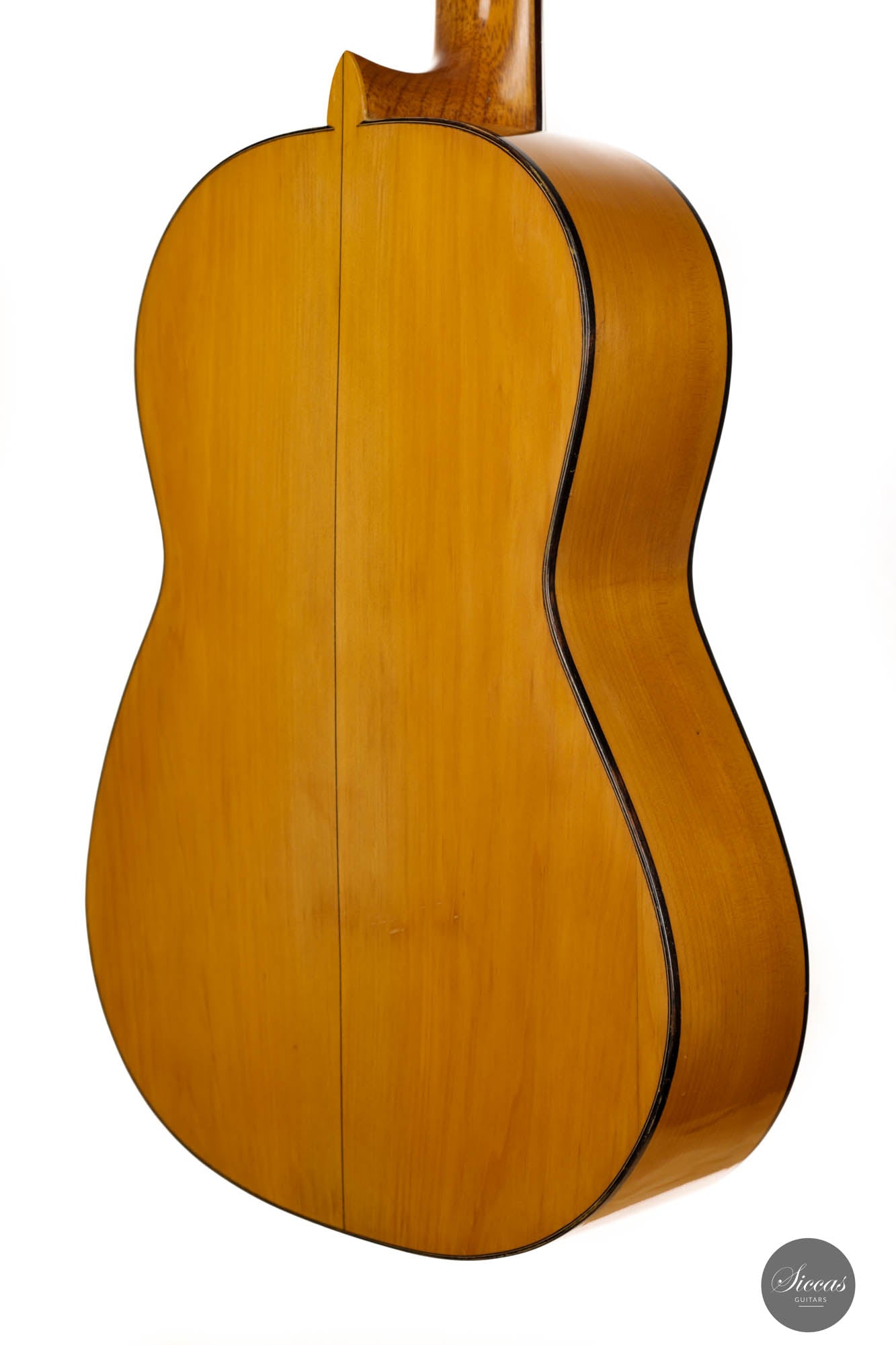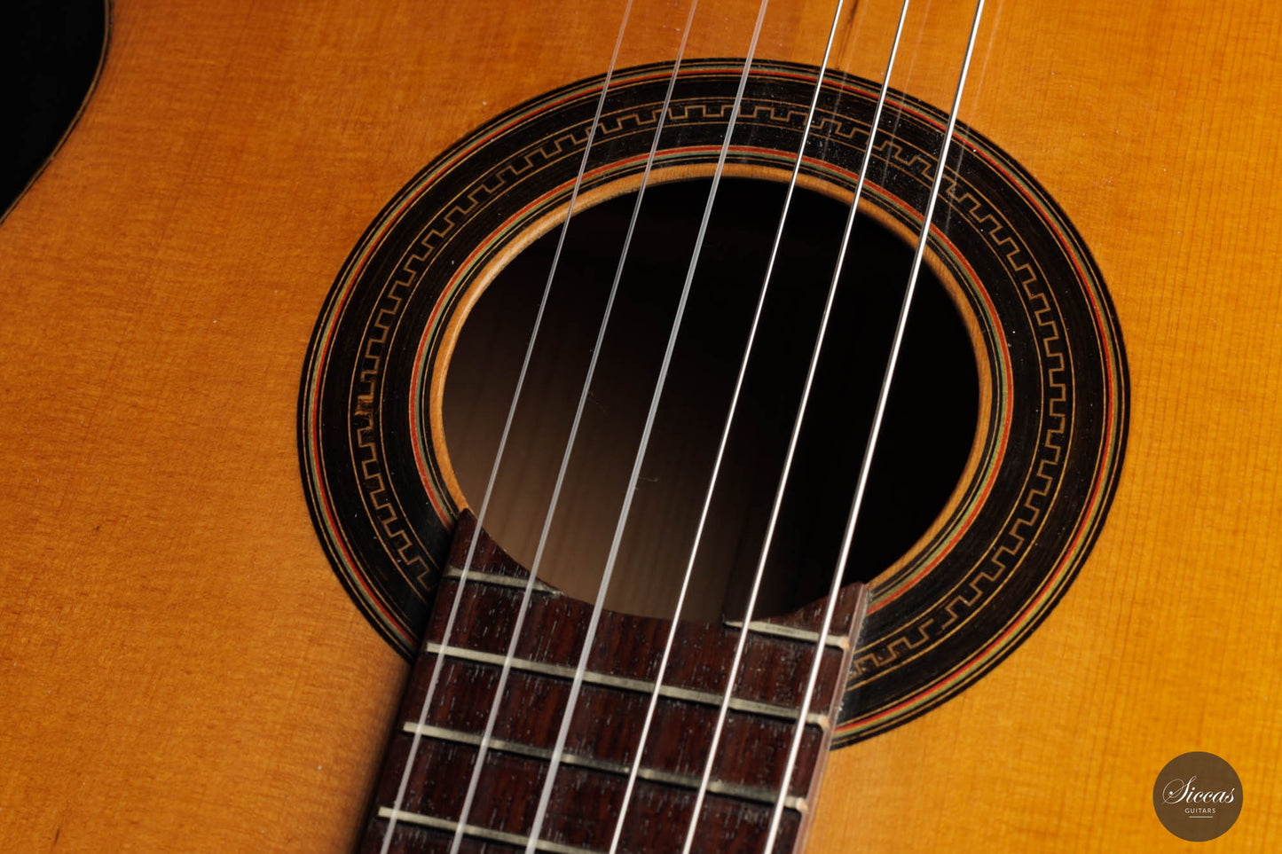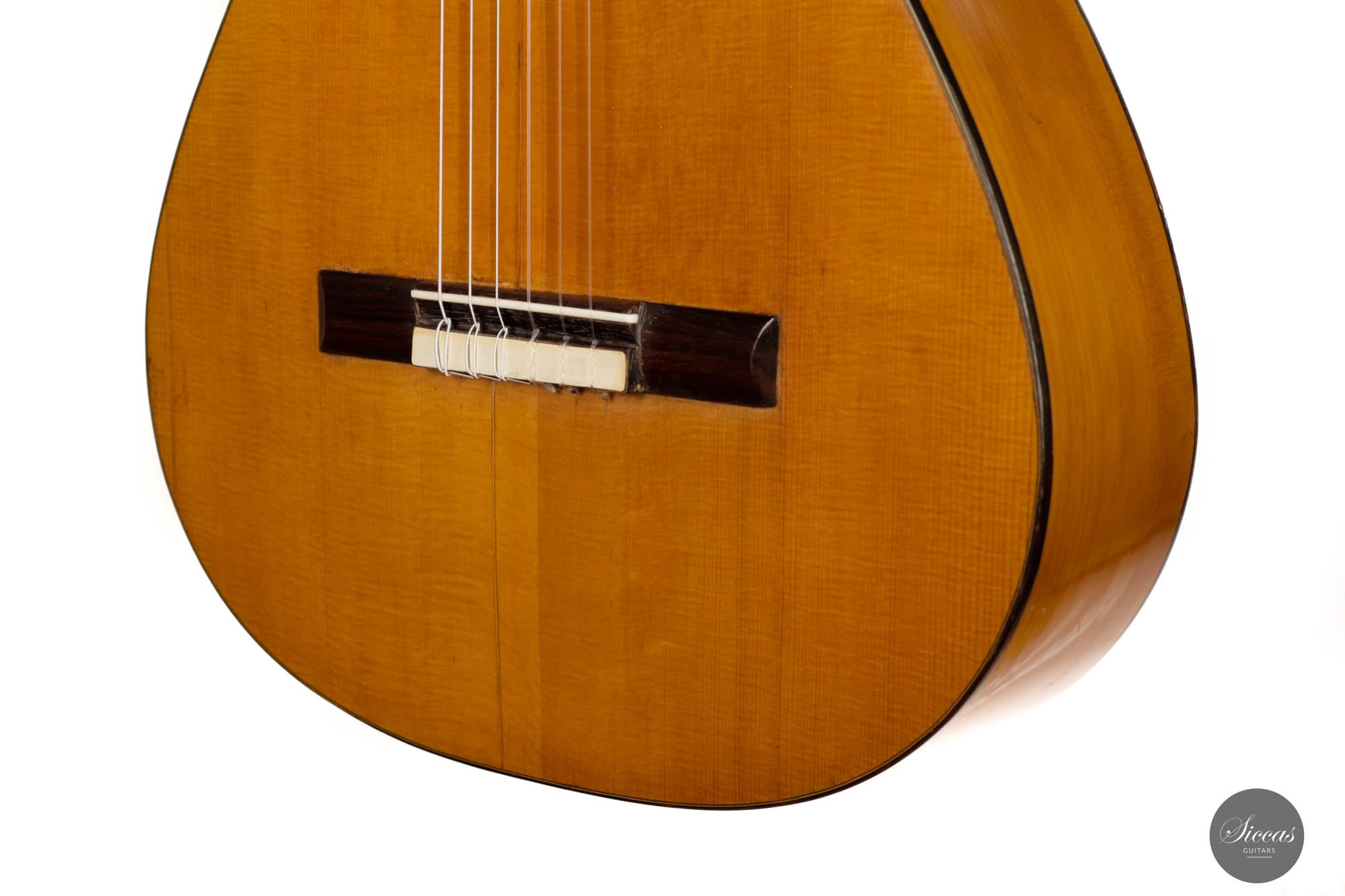 Trotz ihres Alters ist die Gitarre von Domingo Esteso aus dem Jahr 1931 strukturell einwandfrei. Die Decke weist vier reparierte und geleimte Risse auf, von denen zwei durch dünne Holzlatten verstärkt sind. Auch der Boden weist zwei geleimte Risse auf, die alle von erfahrenen Fachleuten sorgfältig stabilisiert und restauriert wurden. Mit einem Gewicht von nur 1115 Gramm bietet diese leichte Gitarre ein sehr angenehmes Spielerlebnis. Ihre Hauptresonanz von F/F# zeichnet sich durch satte, dunkle Bässe und zarte, luftige Höhen aus, die zu einer fesselnden Klangbalance beitragen. Das Instrument zeichnet sich außerdem durch seine hölzernen Wirbelköpfe im Flamenco-Stil aus, eine Anspielung auf die traditionelle spanische Ästhetik.