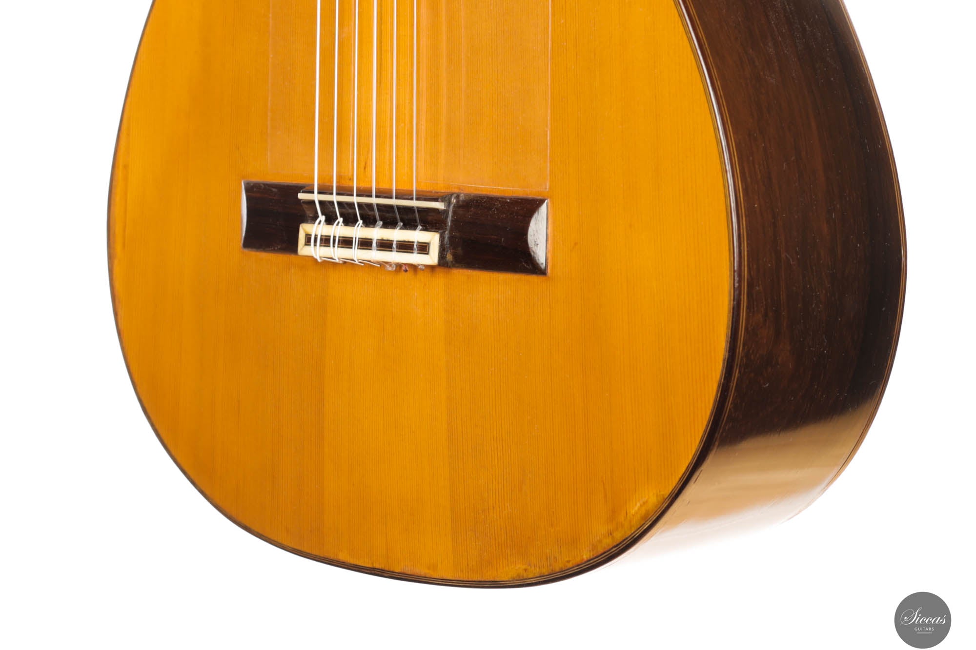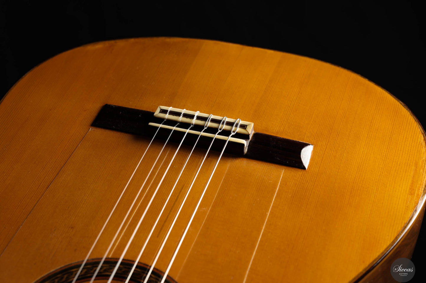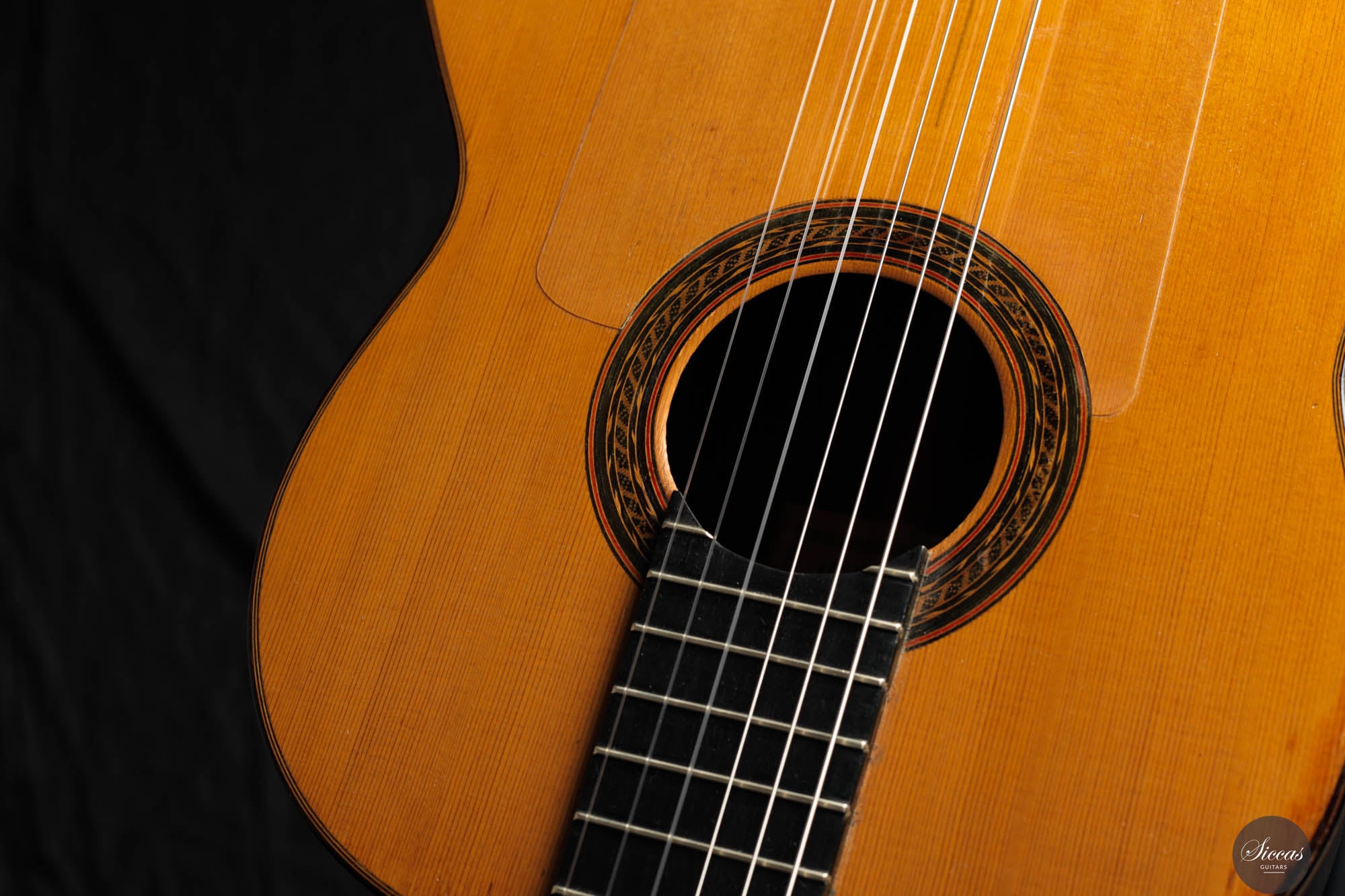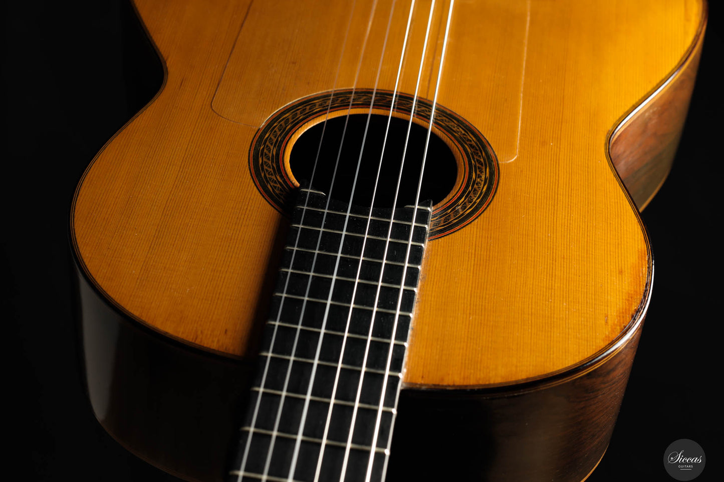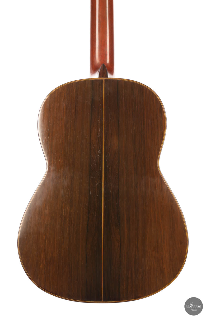 Built in 1937, this instrument is one of the final works of Domingo Esteso, crafted during the closing chapter of his distinguished career. It features back and sides of exquisite Brazilian rosewood with deep hues and captivating figure, paired with a spruce top of tight, uniform grain. The understated aesthetics highlight the natural elegance of the materials and the refined craftsmanship of the era. Remarkably, despite its age, this guitar offers excellent playability, with a fluid response and clear articulation that make it perfectly suited for concert performance. It resonates with the lyrical depth and tonal complexity characteristic of Madrid’s golden age of lutherie. The long 670 mm scale contributes to a particularly strong and defined bass register, delivering both power and clarity in the lower range. A true collector’s piece and a living instrument, it embodies the expressive, vocal timbre that defines the Spanish sound of the early 20th century.