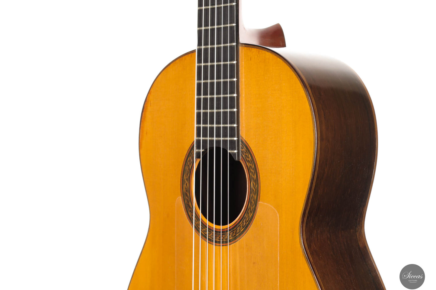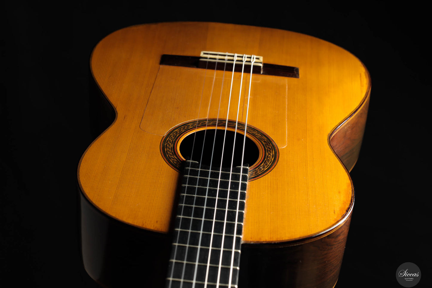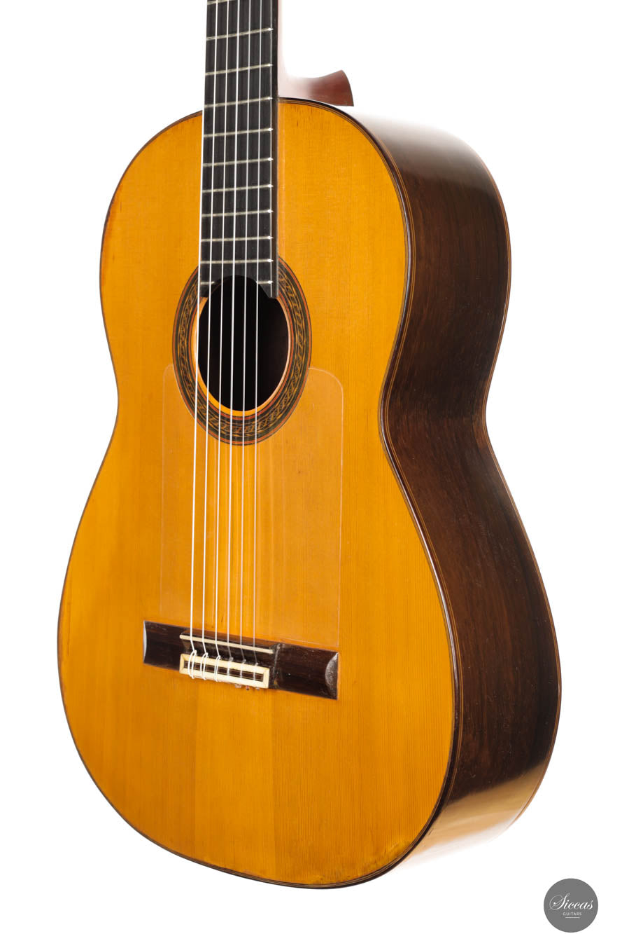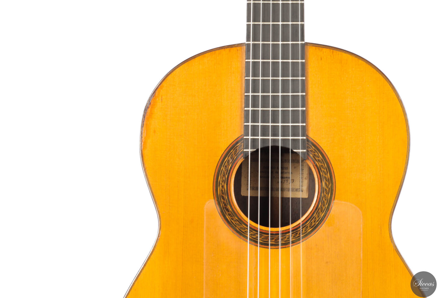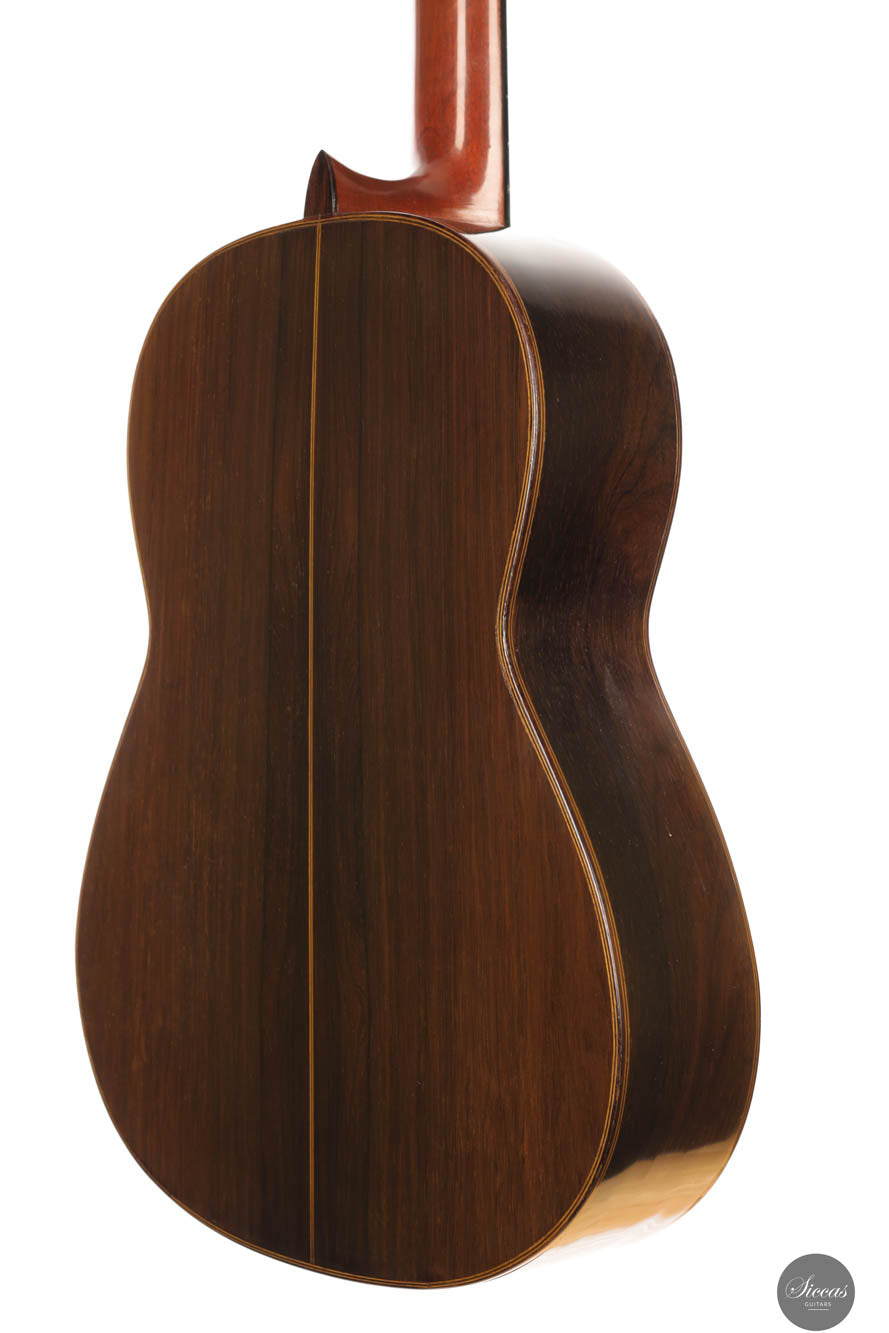 Built in 1937, this instrument is one of the final works of Domingo Esteso, crafted during the closing chapter of his distinguished career. It features back and sides of exquisite Brazilian rosewood with deep hues and captivating figure, paired with a spruce top of tight, uniform grain. The understated aesthetics highlight the natural elegance of the materials and the refined craftsmanship of the era. Remarkably, despite its age, this guitar offers excellent playability, with a fluid response and clear articulation that make it perfectly suited for concert performance. It resonates with the lyrical depth and tonal complexity characteristic of Madrid’s golden age of lutherie. The long 670 mm scale contributes to a particularly strong and defined bass register, delivering both power and clarity in the lower range. A true collector’s piece and a living instrument, it embodies the expressive, vocal timbre that defines the Spanish sound of the early 20th century.