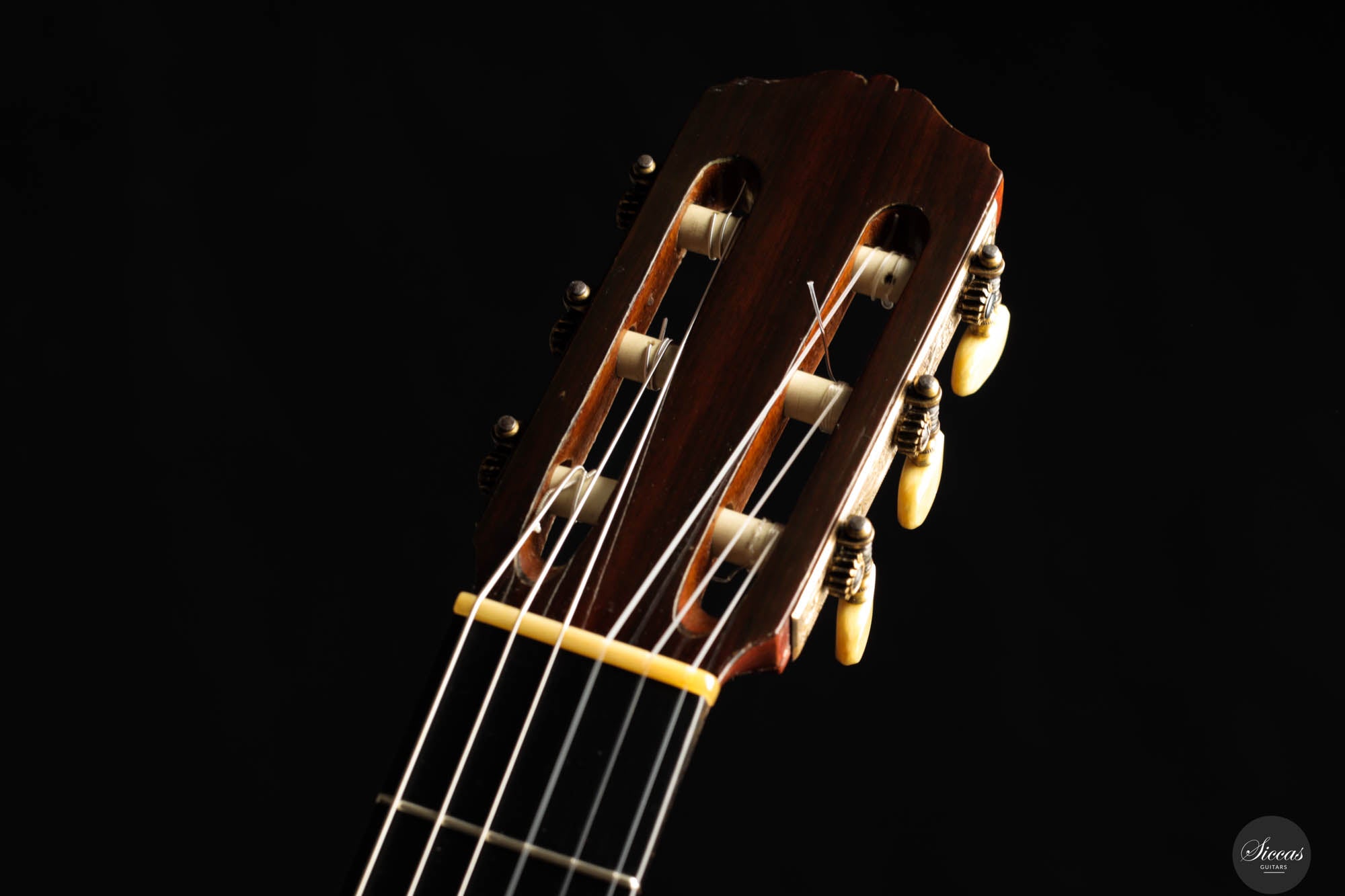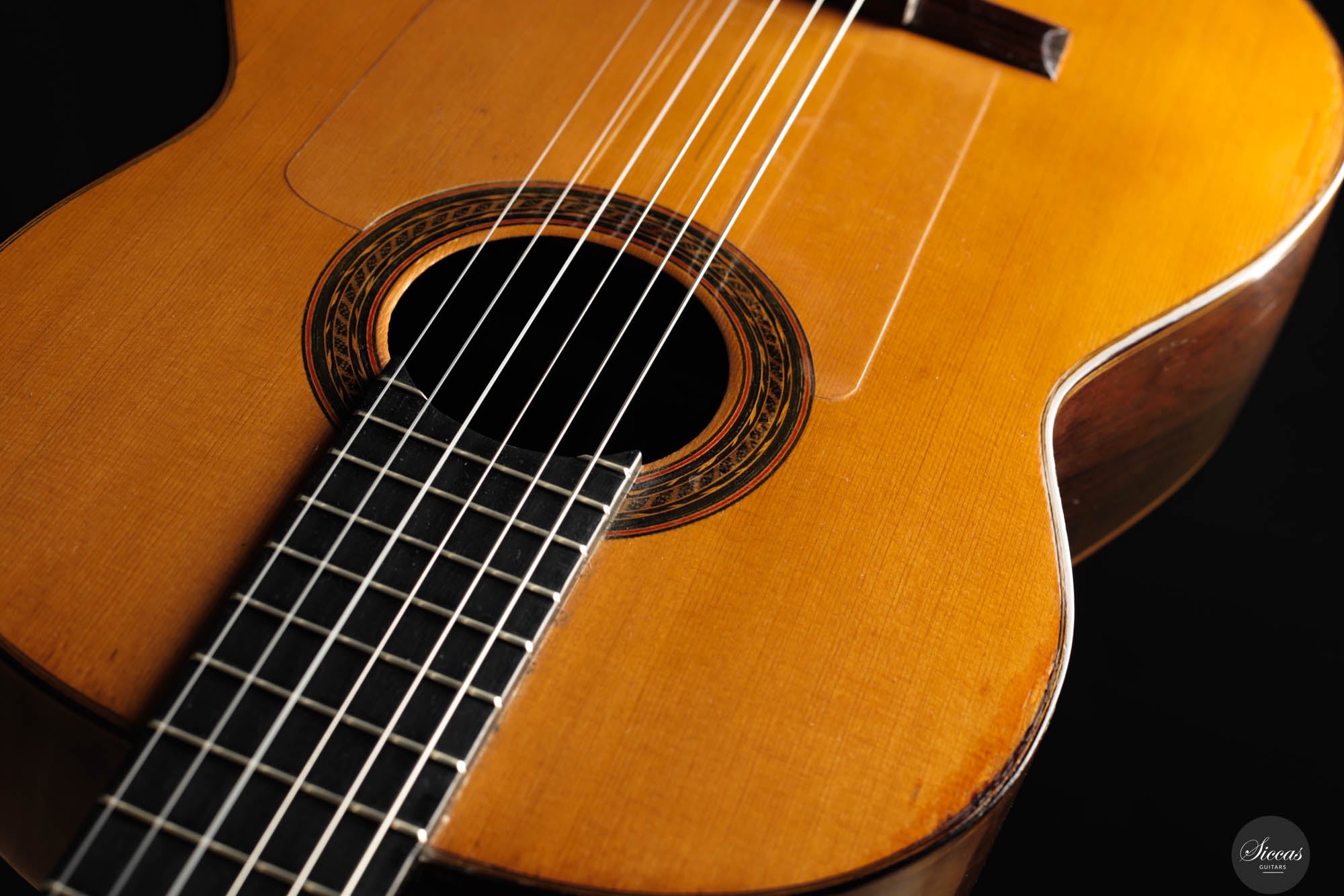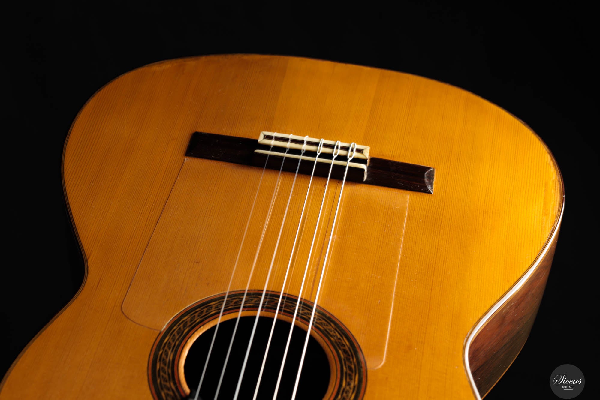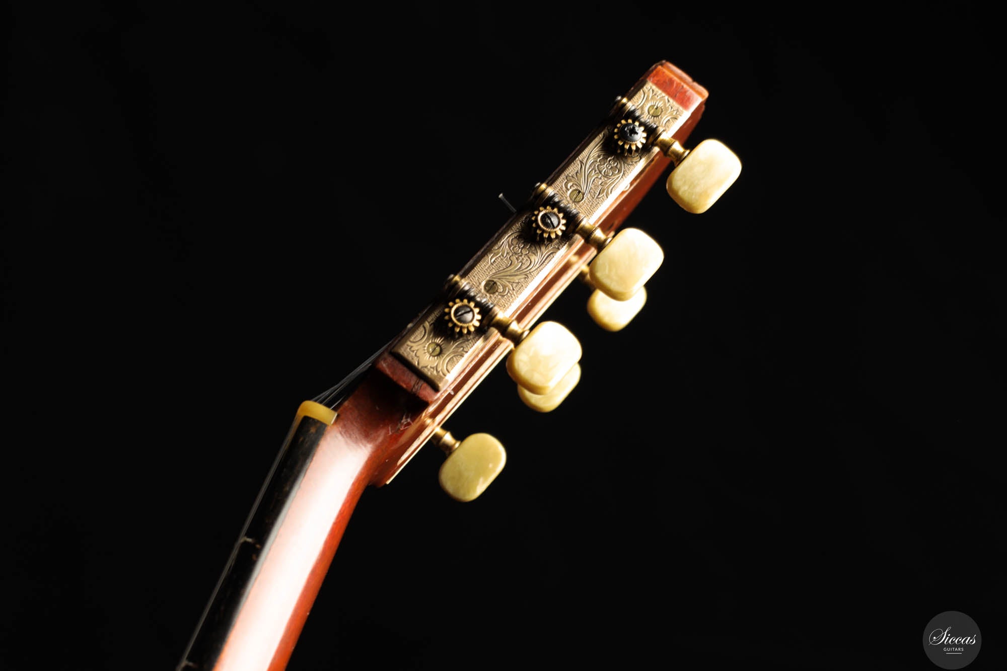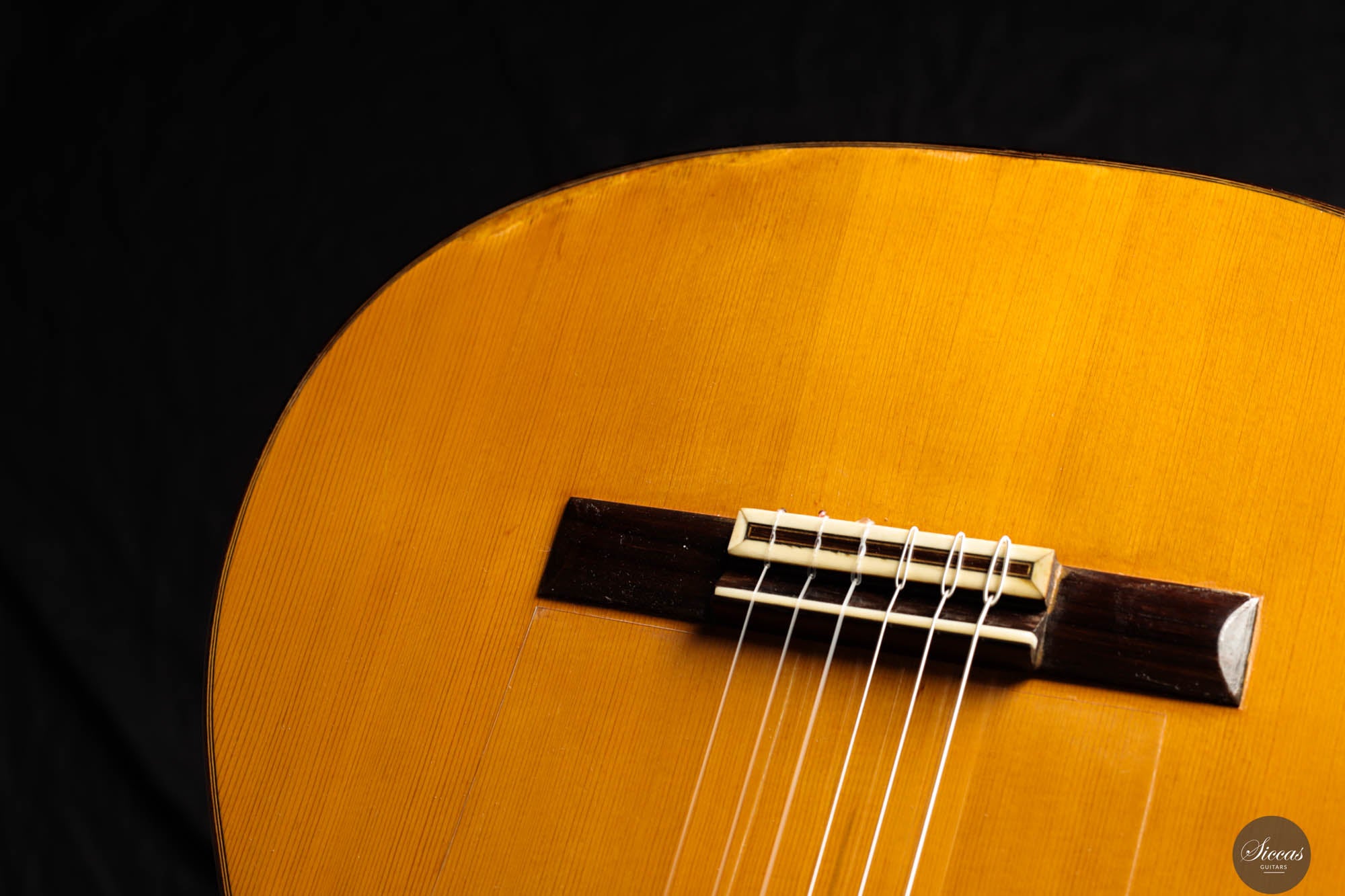 Built in 1937, this instrument is one of the final works of Domingo Esteso, crafted during the closing chapter of his distinguished career. It features back and sides of exquisite Brazilian rosewood with deep hues and captivating figure, paired with a spruce top of tight, uniform grain. The understated aesthetics highlight the natural elegance of the materials and the refined craftsmanship of the era. Remarkably, despite its age, this guitar offers excellent playability, with a fluid response and clear articulation that make it perfectly suited for concert performance. It resonates with the lyrical depth and tonal complexity characteristic of Madrid’s golden age of lutherie. The long 670 mm scale contributes to a particularly strong and defined bass register, delivering both power and clarity in the lower range. A true collector’s piece and a living instrument, it embodies the expressive, vocal timbre that defines the Spanish sound of the early 20th century.