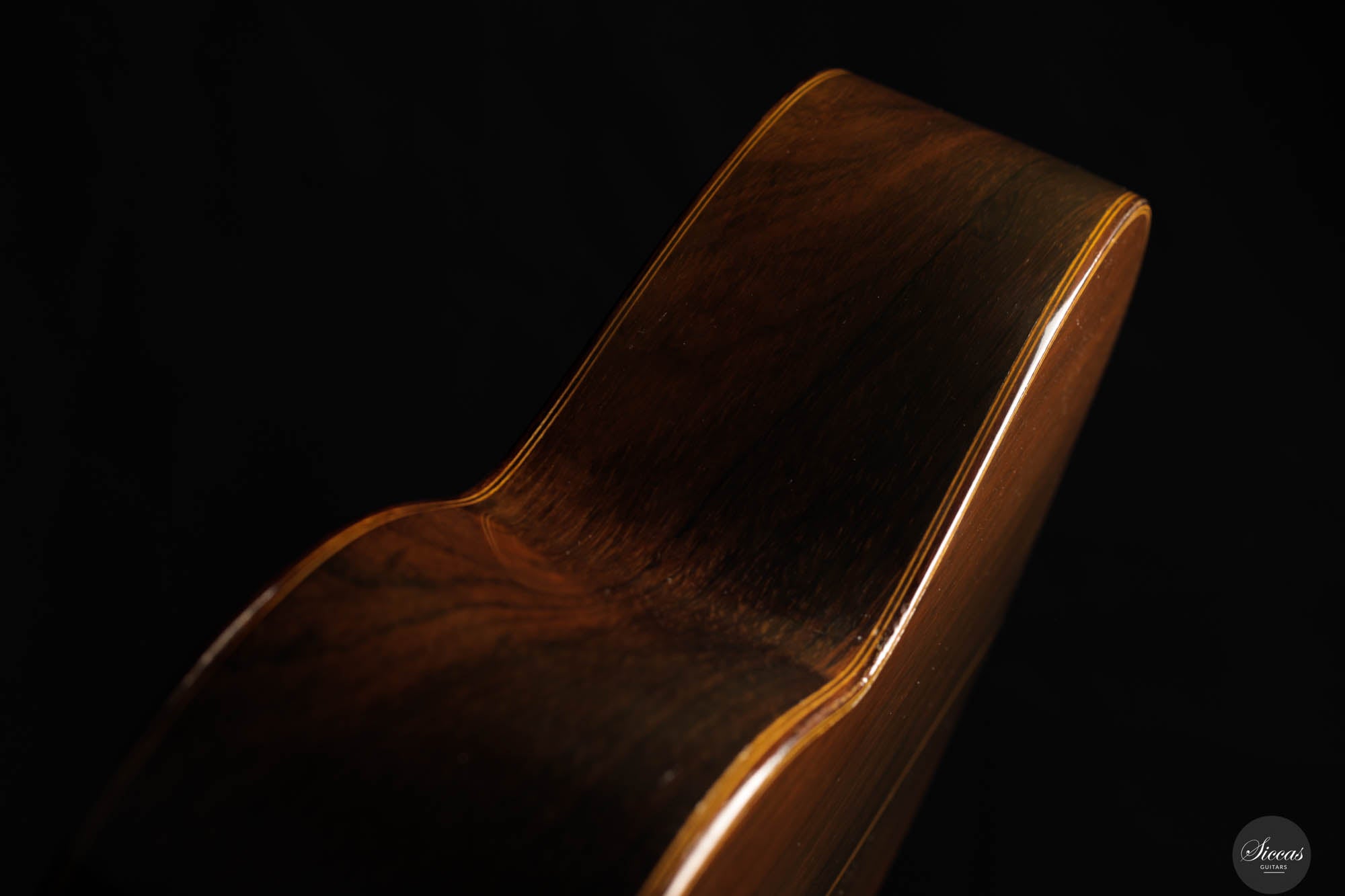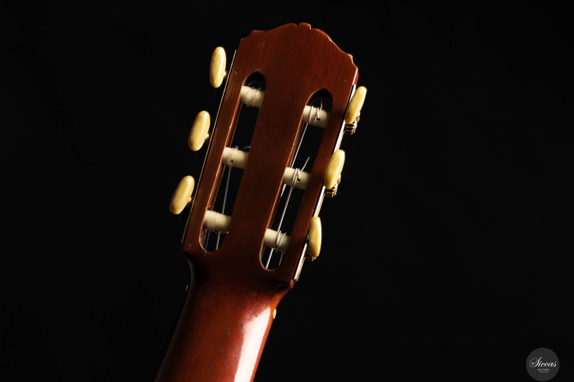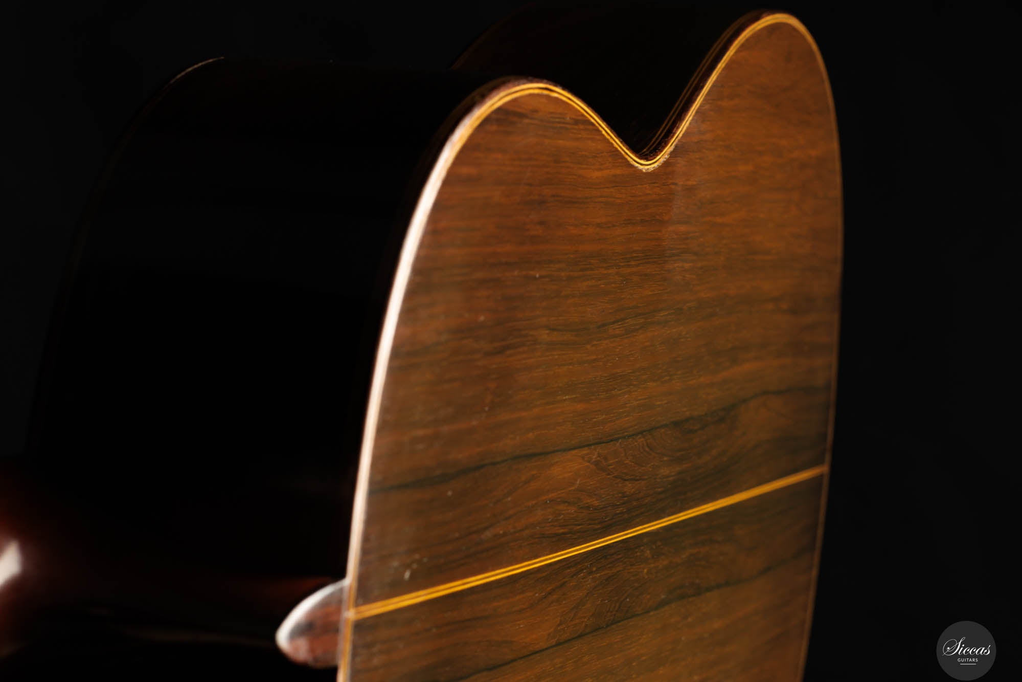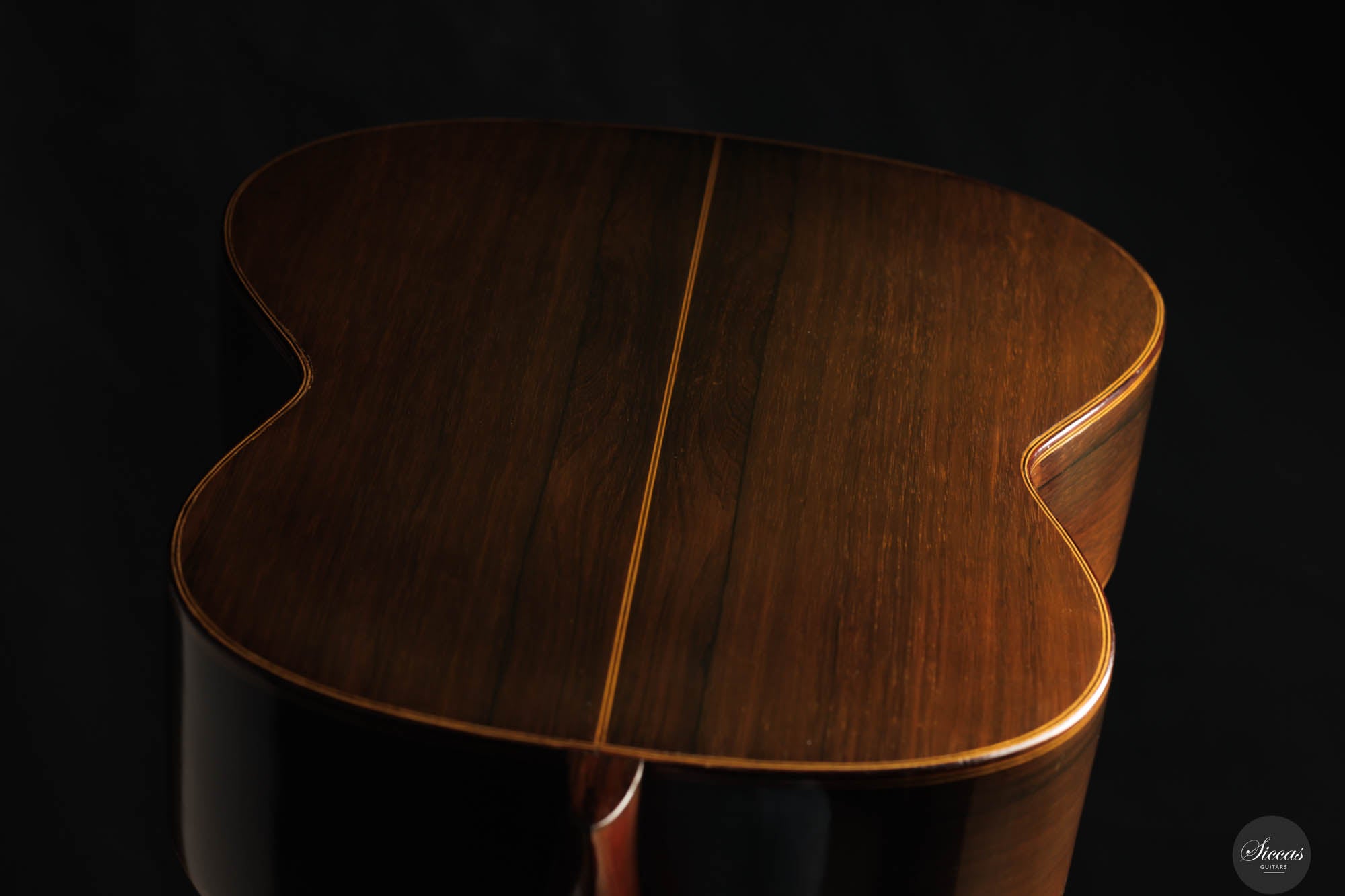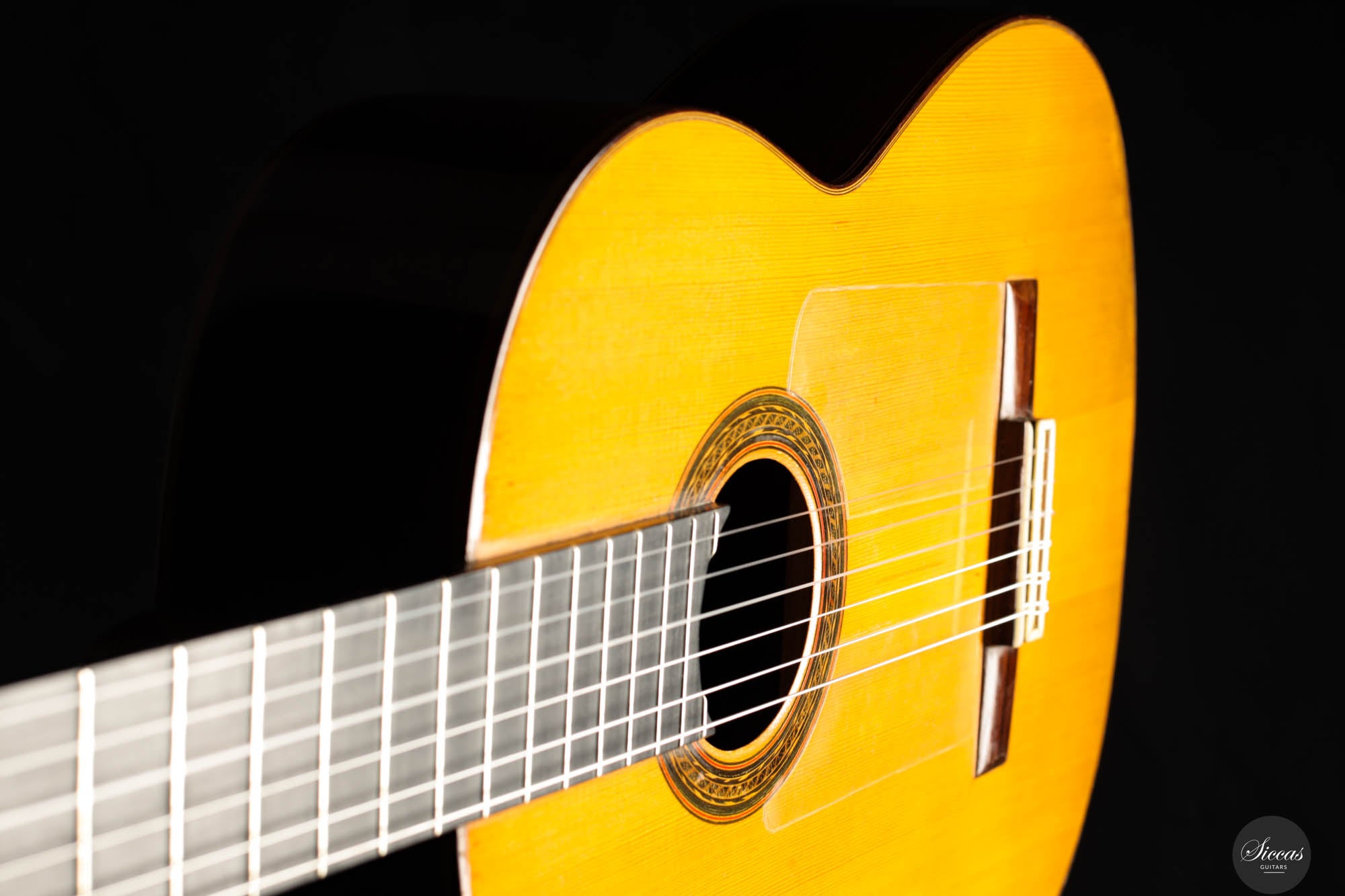 Built in 1937, this instrument is one of the final works of Domingo Esteso, crafted during the closing chapter of his distinguished career. It features back and sides of exquisite Brazilian rosewood with deep hues and captivating figure, paired with a spruce top of tight, uniform grain. The understated aesthetics highlight the natural elegance of the materials and the refined craftsmanship of the era. Remarkably, despite its age, this guitar offers excellent playability, with a fluid response and clear articulation that make it perfectly suited for concert performance. It resonates with the lyrical depth and tonal complexity characteristic of Madrid’s golden age of lutherie. The long 670 mm scale contributes to a particularly strong and defined bass register, delivering both power and clarity in the lower range. A true collector’s piece and a living instrument, it embodies the expressive, vocal timbre that defines the Spanish sound of the early 20th century.