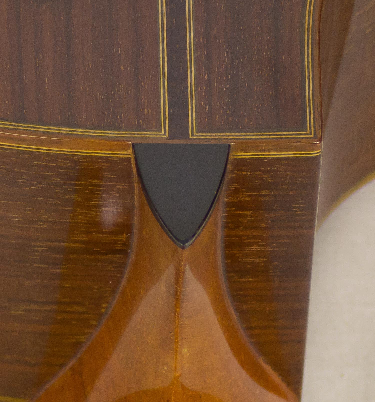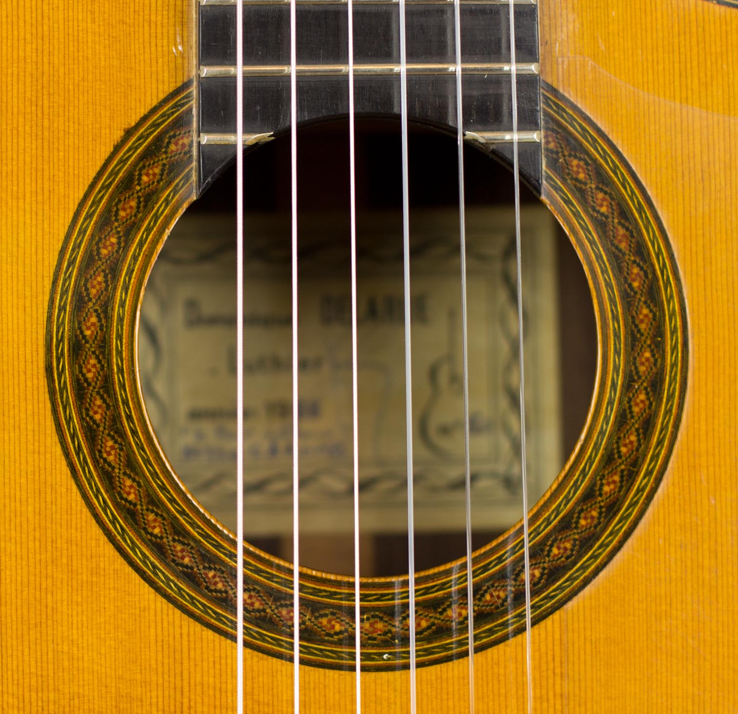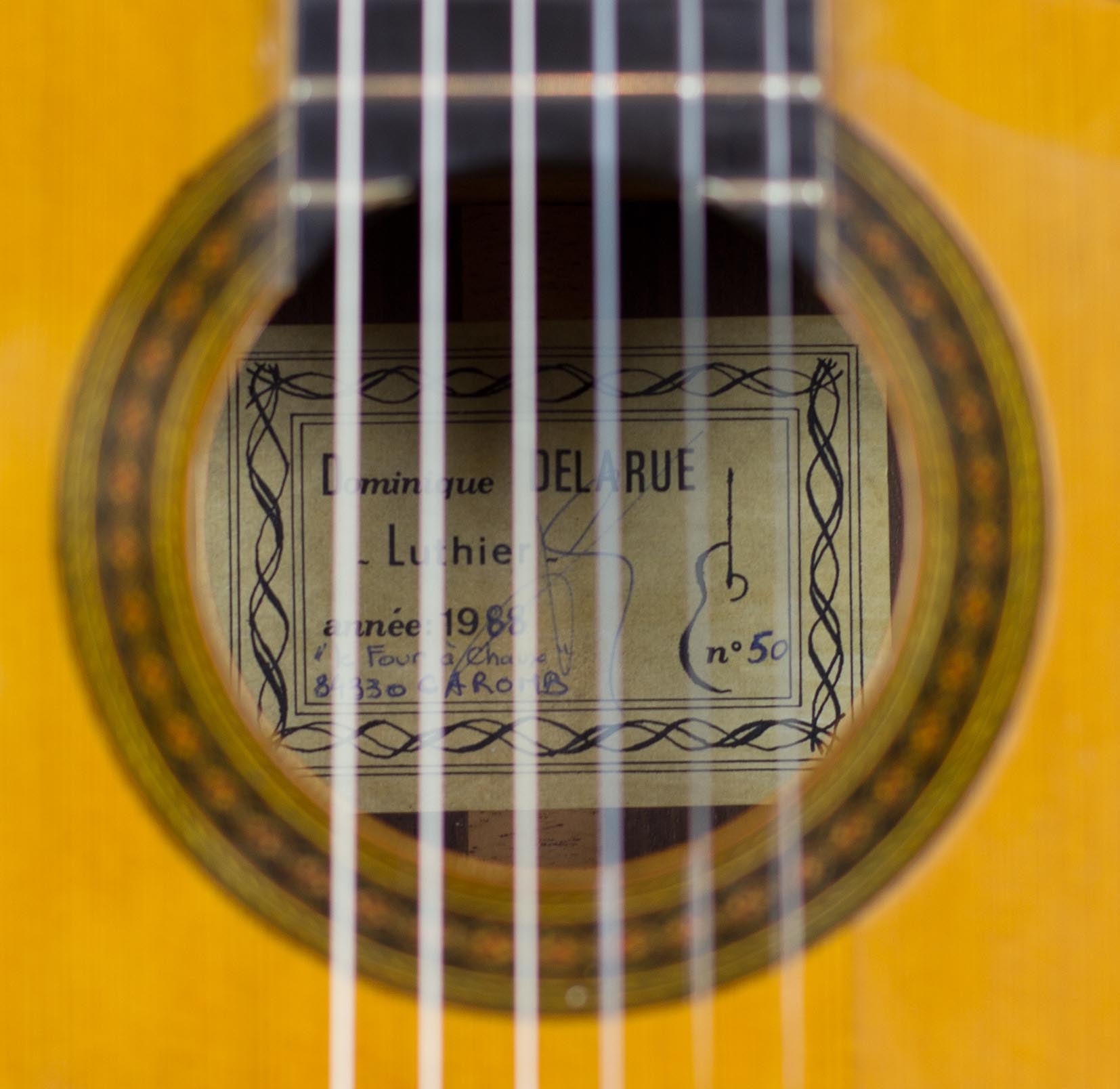 Die Gitarre mit Cutaway wurde von Dominique Delarue 1988 auf Kundenwunsch gefertigt. Sie befindet sich in gutem Zustand und hat nur kleinere Spielspuren. Die Decke wurde aus schön regelmäßig gemaserter Zeder angefertigt. Der Boden und die Zargen sind aus indischem Palisander. Klanglich und beim Spiel macht diese Gitarre richtig Freude. Sie wirkt lebendig und frisch und gibt dem Spieler ein sehr direktes Feedback. Der Hals relativ flach und fühlt sich beim Spiel sehr angenehm an. Die Gitarre hat einen aktiven Pickup und die Lautstärkeregulierung erfolgt direkt am Verstärker.