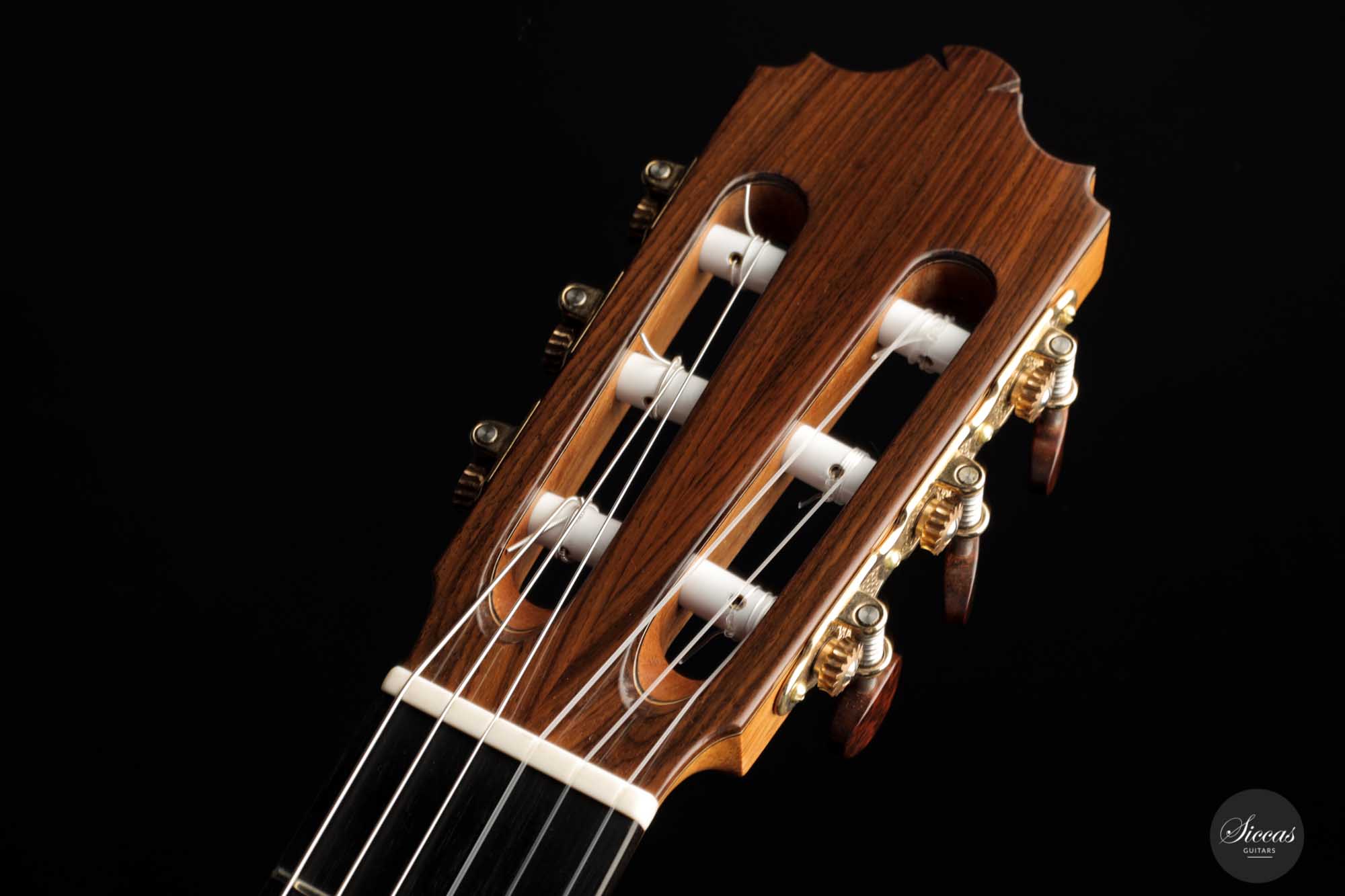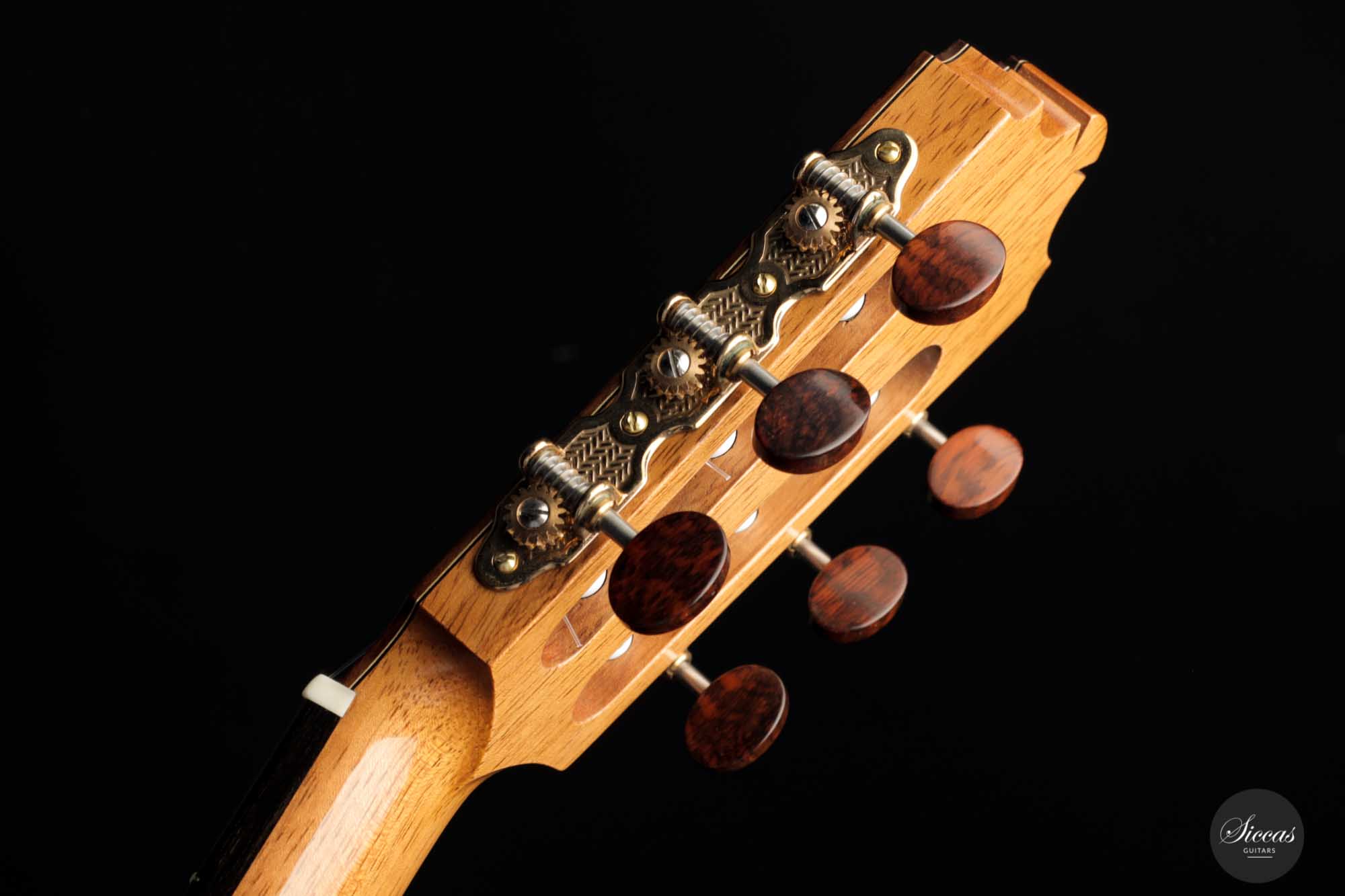 Diese inspirierende Dominique Delarue-Gitarre mit der Nummer 415 kommt direkt aus der Werkstatt von Dominique Delarue. Es ist eine typisch "französisch" gebaute Gitarre mit doppelten Zargen, einer komplexen Fichtenfächerbeleistung à la Daniel Friederich auf einer reaktionsfreudigen Zederndecke. Sie ist ein makelloses Kunstwerk der Holzbearbeitung. Dominique Delarues Gitarren sind an ihren klaren Linien, der dünneren Rosette und dem hervorragenden Klang zu erkennen. Für die Kenner trägt diese Gitarre die zarten und geschmackvollen eingravierten Initialen von Dominique Delarue "DD" auf dem Halsfuß im Inneren der Gitarre.