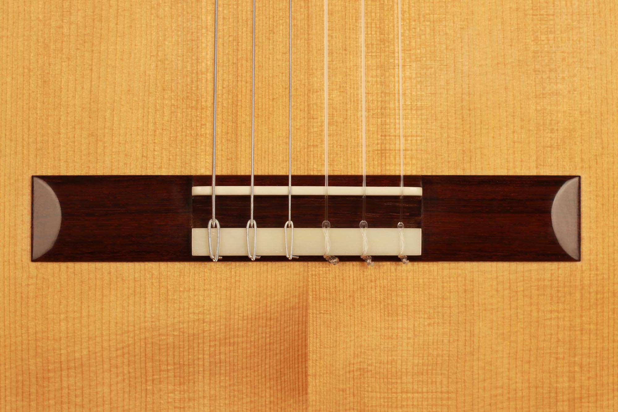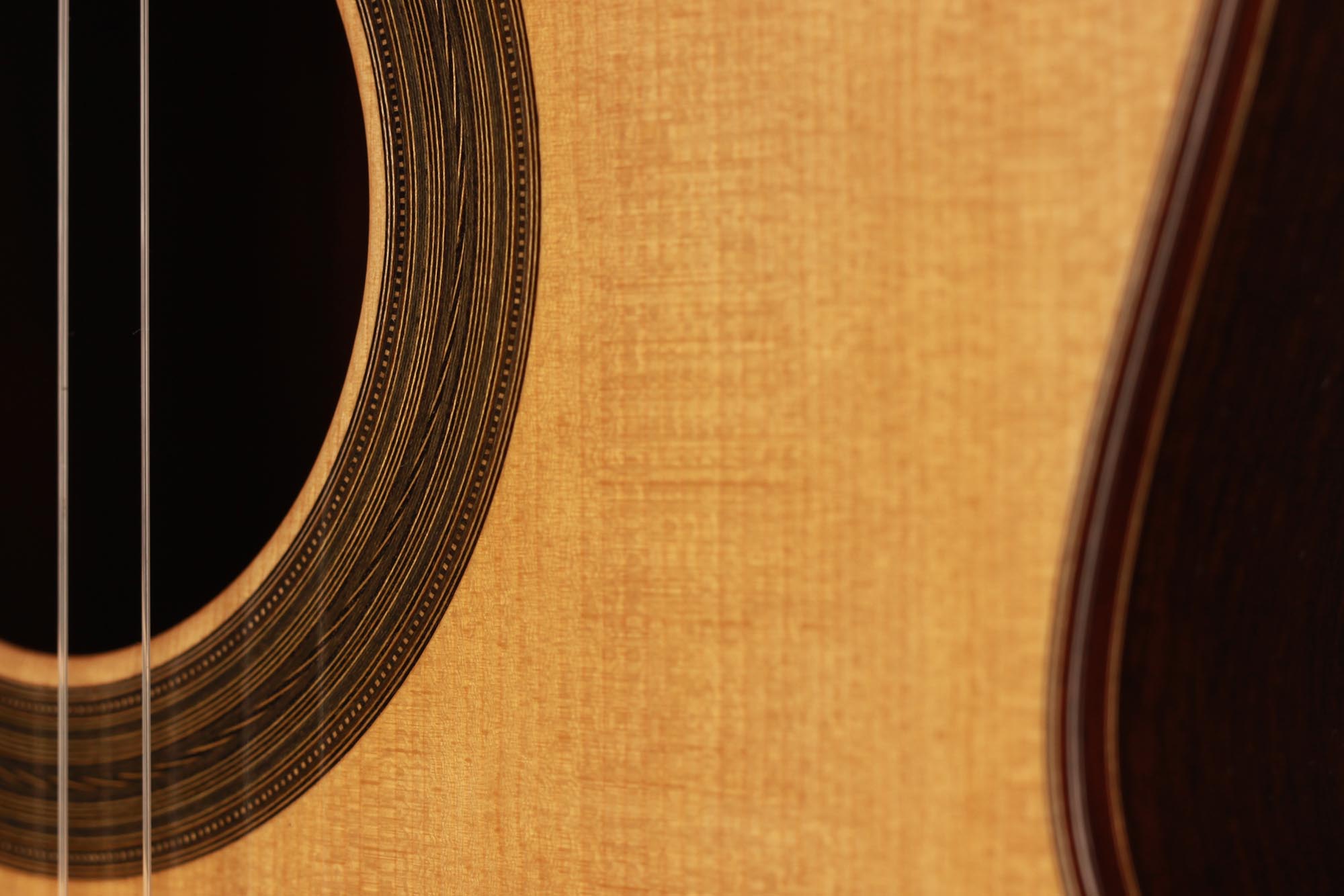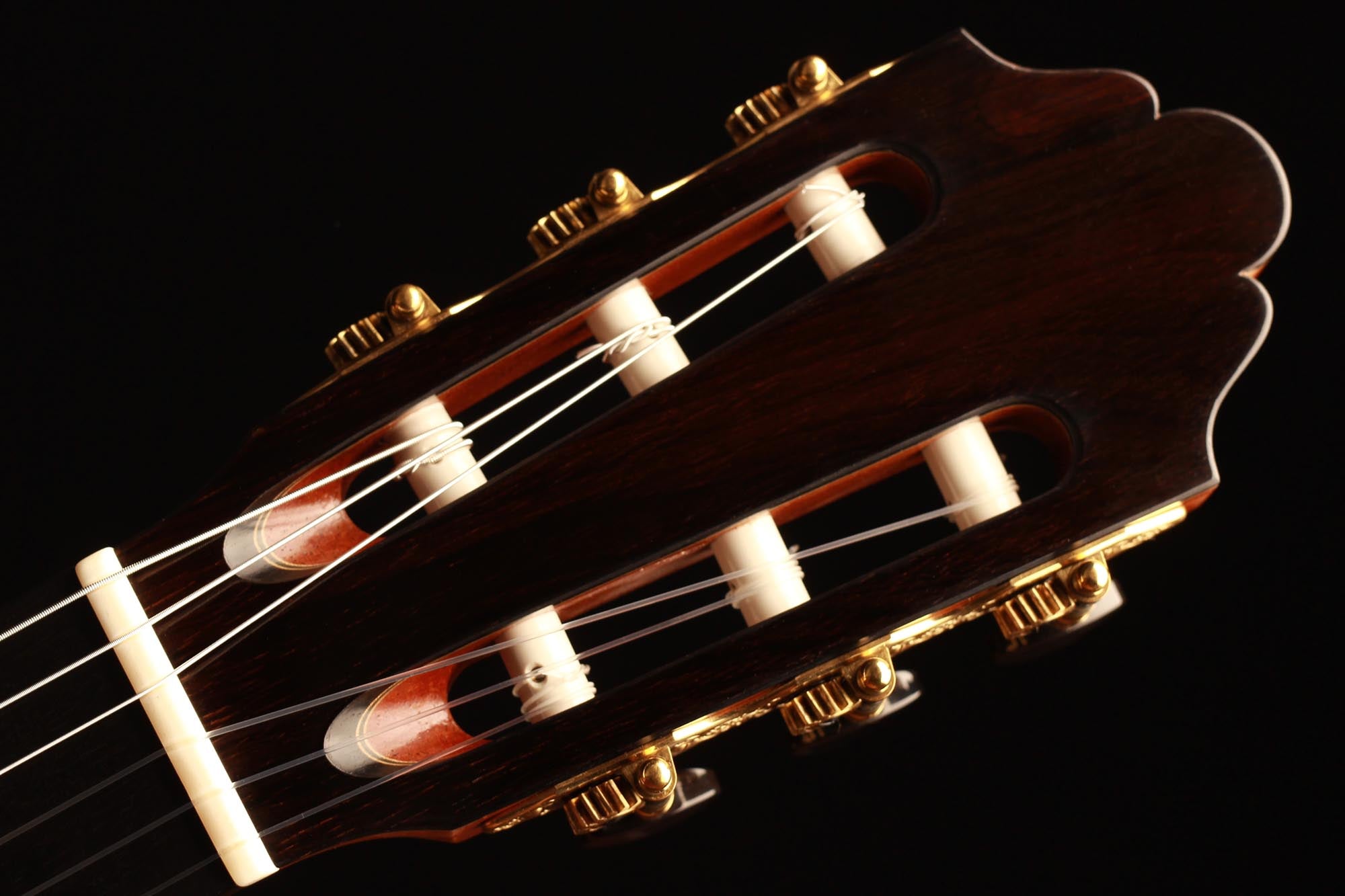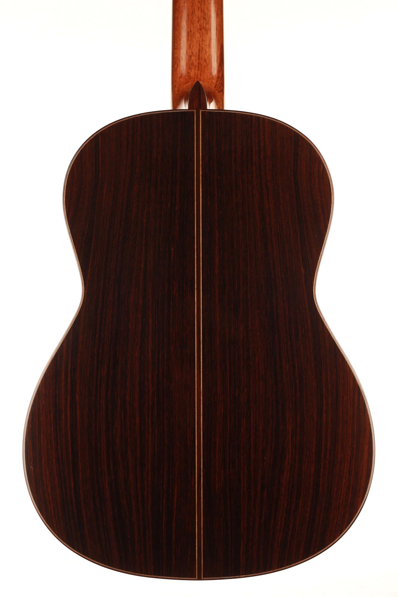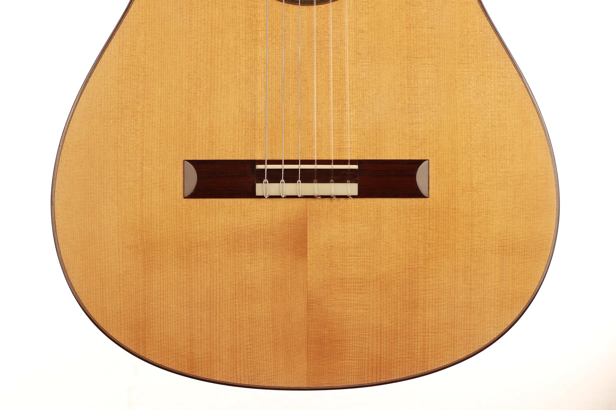 Es ist eine absolut schöne und sehr kräftig klingende Gitarre, die sowohl mit ihrer enormen Kraft als auch einem sehr lyrischen und süßen Ton überzeugt. Obwohl traditionell gebaut, ist die Projektionskraft sehr ausgeprägt und die Gitarre gibt dem Gitarristen viele Möglichkeiten, den Klang zu modulieren. Das Instrument ist in einem ausgezeichnetem Zustand mit nur minimalen Spielspuren auf der Decke. Es ist ein Instrument von großer Eleganz und starkem Charakter.