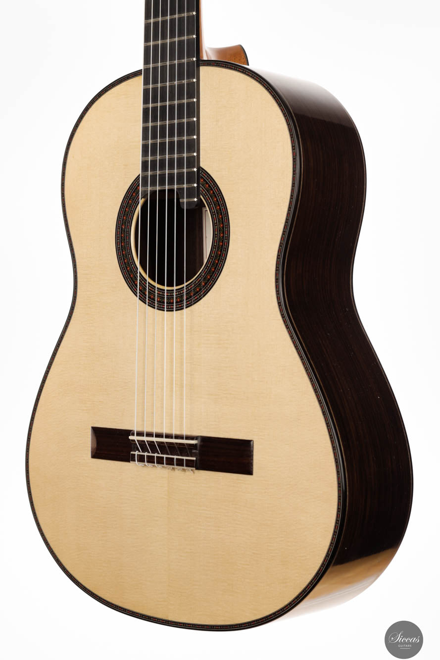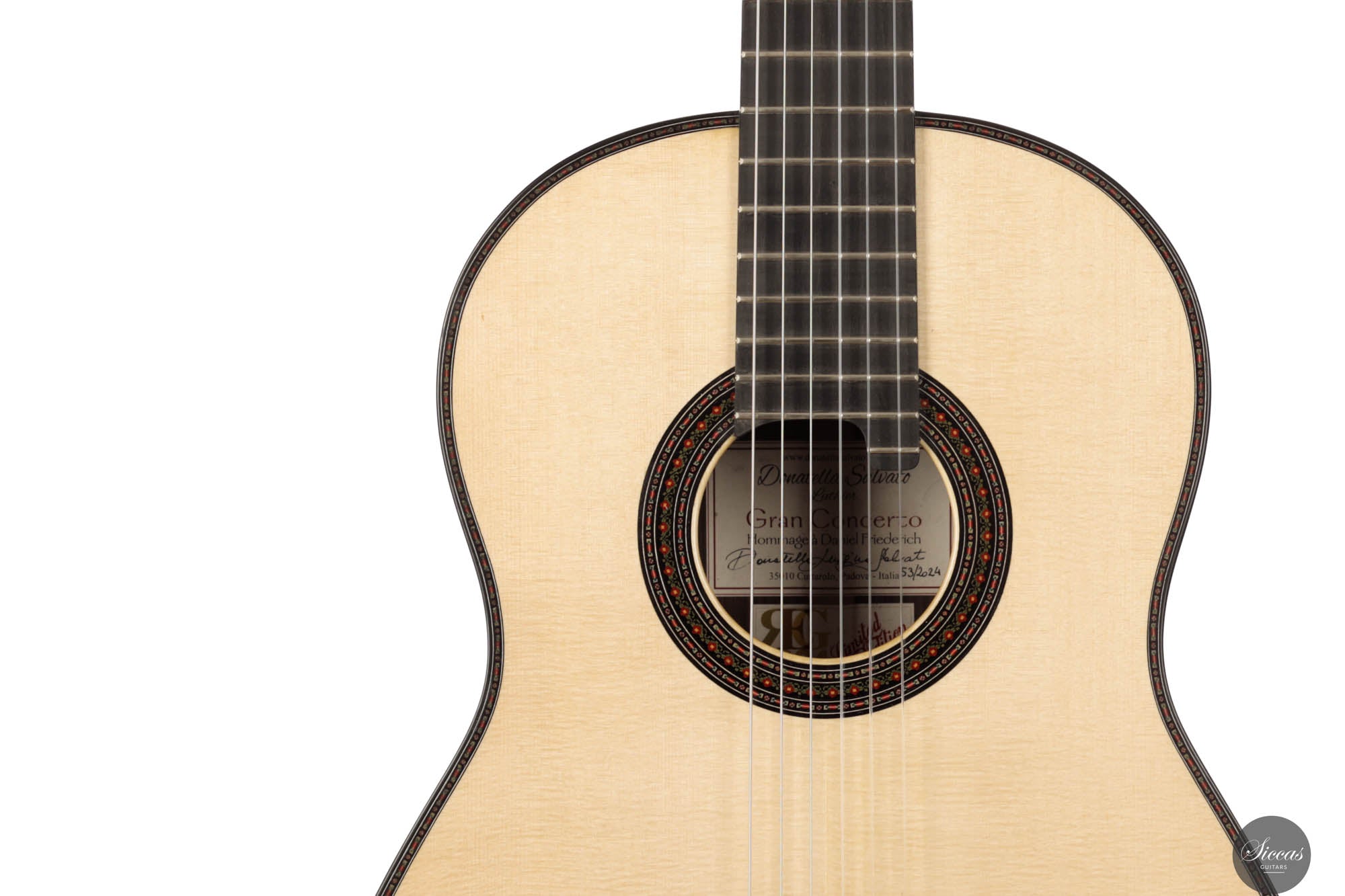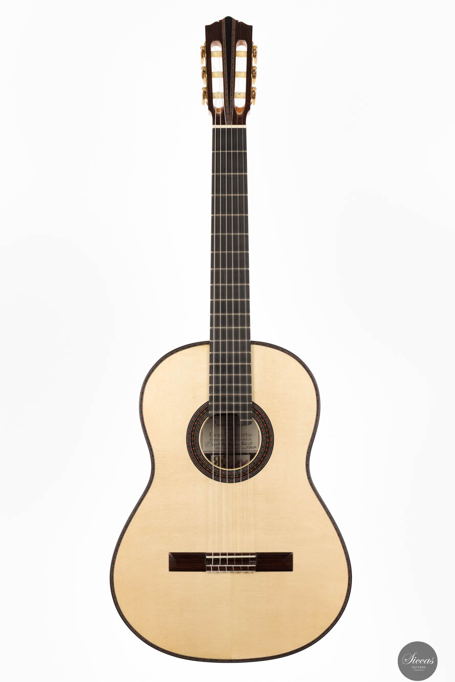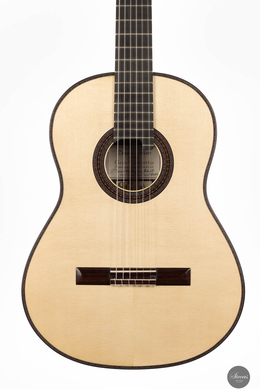 Die Donatella Salvato Limited Special Edition für die Roma Expo Guitars 2024, genannt "Gran Concerto Hommage à Daniel Friederich", repräsentiert ein neues Kapitel im Gitarrenbau, indem sie traditionelle ästhetische und akustische Eigenschaften mit moderner Handwerkskunst verbindet. Dieses exquisite Instrument ist aus italienischer Fichte für die Schalldecke und indischem Rosenholz für Rücken und Seiten gefertigt, eine Kombination, die nicht nur die visuelle Anziehungskraft steigert, sondern auch eine kraftvolle und nachhaltige Klangausgabe über alle Register hinweg bietet. Die tiefen Bässe und brillanten Höhen sind bereichert durch ein Spektrum an Nuancen, die darauf warten, vom Spieler erkundet zu werden. Mit einer 640 mm Mensur, einem Hals aus Cedrela odorata, einem Griffbrett aus afrikanischem Ebenholz und einer 12-Loch-Brücke aus indischem Rosenholz, prahlt diese Gitarre mit erstklassigen Komponenten. Sie ist fein abgestimmt mit Alessi-Muschelperl-Stimmmechaniken und geschmückt mit einer eleganten, exklusiven Rosette und Verzierungen, alles fertiggestellt mit einer sorgfältigen Schellackpolitur, die ihrer Pracht hinzufügt. Dieses Instrument besitzt eine erstaunliche Spielbarkeit durch seine 640mm Mensur und 50,5mm Sattelbreite.