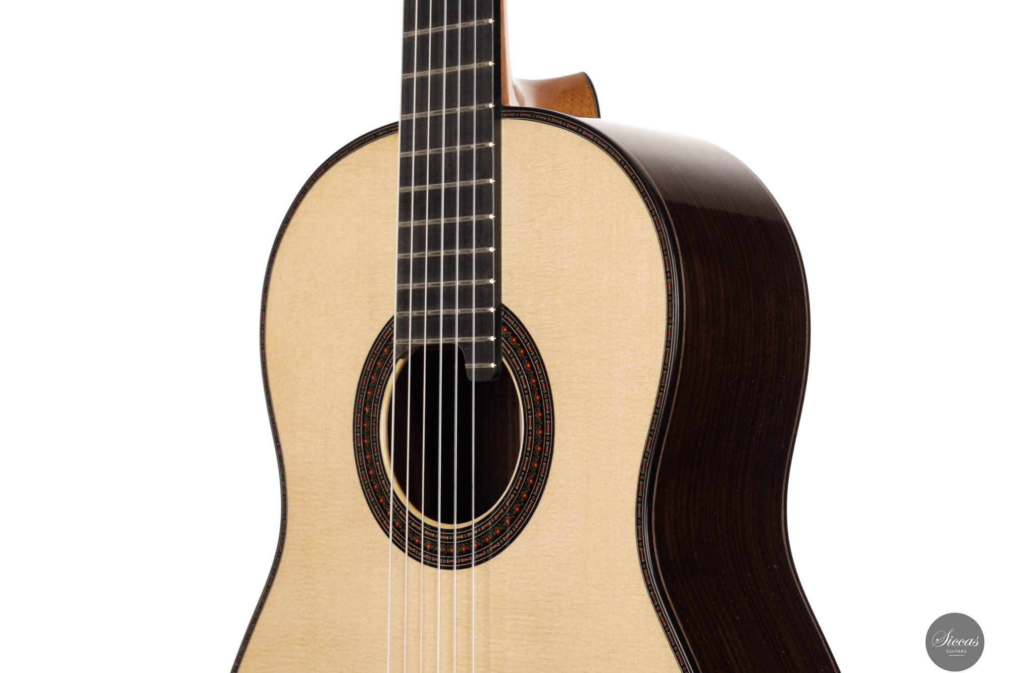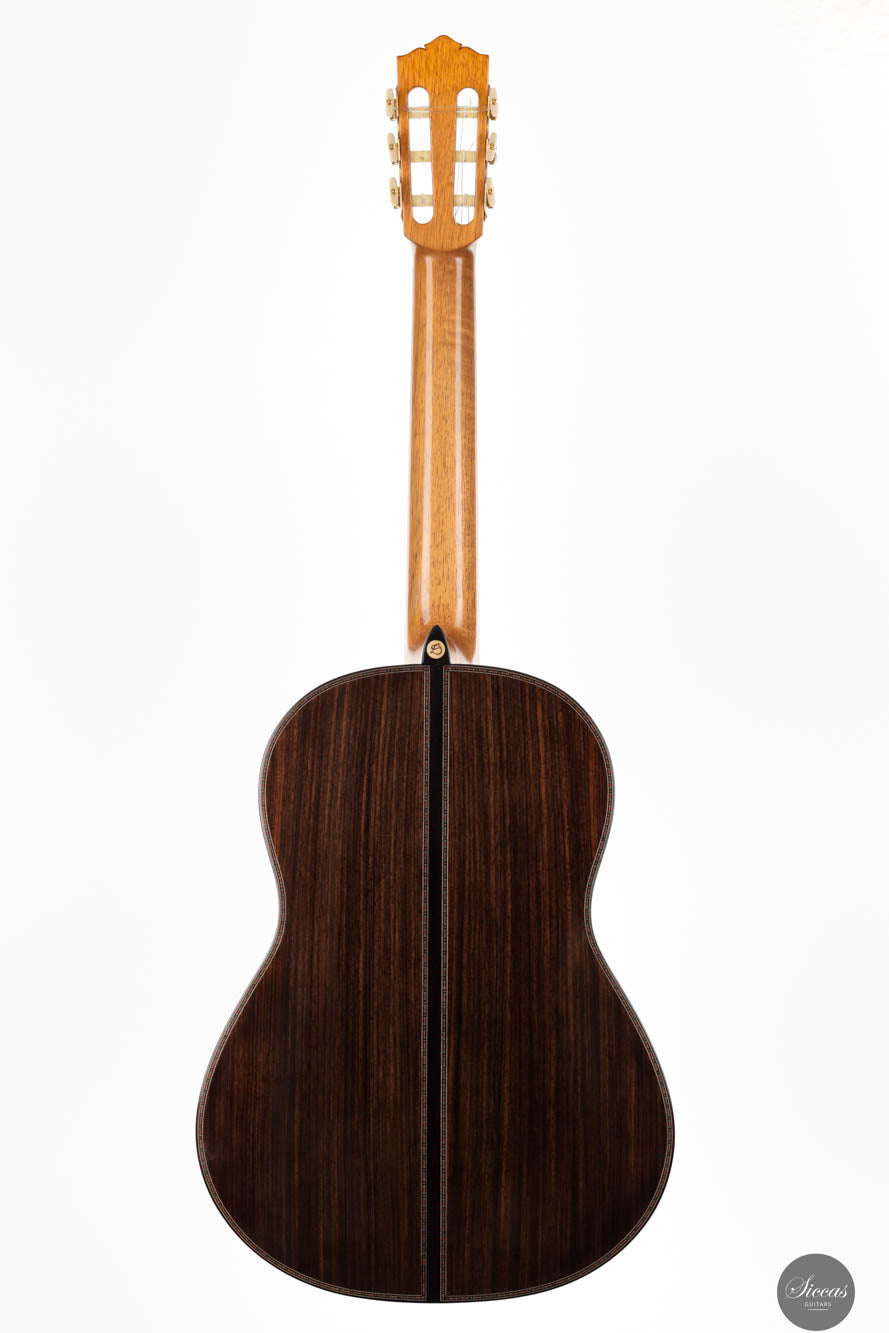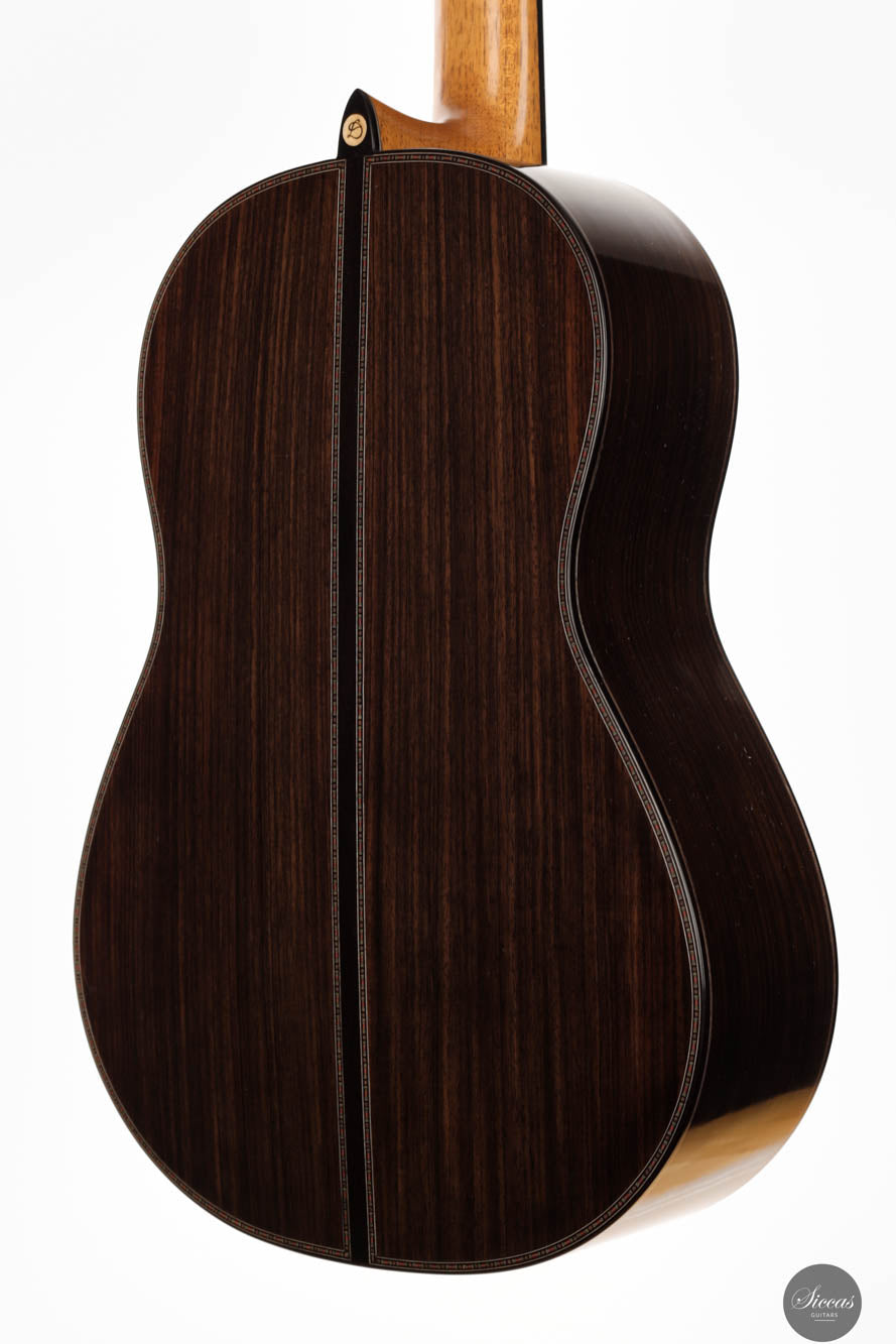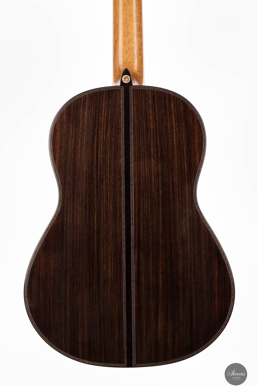 Die Donatella Salvato Limited Special Edition für die Roma Expo Guitars 2024, genannt "Gran Concerto Hommage à Daniel Friederich", repräsentiert ein neues Kapitel im Gitarrenbau, indem sie traditionelle ästhetische und akustische Eigenschaften mit moderner Handwerkskunst verbindet. Dieses exquisite Instrument ist aus italienischer Fichte für die Schalldecke und indischem Rosenholz für Rücken und Seiten gefertigt, eine Kombination, die nicht nur die visuelle Anziehungskraft steigert, sondern auch eine kraftvolle und nachhaltige Klangausgabe über alle Register hinweg bietet. Die tiefen Bässe und brillanten Höhen sind bereichert durch ein Spektrum an Nuancen, die darauf warten, vom Spieler erkundet zu werden. Mit einer 640 mm Mensur, einem Hals aus Cedrela odorata, einem Griffbrett aus afrikanischem Ebenholz und einer 12-Loch-Brücke aus indischem Rosenholz, prahlt diese Gitarre mit erstklassigen Komponenten. Sie ist fein abgestimmt mit Alessi-Muschelperl-Stimmmechaniken und geschmückt mit einer eleganten, exklusiven Rosette und Verzierungen, alles fertiggestellt mit einer sorgfältigen Schellackpolitur, die ihrer Pracht hinzufügt. Dieses Instrument besitzt eine erstaunliche Spielbarkeit durch seine 640mm Mensur und 50,5mm Sattelbreite.