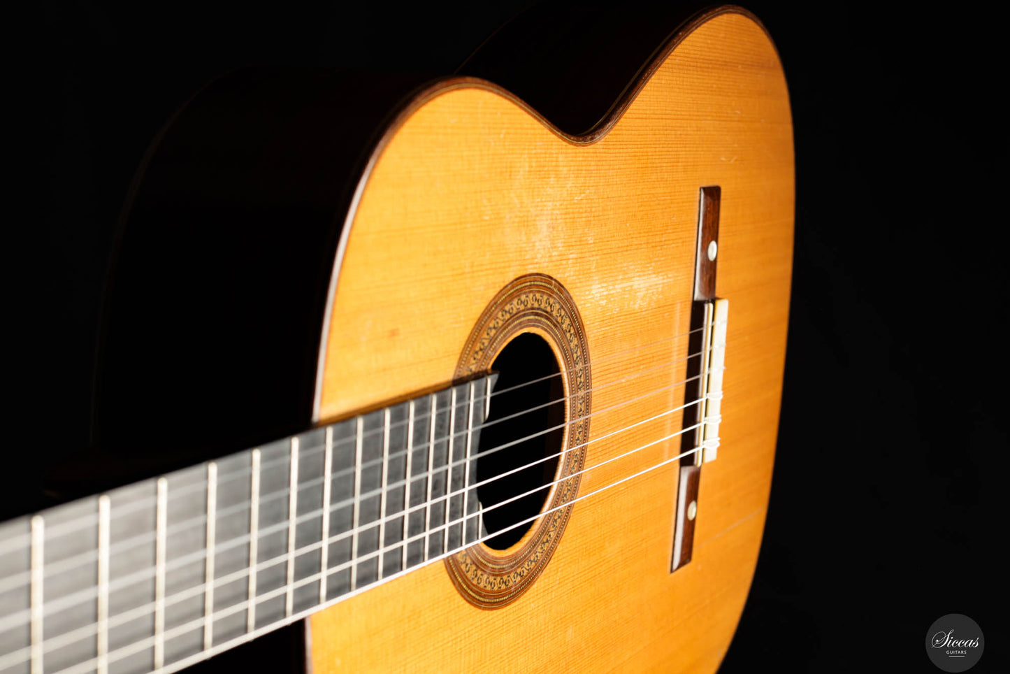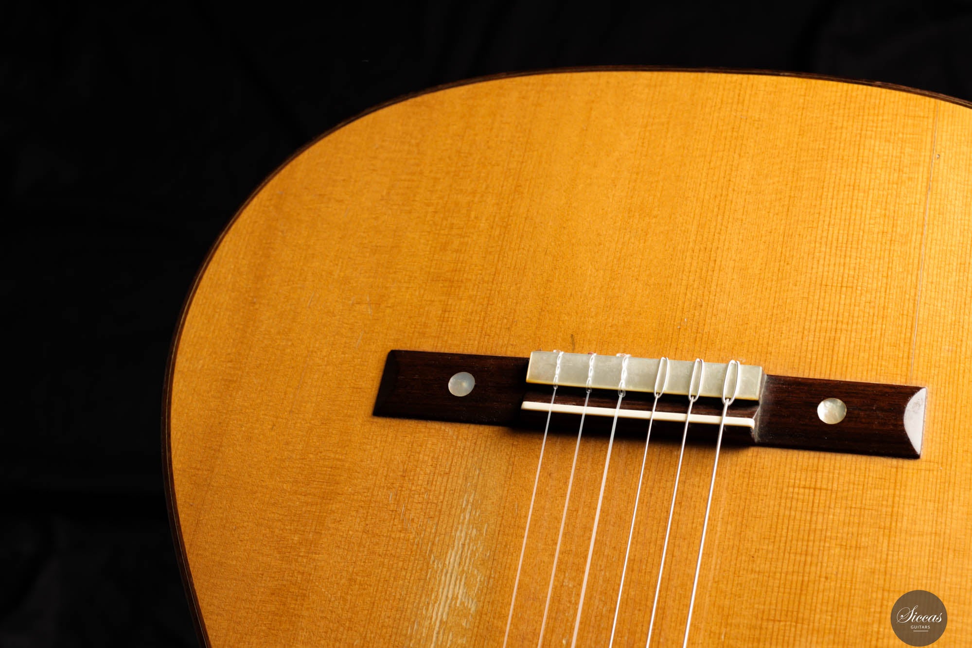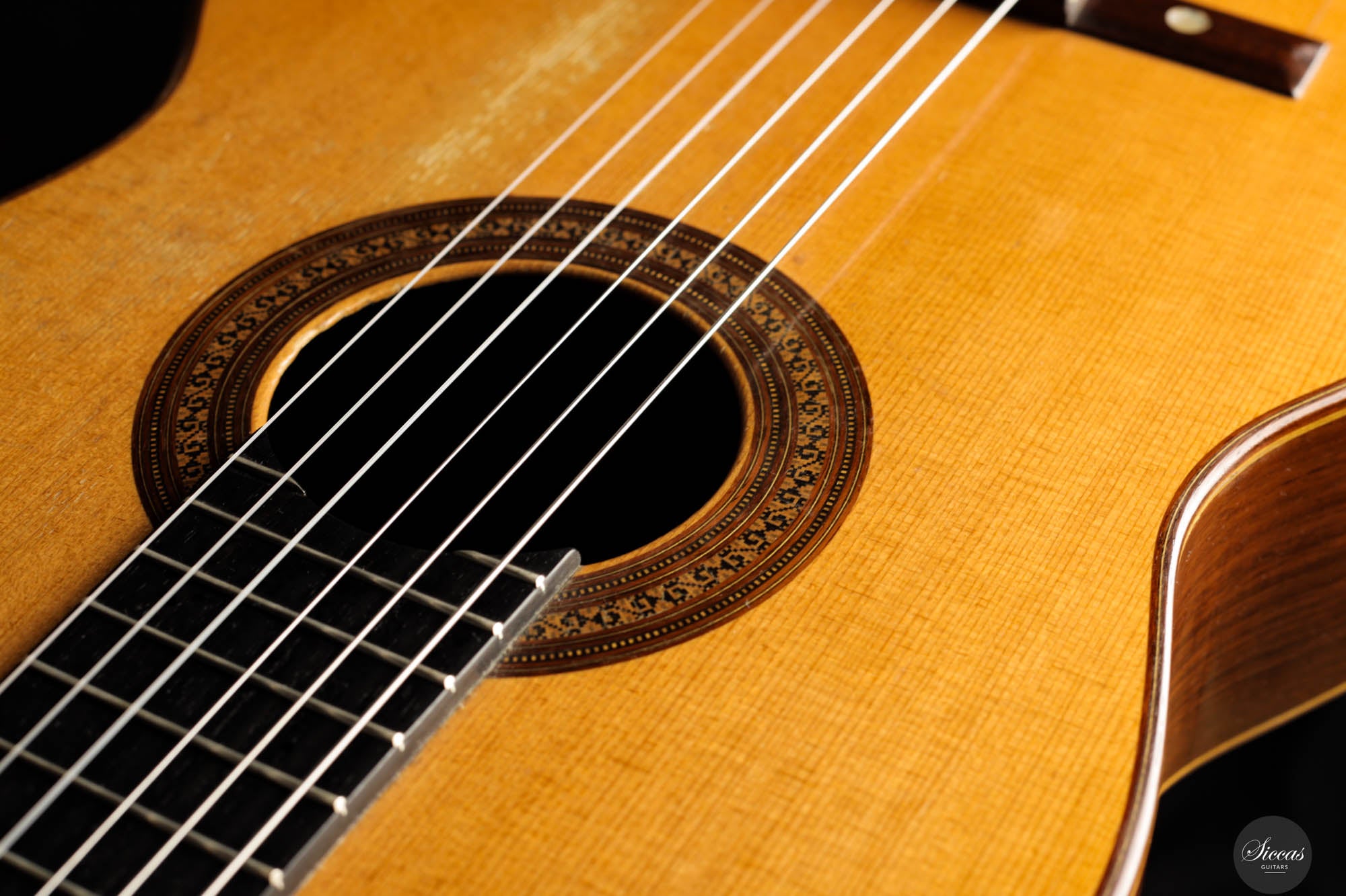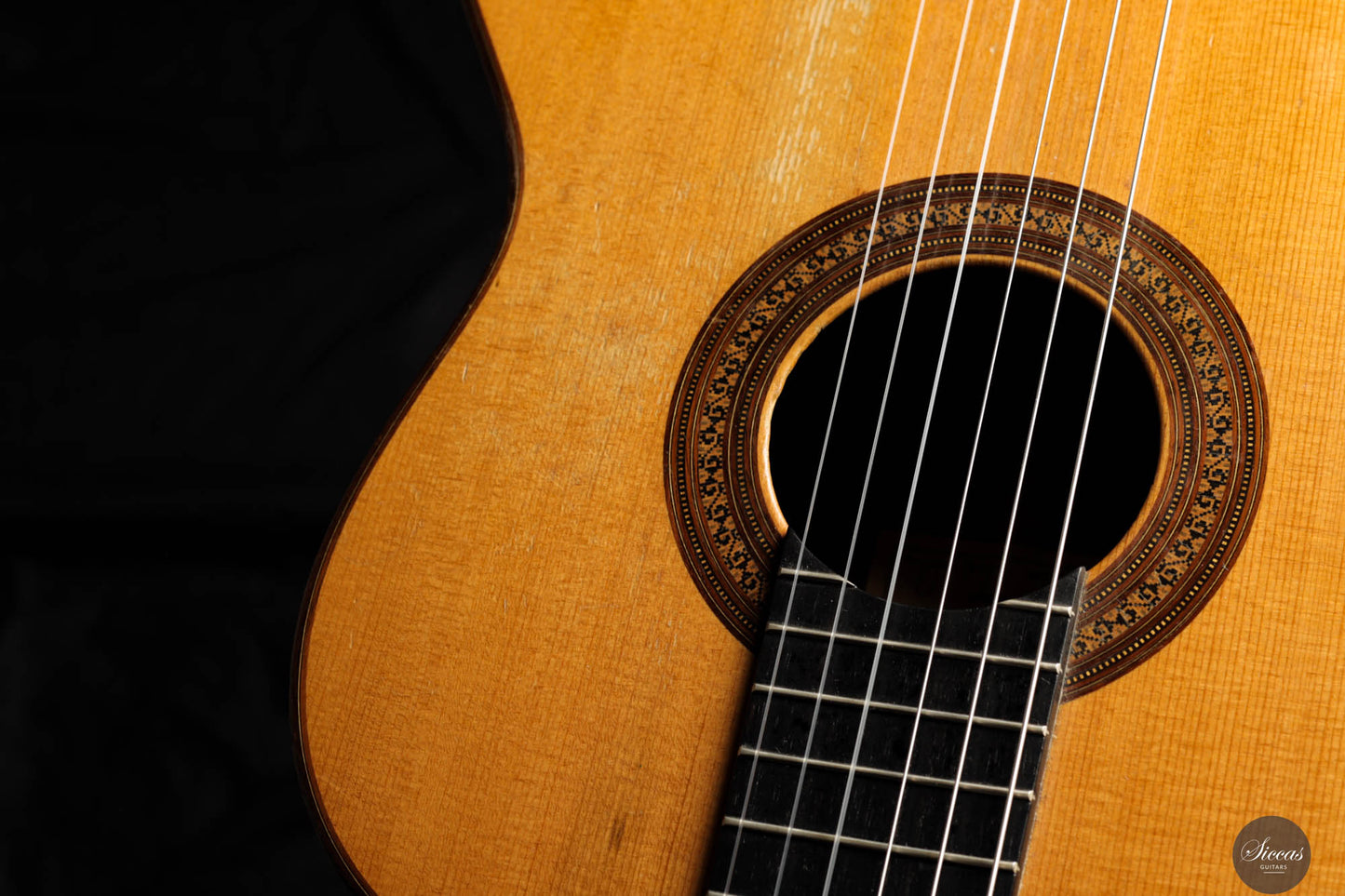 Klanglich übertrifft diese Gitarre die Erwartungen. Ihr Ton ist ausgewogen und außergewöhnlich gut differenziert, mit einer bemerkenswerten Stimmenklarheit. Die Vibratos haben eine luftige Qualität, die angenehme Obertöne erzeugt, während die Bässe klar und resonant sind. In Kombination mit einer hervorragenden Spielbarkeit bietet sie eine bereichernde Erfahrung für jeden Gitarristen. Als geschätztes, gebrauchtes Instrument weist sie mehrere Gebrauchsspuren auf, die ihre strukturelle Integrität jedoch nicht beeinträchtigen. Drei professionell reparierte Risse wurden mit diamantförmigen Klötzchen stabilisiert: einer auf der Decke hinter dem Steg, einer an der Schnittstelle zwischen Decke und rechter Seite des Griffbretts und einer auf der Unterseite. Diese Gitarre ist sowohl ein historischer Schatz als auch ein außergewöhnliches Instrument für die Aufführung.