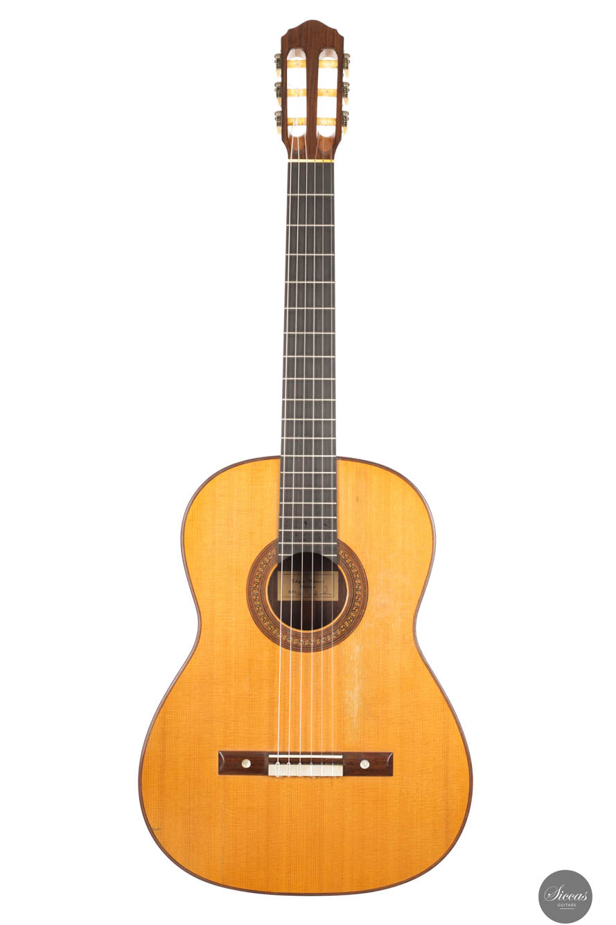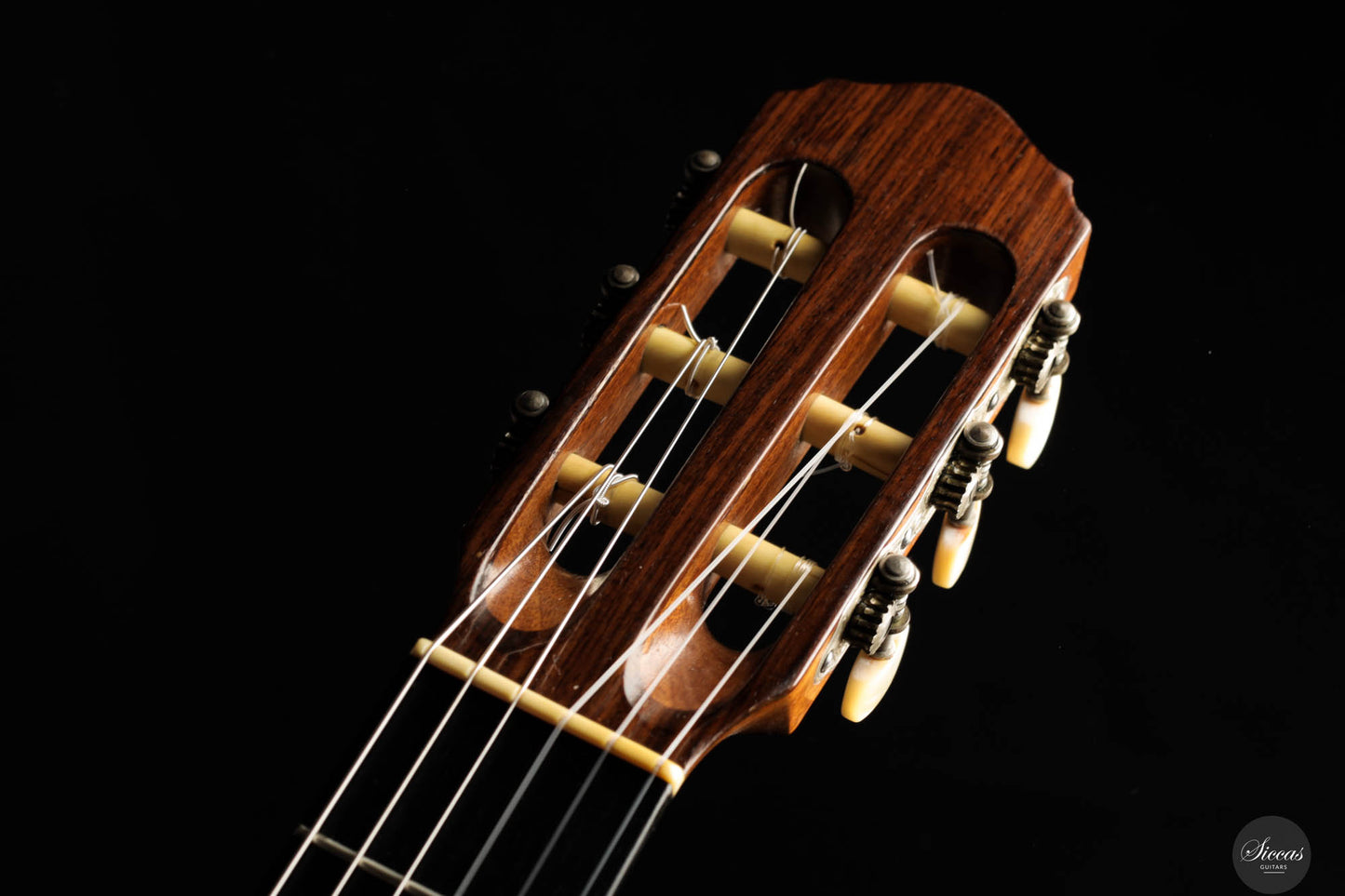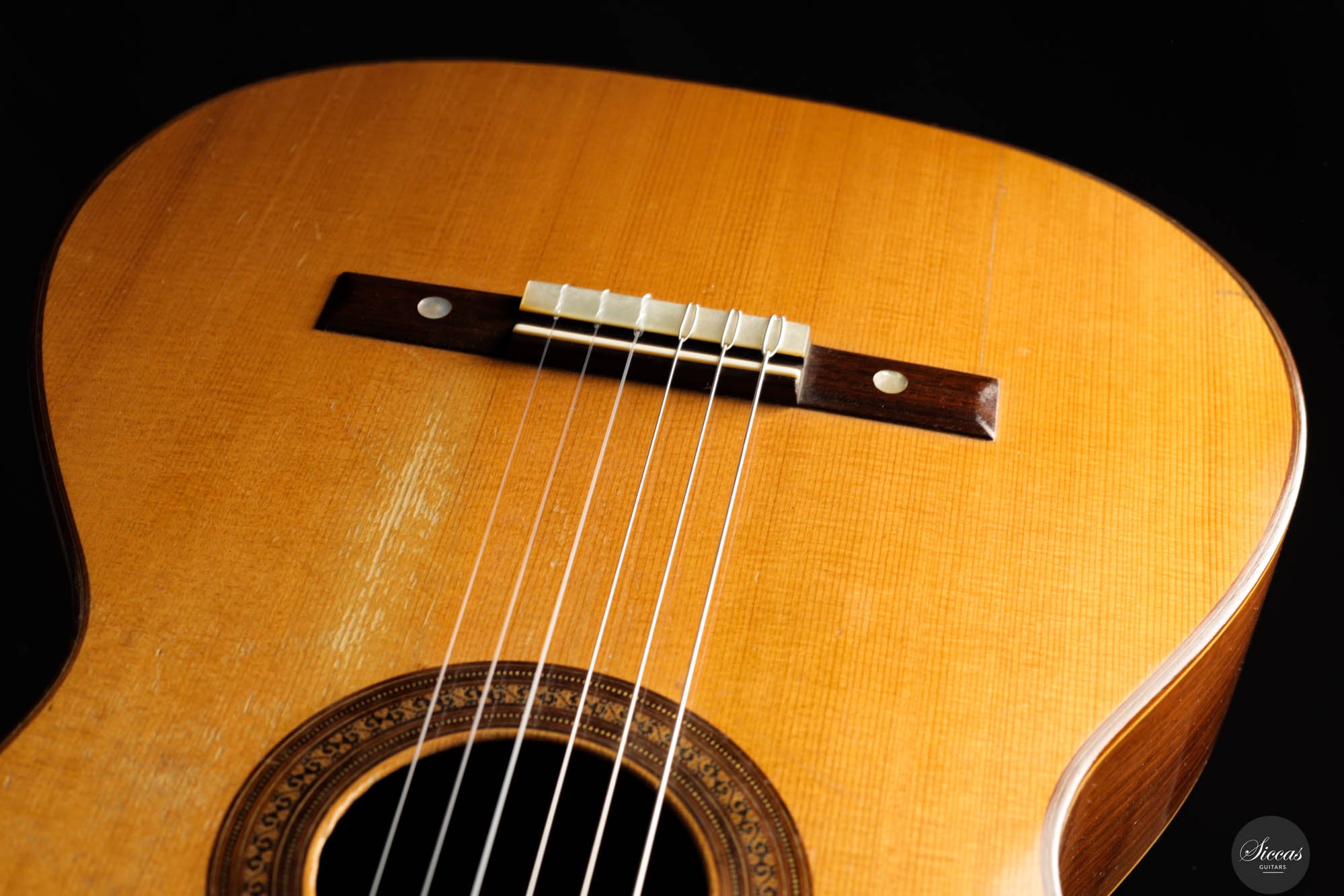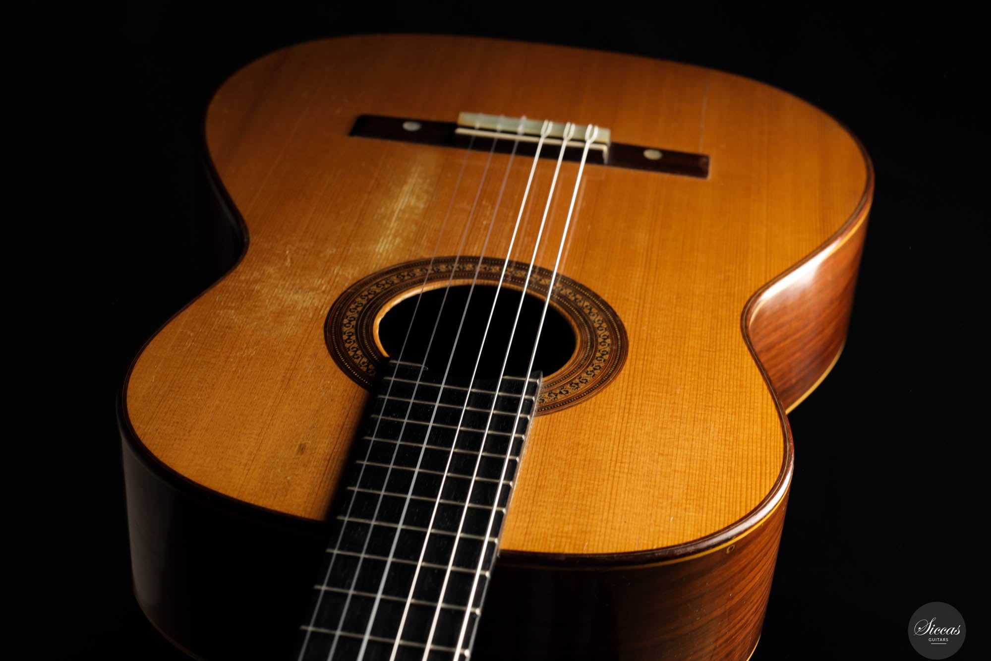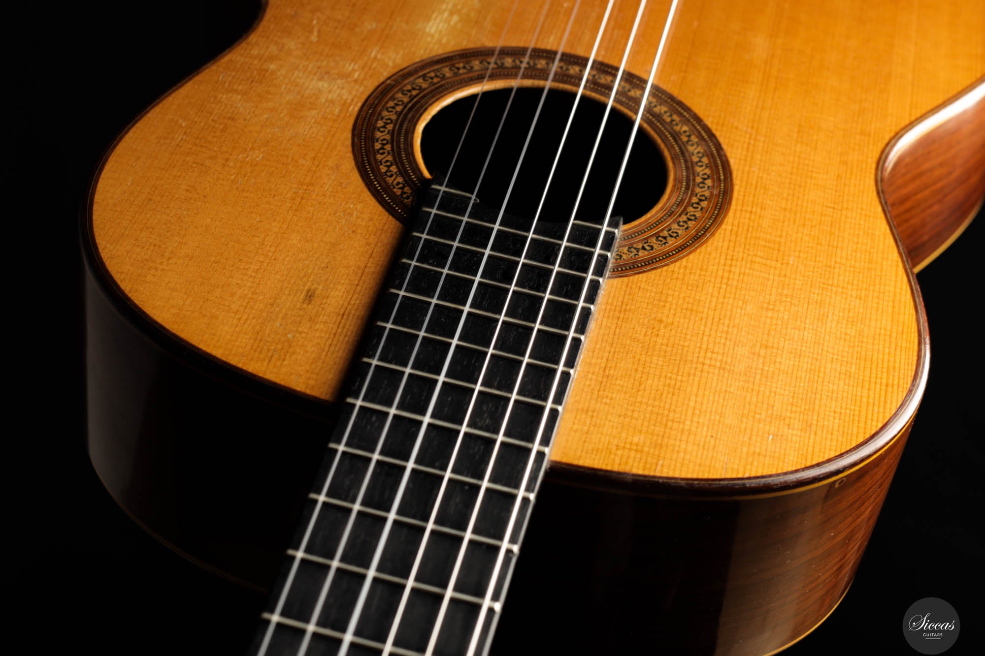 Klanglich übertrifft diese Gitarre die Erwartungen. Ihr Ton ist ausgewogen und außergewöhnlich gut differenziert, mit einer bemerkenswerten Stimmenklarheit. Die Vibratos haben eine luftige Qualität, die angenehme Obertöne erzeugt, während die Bässe klar und resonant sind. In Kombination mit einer hervorragenden Spielbarkeit bietet sie eine bereichernde Erfahrung für jeden Gitarristen. Als geschätztes, gebrauchtes Instrument weist sie mehrere Gebrauchsspuren auf, die ihre strukturelle Integrität jedoch nicht beeinträchtigen. Drei professionell reparierte Risse wurden mit diamantförmigen Klötzchen stabilisiert: einer auf der Decke hinter dem Steg, einer an der Schnittstelle zwischen Decke und rechter Seite des Griffbretts und einer auf der Unterseite. Diese Gitarre ist sowohl ein historischer Schatz als auch ein außergewöhnliches Instrument für die Aufführung.
