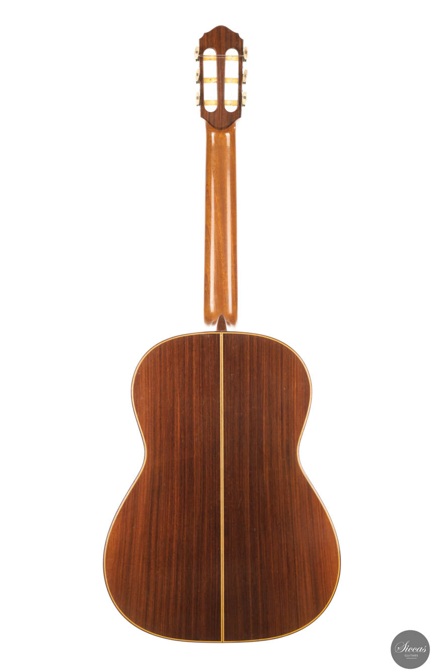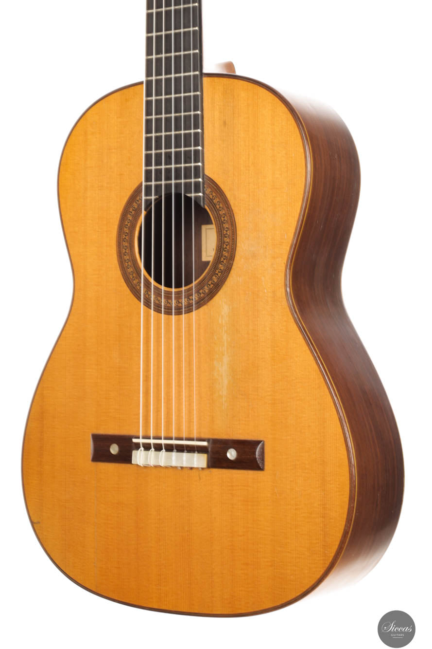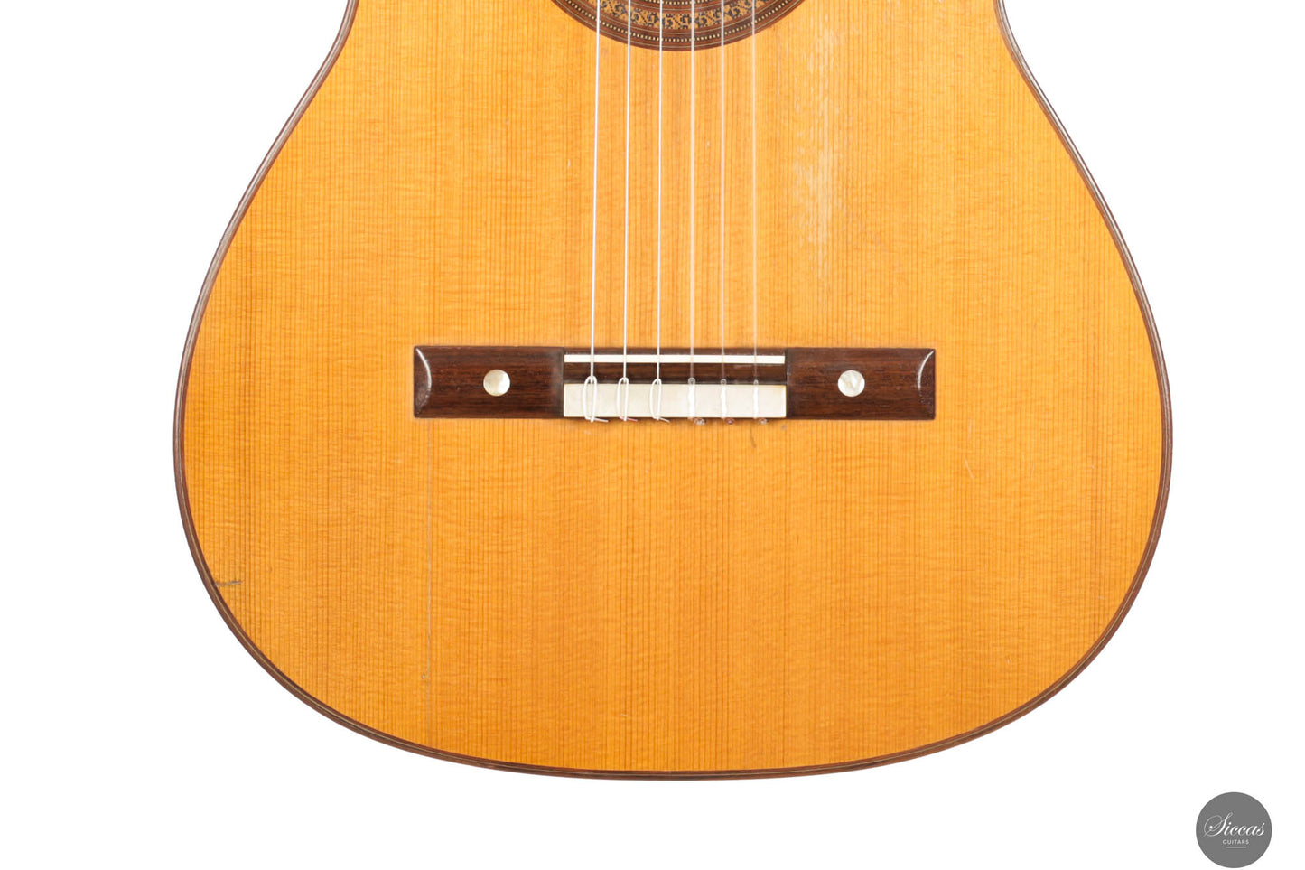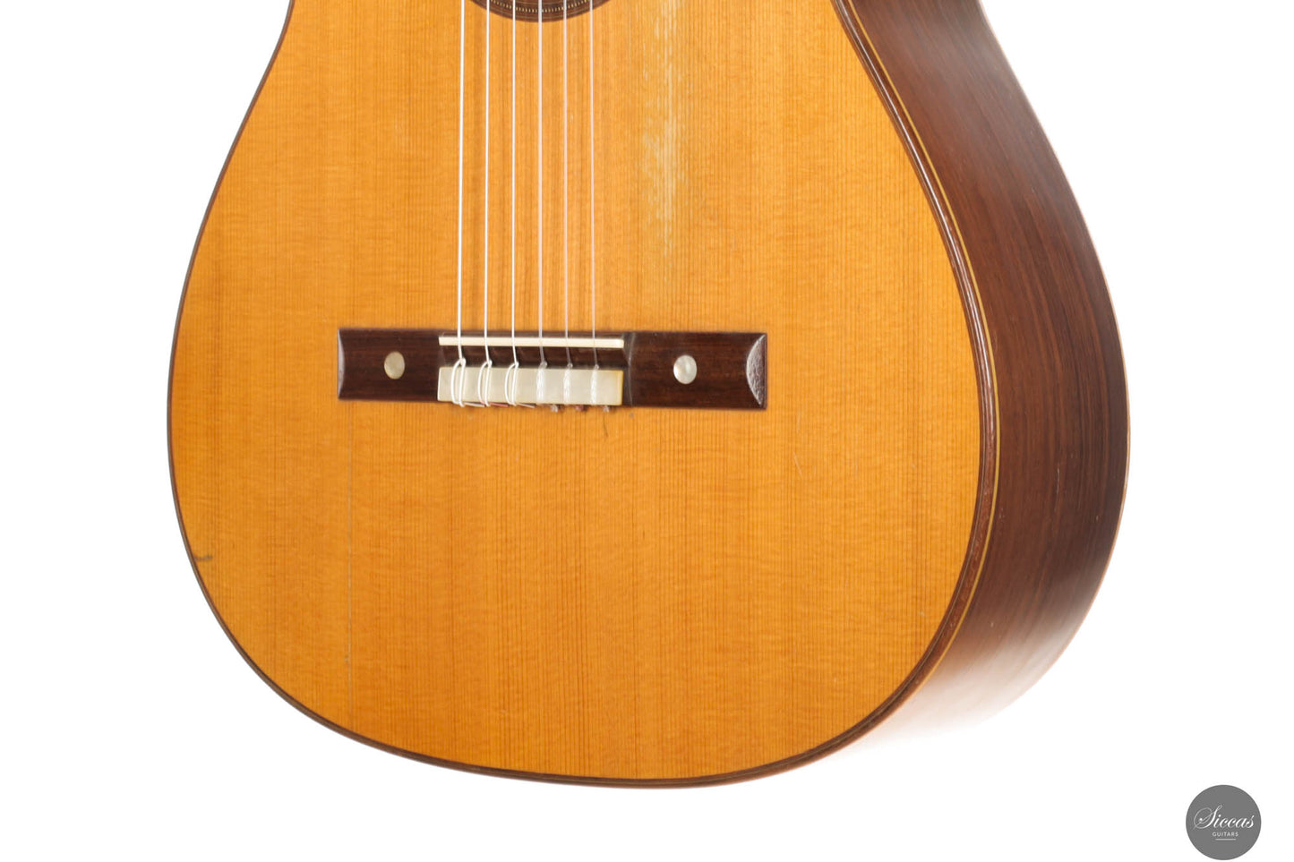 Klanglich übertrifft diese Gitarre die Erwartungen. Ihr Ton ist ausgewogen und außergewöhnlich gut differenziert, mit einer bemerkenswerten Stimmenklarheit. Die Vibratos haben eine luftige Qualität, die angenehme Obertöne erzeugt, während die Bässe klar und resonant sind. In Kombination mit einer hervorragenden Spielbarkeit bietet sie eine bereichernde Erfahrung für jeden Gitarristen. Als geschätztes, gebrauchtes Instrument weist sie mehrere Gebrauchsspuren auf, die ihre strukturelle Integrität jedoch nicht beeinträchtigen. Drei professionell reparierte Risse wurden mit diamantförmigen Klötzchen stabilisiert: einer auf der Decke hinter dem Steg, einer an der Schnittstelle zwischen Decke und rechter Seite des Griffbretts und einer auf der Unterseite. Diese Gitarre ist sowohl ein historischer Schatz als auch ein außergewöhnliches Instrument für die Aufführung.