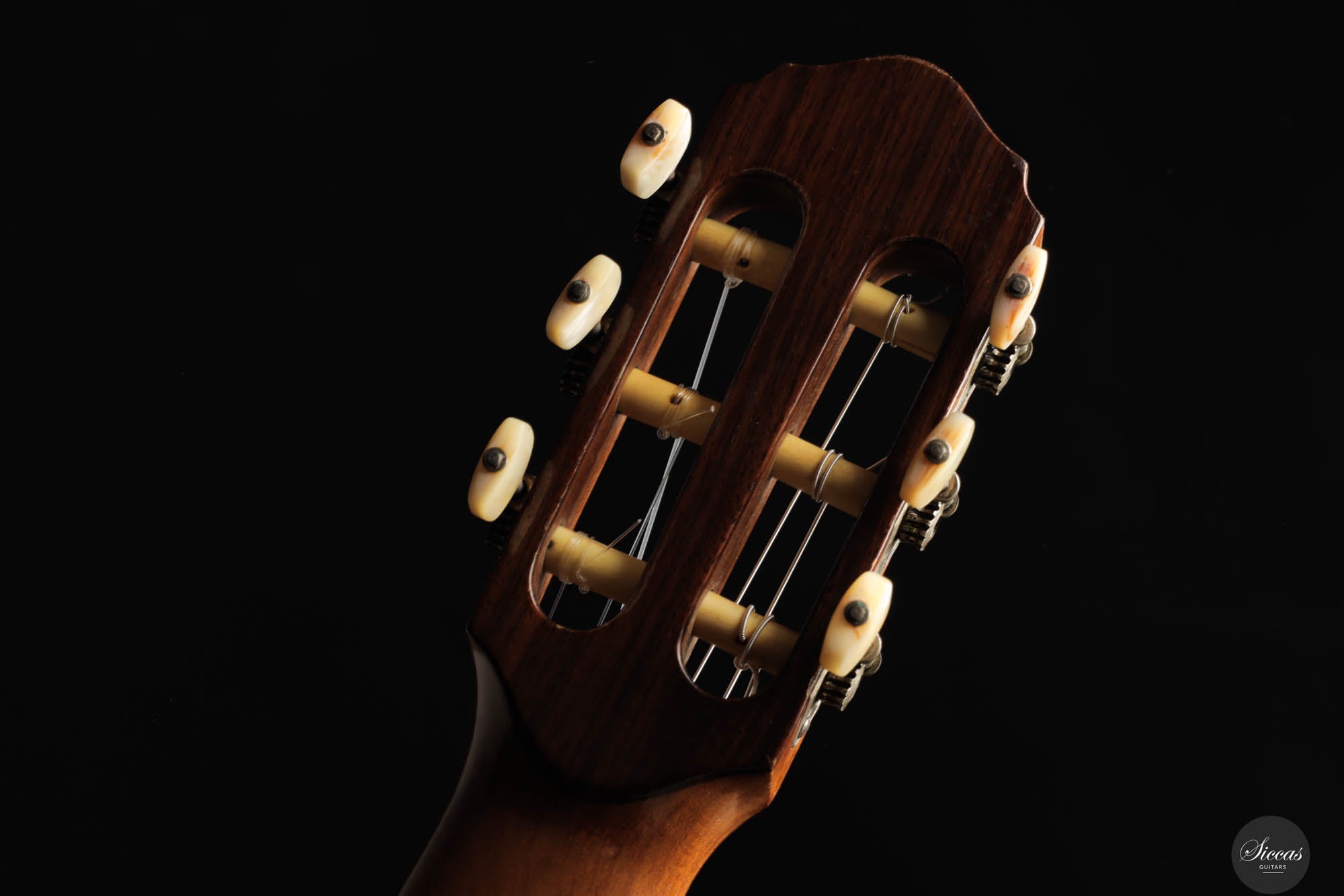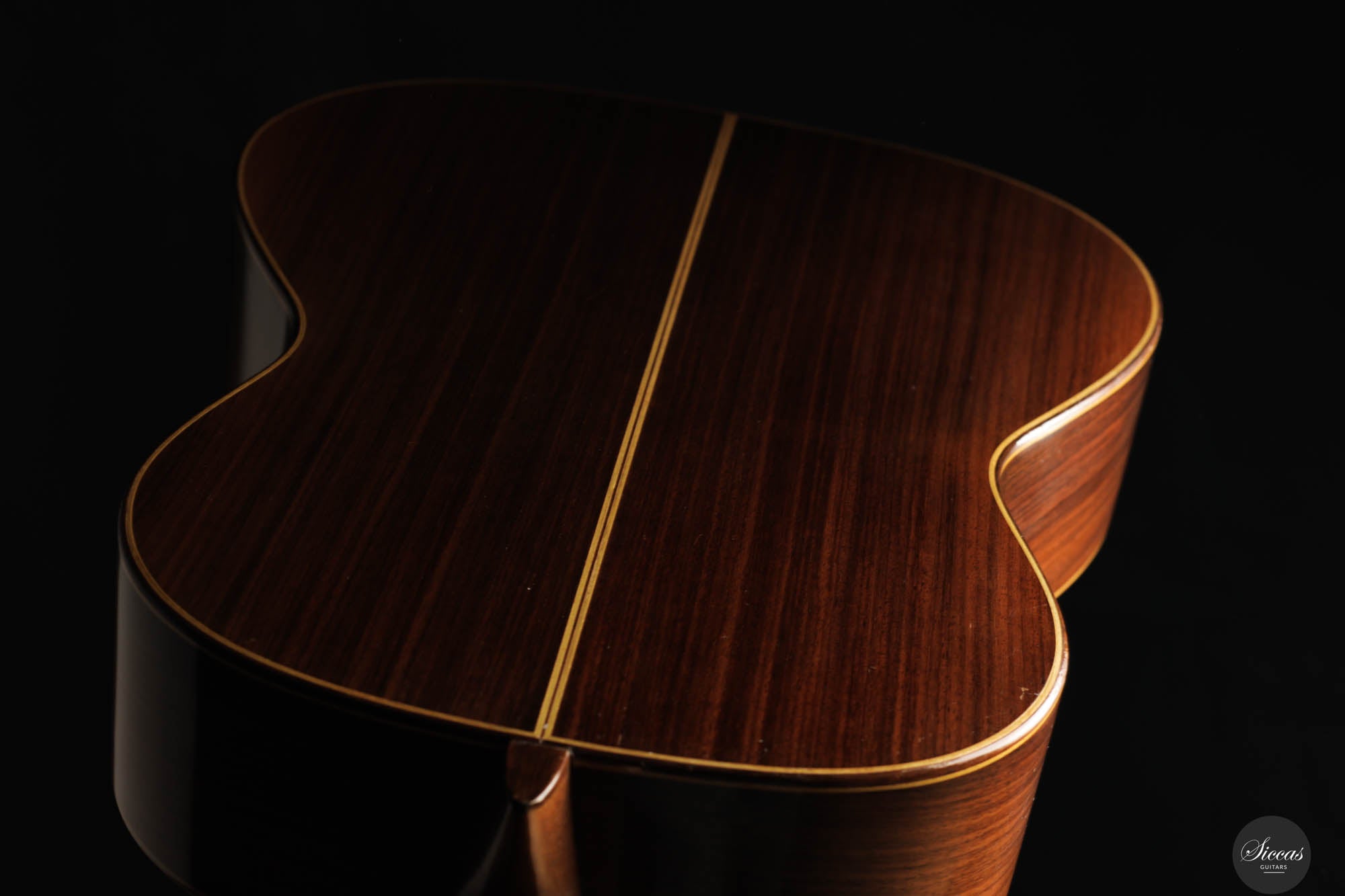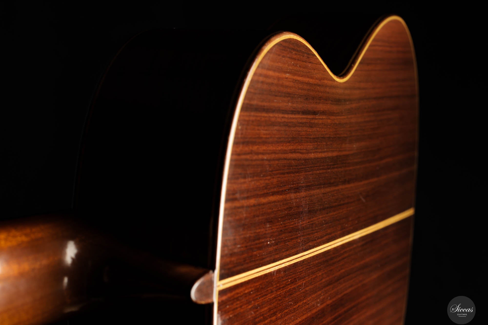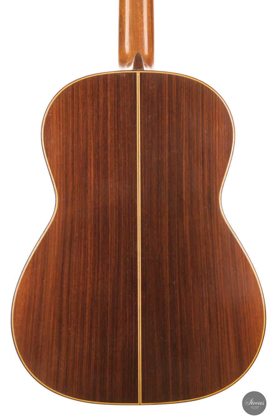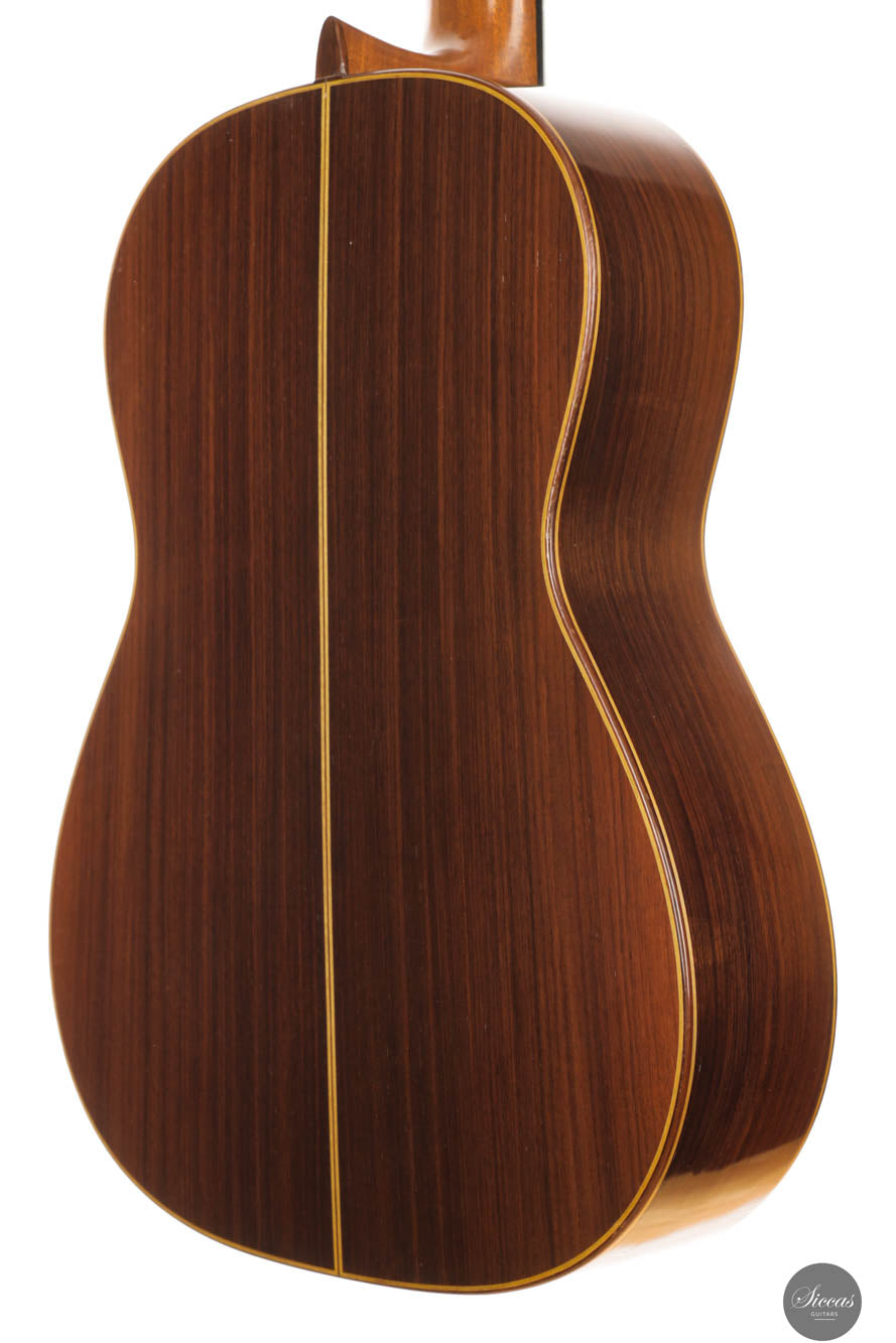 Klanglich übertrifft diese Gitarre die Erwartungen. Ihr Ton ist ausgewogen und außergewöhnlich gut differenziert, mit einer bemerkenswerten Stimmenklarheit. Die Vibratos haben eine luftige Qualität, die angenehme Obertöne erzeugt, während die Bässe klar und resonant sind. In Kombination mit einer hervorragenden Spielbarkeit bietet sie eine bereichernde Erfahrung für jeden Gitarristen. Als geschätztes, gebrauchtes Instrument weist sie mehrere Gebrauchsspuren auf, die ihre strukturelle Integrität jedoch nicht beeinträchtigen. Drei professionell reparierte Risse wurden mit diamantförmigen Klötzchen stabilisiert: einer auf der Decke hinter dem Steg, einer an der Schnittstelle zwischen Decke und rechter Seite des Griffbretts und einer auf der Unterseite. Diese Gitarre ist sowohl ein historischer Schatz als auch ein außergewöhnliches Instrument für die Aufführung.