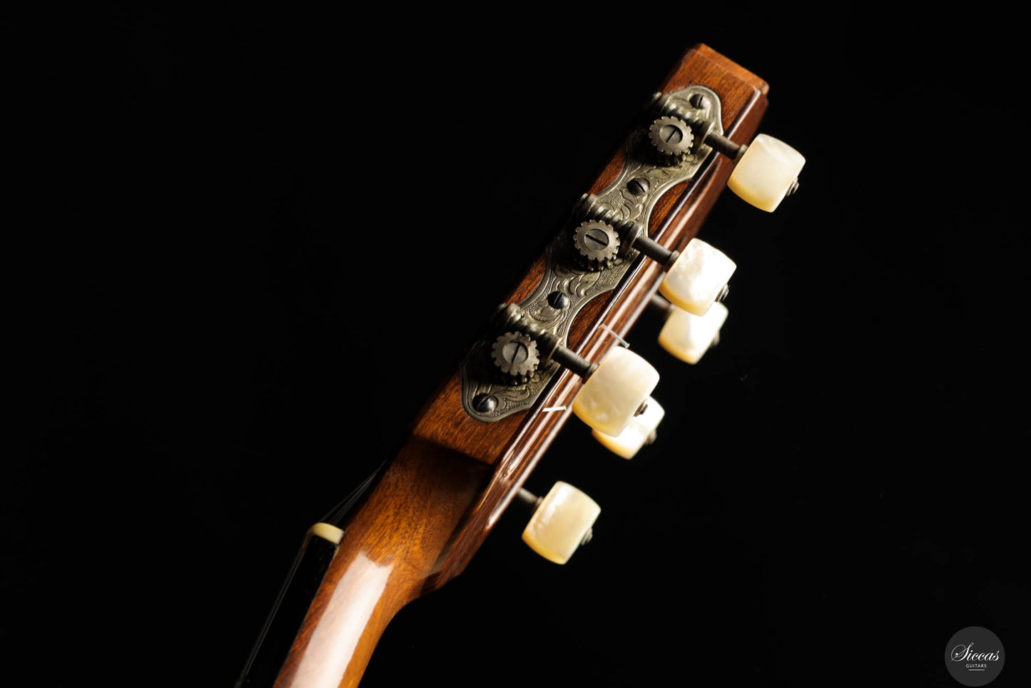Diese Gitarre, die 1953 in München gebaut wurde, gehört zu den bemerkenswertesten Modellen, die Edgar Mönch gefertigt hat. Sie verfügt über eine Fichtendecke mit beeindruckender Maserung, gepaart mit hellfarbenem indischen Palisander für Boden und Zargen, ergänzt durch passende helle Einlagen. Die originalen Landstorfer-Mechaniken, die in die Kopfplatte eingelassen sind, zeugen von der akribischen Liebe zum Detail des Handwerkers. Diese ästhetischen Elemente unterstreichen Mönchs Engagement, Schönheit und Funktionalität harmonisch zu verbinden, und schaffen ein visuell beeindruckendes Instrument, das zeitlos bleibt.
