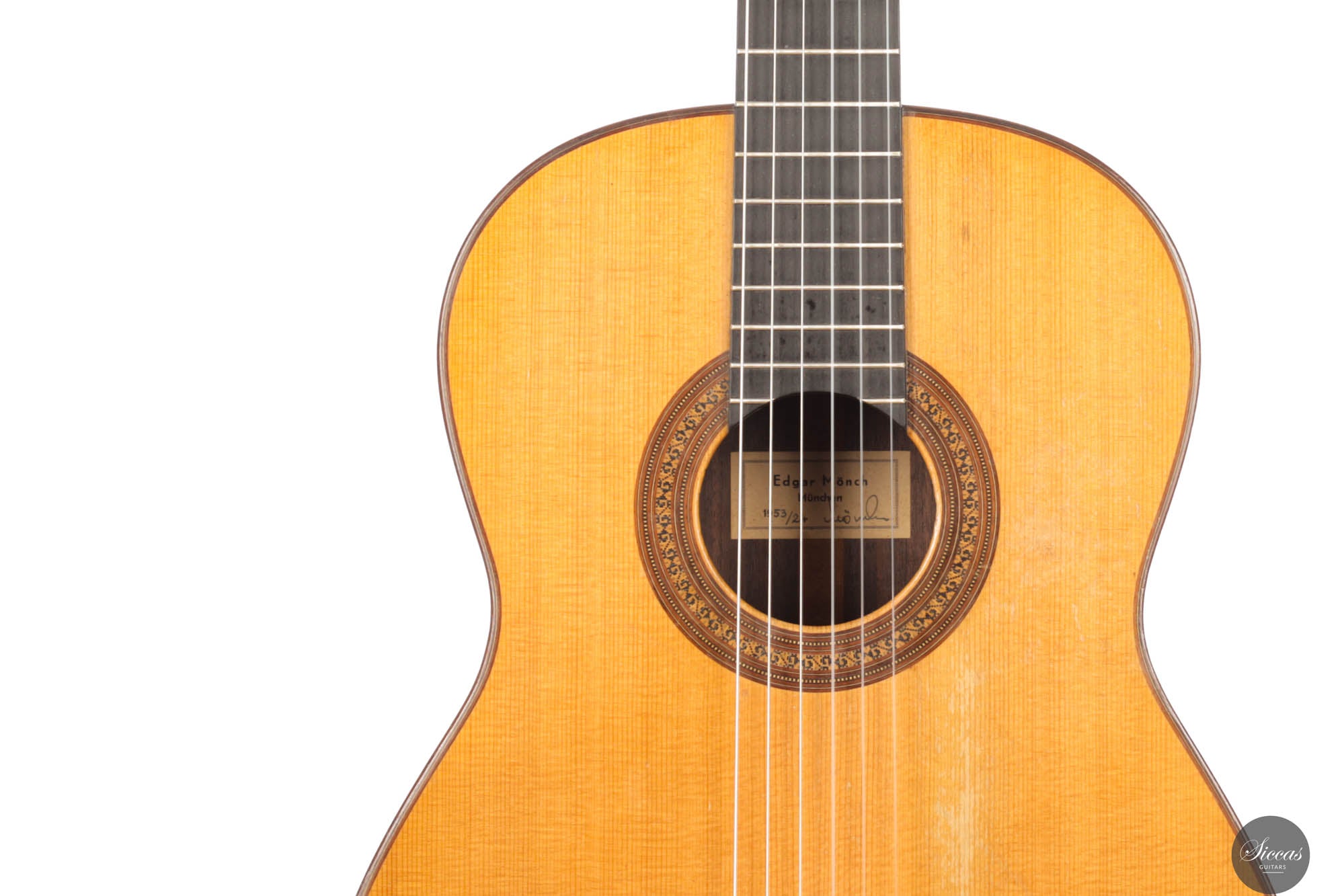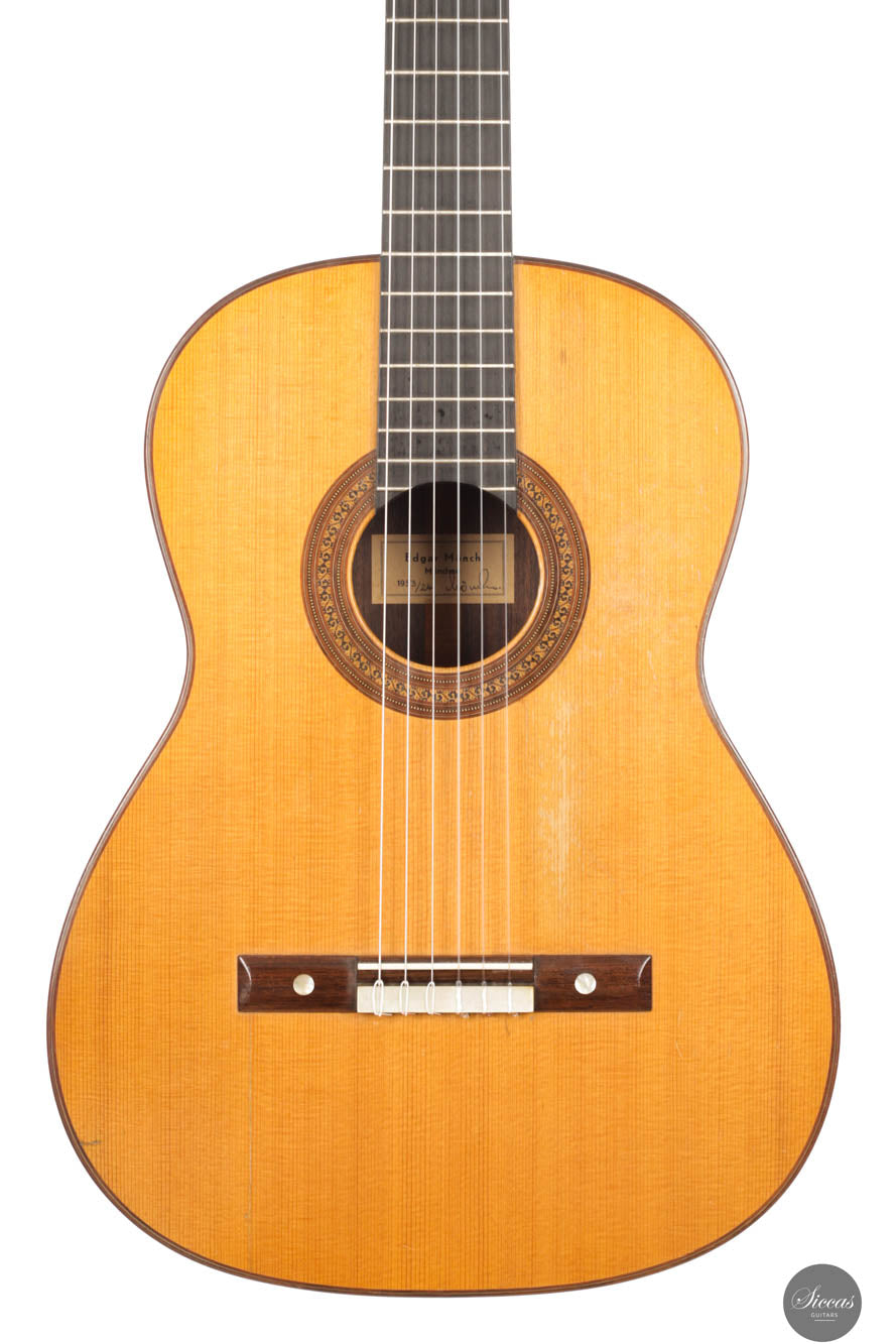 Edgar Mönch, geboren am 29. Oktober 1907 in Leipzig, entstammte einer Familie, die tief in der Musik verwurzelt war. Seine Mutter, eine russische Pianistin, und sein Vater, ein Geiger und Kapellmeister, förderten seine künstlerische Erziehung. Mönch verbrachte seine frühen Jahre in Russland, wo er die Schule besuchte, bevor er ein Ingenieurstudium an der Technischen Universität Danzig (heute Gdańsk, Polen) aufnahm. Später arbeitete er als technischer Dolmetscher im Stoka-Werk in Prag und studierte gleichzeitig Violine am Konservatorium. Seine Einführung in den Gitarrenbau erfolgte während des Zweiten Weltkriegs, als er in einem englischen Kriegsgefangenenlager interniert war. Dort erlernte er das Handwerk von einem Geigenbauer aus Breslau (heute Wrocław, Polen), was den Beginn seiner lebenslangen Leidenschaft markierte. Nach seiner Freilassung im Jahr 1947 widmete sich Mönch voll und ganz dem Gitarrenbau und verfeinerte sein Können durch Studien in Spanien bei dem renommierten Gitarrenbauer Marcelo Barbero in Madrid.
