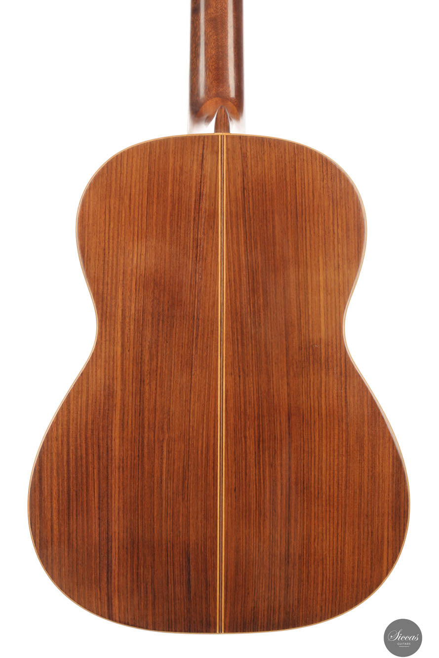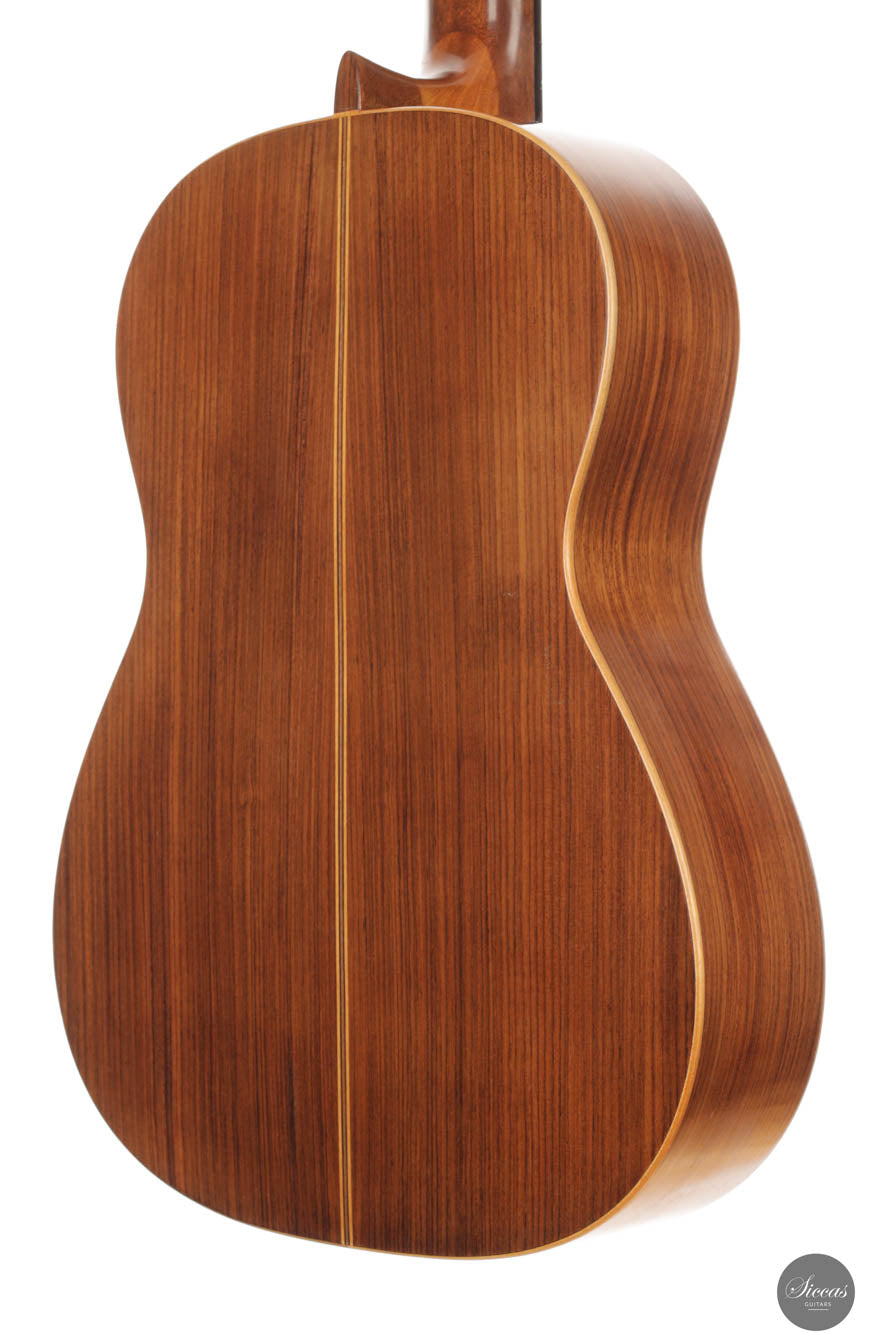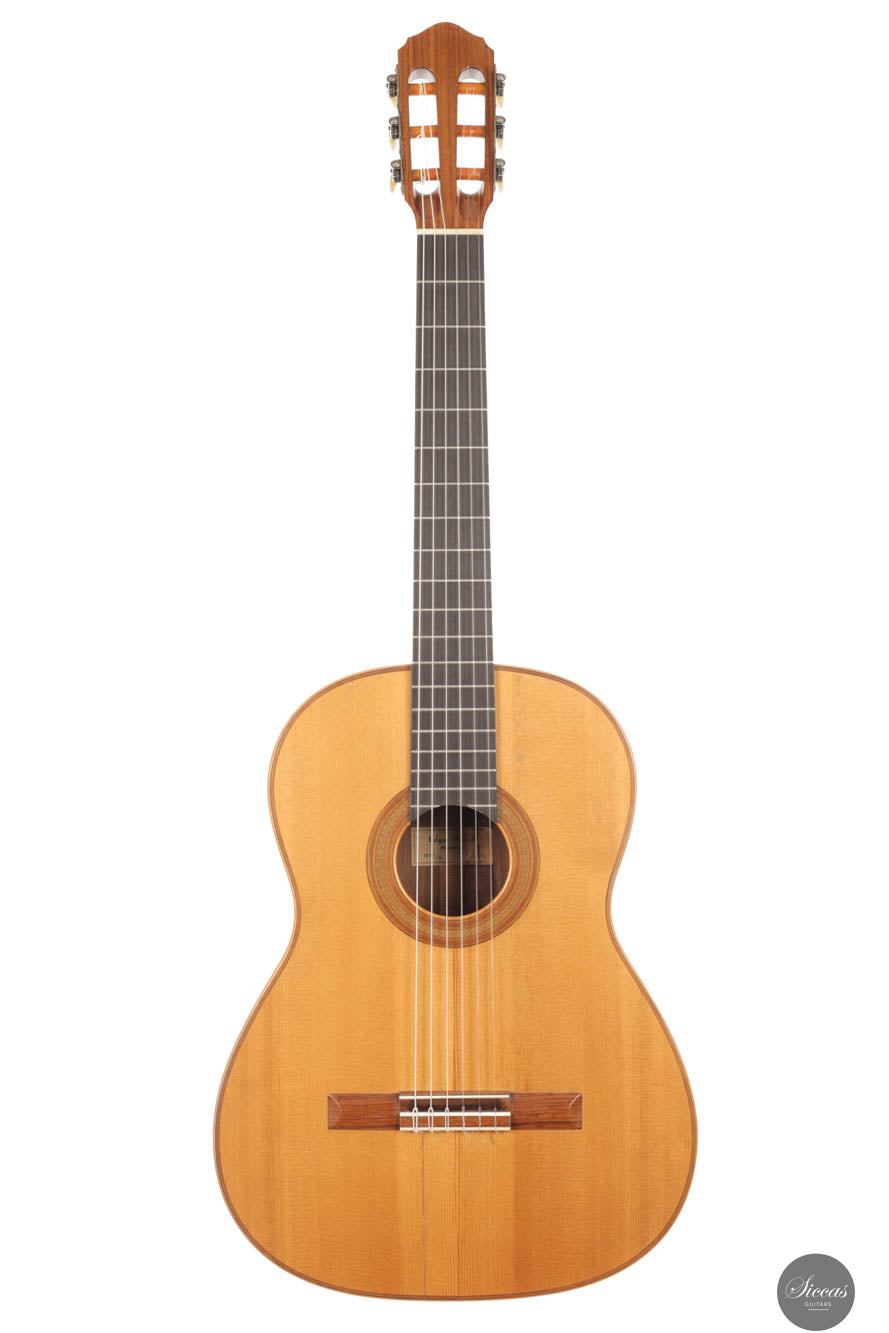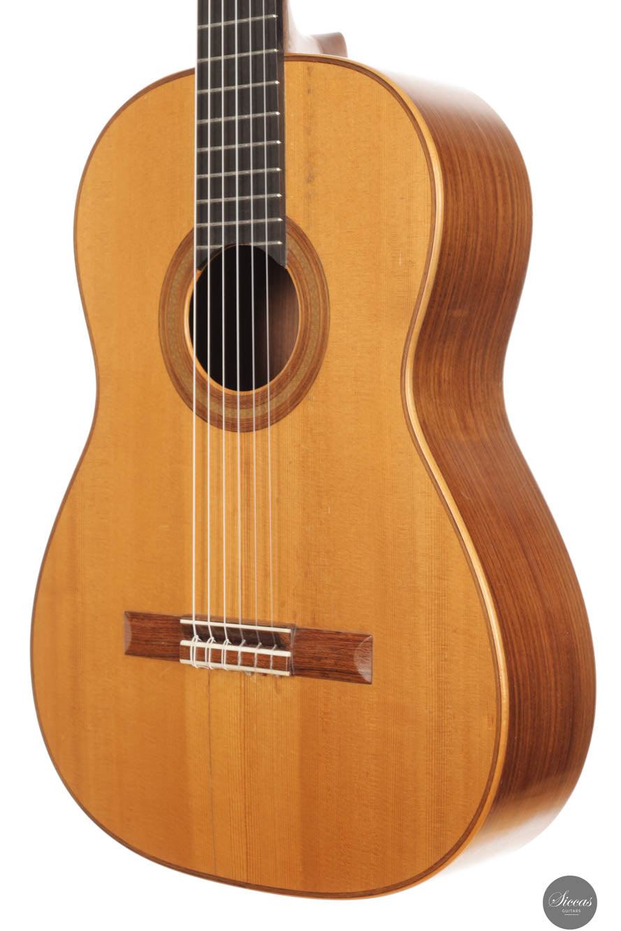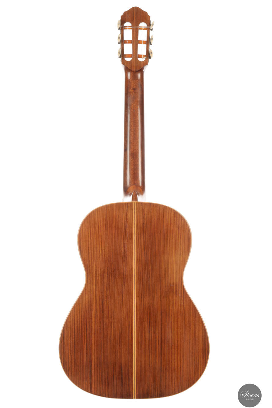 Diese Gitarre wurde 1959 in München gebaut und verfügt über eine Fichtendecke sowie Rücken und Zargen aus indischem Palisander. Die originalen, wunderschönen Mechaniken stammen von Landstorfer. Klanglich zeichnen sich die Höhen durch einen direkten, hellen Ton aus, der zugleich rund bleibt, ohne jegliche Schärfe. Diese Eigenschaften sorgen für eine großartige Klarheit und Stimmtrennung sowie für eine luftige Qualität in den Vibratos, die die angenehmen Obertöne der Gitarre hervorheben. Die Bässe sind gut entwickelt und ergänzen die Höhen adäquat, ohne sie zu überlagern oder in den Hintergrund zu treten. Die Bespielbarkeit ist ausgezeichnet. Die Gitarre weist vier professionell reparierte Risse in der Decke und einen am Boden auf, ebenso wie Gebrauchsspuren auf der Decke. Dennoch befindet sie sich in einem guten Zustand und ist uneingeschränkt spielbar.