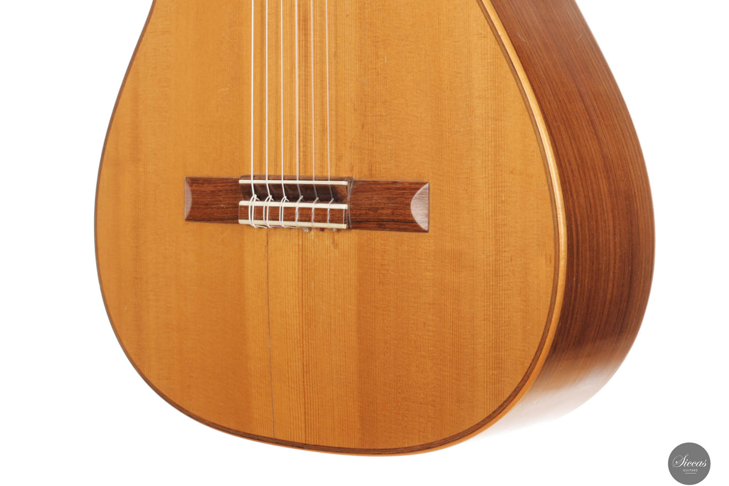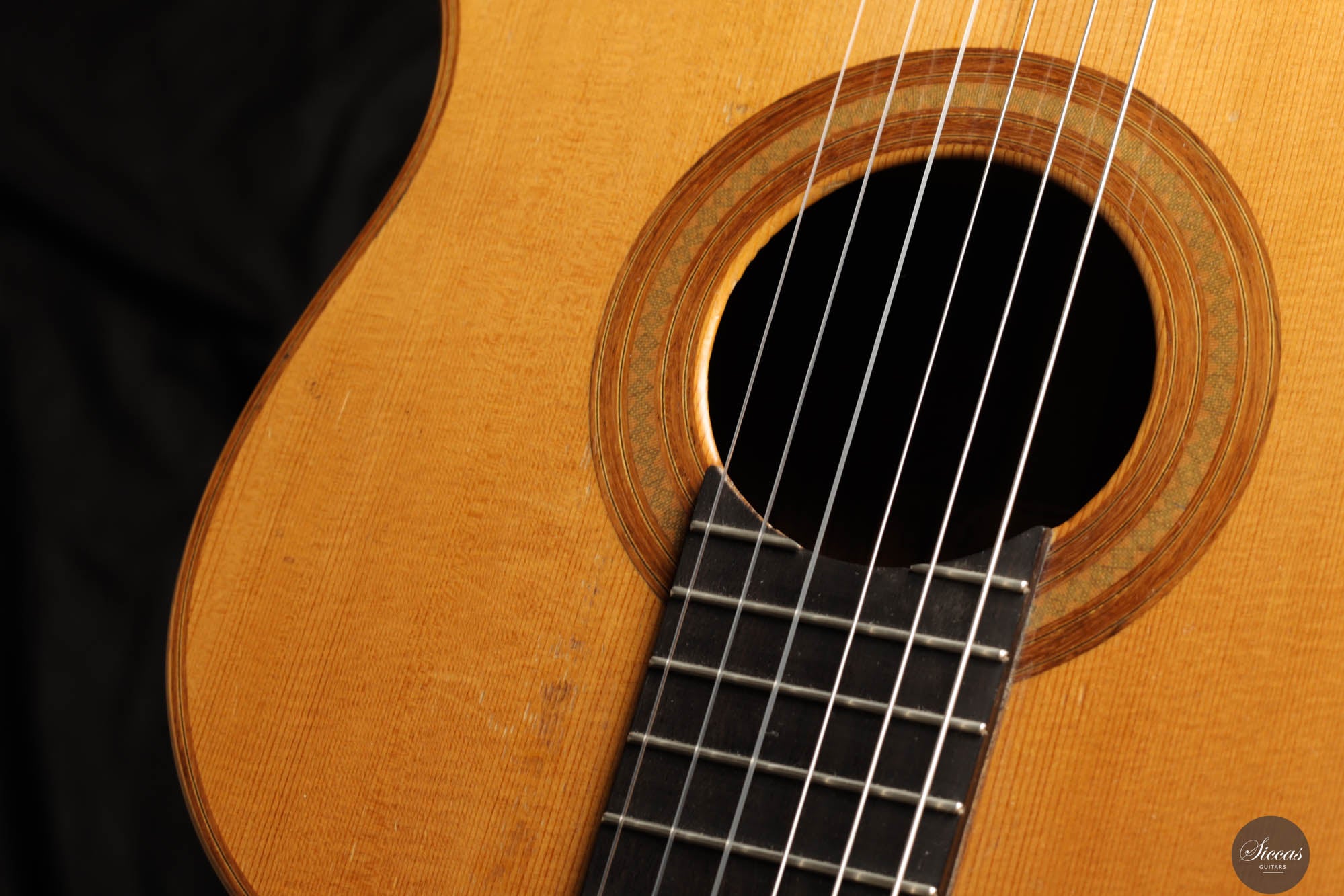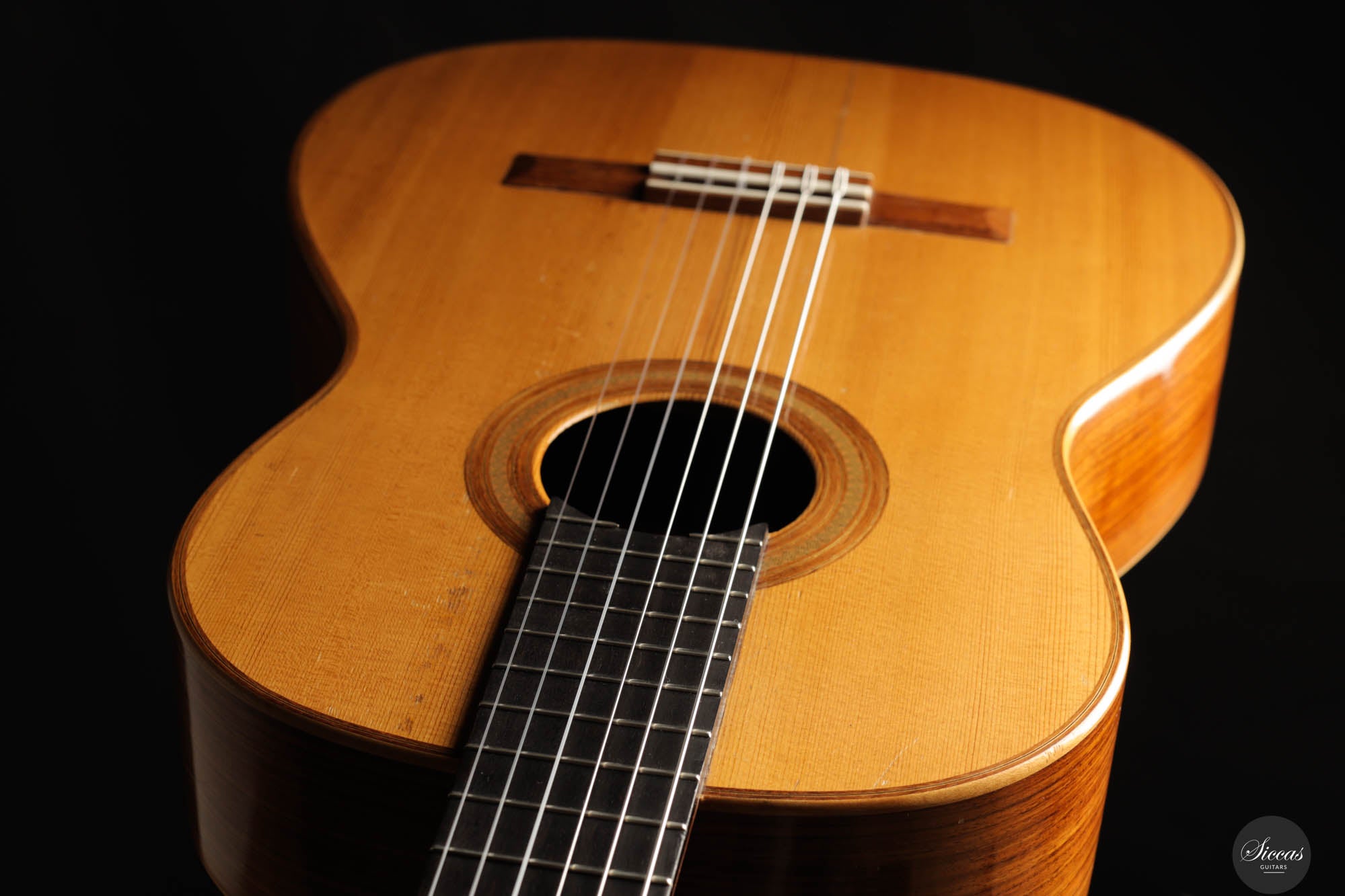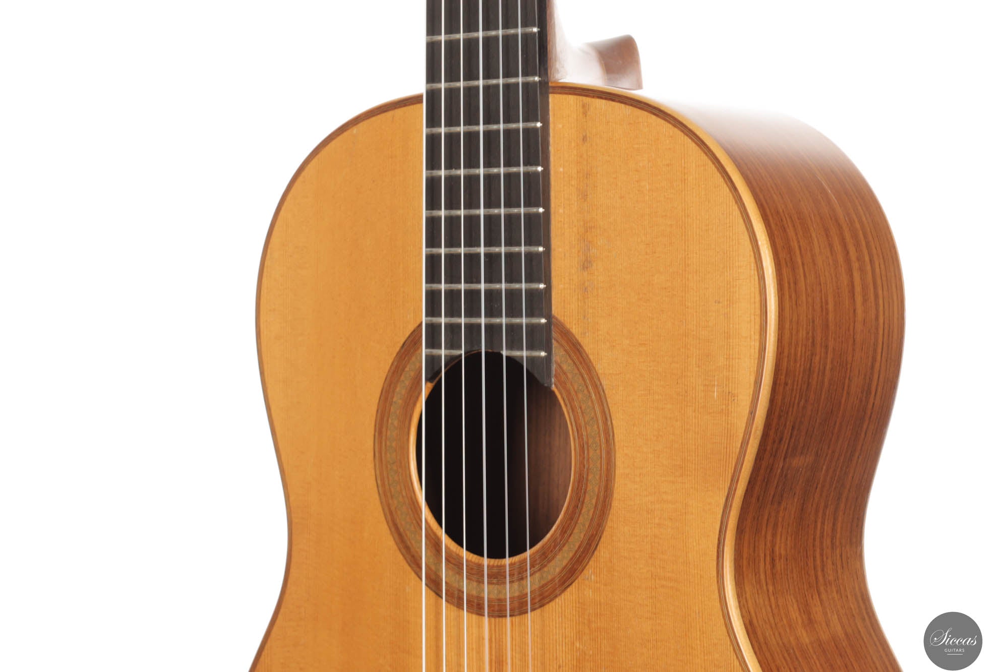 Diese Gitarre wurde 1959 in München gebaut und verfügt über eine Fichtendecke sowie Rücken und Zargen aus indischem Palisander. Die originalen, wunderschönen Mechaniken stammen von Landstorfer. Klanglich zeichnen sich die Höhen durch einen direkten, hellen Ton aus, der zugleich rund bleibt, ohne jegliche Schärfe. Diese Eigenschaften sorgen für eine großartige Klarheit und Stimmtrennung sowie für eine luftige Qualität in den Vibratos, die die angenehmen Obertöne der Gitarre hervorheben. Die Bässe sind gut entwickelt und ergänzen die Höhen adäquat, ohne sie zu überlagern oder in den Hintergrund zu treten. Die Bespielbarkeit ist ausgezeichnet. Die Gitarre weist vier professionell reparierte Risse in der Decke und einen am Boden auf, ebenso wie Gebrauchsspuren auf der Decke. Dennoch befindet sie sich in einem guten Zustand und ist uneingeschränkt spielbar.