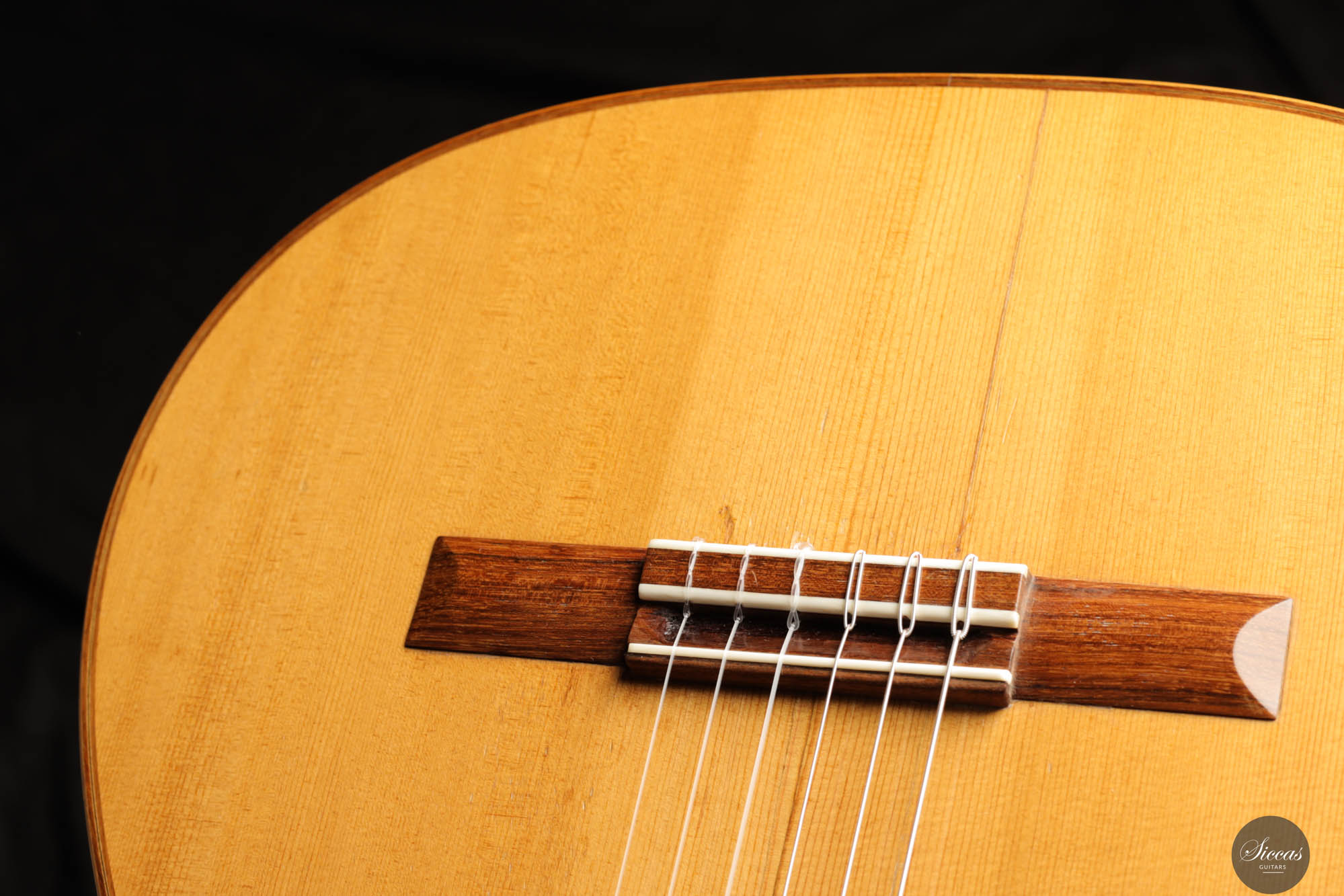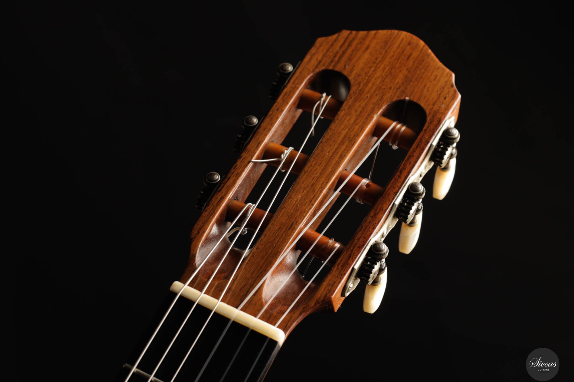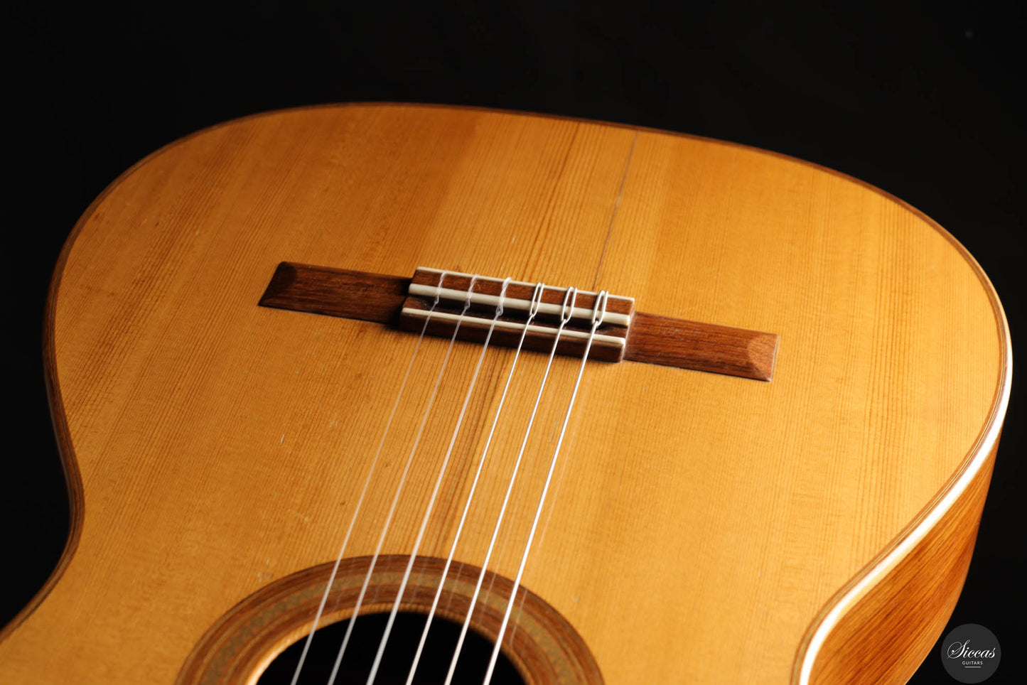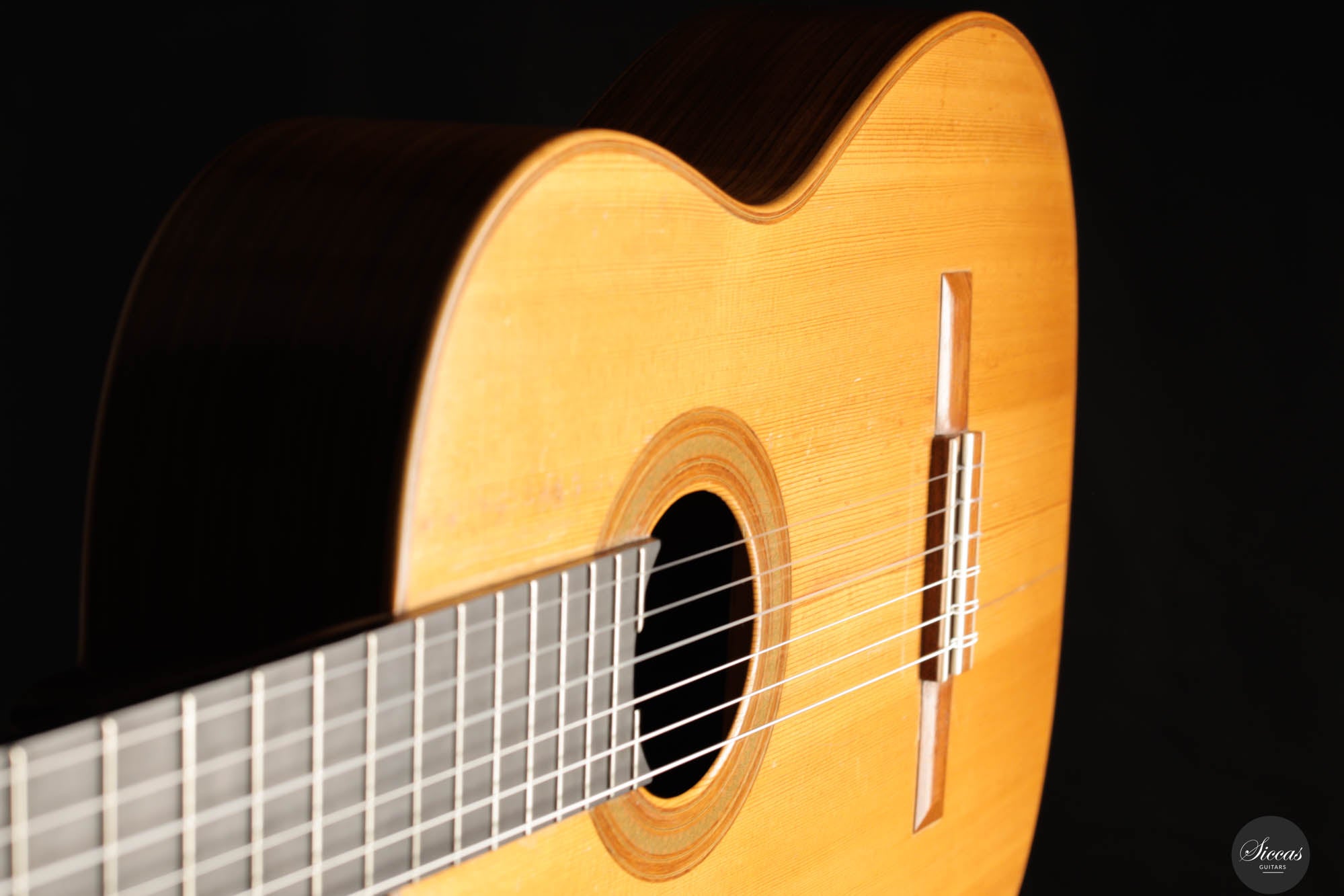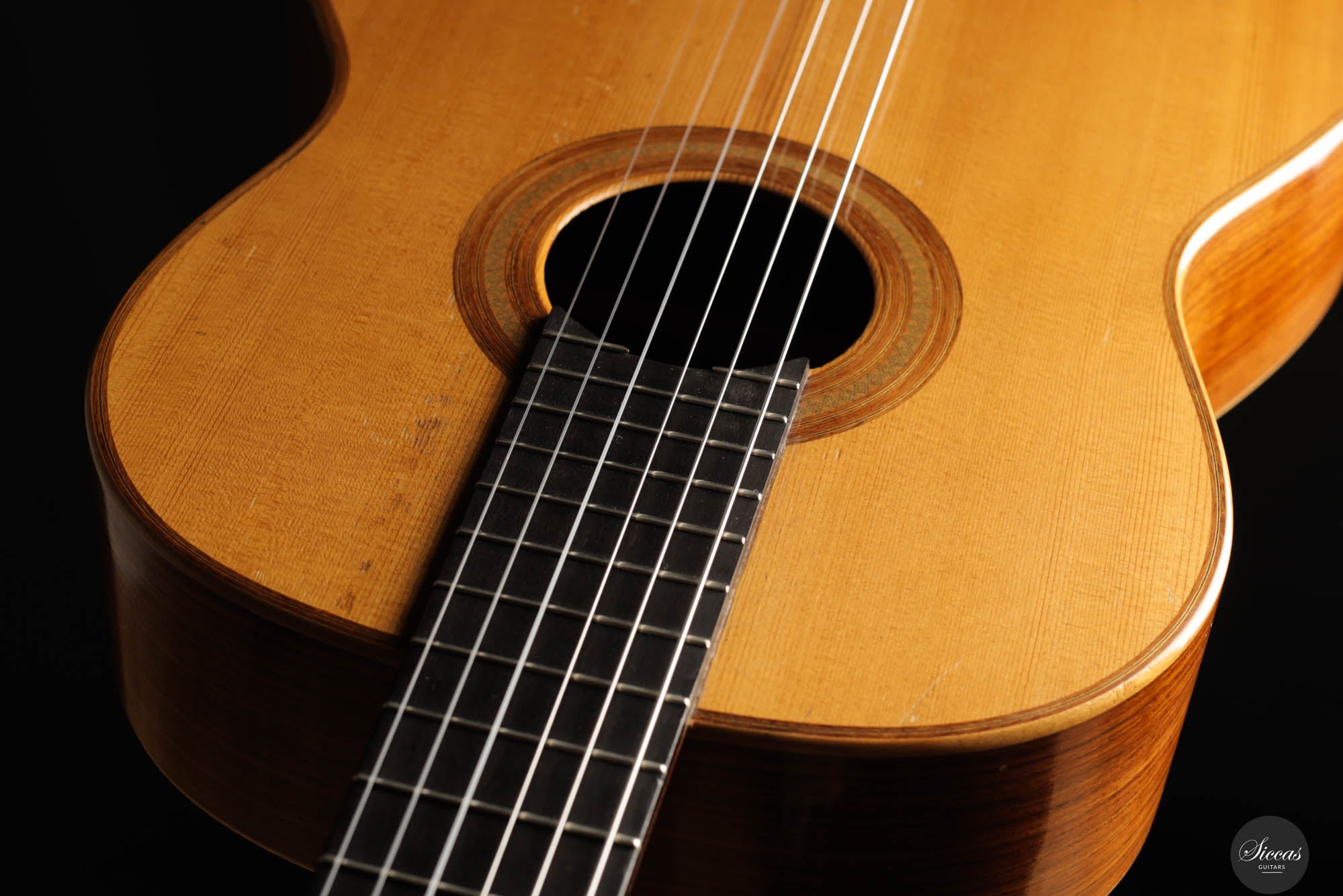 Diese Gitarre wurde 1959 in München gebaut und verfügt über eine Fichtendecke sowie Rücken und Zargen aus indischem Palisander. Die originalen, wunderschönen Mechaniken stammen von Landstorfer. Klanglich zeichnen sich die Höhen durch einen direkten, hellen Ton aus, der zugleich rund bleibt, ohne jegliche Schärfe. Diese Eigenschaften sorgen für eine großartige Klarheit und Stimmtrennung sowie für eine luftige Qualität in den Vibratos, die die angenehmen Obertöne der Gitarre hervorheben. Die Bässe sind gut entwickelt und ergänzen die Höhen adäquat, ohne sie zu überlagern oder in den Hintergrund zu treten. Die Bespielbarkeit ist ausgezeichnet. Die Gitarre weist vier professionell reparierte Risse in der Decke und einen am Boden auf, ebenso wie Gebrauchsspuren auf der Decke. Dennoch befindet sie sich in einem guten Zustand und ist uneingeschränkt spielbar.