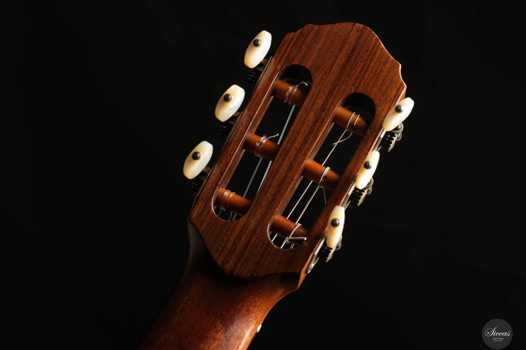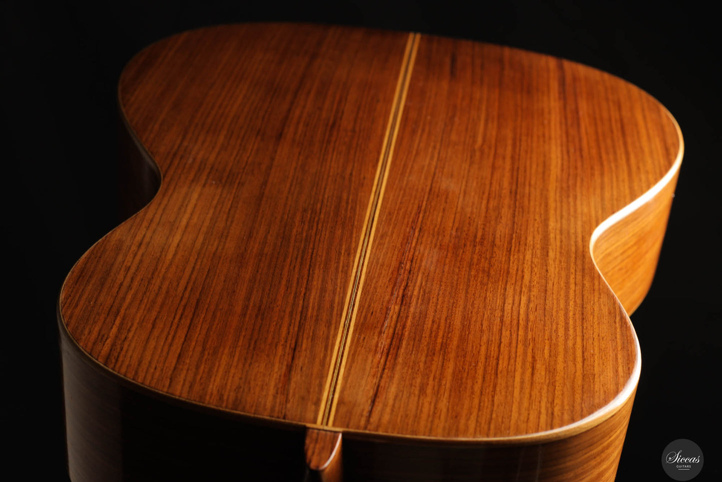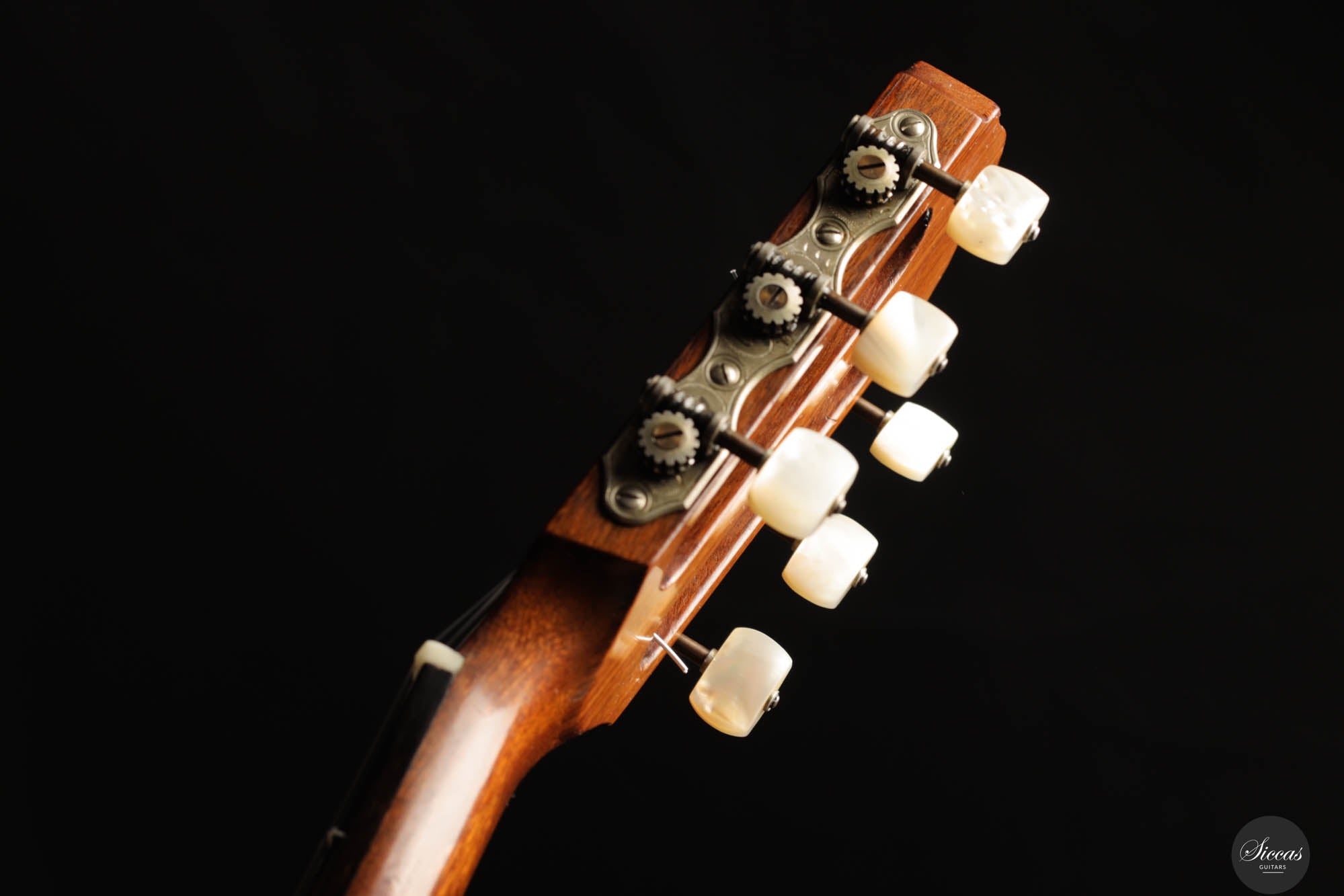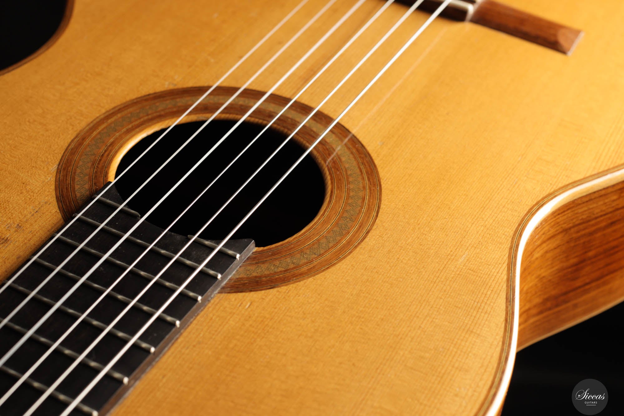 Diese Gitarre wurde 1959 in München gebaut und verfügt über eine Fichtendecke sowie Rücken und Zargen aus indischem Palisander. Die originalen, wunderschönen Mechaniken stammen von Landstorfer. Klanglich zeichnen sich die Höhen durch einen direkten, hellen Ton aus, der zugleich rund bleibt, ohne jegliche Schärfe. Diese Eigenschaften sorgen für eine großartige Klarheit und Stimmtrennung sowie für eine luftige Qualität in den Vibratos, die die angenehmen Obertöne der Gitarre hervorheben. Die Bässe sind gut entwickelt und ergänzen die Höhen adäquat, ohne sie zu überlagern oder in den Hintergrund zu treten. Die Bespielbarkeit ist ausgezeichnet. Die Gitarre weist vier professionell reparierte Risse in der Decke und einen am Boden auf, ebenso wie Gebrauchsspuren auf der Decke. Dennoch befindet sie sich in einem guten Zustand und ist uneingeschränkt spielbar.