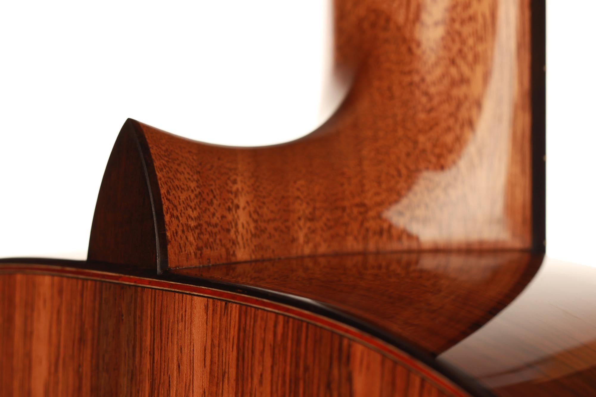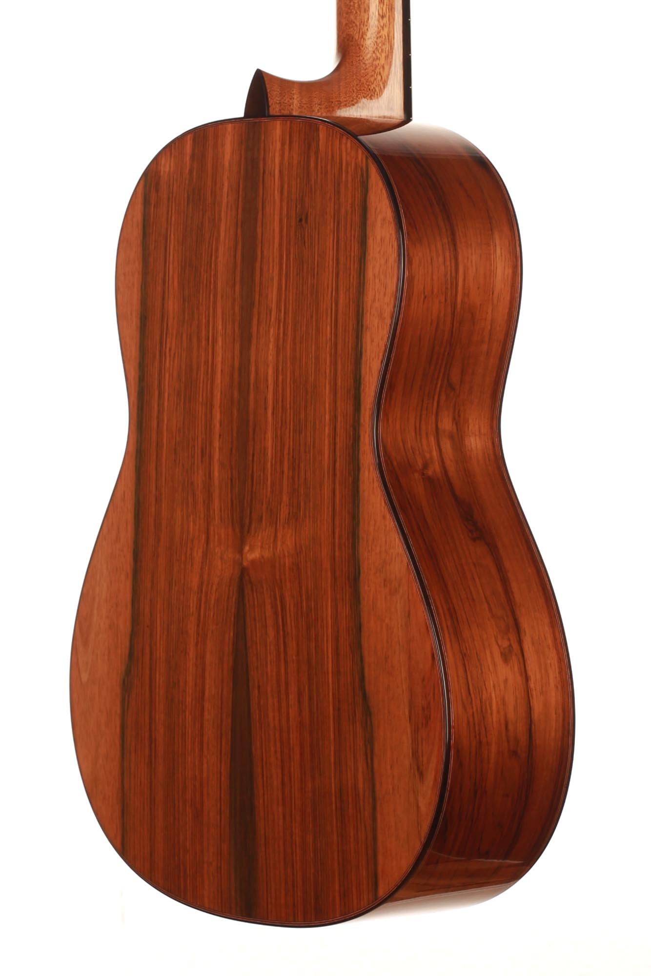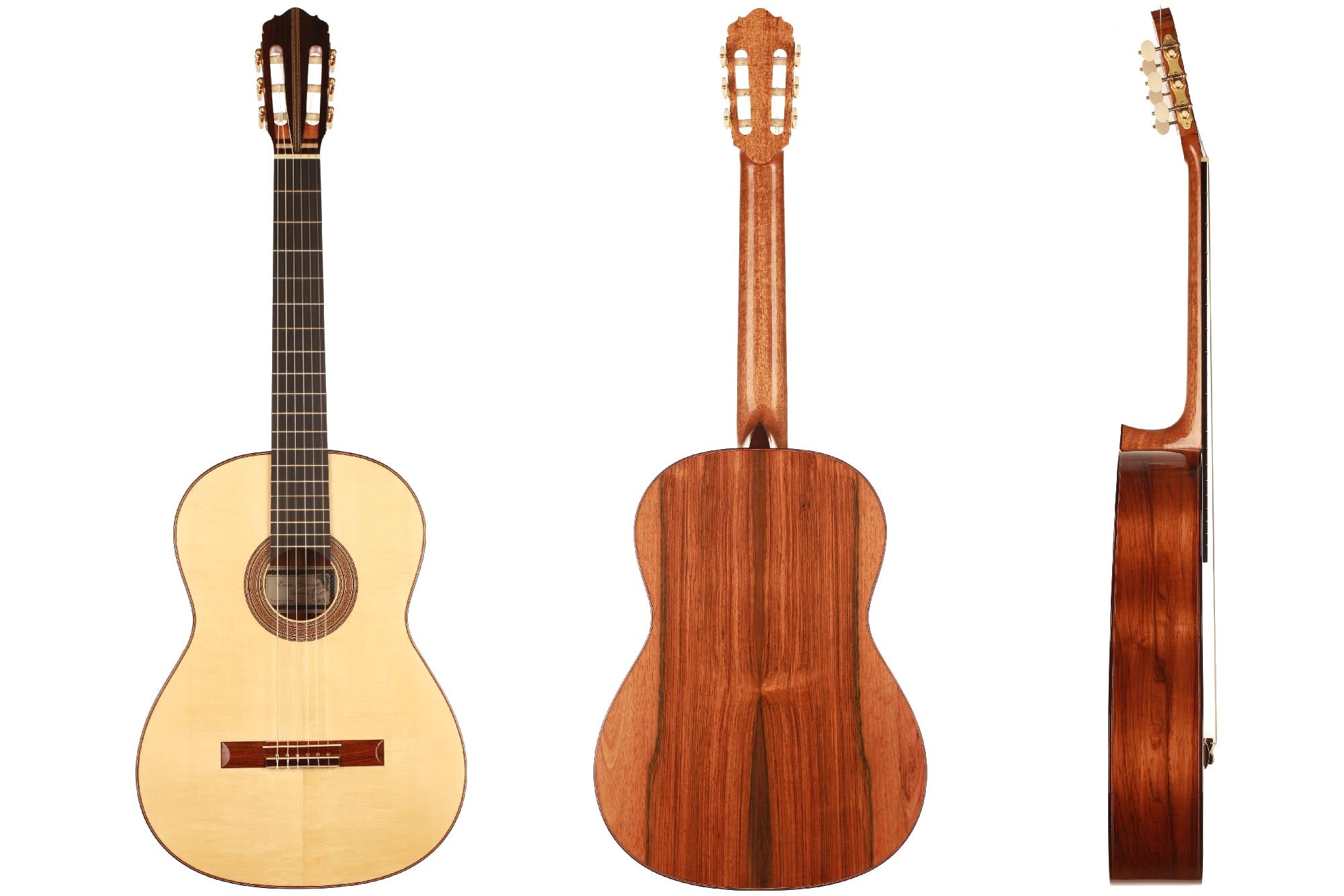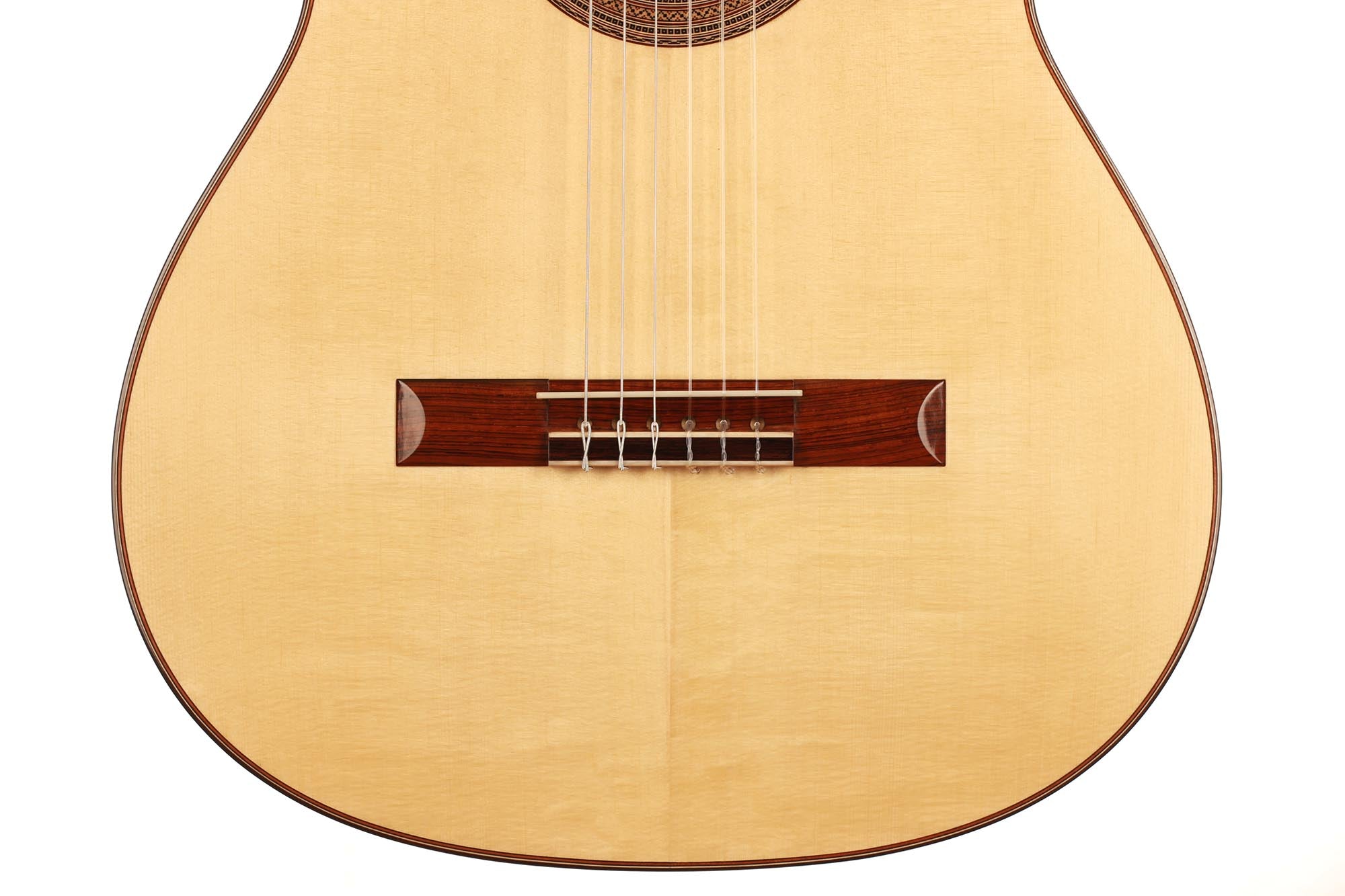 Diese hervorragende Gitarre ist ein Sonderauftrag von uns, der eine sehr exklusive Auswahl an Holz beinhaltet: CITES-zertifizierter brasilianischer Palisanderboden und -seiten sowie eine wunderschöne Decke aus Haselfichte von höchster Qualität. Das Instrument besitzt eine wunderbare Eleganz in Ton und Optik sowie eine berührende Klangklarheit. Durch die komplexe Klangfarben, das lange Sustain und die beeindruckende Homogenität der Register eignet sich diese Gitarre für ein breites Spektrum an Repertoires.