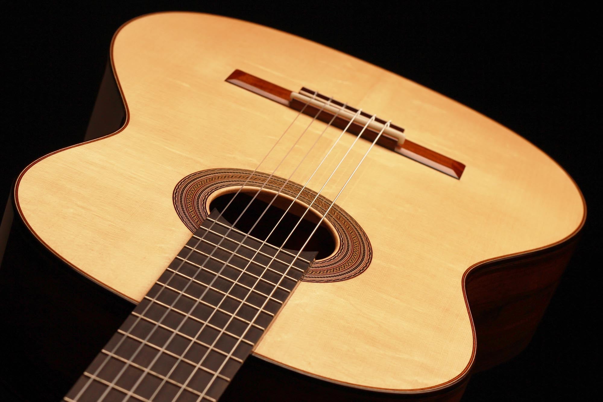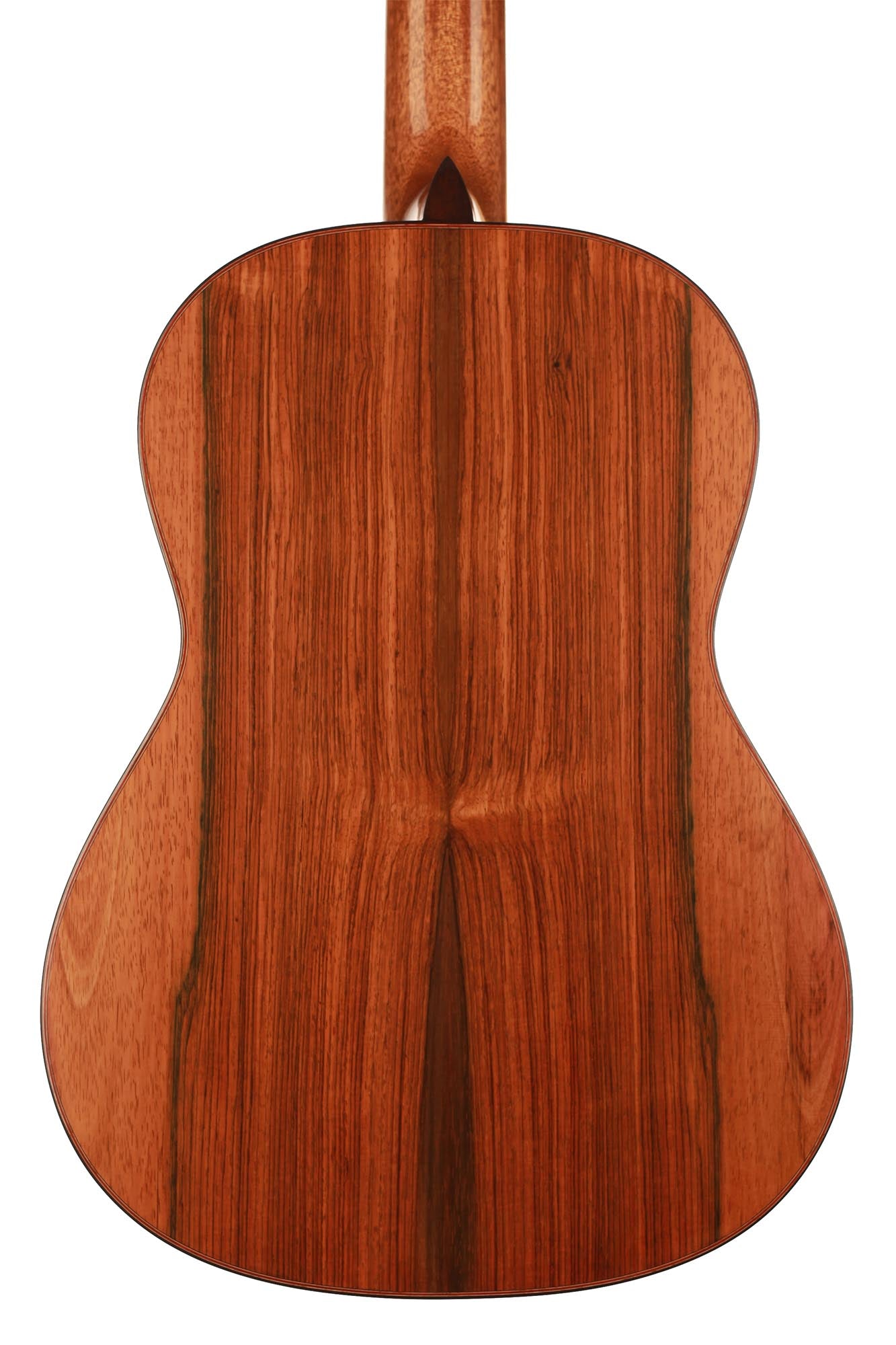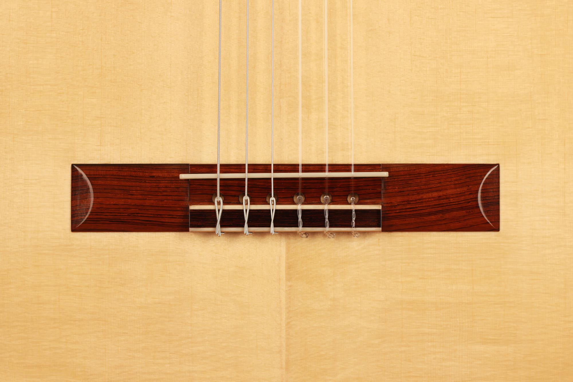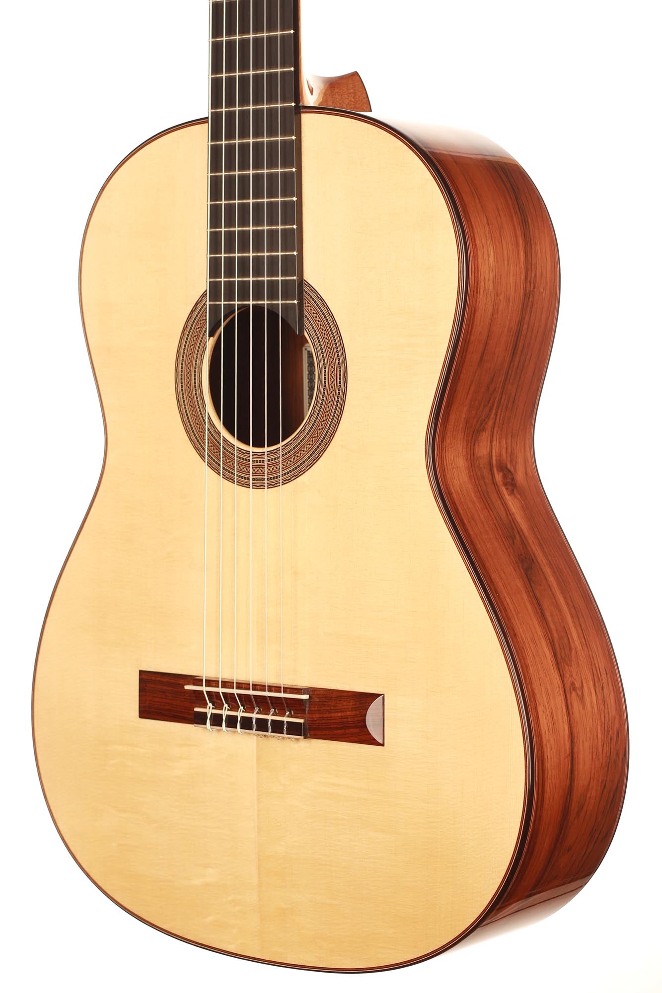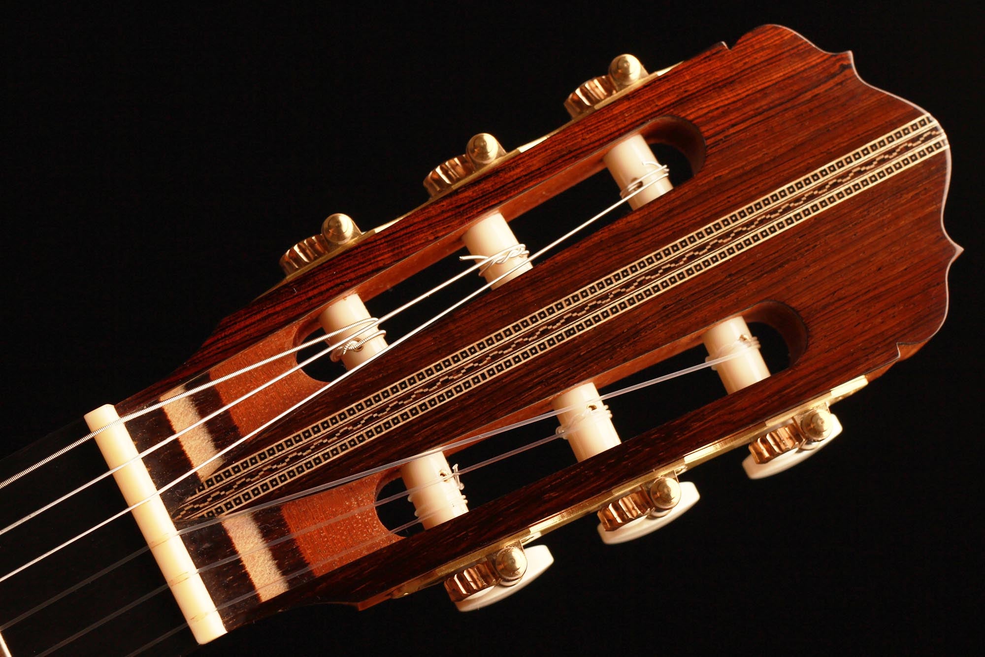 Diese hervorragende Gitarre ist ein Sonderauftrag von uns, der eine sehr exklusive Auswahl an Holz beinhaltet: CITES-zertifizierter brasilianischer Palisanderboden und -seiten sowie eine wunderschöne Decke aus Haselfichte von höchster Qualität. Das Instrument besitzt eine wunderbare Eleganz in Ton und Optik sowie eine berührende Klangklarheit. Durch die komplexe Klangfarben, das lange Sustain und die beeindruckende Homogenität der Register eignet sich diese Gitarre für ein breites Spektrum an Repertoires.
