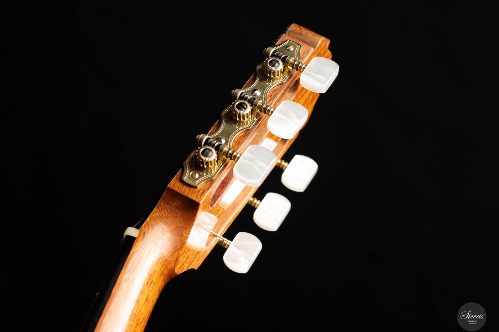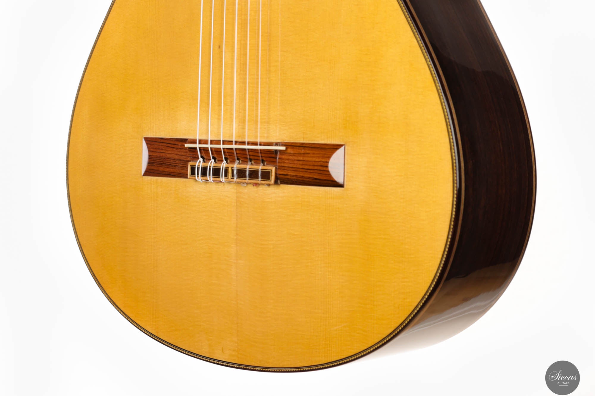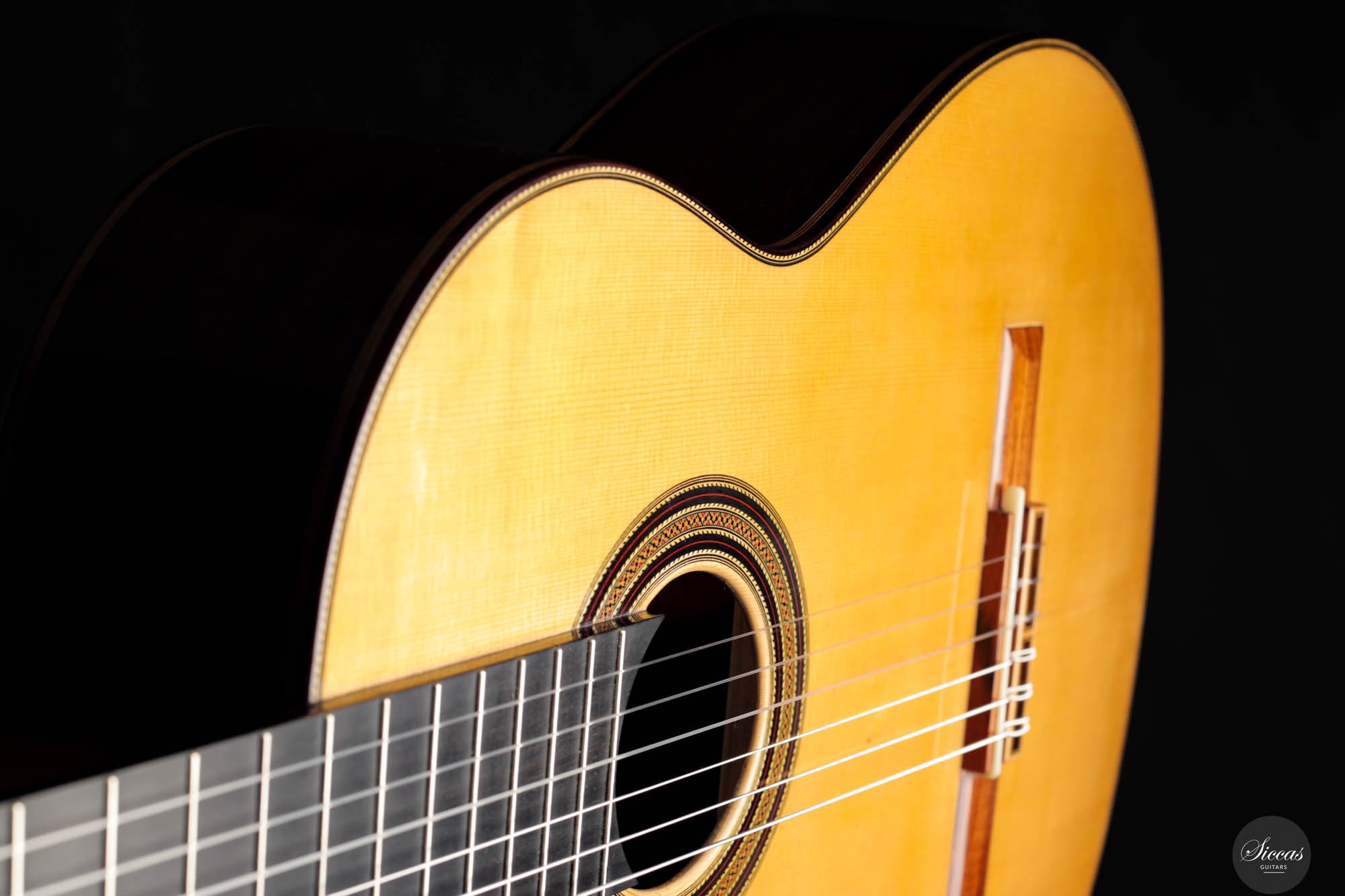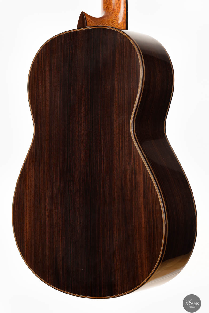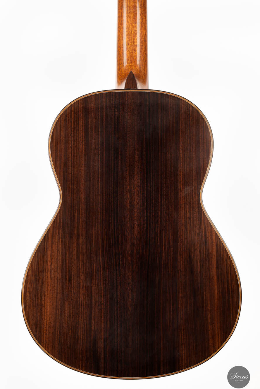 Die Ennio Giovanetti Gitarre aus dem Jahr 2021 vereint Einfachheit mit Eleganz durch die Verwendung von dunklem, indischem Palisander und spiegelt damit die Vorliebe des Gitarrenbauers für hochwertige Materialien wider. Ihre Rosette, die von traditionellen Madrider Designs inspiriert ist und an die Arbeiten von Santos Hernandez und Domingo Esteso aus den 1920er Jahren erinnert, verleiht mit ihrem Kontrast aus hellen und dunklen Mustern einen unverwechselbaren visuellen Reiz. Über ihr Aussehen hinaus liefert die Gitarre einen Klang, der sowohl kräftig als auch fokussiert ist und sich für eine Vielzahl von Musikstilen eignet. Obwohl die Gitarre gebraucht ist, hat sie eine stabile Reparatur neben dem Griffbrett auf der Bassseite, die weder die Klangqualität noch die Spielbarkeit beeinträchtigt, neben geringfügigen oberflächlichen Gebrauchsspuren. Die Ennio Giovanetti Gitarre aus dem Jahr 2021 steht als Beispiel dafür, wie traditionelles Design und moderne Handwerkskunst koexistieren können, und spricht diejenigen an, die Wert auf die Integrität und Ästhetik ihres Instruments legen.