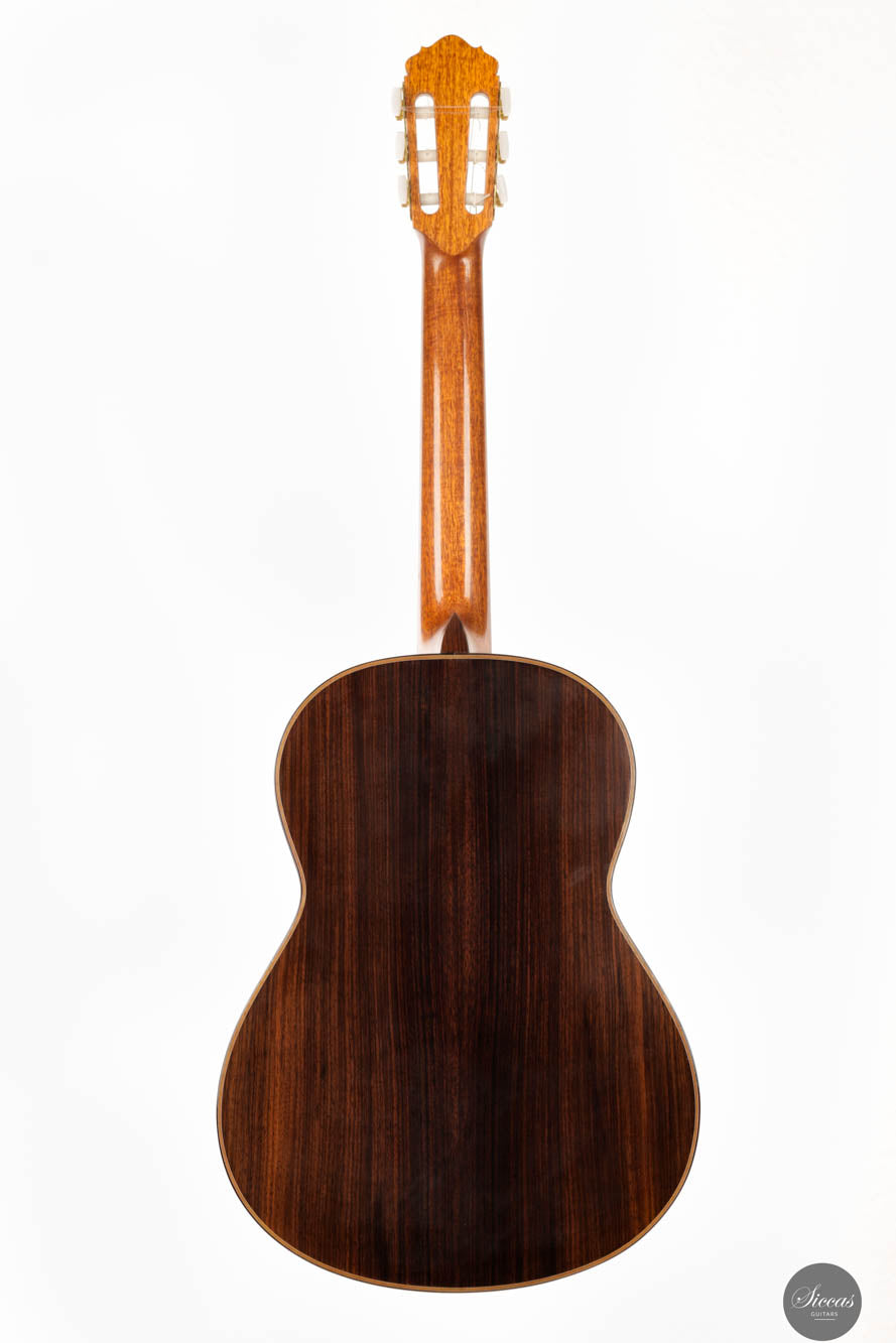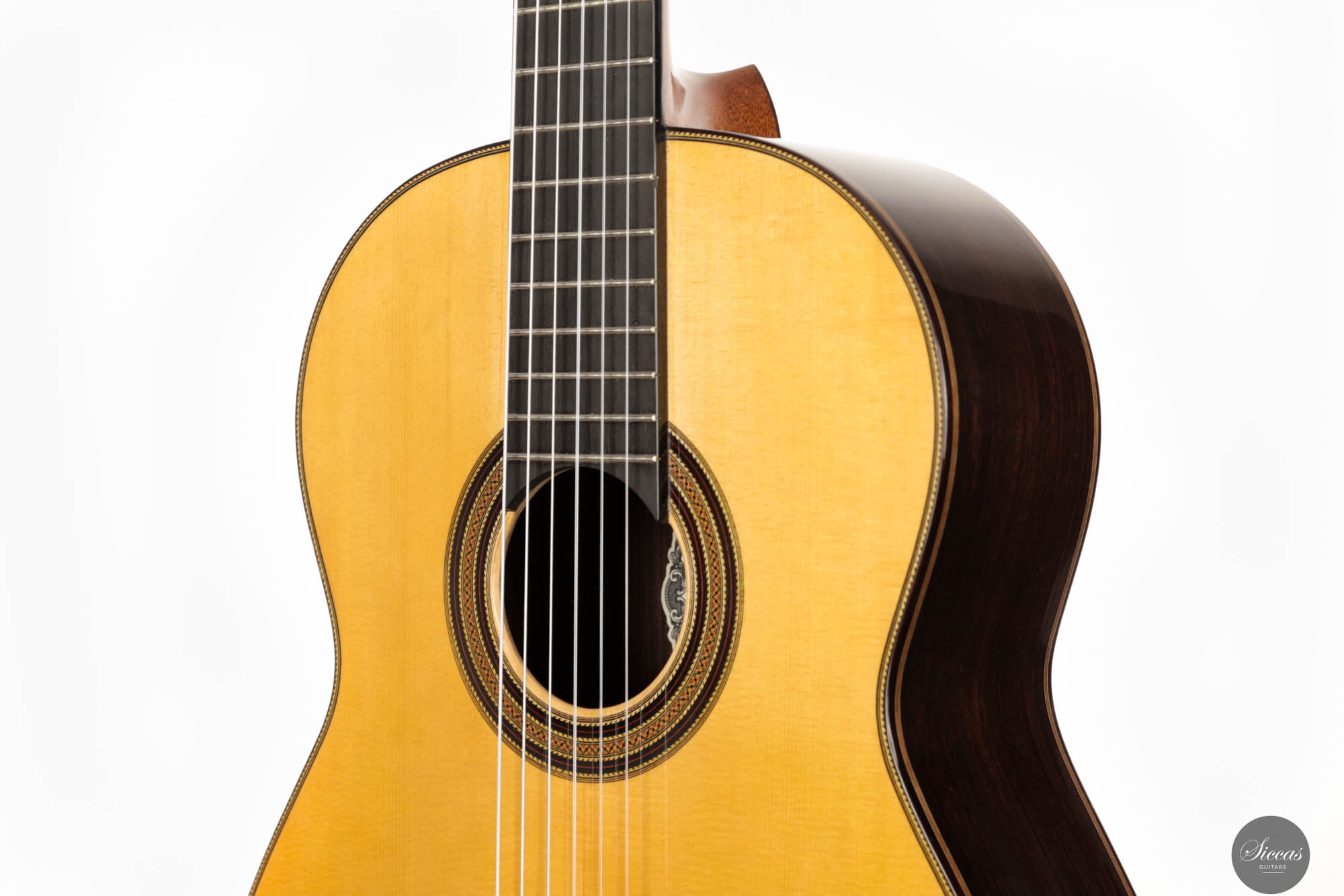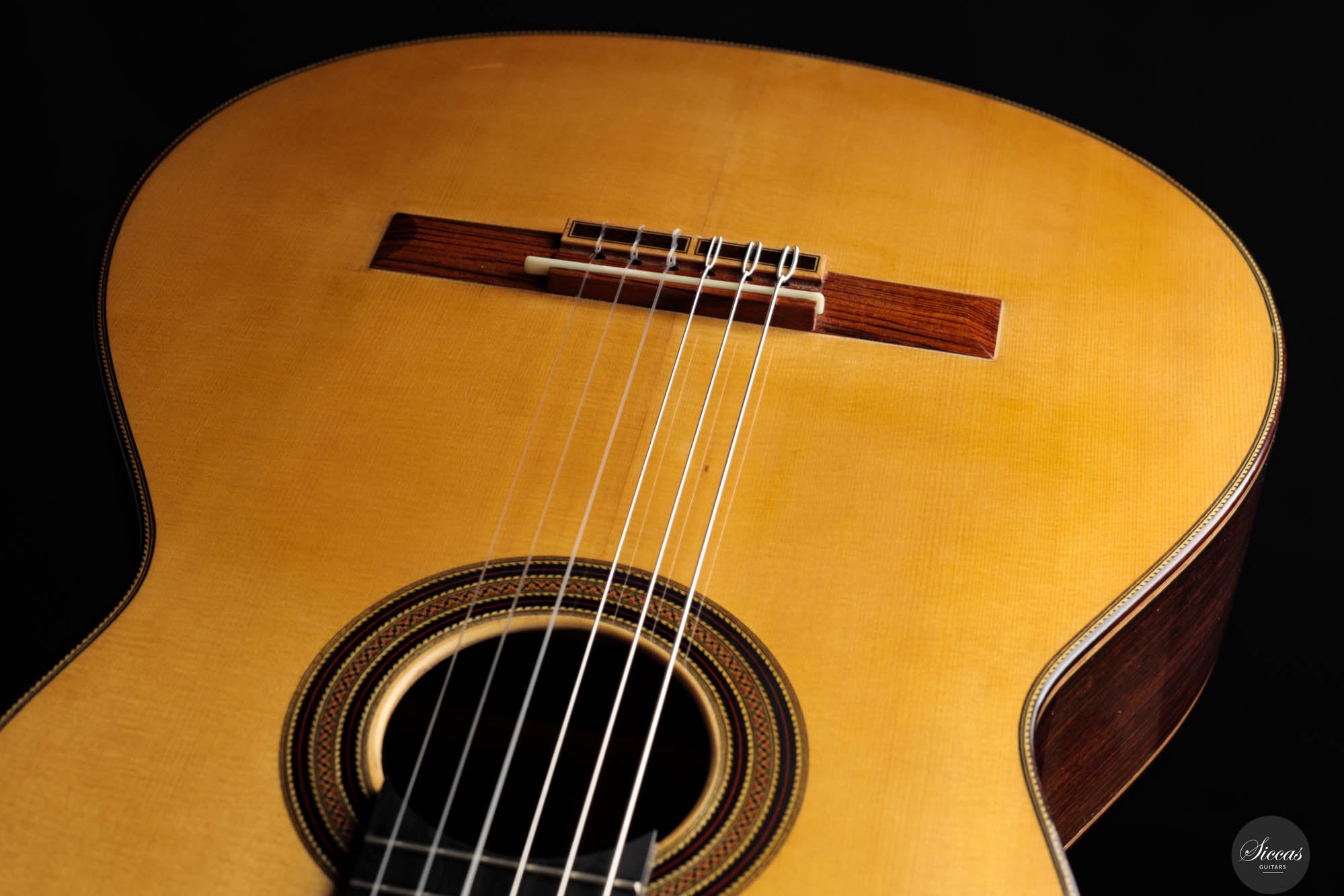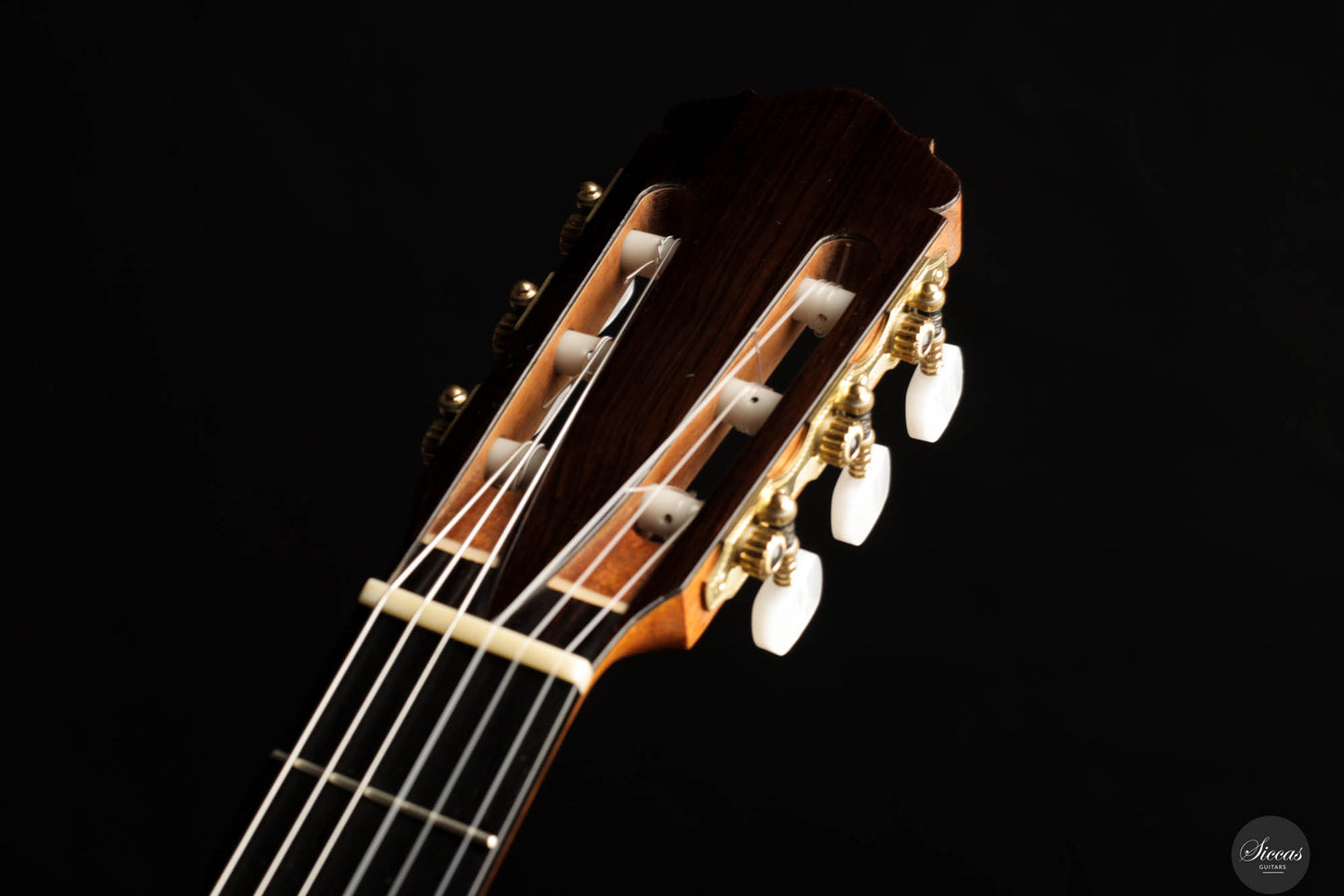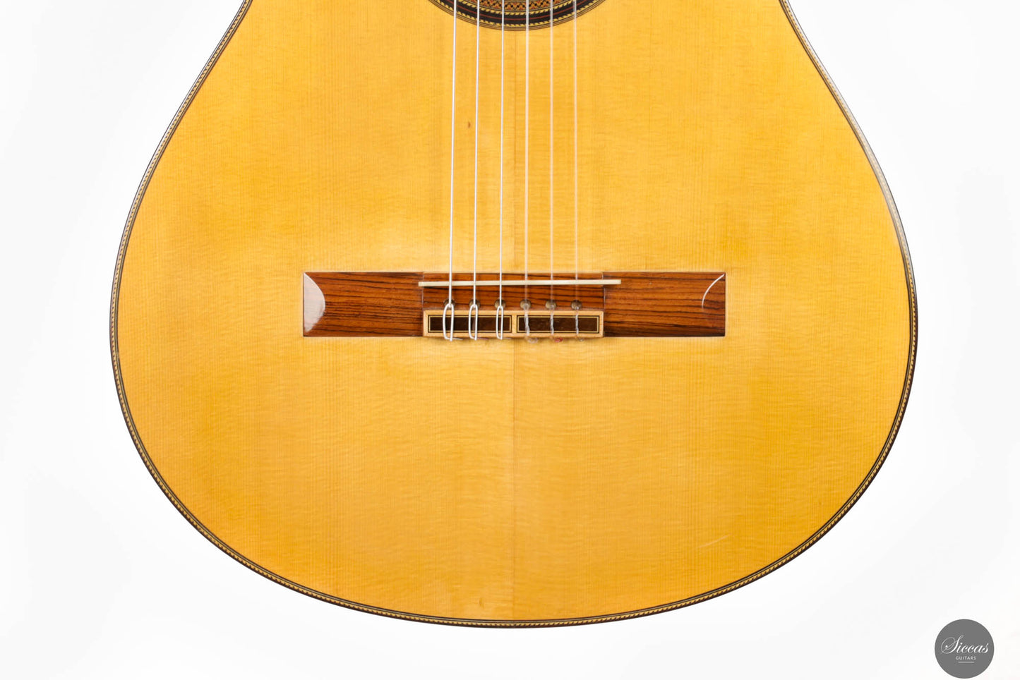 Die Ennio Giovanetti Gitarre aus dem Jahr 2021 vereint Einfachheit mit Eleganz durch die Verwendung von dunklem, indischem Palisander und spiegelt damit die Vorliebe des Gitarrenbauers für hochwertige Materialien wider. Ihre Rosette, die von traditionellen Madrider Designs inspiriert ist und an die Arbeiten von Santos Hernandez und Domingo Esteso aus den 1920er Jahren erinnert, verleiht mit ihrem Kontrast aus hellen und dunklen Mustern einen unverwechselbaren visuellen Reiz. Über ihr Aussehen hinaus liefert die Gitarre einen Klang, der sowohl kräftig als auch fokussiert ist und sich für eine Vielzahl von Musikstilen eignet. Obwohl die Gitarre gebraucht ist, hat sie eine stabile Reparatur neben dem Griffbrett auf der Bassseite, die weder die Klangqualität noch die Spielbarkeit beeinträchtigt, neben geringfügigen oberflächlichen Gebrauchsspuren. Die Ennio Giovanetti Gitarre aus dem Jahr 2021 steht als Beispiel dafür, wie traditionelles Design und moderne Handwerkskunst koexistieren können, und spricht diejenigen an, die Wert auf die Integrität und Ästhetik ihres Instruments legen.