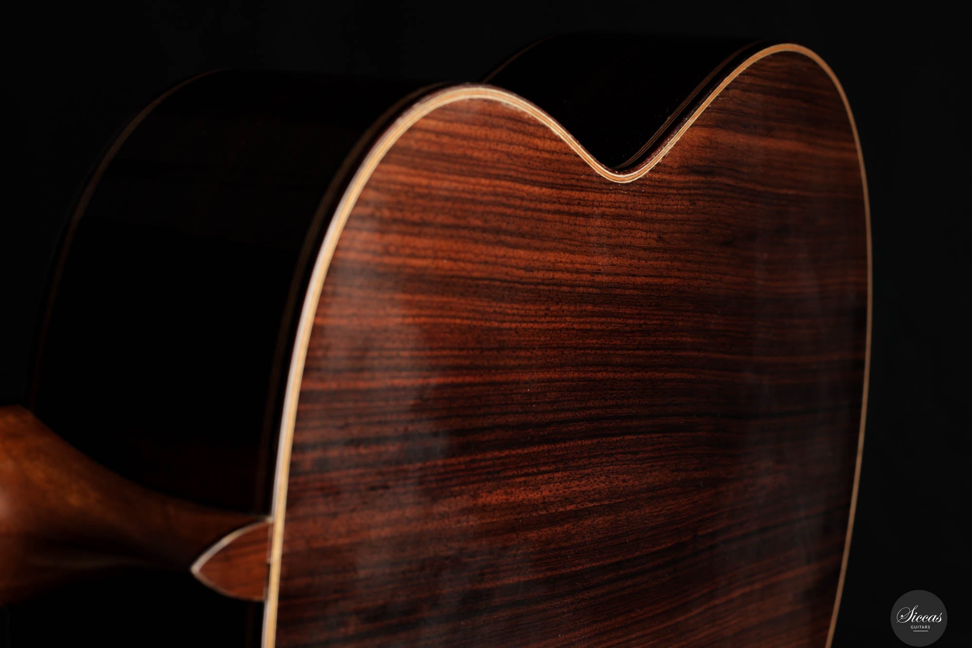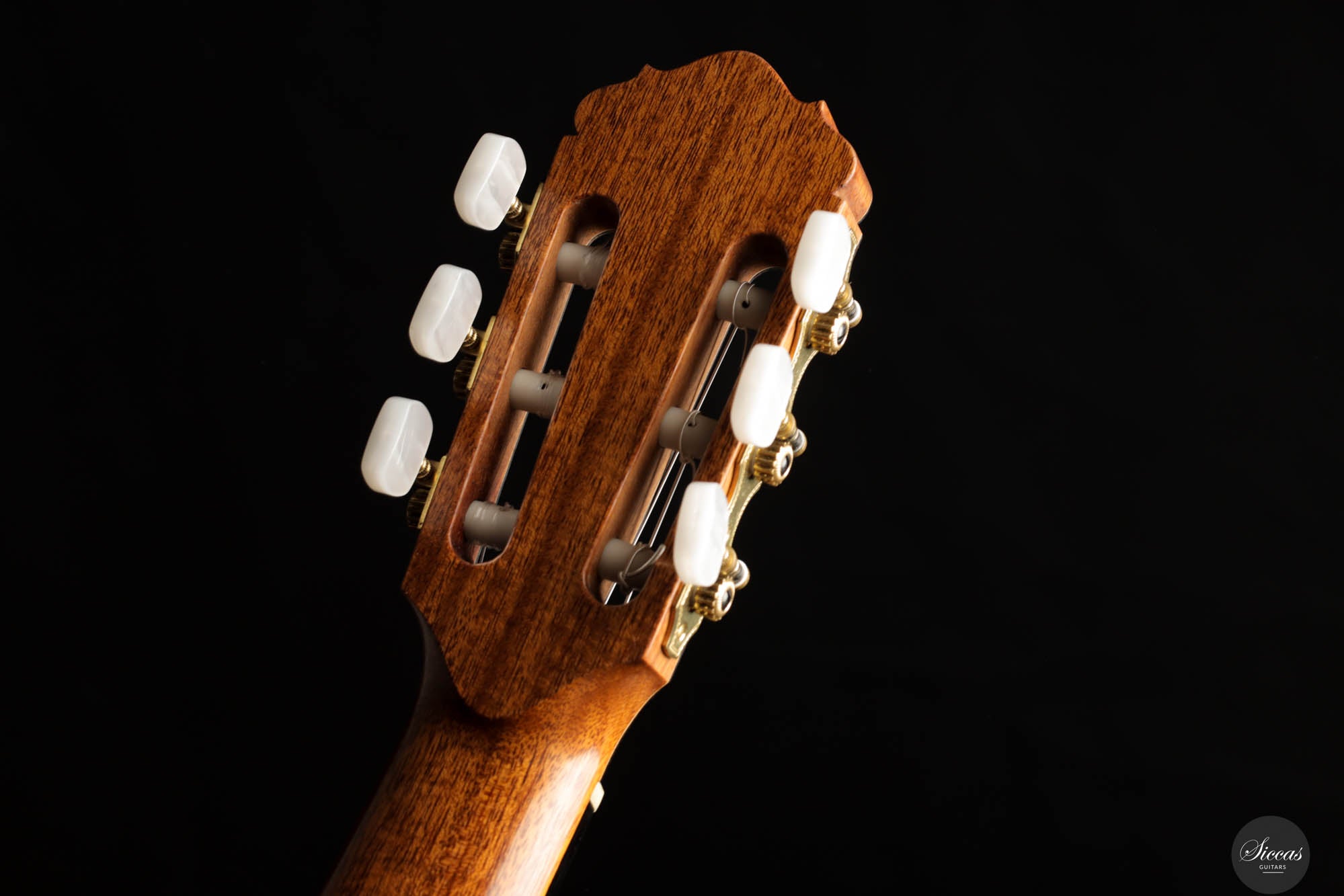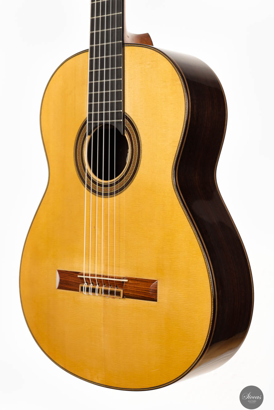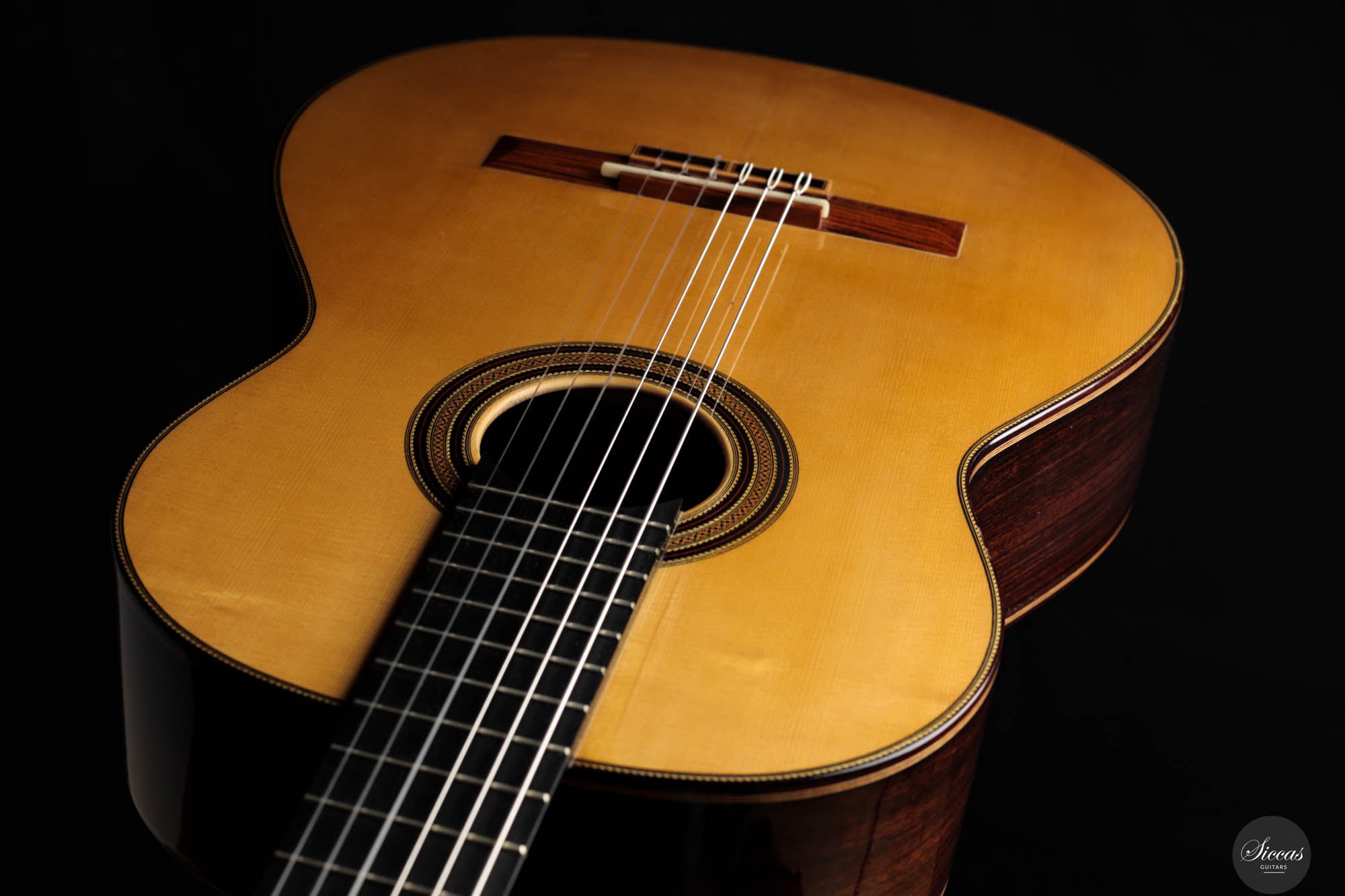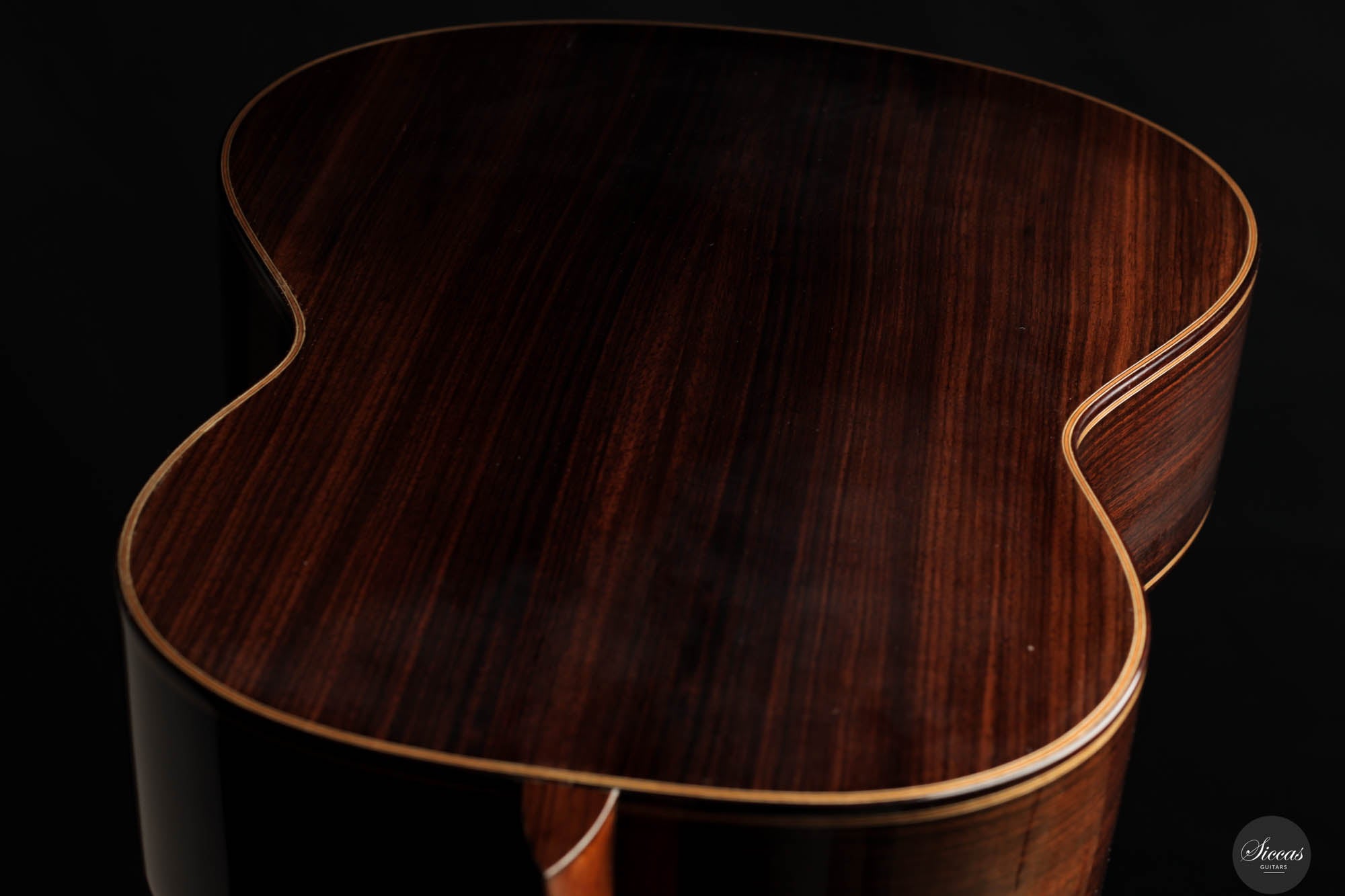 Die Ennio Giovanetti Gitarre aus dem Jahr 2021 vereint Einfachheit mit Eleganz durch die Verwendung von dunklem, indischem Palisander und spiegelt damit die Vorliebe des Gitarrenbauers für hochwertige Materialien wider. Ihre Rosette, die von traditionellen Madrider Designs inspiriert ist und an die Arbeiten von Santos Hernandez und Domingo Esteso aus den 1920er Jahren erinnert, verleiht mit ihrem Kontrast aus hellen und dunklen Mustern einen unverwechselbaren visuellen Reiz. Über ihr Aussehen hinaus liefert die Gitarre einen Klang, der sowohl kräftig als auch fokussiert ist und sich für eine Vielzahl von Musikstilen eignet. Obwohl die Gitarre gebraucht ist, hat sie eine stabile Reparatur neben dem Griffbrett auf der Bassseite, die weder die Klangqualität noch die Spielbarkeit beeinträchtigt, neben geringfügigen oberflächlichen Gebrauchsspuren. Die Ennio Giovanetti Gitarre aus dem Jahr 2021 steht als Beispiel dafür, wie traditionelles Design und moderne Handwerkskunst koexistieren können, und spricht diejenigen an, die Wert auf die Integrität und Ästhetik ihres Instruments legen.