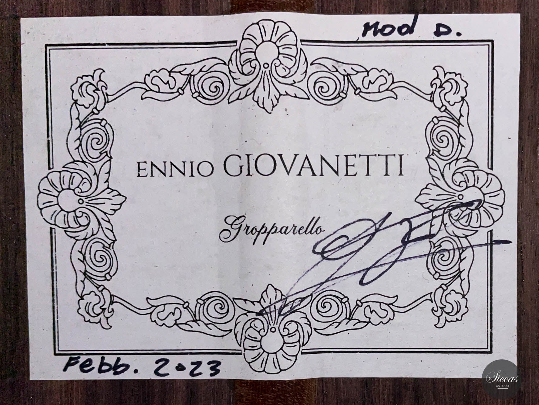 Ennio Giovanetti baut seit 1998 Gitarren in seiner Werkstatt in Sariano di Gropparello bei Piacenza (Italien). Er studierte Gitarrenbau in Mailand bei Enrico Bottelli, wo er viele Gitarren von Antonio de Torres, Simplicio, Garcia und vielen anderen kennen lernte. Seine Gitarren werden traditionell gebaut, sind aber durch ihre eigenen Elemente gut zu erkennen.