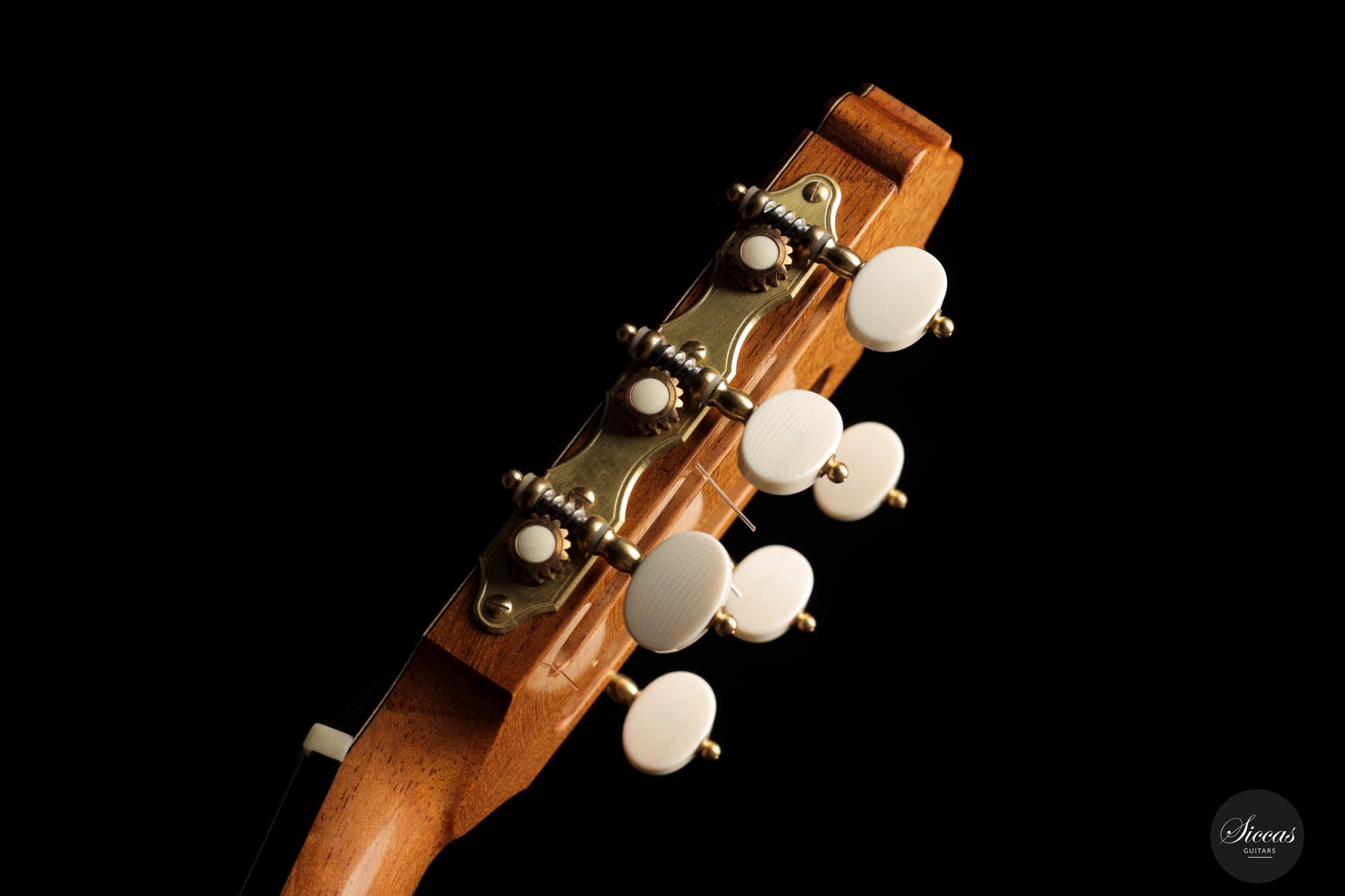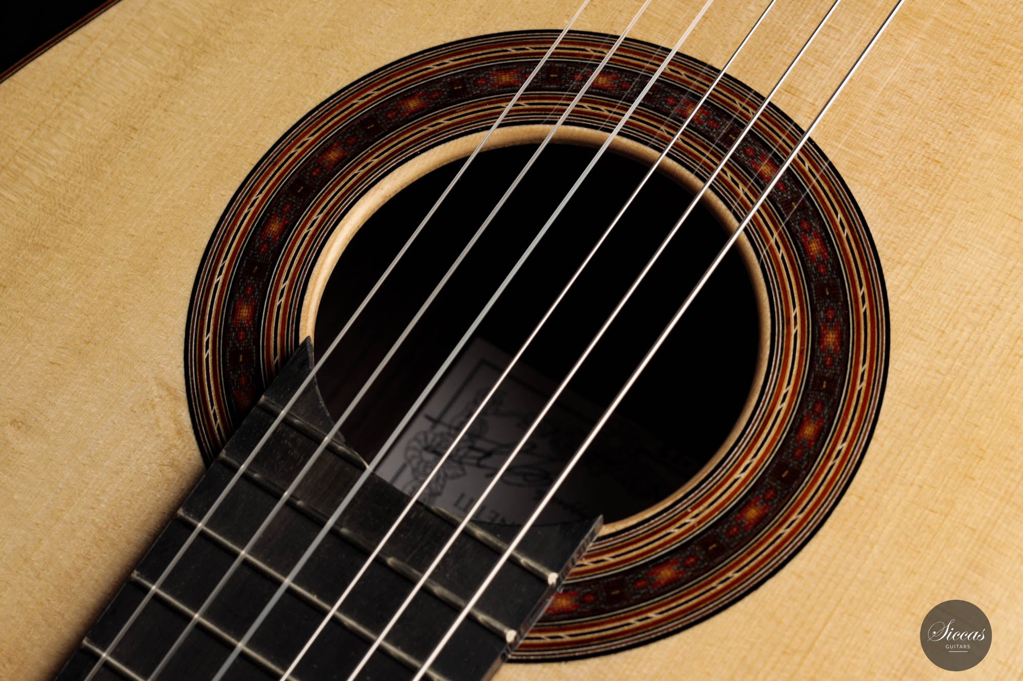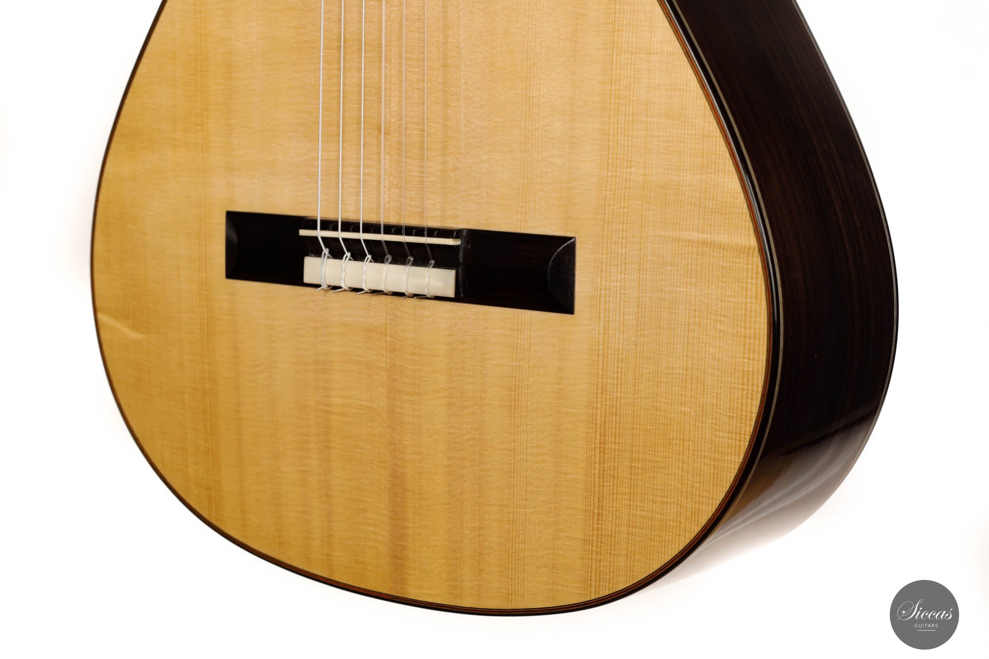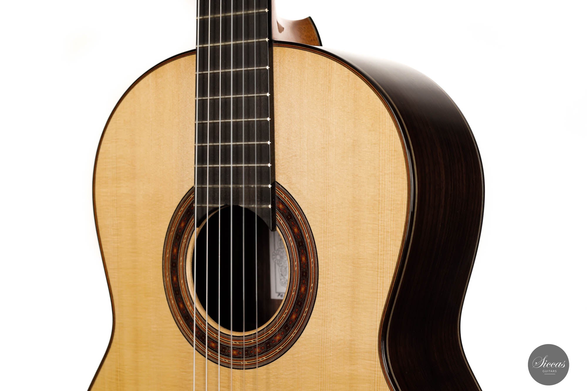 Diese bemerkenswerte 2023 Ennio Giovanetti-Gitarre ist ein atemberaubendes Beispiel für die konsequente und sorgfältige Handwerkskunst des Geigenbauers. Inspiriert von den ikonischen Entwürfen von Daniel Friederich, besitzt diese Gitarre einen unverwechselbaren Charme und Eleganz. Das Herzstück dieses Instruments ist eine wunderschöne Fichtendecke, die von Daniel Friederich persönlich bezogen wurde. Die einzigartige Konstruktion besteht aus fünf Fächerstreben und einer dünnen Zedernstrebe unter dem Steg. Boden und Zargen sind aus erstklassigem indischen Palisander gefertigt, der aufgrund seiner außergewöhnlichen Qualität und seines reichen Aussehens handverlesen wurde. Jedes Detail dieser 2023 Ennio Giovanetti-Gitarre wurde mit äußerster Präzision ausgeführt. Das Ergebnis ist ein meisterhaftes Instrument, das sowohl optisch als auch akustisch begeistert. Ihre beeindruckende Ausgewogenheit ist geprägt von soliden Höhen und tiefen, dunklen Bässen, die in einem fesselnden Klangerlebnis gipfeln. Als treue Hommage an die originalen Daniel Friederich-Gitarren fängt diese Giovanetti-Kreation nicht nur deren Essenz ein, sondern zeigt auch das tiefe Verständnis und die Wertschätzung des Gitarrenbauers für die legendären Designs.