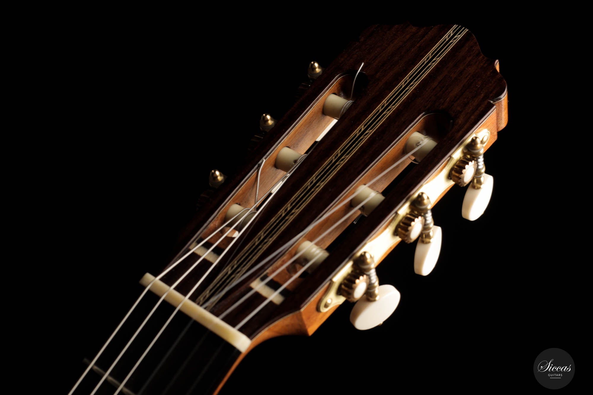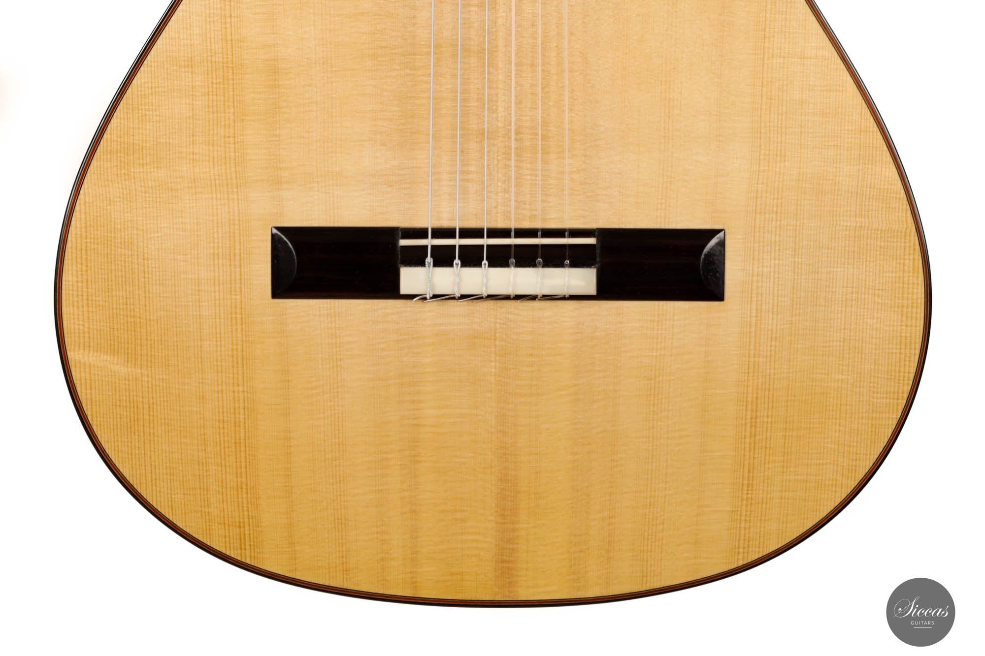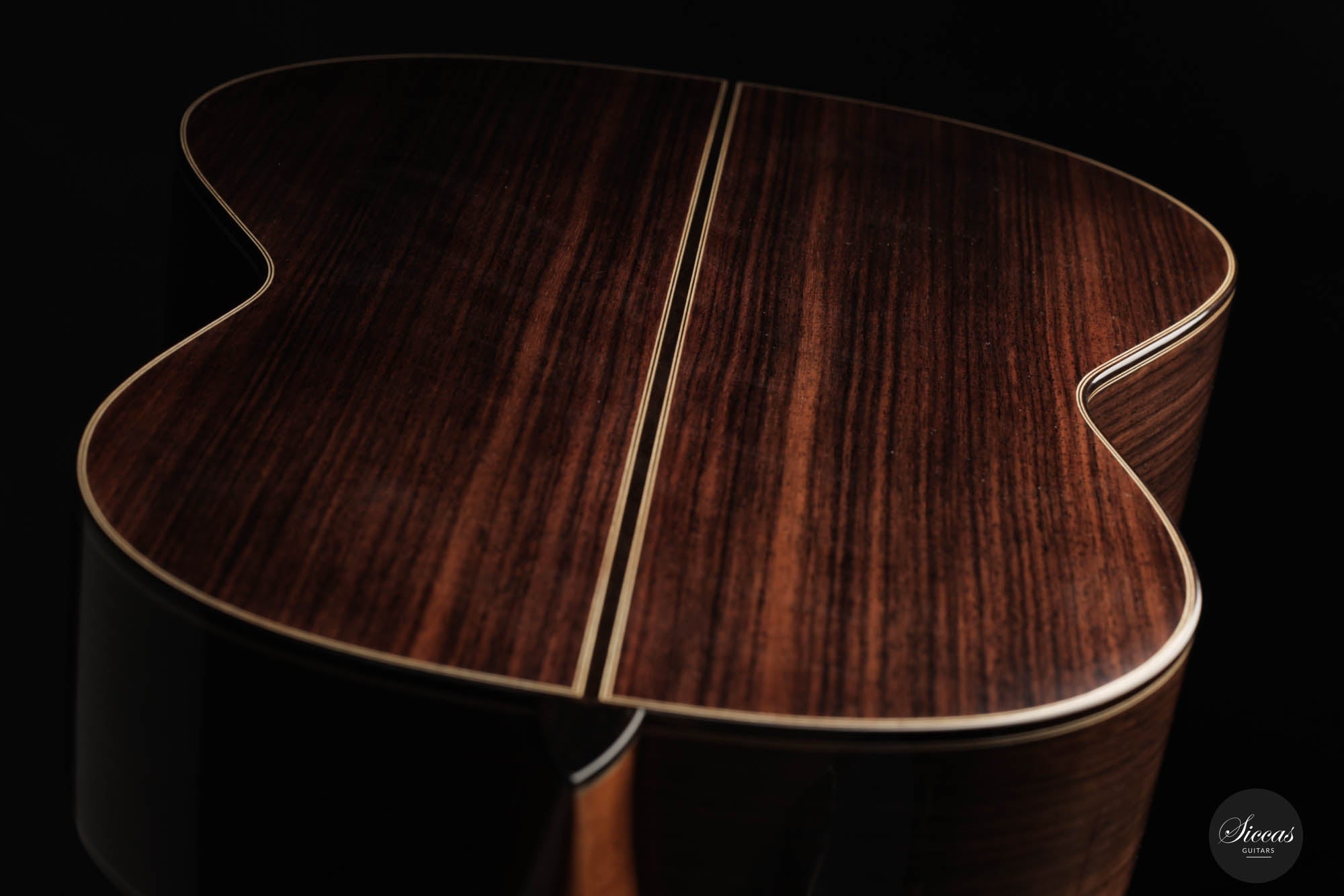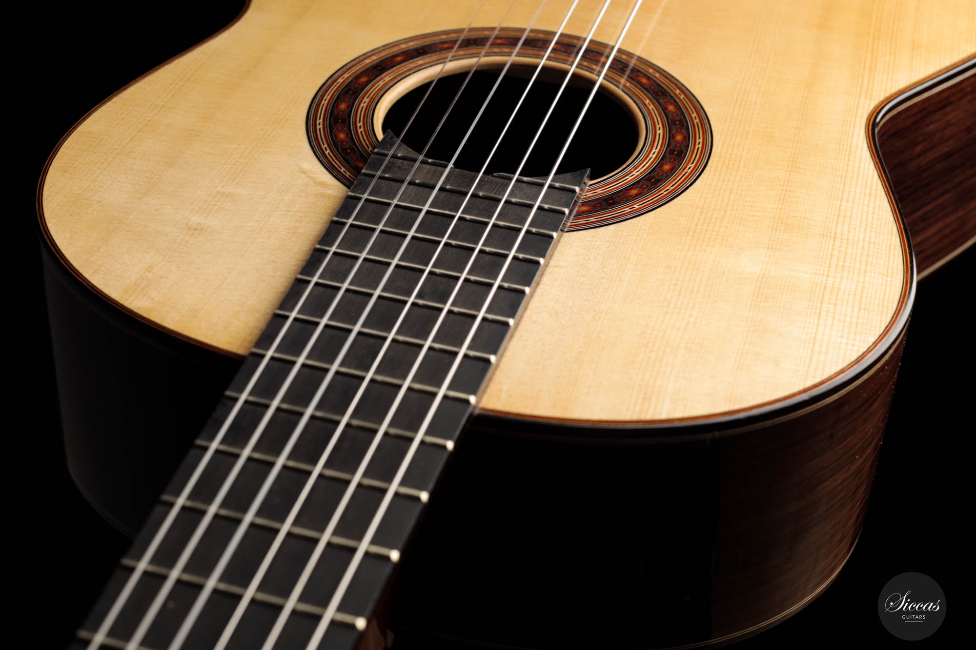 Diese bemerkenswerte 2023 Ennio Giovanetti-Gitarre ist ein atemberaubendes Beispiel für die konsequente und sorgfältige Handwerkskunst des Geigenbauers. Inspiriert von den ikonischen Entwürfen von Daniel Friederich, besitzt diese Gitarre einen unverwechselbaren Charme und Eleganz. Das Herzstück dieses Instruments ist eine wunderschöne Fichtendecke, die von Daniel Friederich persönlich bezogen wurde. Die einzigartige Konstruktion besteht aus fünf Fächerstreben und einer dünnen Zedernstrebe unter dem Steg. Boden und Zargen sind aus erstklassigem indischen Palisander gefertigt, der aufgrund seiner außergewöhnlichen Qualität und seines reichen Aussehens handverlesen wurde. Jedes Detail dieser 2023 Ennio Giovanetti-Gitarre wurde mit äußerster Präzision ausgeführt. Das Ergebnis ist ein meisterhaftes Instrument, das sowohl optisch als auch akustisch begeistert. Ihre beeindruckende Ausgewogenheit ist geprägt von soliden Höhen und tiefen, dunklen Bässen, die in einem fesselnden Klangerlebnis gipfeln. Als treue Hommage an die originalen Daniel Friederich-Gitarren fängt diese Giovanetti-Kreation nicht nur deren Essenz ein, sondern zeigt auch das tiefe Verständnis und die Wertschätzung des Gitarrenbauers für die legendären Designs.