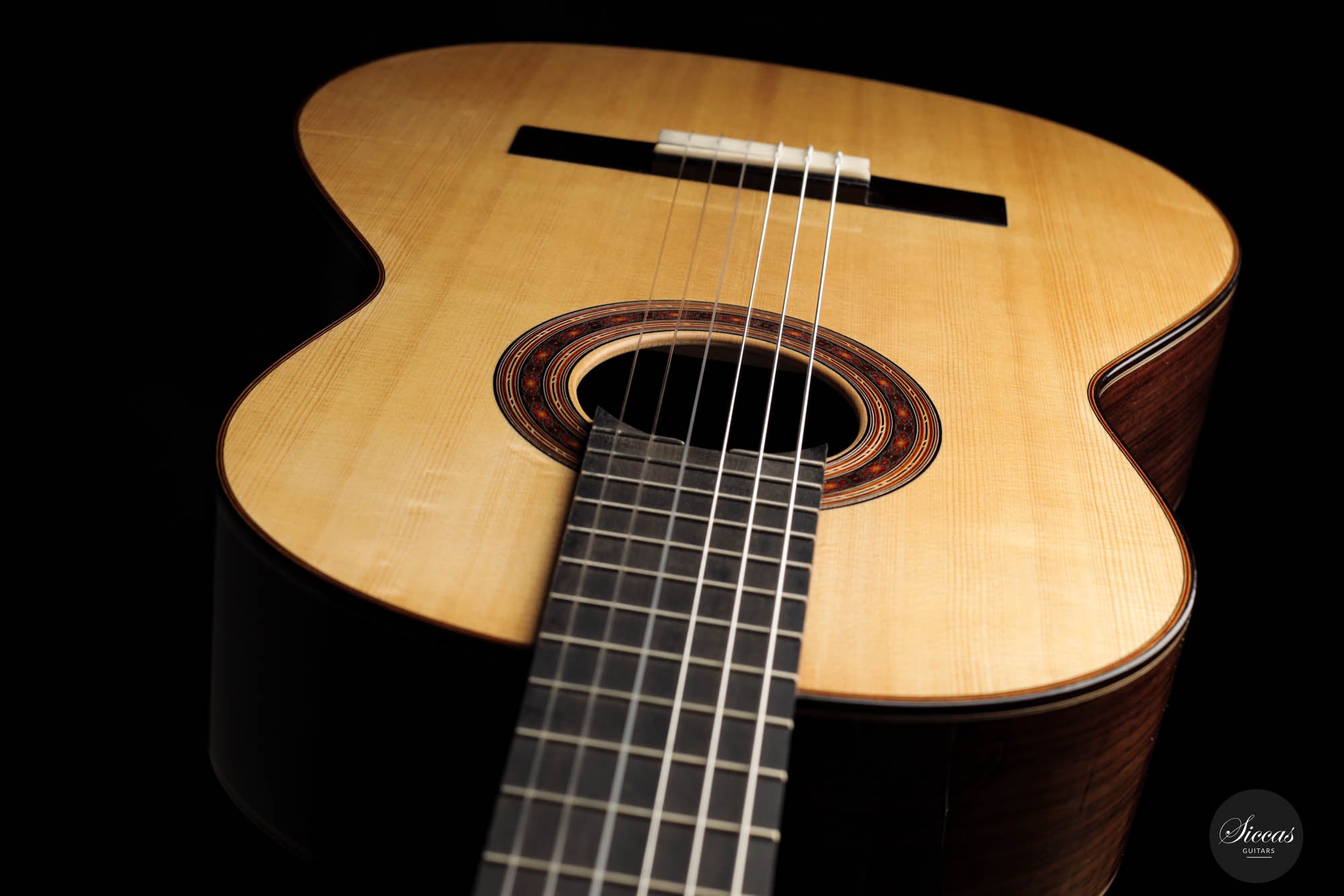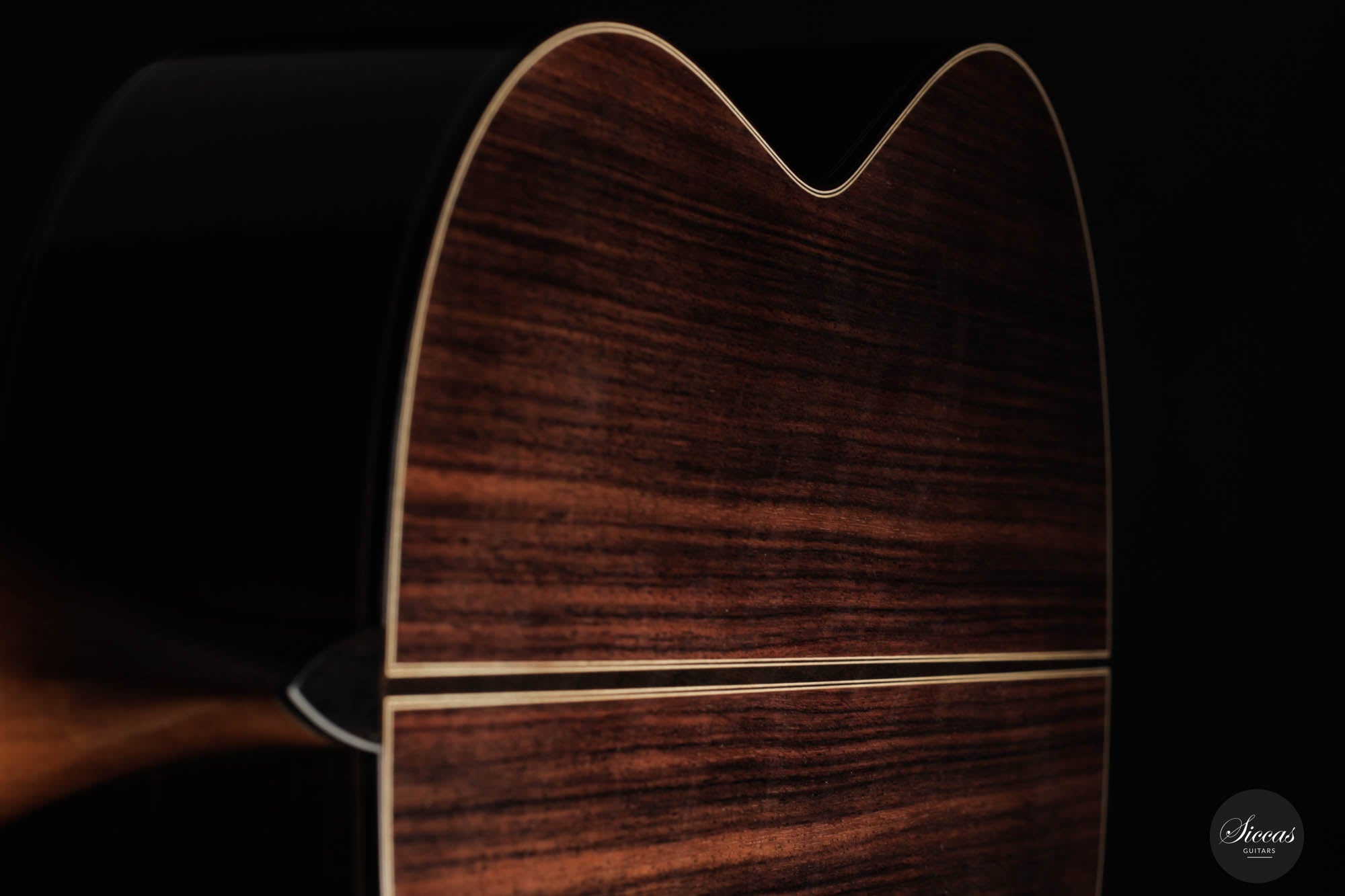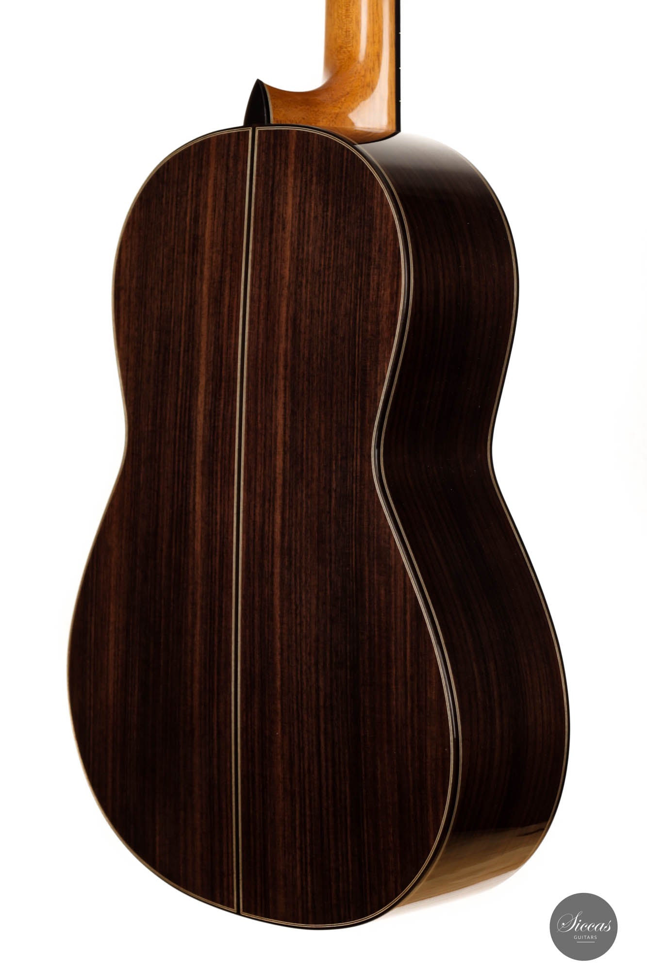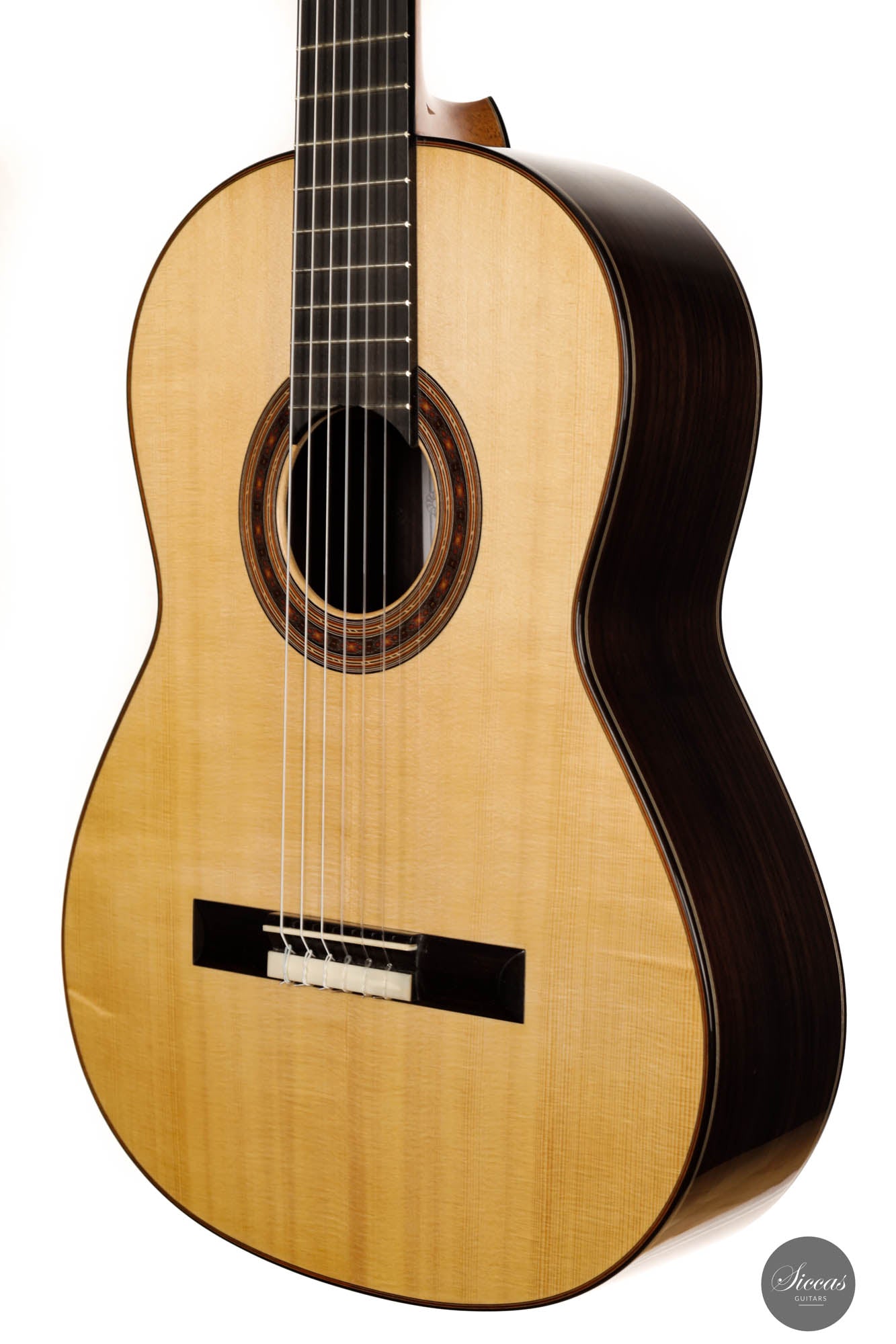 Diese bemerkenswerte 2023 Ennio Giovanetti-Gitarre ist ein atemberaubendes Beispiel für die konsequente und sorgfältige Handwerkskunst des Geigenbauers. Inspiriert von den ikonischen Entwürfen von Daniel Friederich, besitzt diese Gitarre einen unverwechselbaren Charme und Eleganz. Das Herzstück dieses Instruments ist eine wunderschöne Fichtendecke, die von Daniel Friederich persönlich bezogen wurde. Die einzigartige Konstruktion besteht aus fünf Fächerstreben und einer dünnen Zedernstrebe unter dem Steg. Boden und Zargen sind aus erstklassigem indischen Palisander gefertigt, der aufgrund seiner außergewöhnlichen Qualität und seines reichen Aussehens handverlesen wurde. Jedes Detail dieser 2023 Ennio Giovanetti-Gitarre wurde mit äußerster Präzision ausgeführt. Das Ergebnis ist ein meisterhaftes Instrument, das sowohl optisch als auch akustisch begeistert. Ihre beeindruckende Ausgewogenheit ist geprägt von soliden Höhen und tiefen, dunklen Bässen, die in einem fesselnden Klangerlebnis gipfeln. Als treue Hommage an die originalen Daniel Friederich-Gitarren fängt diese Giovanetti-Kreation nicht nur deren Essenz ein, sondern zeigt auch das tiefe Verständnis und die Wertschätzung des Gitarrenbauers für die legendären Designs.