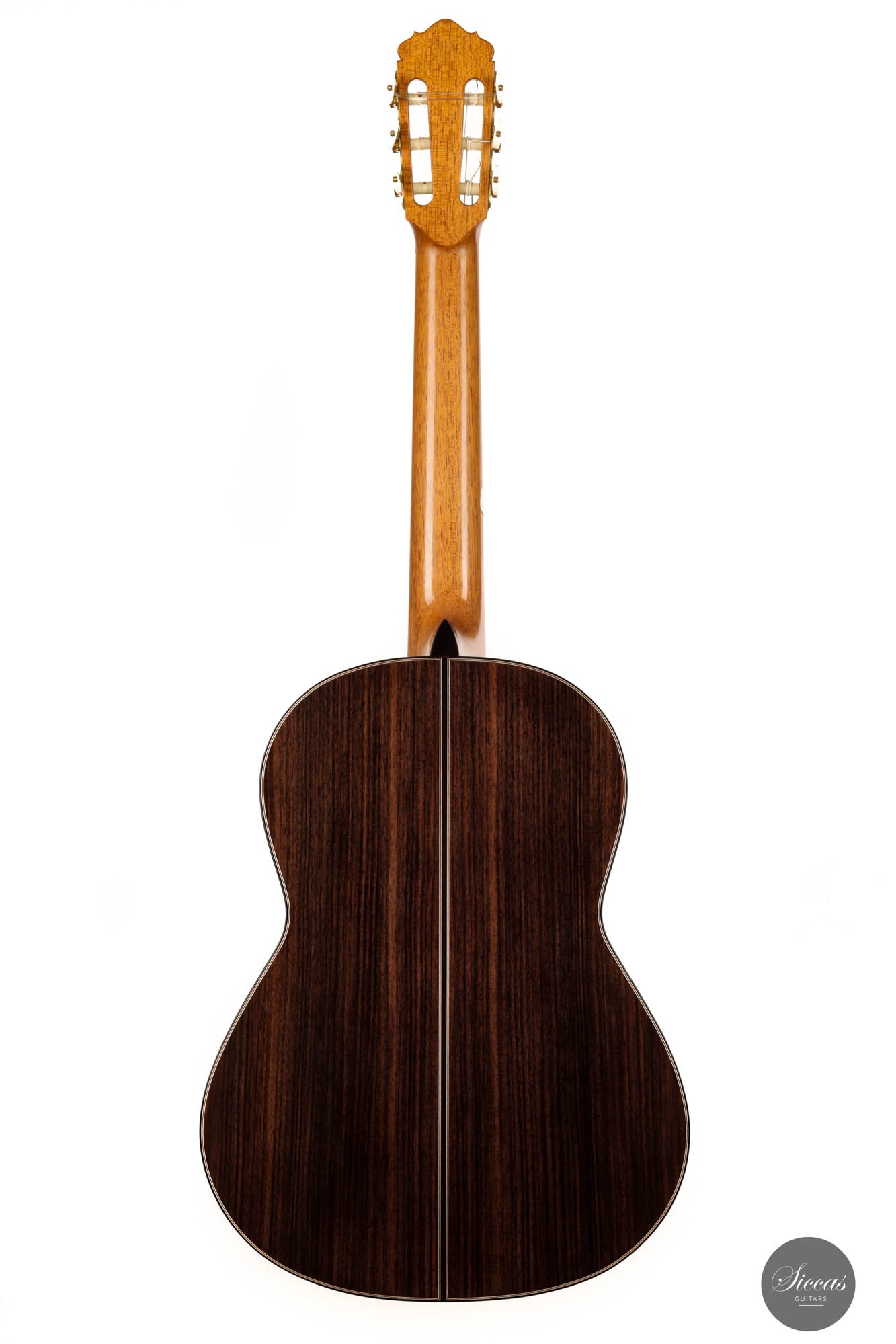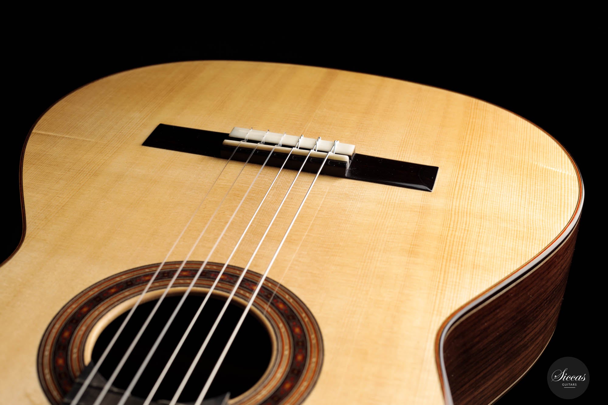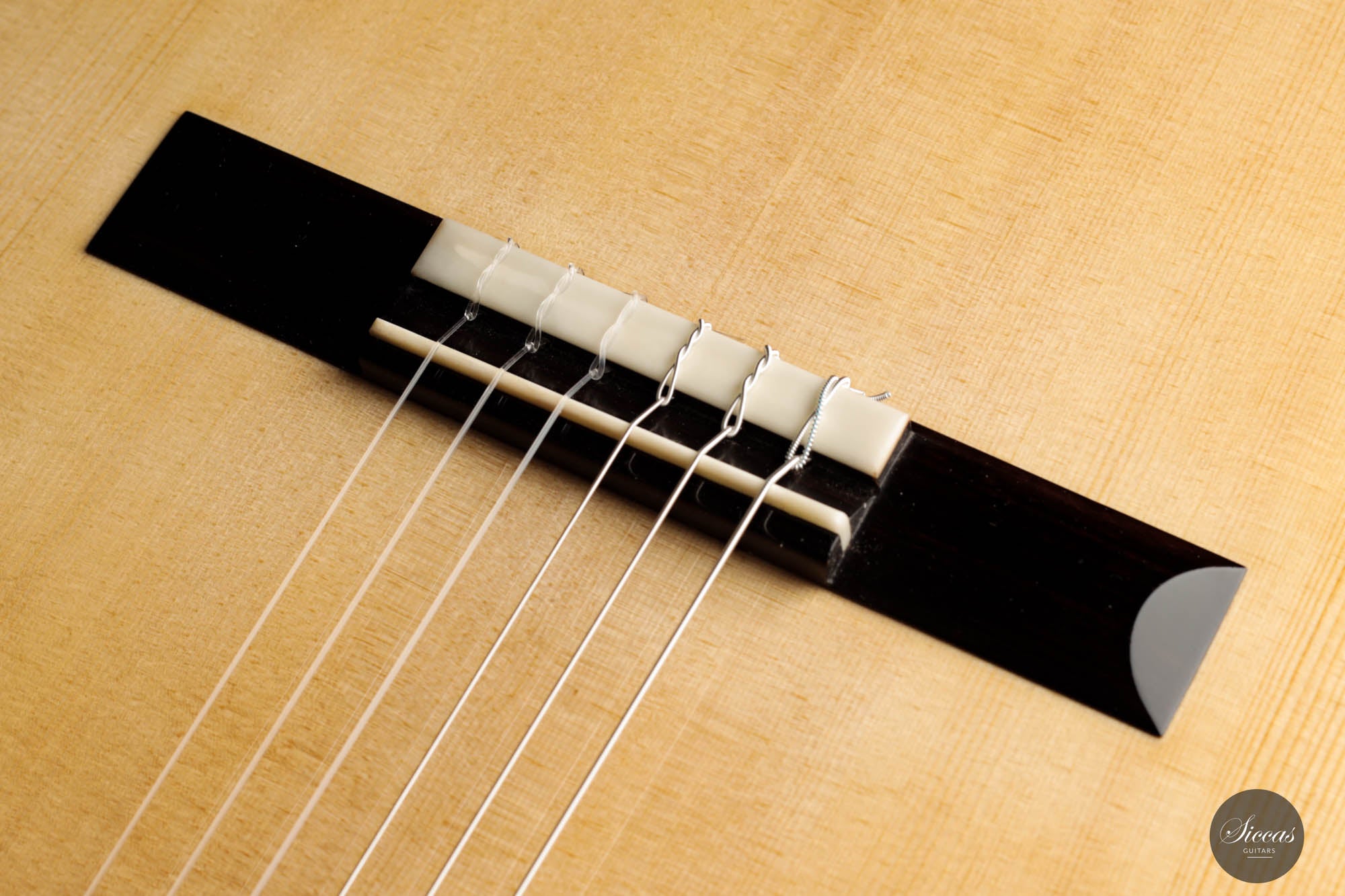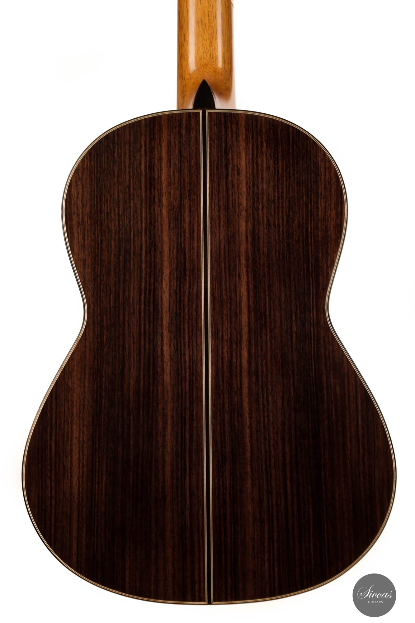 Diese bemerkenswerte 2023 Ennio Giovanetti-Gitarre ist ein atemberaubendes Beispiel für die konsequente und sorgfältige Handwerkskunst des Geigenbauers. Inspiriert von den ikonischen Entwürfen von Daniel Friederich, besitzt diese Gitarre einen unverwechselbaren Charme und Eleganz. Das Herzstück dieses Instruments ist eine wunderschöne Fichtendecke, die von Daniel Friederich persönlich bezogen wurde. Die einzigartige Konstruktion besteht aus fünf Fächerstreben und einer dünnen Zedernstrebe unter dem Steg. Boden und Zargen sind aus erstklassigem indischen Palisander gefertigt, der aufgrund seiner außergewöhnlichen Qualität und seines reichen Aussehens handverlesen wurde. Jedes Detail dieser 2023 Ennio Giovanetti-Gitarre wurde mit äußerster Präzision ausgeführt. Das Ergebnis ist ein meisterhaftes Instrument, das sowohl optisch als auch akustisch begeistert. Ihre beeindruckende Ausgewogenheit ist geprägt von soliden Höhen und tiefen, dunklen Bässen, die in einem fesselnden Klangerlebnis gipfeln. Als treue Hommage an die originalen Daniel Friederich-Gitarren fängt diese Giovanetti-Kreation nicht nur deren Essenz ein, sondern zeigt auch das tiefe Verständnis und die Wertschätzung des Gitarrenbauers für die legendären Designs.
