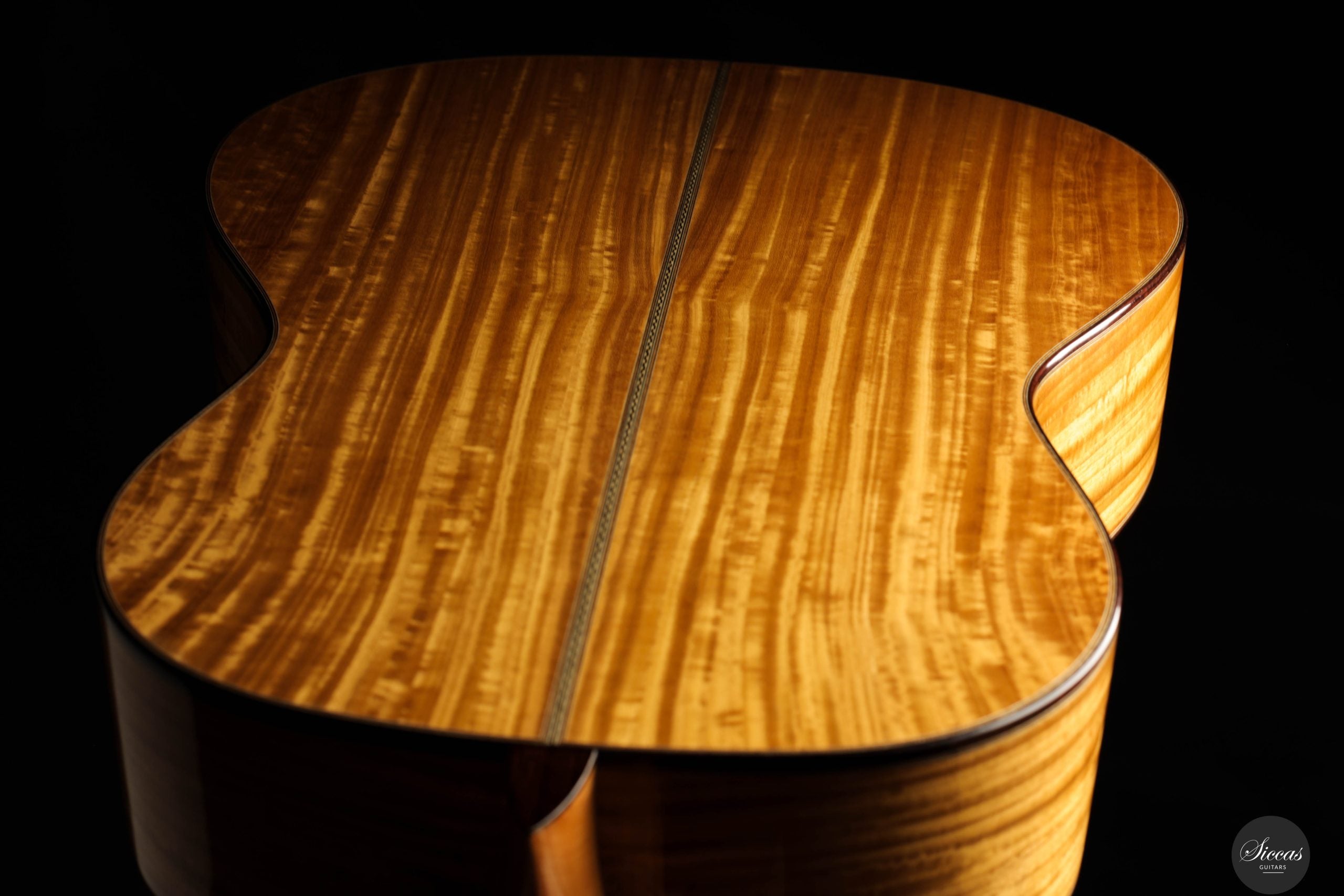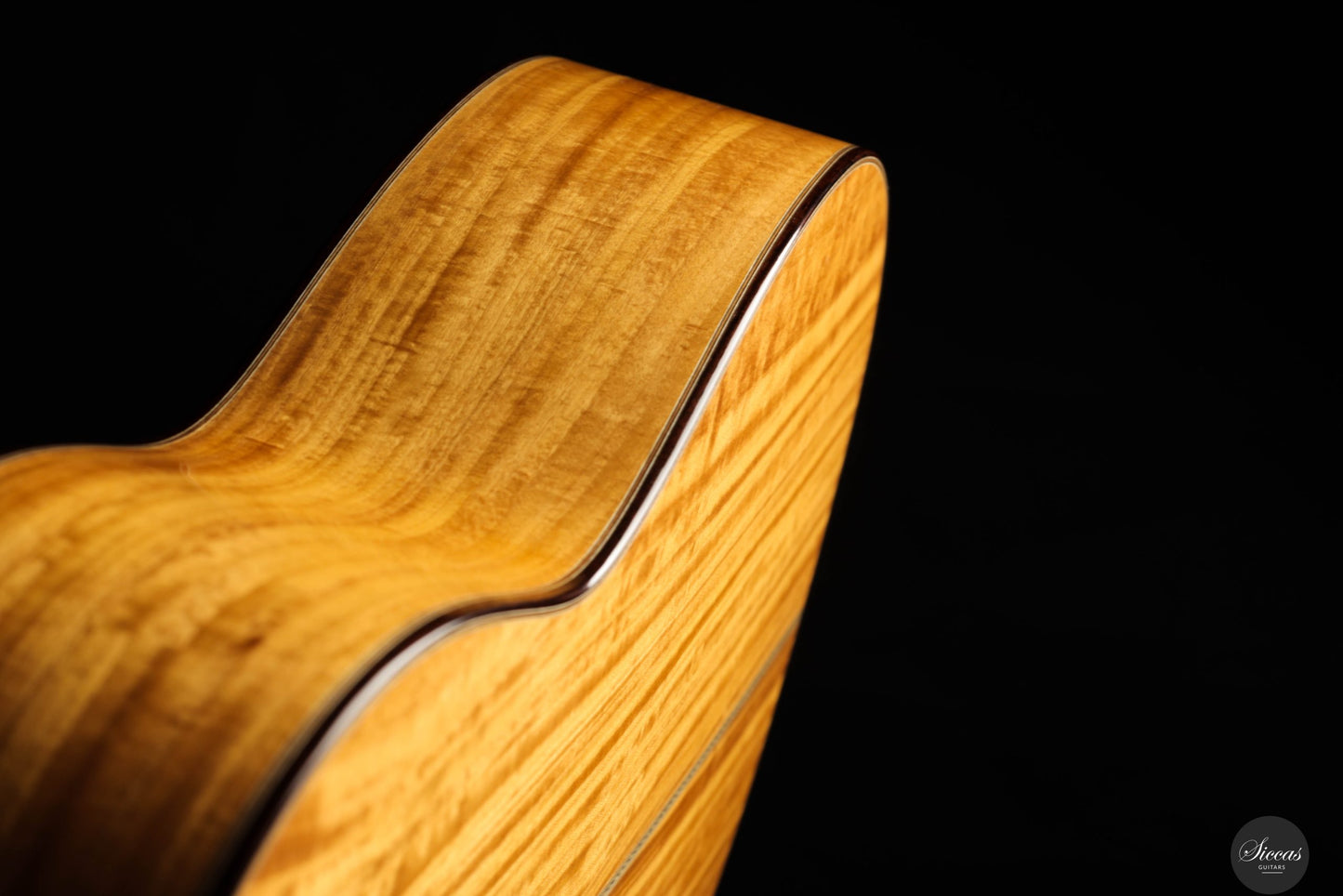 Boden und Zargen bestehen aus Satinholz, einem persönlichen Favoriten Ennios, das durch seine hohe Steifigkeit bei geringem Gewicht sowie durch seinen reichen Ton geschätzt wird. Die Decke besteht aus lange abgelagerter Fichte, was sich unter anderem in den dunklen, markanten Maserungslinien widerspiegelt. Der Hals ist aus Kirschholz gefertigt, das etwas schwerer ist als die üblichen Materialien, jedoch zu einem kraftvollen Tonansatz und langem Sustain beiträgt.