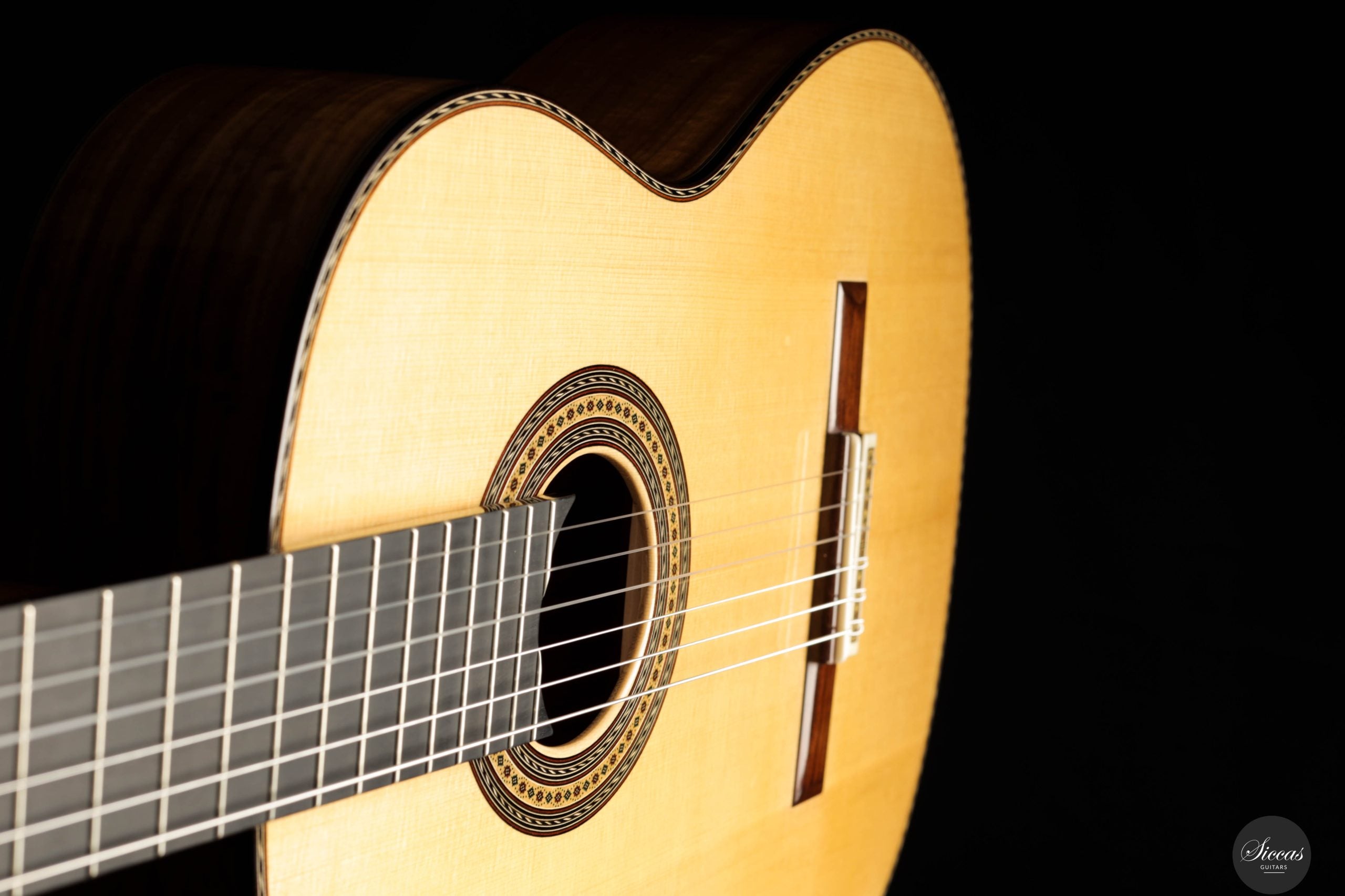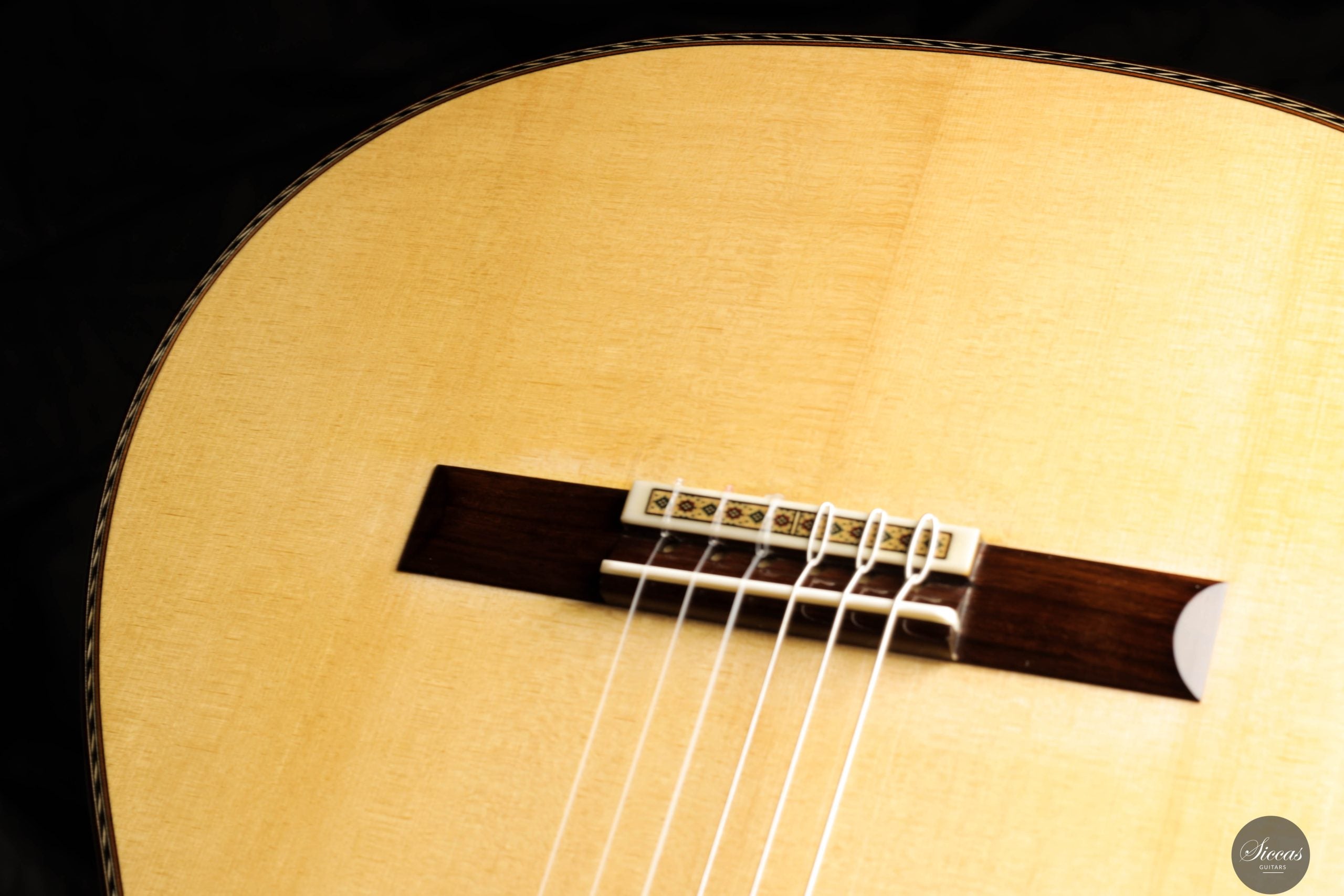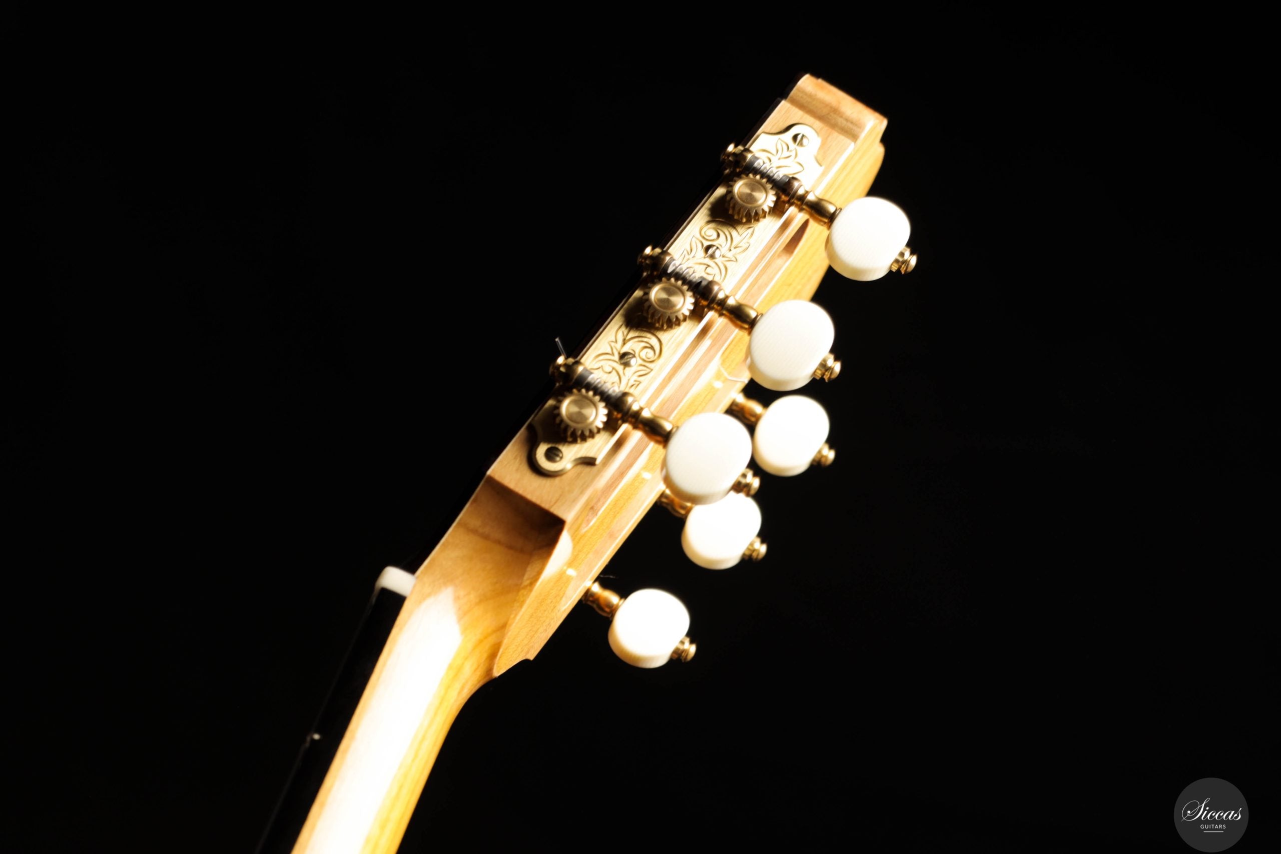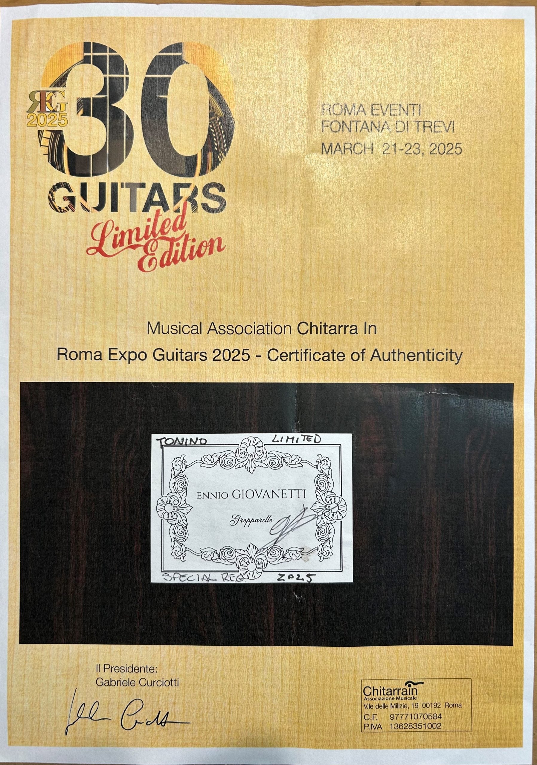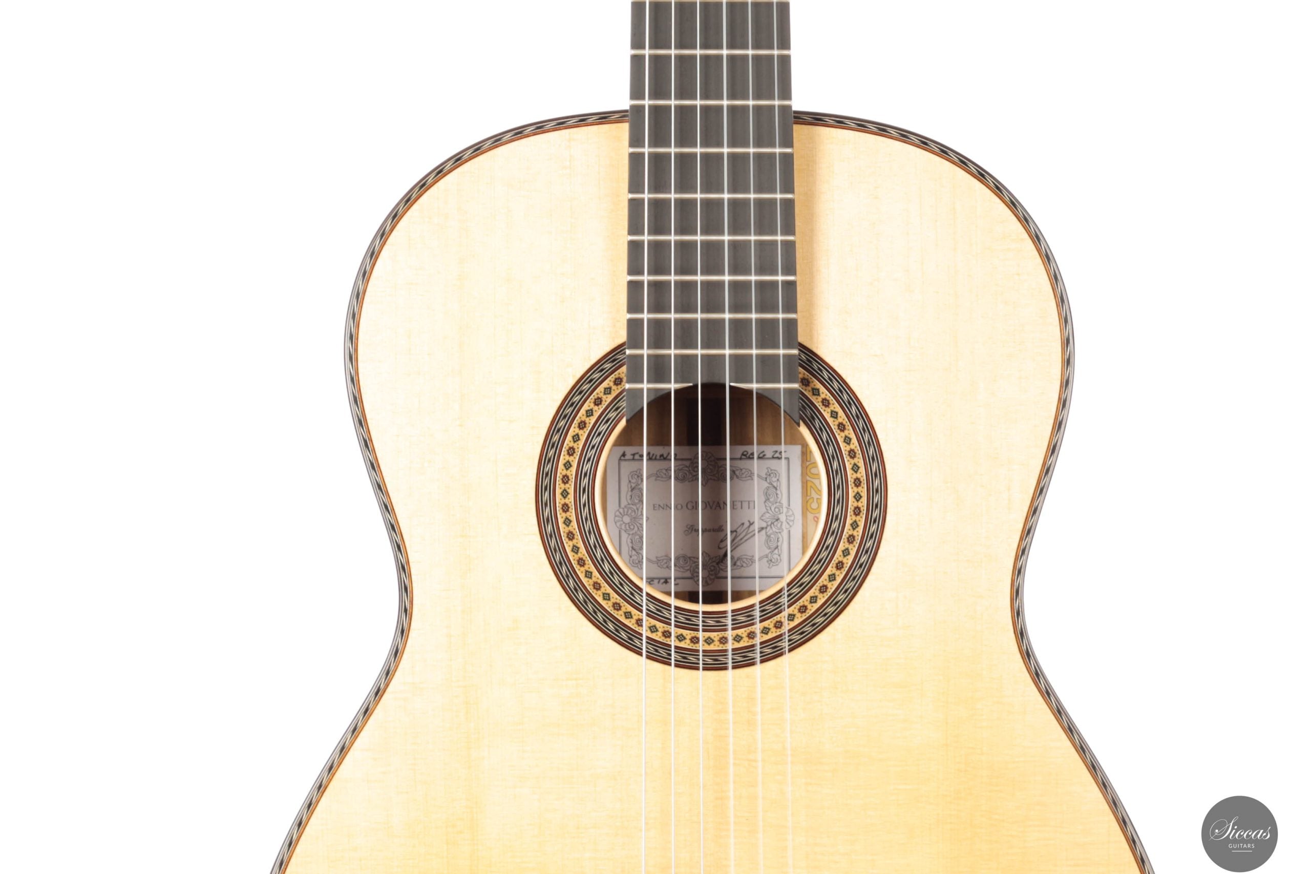 Diese besondere Gitarre aus der REG Limited Edition 2025 ist Antonio Scandurra gewidmet, einem großen Gitarrenbauer und Lehrer, der am 24. Februar 2024 im Alter von 89 Jahren verstarb. Ennio Giovanetti ehrt mit diesem Instrument einen Mentor, der ihm tiefgreifende Einsichten in sein Handwerk vermittelte. Die Gitarre ist das Ergebnis von Ennios persönlichem Weg im Instrumentenbau und vereint zahlreiche Innovationen mit dem Ziel, einen traditionellen spanischen Klang beizubehalten.