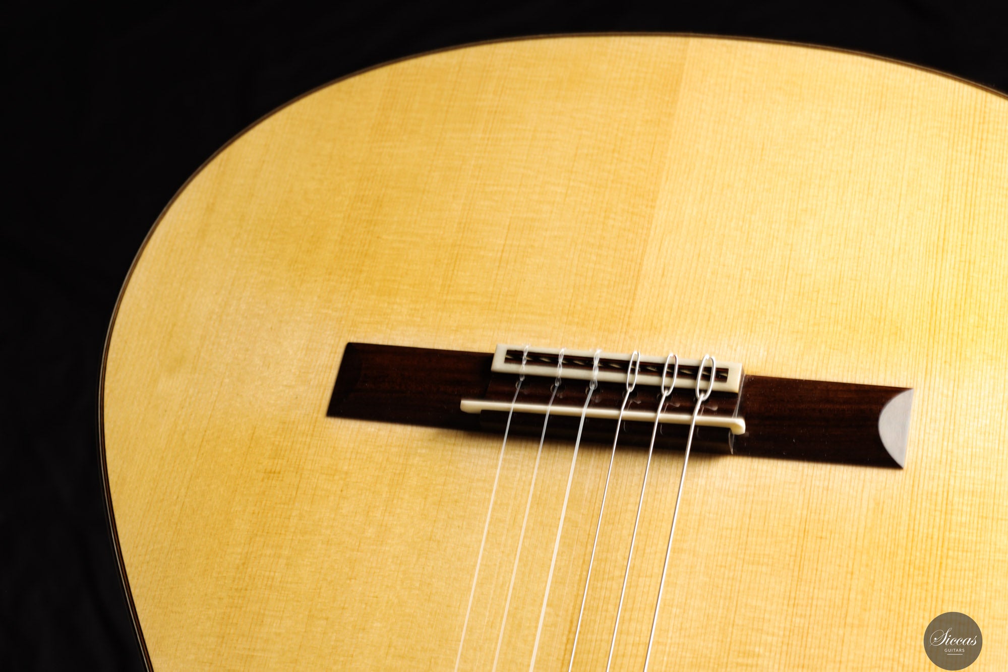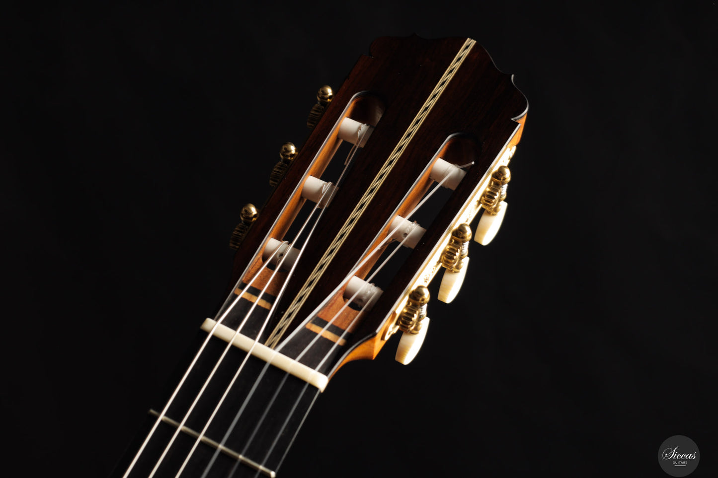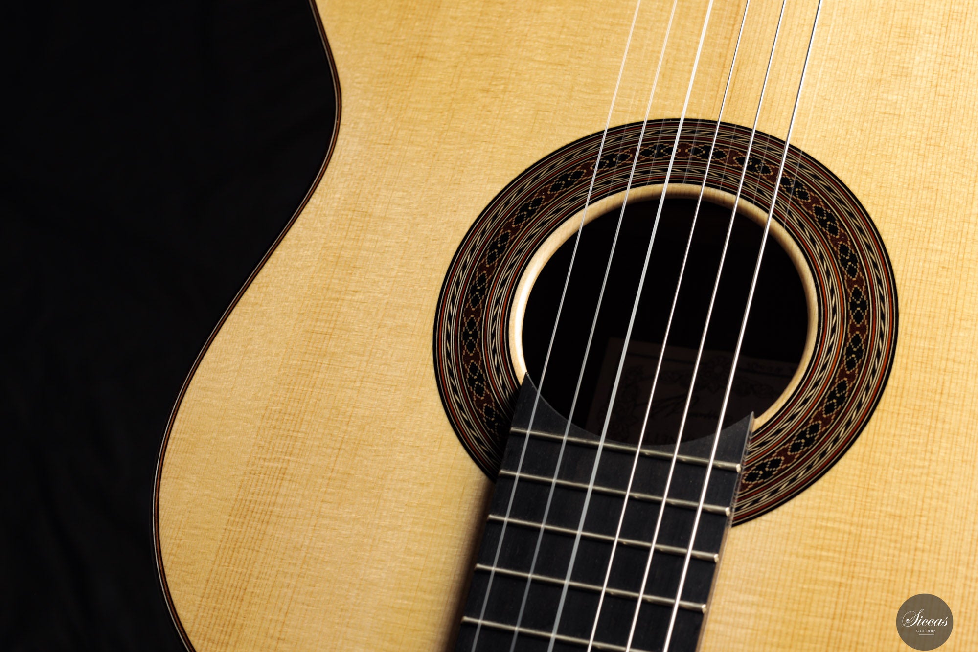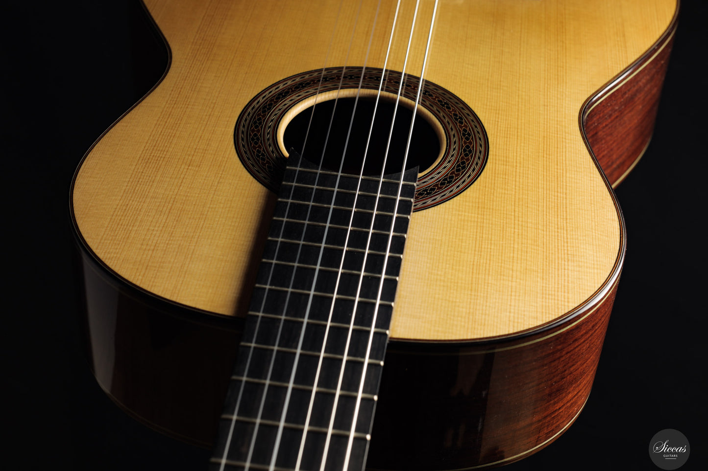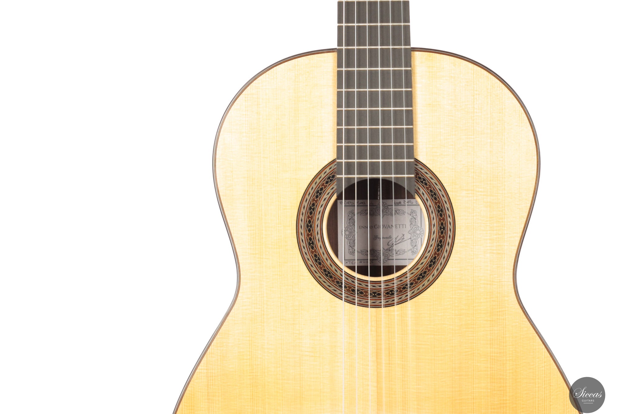 Klanglich überzeugt das Instrument durch eine ausgereifte und ausgewogene Stimme: samtige Bässe, langes Sustain und warme, runde Höhen. Die Ansprache ist moderat und unterstützt eine kontrollierte Projektion sowie nuancierte Dynamik. Die klangliche Homogenität über das gesamte Register hinweg verleiht der Gitarre eine besonders geschlossene Charakteristik. Die Bauweise reflektiert Giovanettis tiefe Wertschätzung für Friederichs Arbeit, sichtbar sowohl in der Auswahl der Hölzer als auch in der strukturellen Klarheit und schlichten Eleganz des Instruments. Mit ihrer 640 mm Mensur und dem geringen Gewicht bietet diese Gitarre ein hohes Maß an Spielkomfort bei zugleich klanglicher Tiefe und Reife.