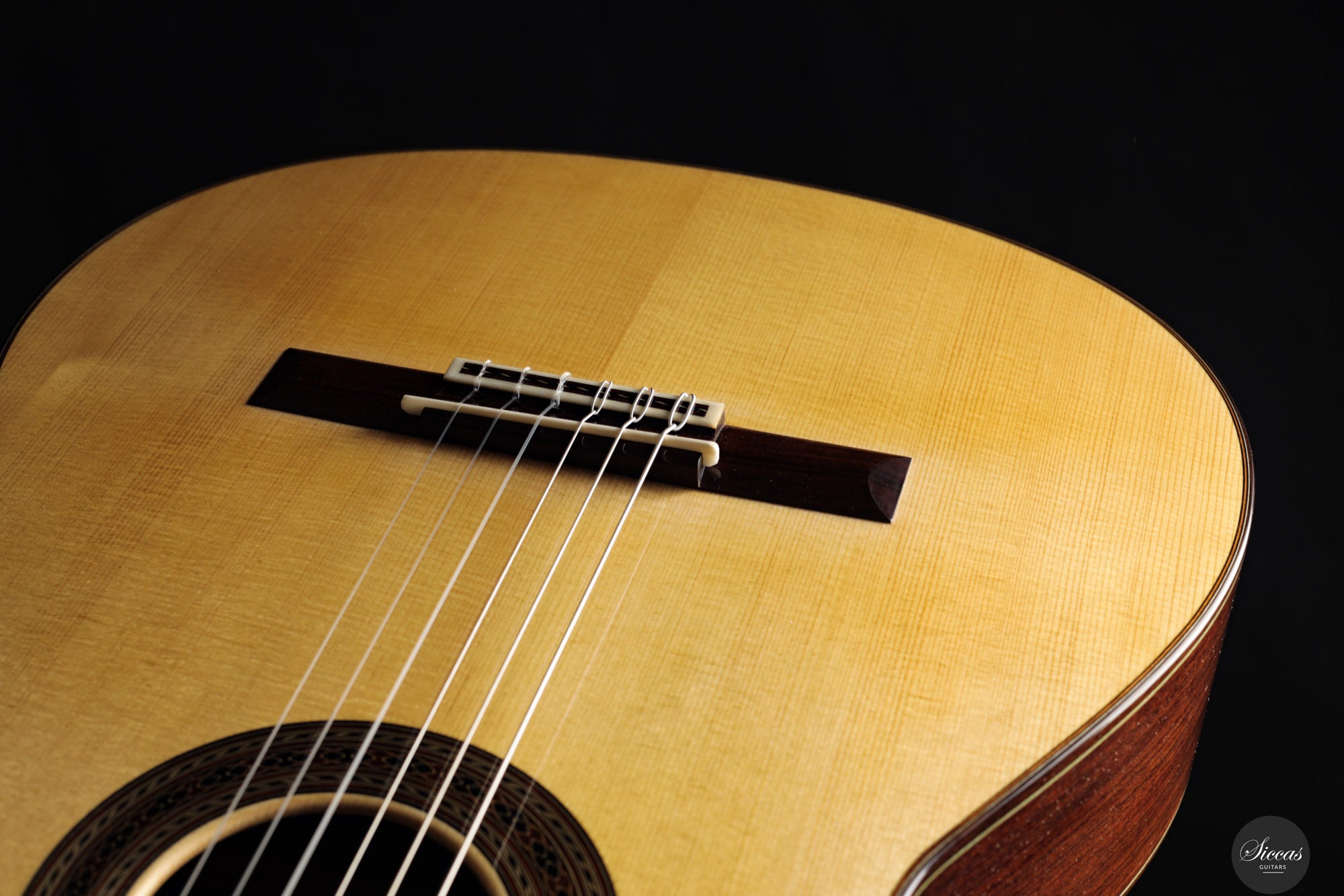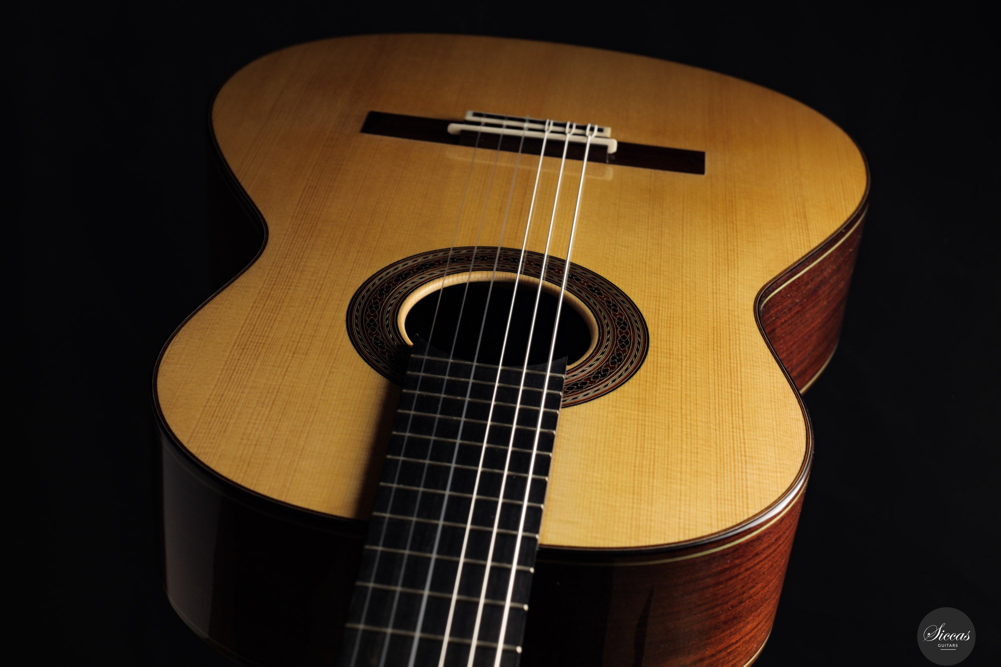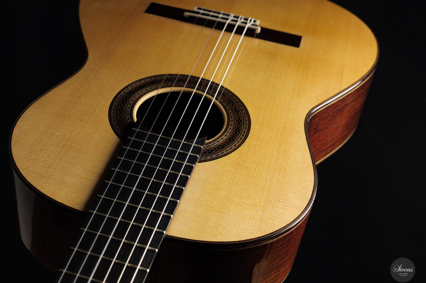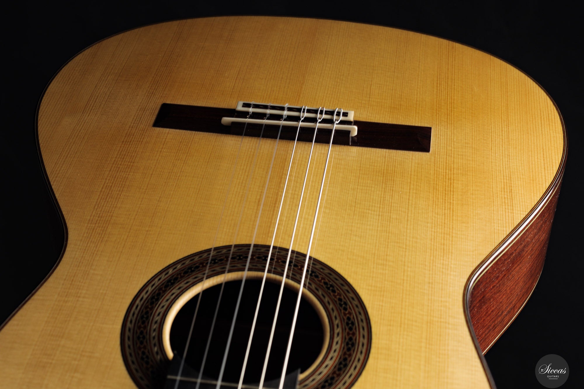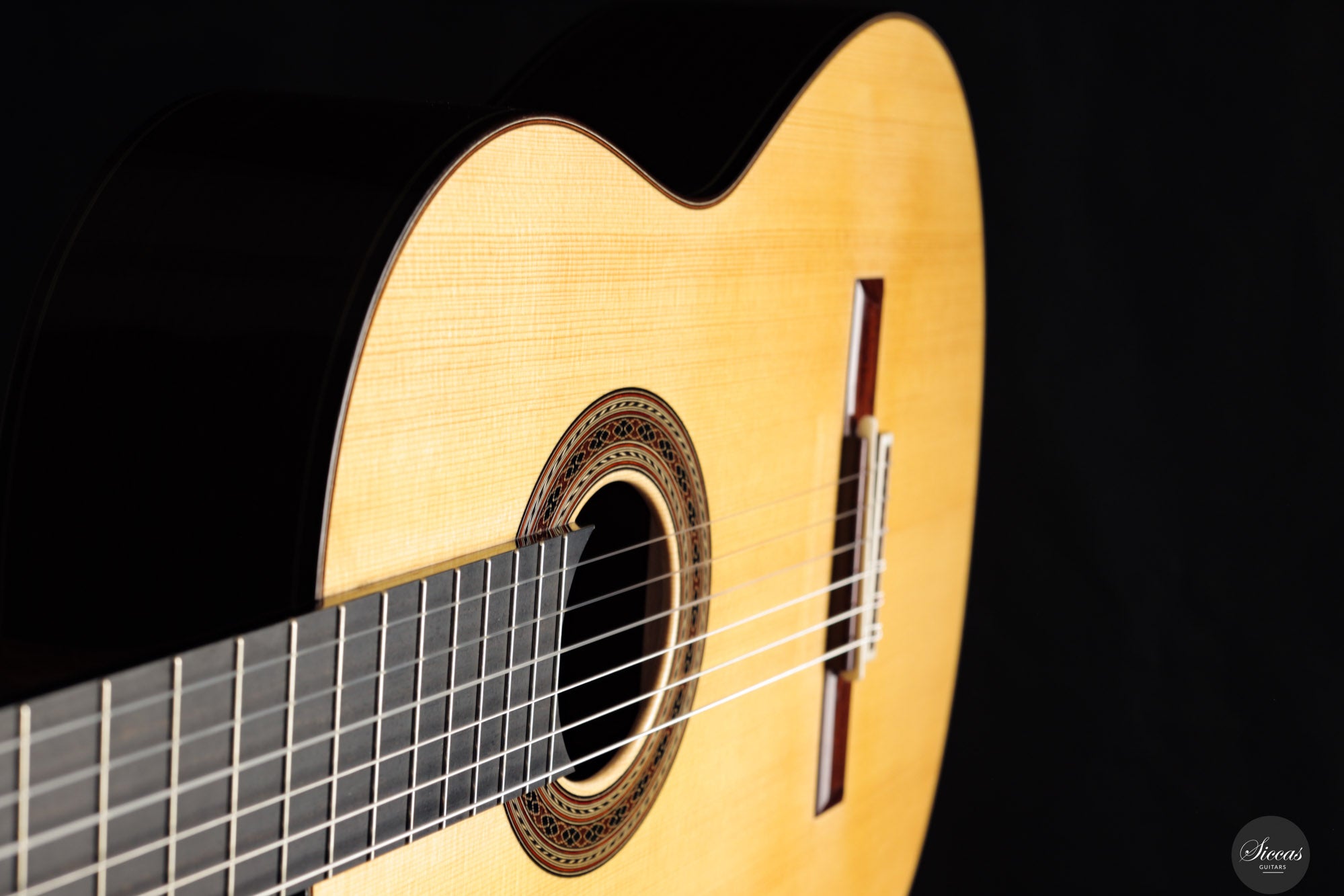 Klanglich überzeugt das Instrument durch eine ausgereifte und ausgewogene Stimme: samtige Bässe, langes Sustain und warme, runde Höhen. Die Ansprache ist moderat und unterstützt eine kontrollierte Projektion sowie nuancierte Dynamik. Die klangliche Homogenität über das gesamte Register hinweg verleiht der Gitarre eine besonders geschlossene Charakteristik. Die Bauweise reflektiert Giovanettis tiefe Wertschätzung für Friederichs Arbeit, sichtbar sowohl in der Auswahl der Hölzer als auch in der strukturellen Klarheit und schlichten Eleganz des Instruments. Mit ihrer 640 mm Mensur und dem geringen Gewicht bietet diese Gitarre ein hohes Maß an Spielkomfort bei zugleich klanglicher Tiefe und Reife.
