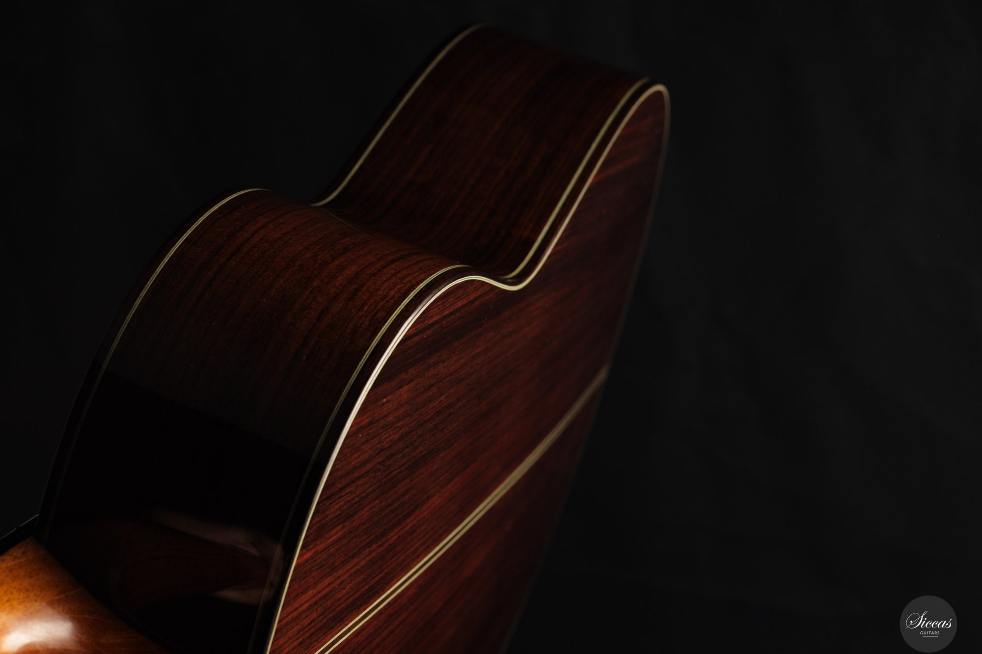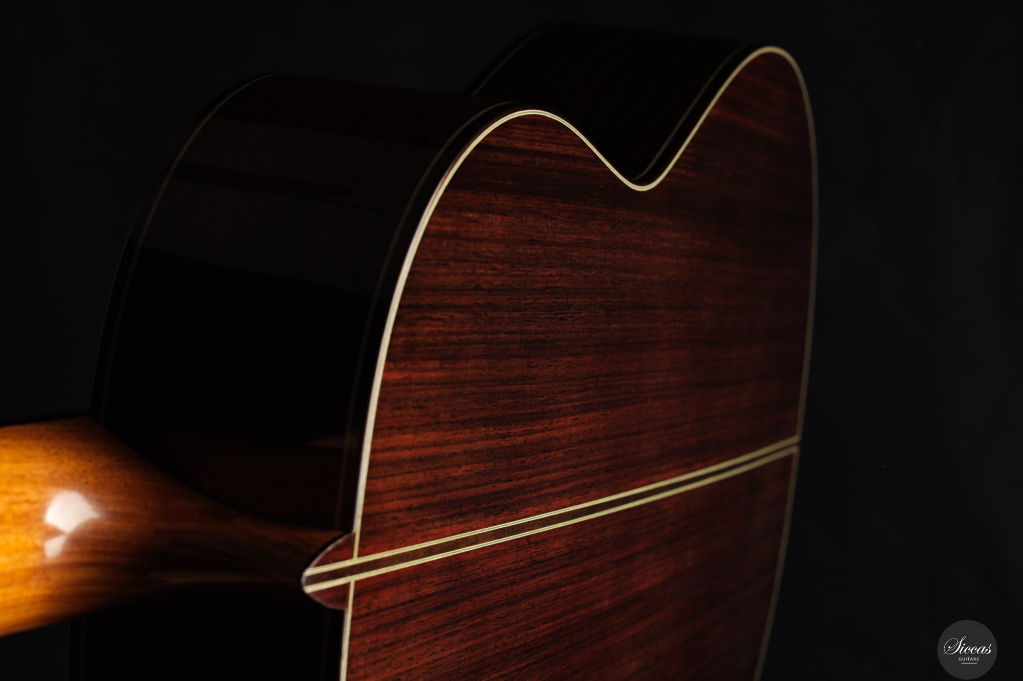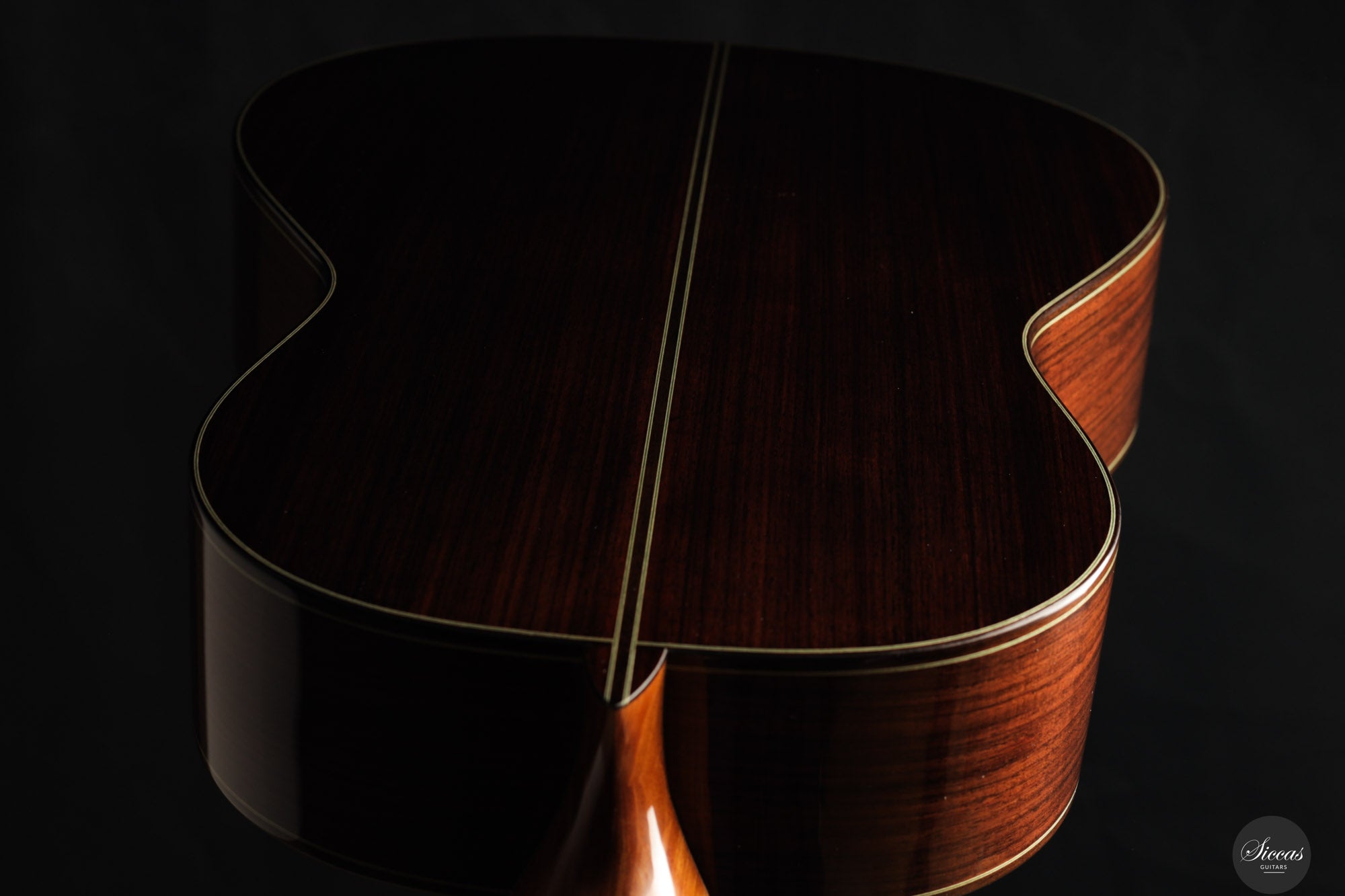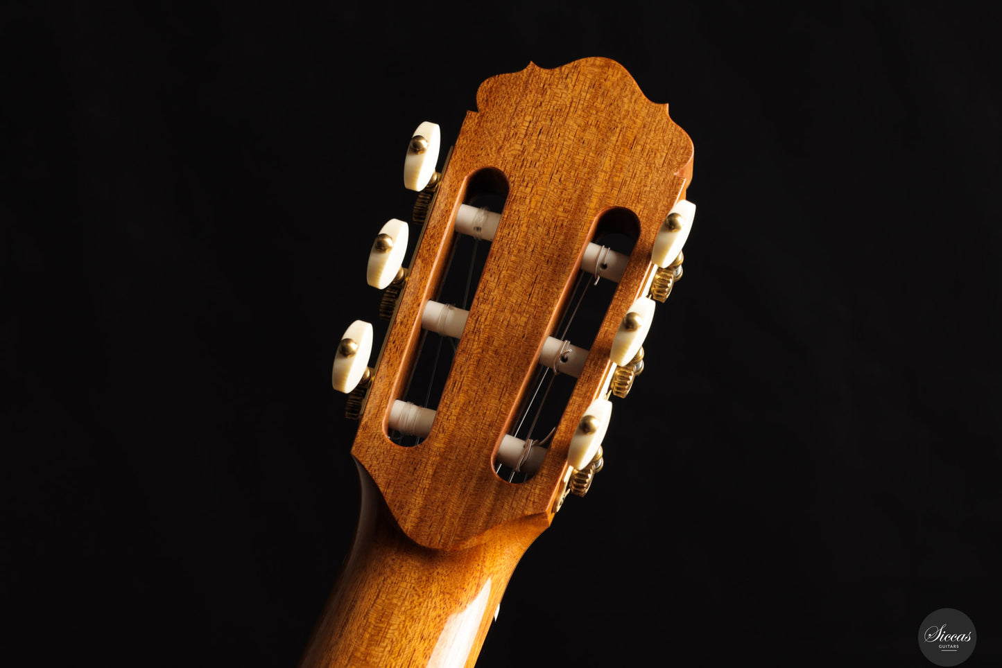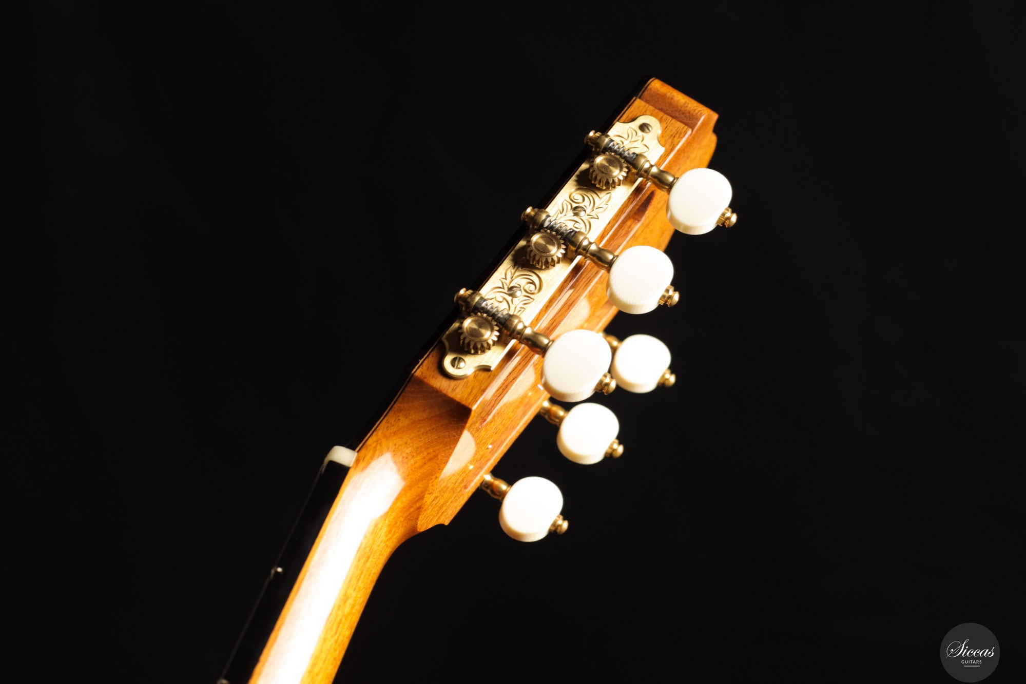 Klanglich überzeugt das Instrument durch eine ausgereifte und ausgewogene Stimme: samtige Bässe, langes Sustain und warme, runde Höhen. Die Ansprache ist moderat und unterstützt eine kontrollierte Projektion sowie nuancierte Dynamik. Die klangliche Homogenität über das gesamte Register hinweg verleiht der Gitarre eine besonders geschlossene Charakteristik. Die Bauweise reflektiert Giovanettis tiefe Wertschätzung für Friederichs Arbeit, sichtbar sowohl in der Auswahl der Hölzer als auch in der strukturellen Klarheit und schlichten Eleganz des Instruments. Mit ihrer 640 mm Mensur und dem geringen Gewicht bietet diese Gitarre ein hohes Maß an Spielkomfort bei zugleich klanglicher Tiefe und Reife.
