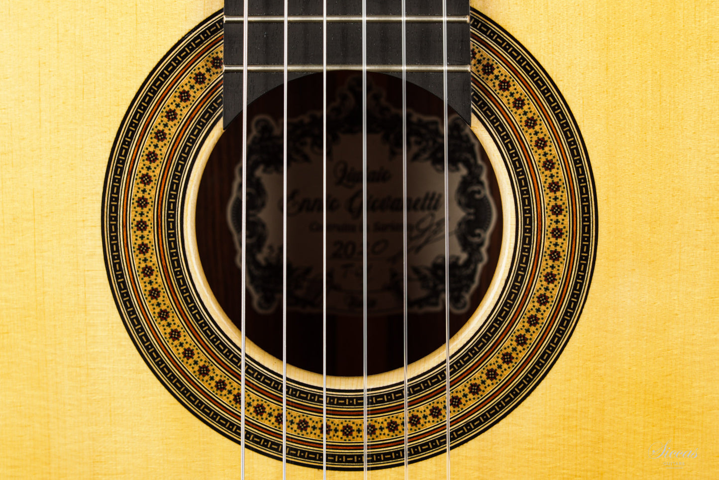 Ennio Giovanetti baut seit 1998 Gitarren in seiner Werkstatt in Sariano di Gropparello, nahe Piacenza (Italien). Er studierte Gitarrenbau in Mailand bei Enrico Bottelli, wo er die Möglichkeit hatte, viele Gitarren von Antonio de Torres, Simplicio, Garcia und vielen anderen kennenzulernen. Seine Gitarren sind nach traditioneller Art gebaut, aber durch ihre eigenen Elemente gut erkennbar. So wurde beispielsweise hinter dem Knüpfblock ein Teil des Steges freigelegt, um den Winkel der Saiten zu optimieren und damit Schwingungen zu fördern.