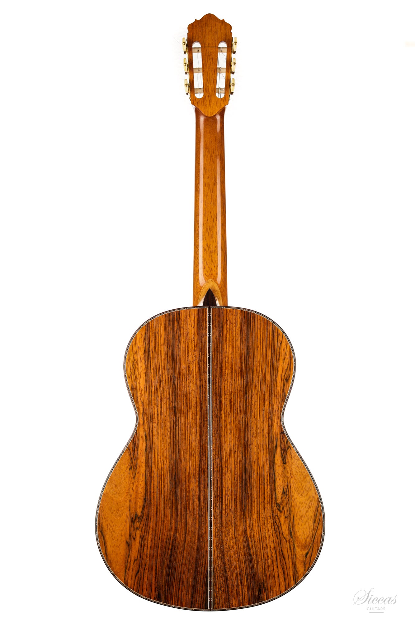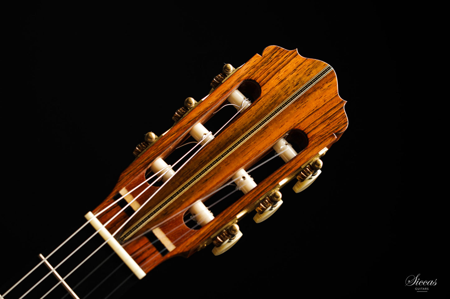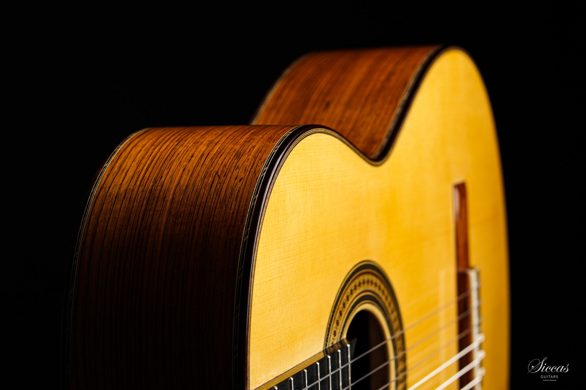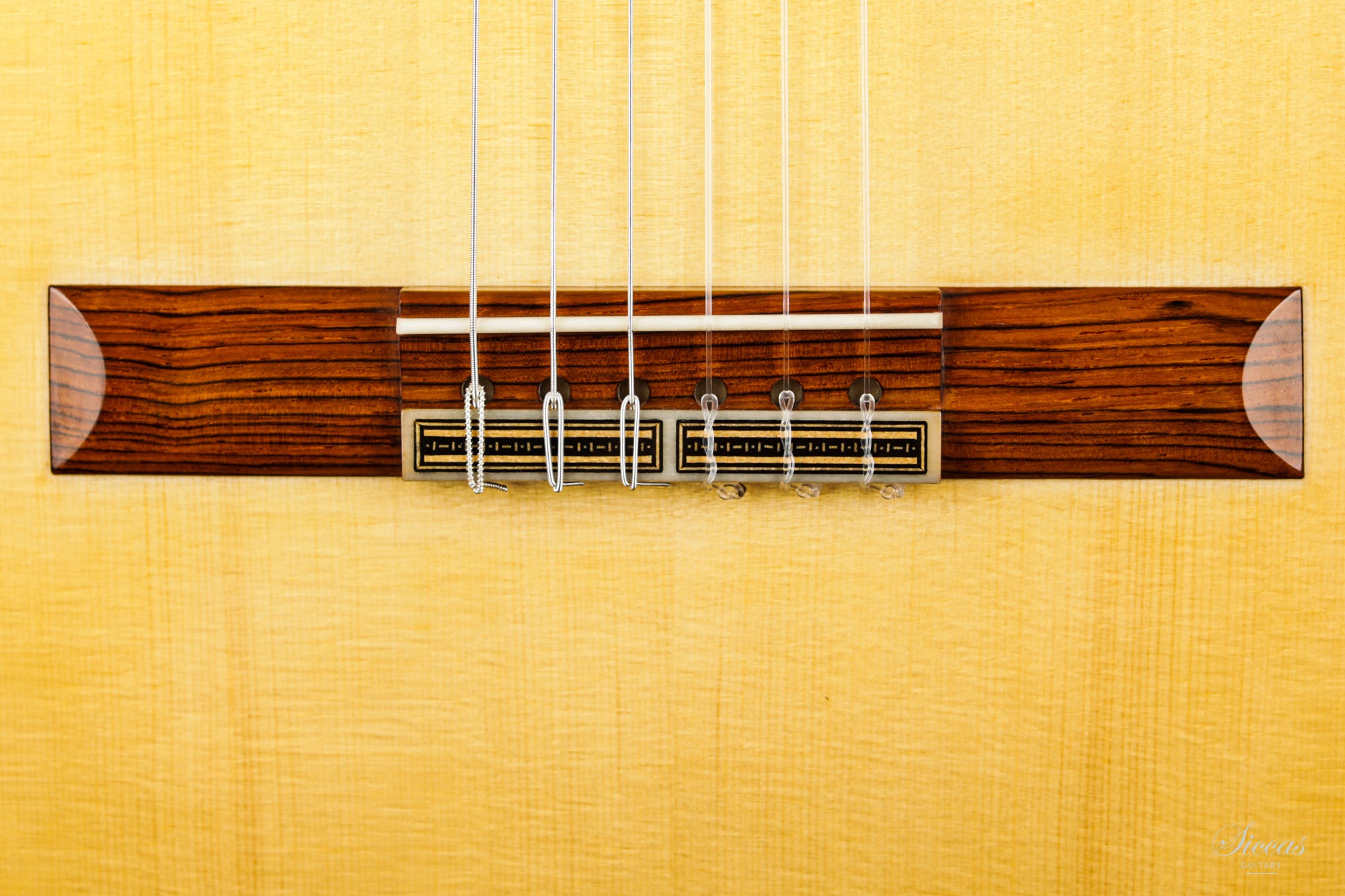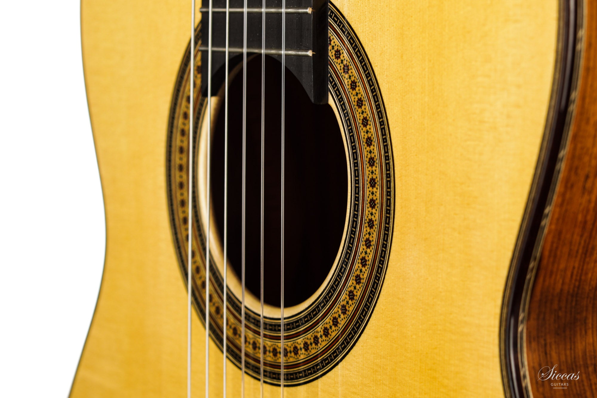 Diese bezaubernde Gitarre ist eine Sonderanfertigung mit einer erlesenen Auswahl an Hölzern, die wir speziell in Auftrag gegeben haben: Boden und Zargen sind aus wunderbarem CITES-zertifiziertem Rio-Palisander und die Decke ist aus einer wunderschönen Haselfichte entstanden. Das Instrument besitzt eine wunderbare Eleganz in Ton und Optik, sowie eine berührende klangliche Klarheit. Durch den komplexen Klang zusammen mit dem langen Sustain und der beeindruckenden Homogenität zwischen den Registern eignet es sich für ein breites Repertoire.