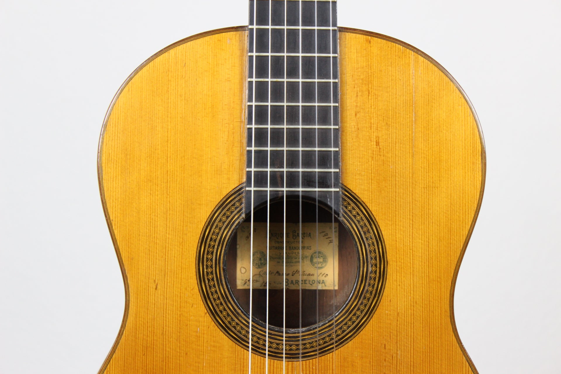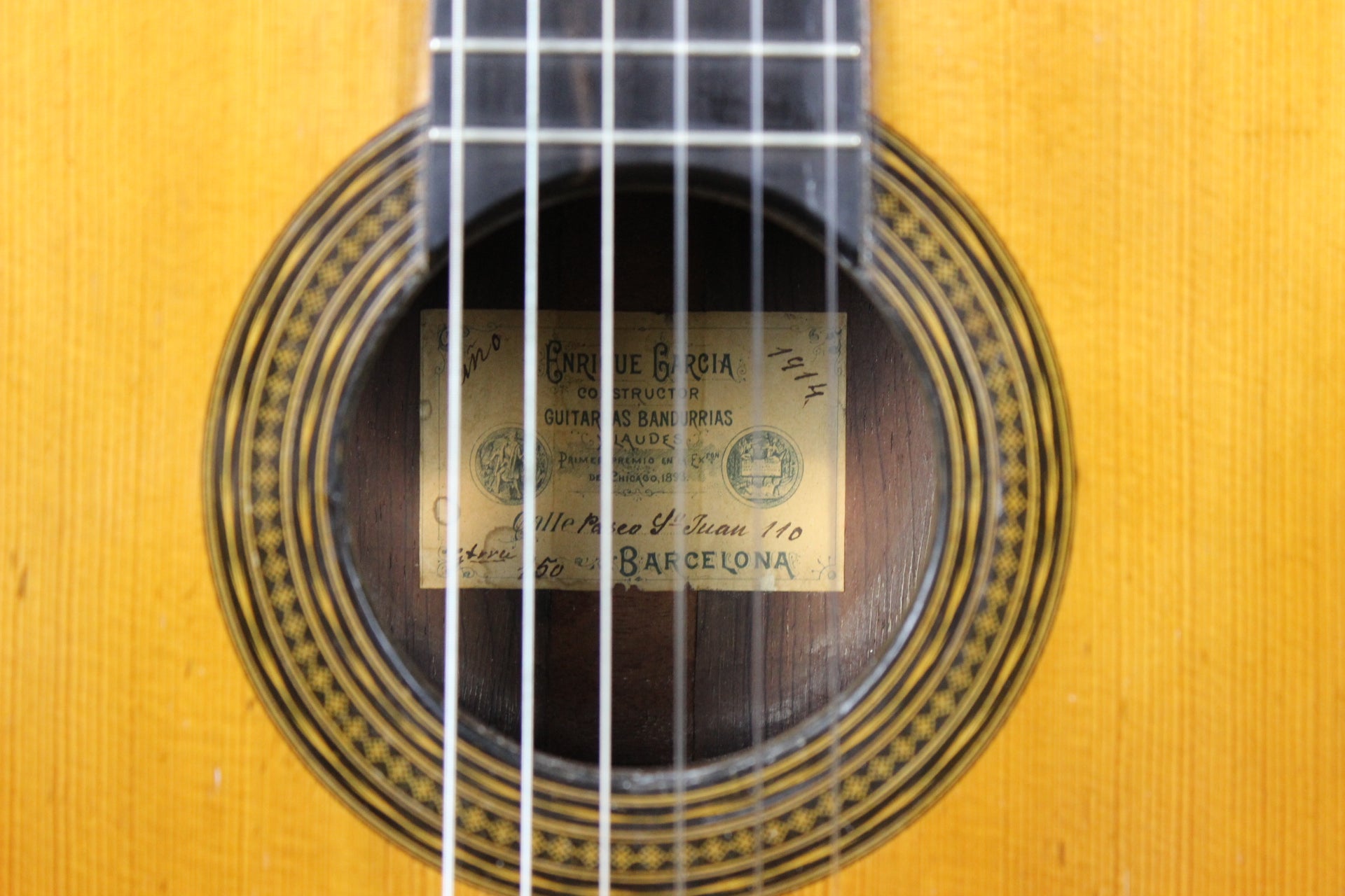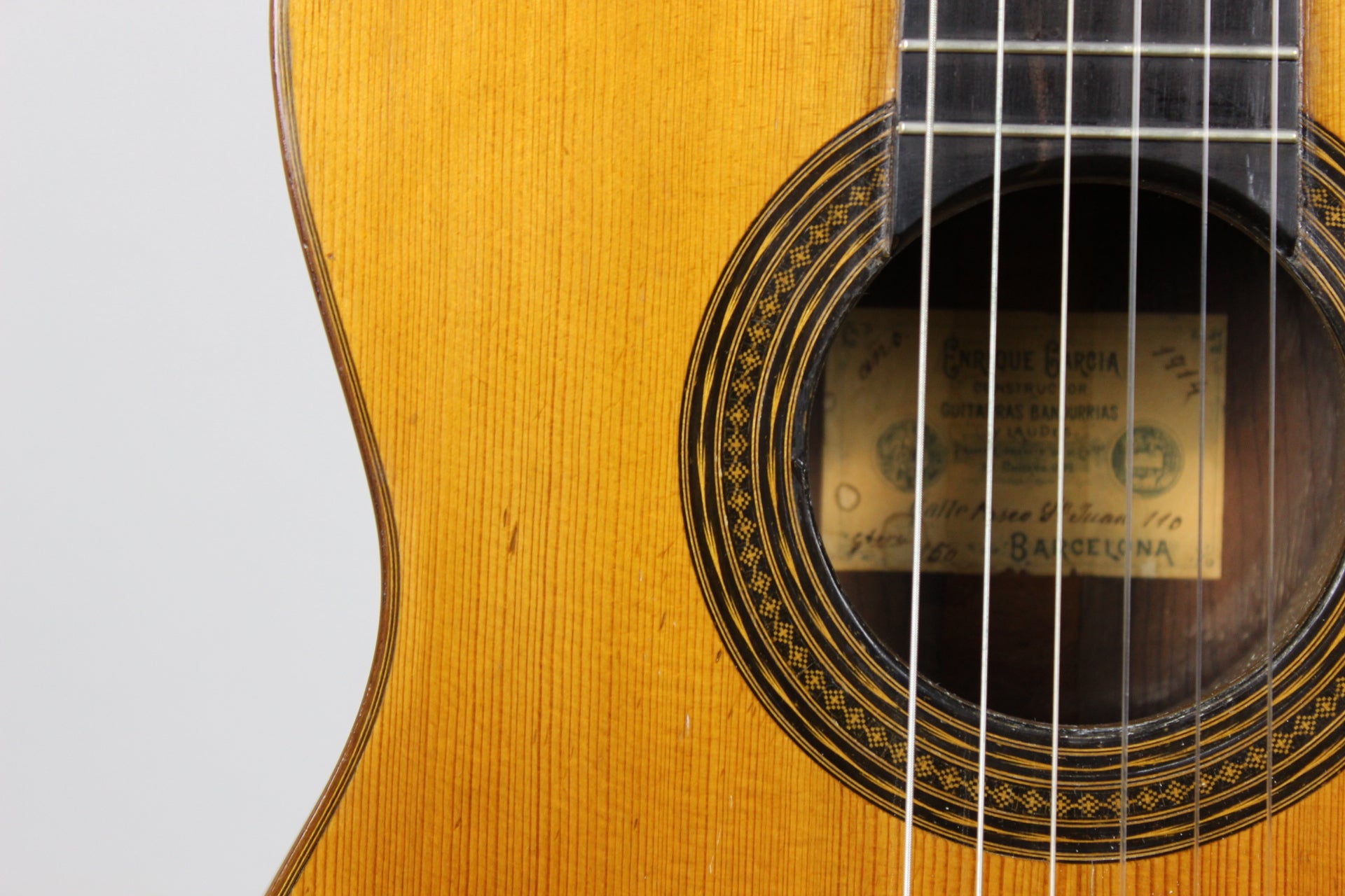 Enrique Garcia was born in Madrid in 1868. In 1883 he began an apprenticeship with José and probably also with Manuel Ramirez. A huge impact had the fact that he won the first price at the Chicago World Fair in 1893. Two years later he left the Ramirez workshop and concentrated on his career in his own workshop. Garcia can be seen as the founder of the Barcelona school of guitar making. He influenced many other guitar makers from Barcelona like Enrique Sanfeliù, Ignacio Fleta, Francisco Simplicio and many more. He was the most important guitar maker at the beginning of the 20th century and his guitars were played by Domingo Prat and Francisco Tarrega. The guitar has a beautiful equilibrated tone. Very nice and warm basses which is typical for these model with tornavoz. This guitar is in very good condition and has only repair over and below the bridge (in the middle of the sound board). The machine heads are original.