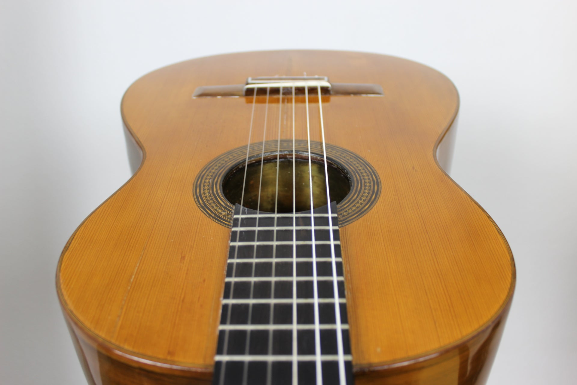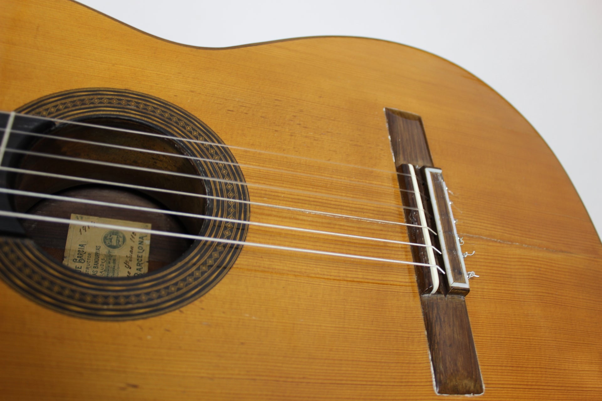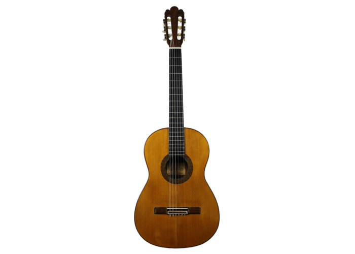 Enrique Garcia was born in Madrid in 1868. In 1883 he began an apprenticeship with José and probably also with Manuel Ramirez. A huge impact had the fact that he won the first price at the Chicago World Fair in 1893. Two years later he left the Ramirez workshop and concentrated on his career in his own workshop. Garcia can be seen as the founder of the Barcelona school of guitar making. He influenced many other guitar makers from Barcelona like Enrique Sanfeliù, Ignacio Fleta, Francisco Simplicio and many more. He was the most important guitar maker at the beginning of the 20th century and his guitars were played by Domingo Prat and Francisco Tarrega. The guitar has a beautiful equilibrated tone. Very nice and warm basses which is typical for these model with tornavoz. This guitar is in very good condition and has only repair over and below the bridge (in the middle of the sound board). The machine heads are original.