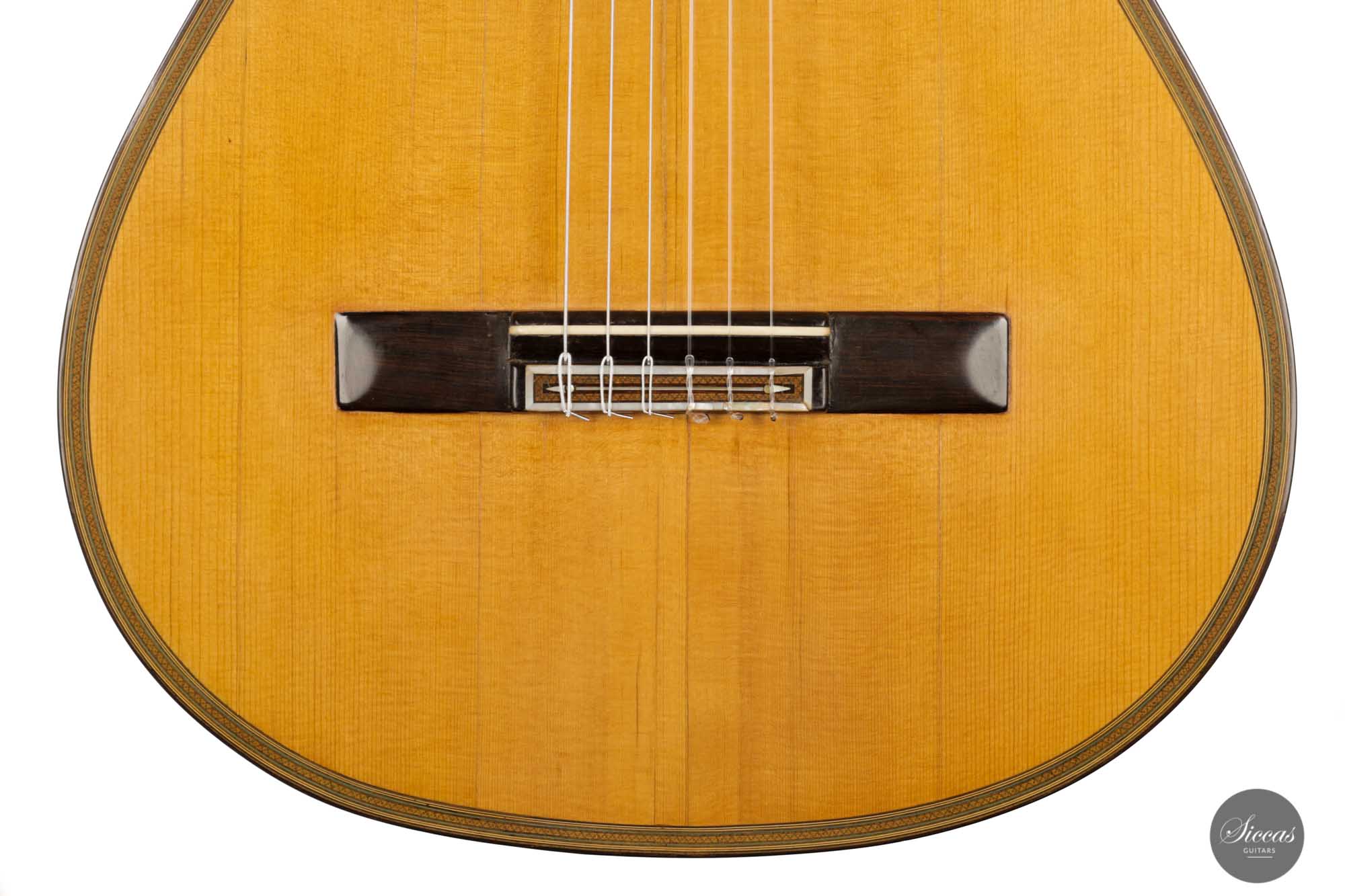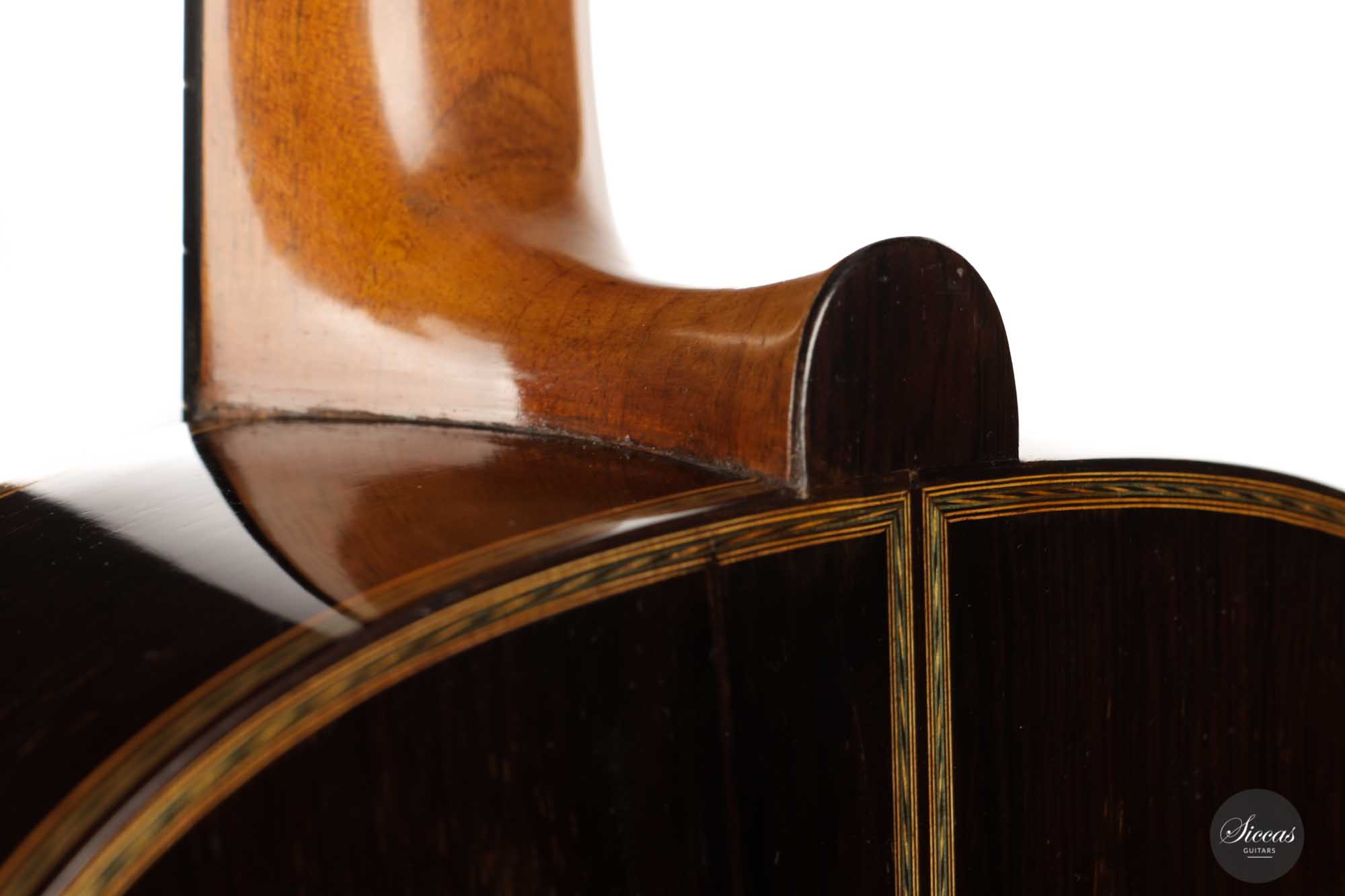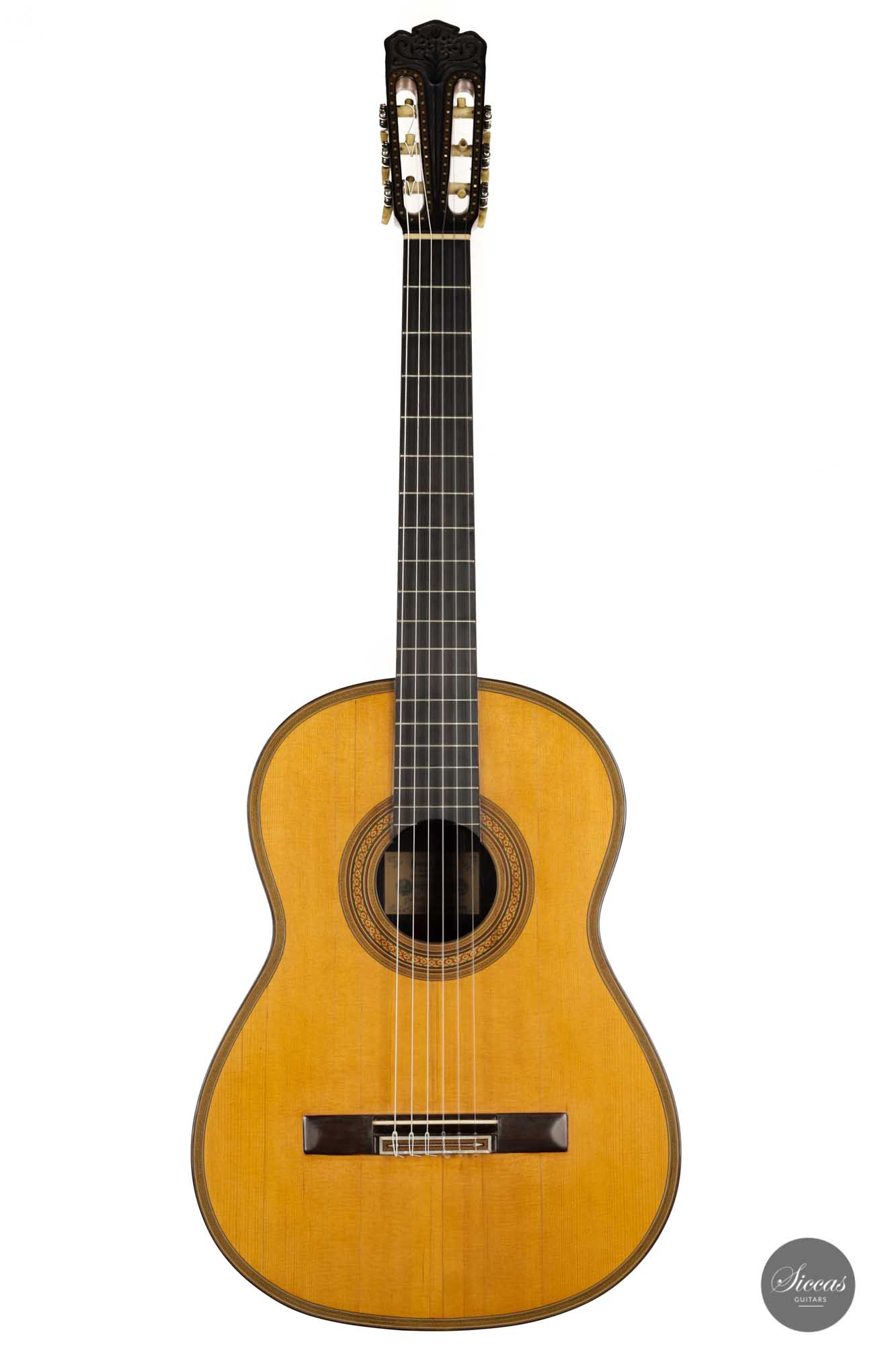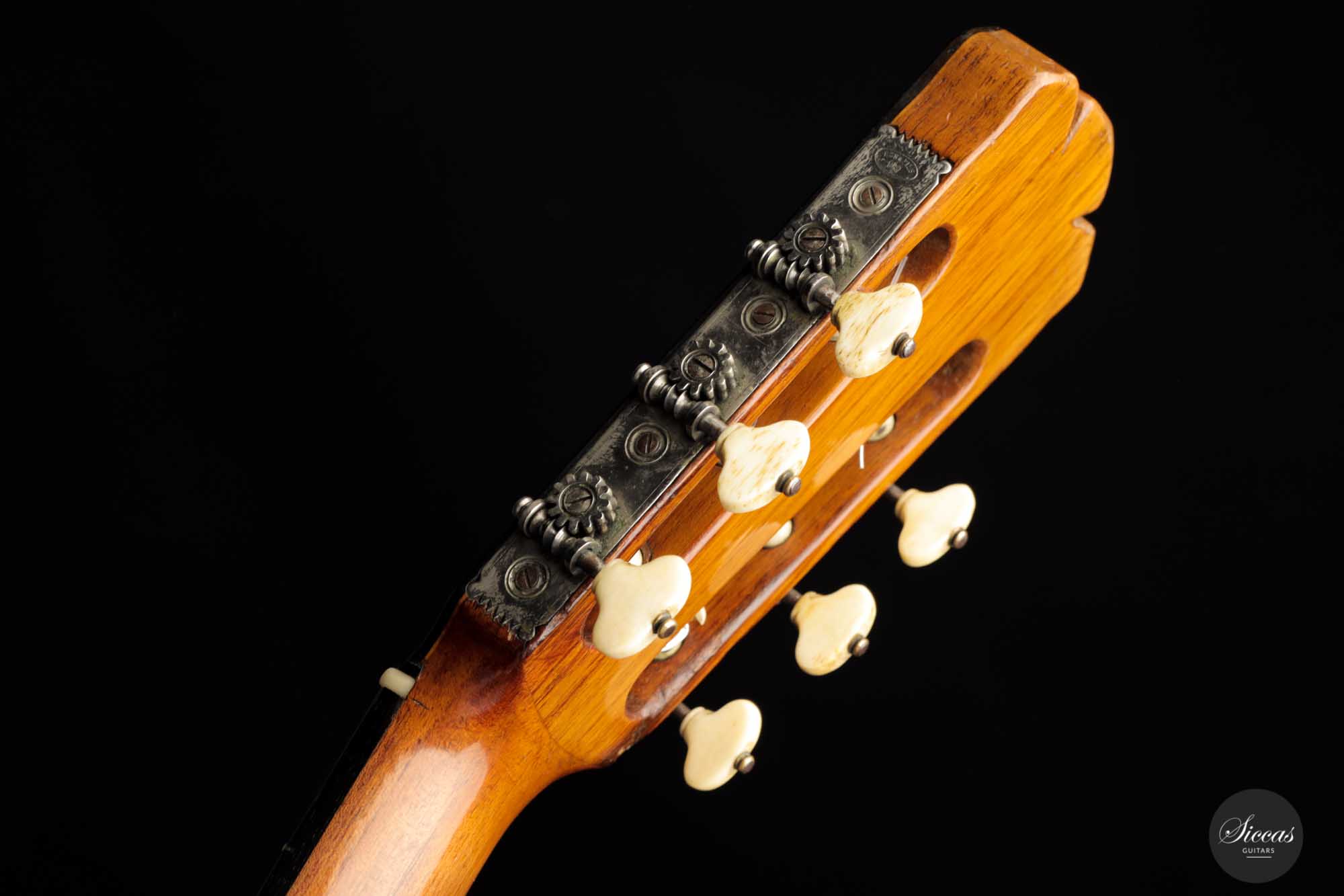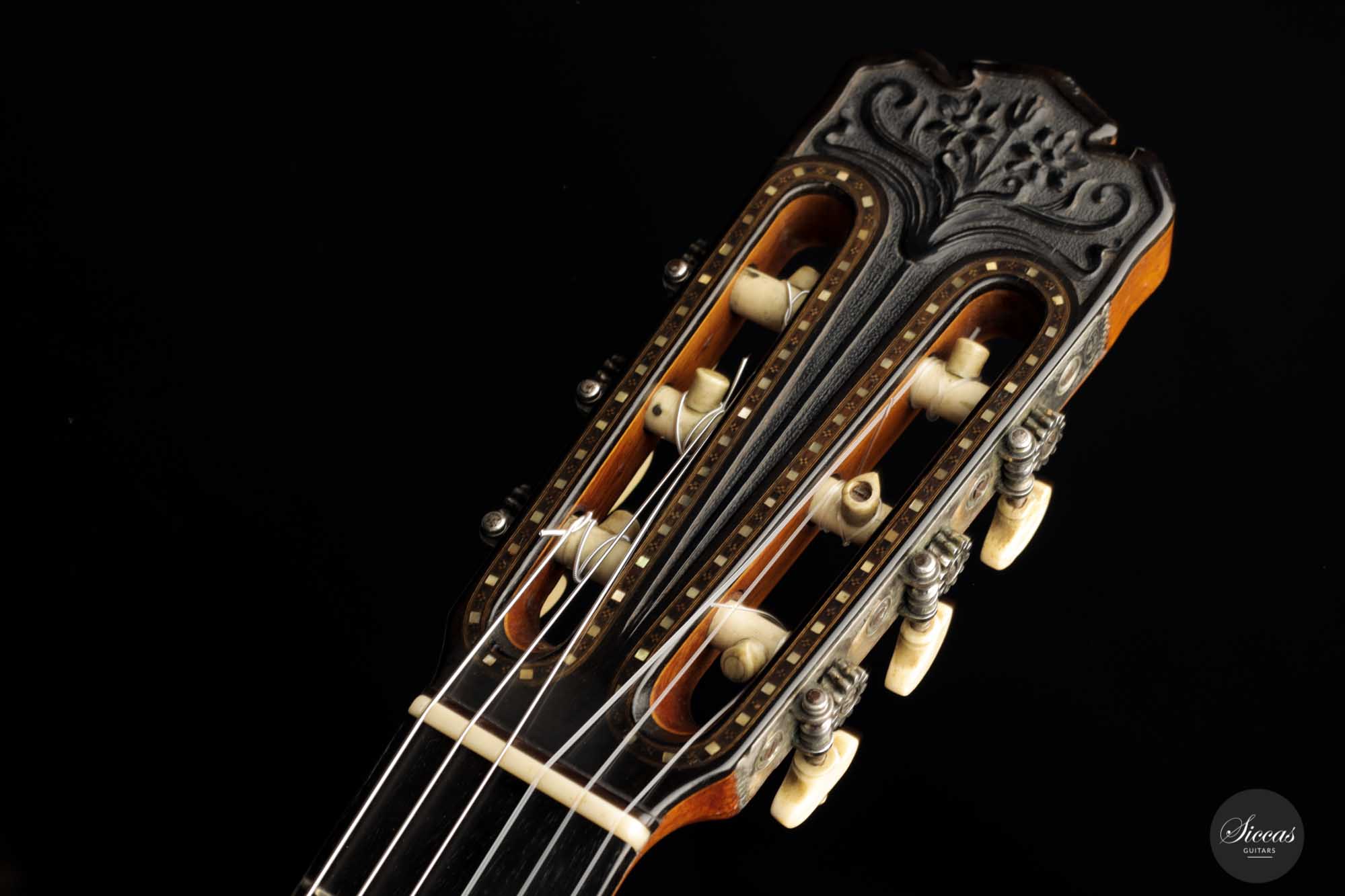 Diese 1920 gebaute Enrique-Garcia-Gitarre mit der Nummer 235 verkörpert die wesentlichen Merkmale der Gitarrenbauschule Barcelonas Anfang des 20. Jahrhunderts. FFür alle Liebhaber der katalanischen Ästhetik dieser Zeit gibt es kaum etwas Besseres, sowohl was den Klang als auch das Design betrifft. Dieses Instrument wurde gegen Ende der beruflichen Laufbahn von Enrique Garcia gebaut und ist ein seltenes, reich dekoriertes Modell. Die breite Rosette, die geschnitzte Kopfplatte, die kunstvollen Randeinlagen und das Mosaik auf der Kopfplatte machen es zu einem wahren Kunstwerk. Die eingefassten Mechaniken sind ein aufregendes Merkmal, das wir bei den Gitarren von Enrique Garcia nur selten bewundern konnten. Von vorn betrachtet sind sie völlig unsichtbar, was zeigt, mit wie viel Liebe zum Detail Enrique Garcia seine Instrumente gestaltete. DDiese Gitarre ist in ausgezeichnetem Zustand und hat einen gewaltigen Klang. Haarrisse in der Decke wurden fachmännisch restauriert, ein Riss am Boden wurde sorgfältig repariert, so dass diese außergewöhnlich seltene und sammelwürdige Gitarre nun bereit ist, gespielt und aufgezeichnet zu werden.