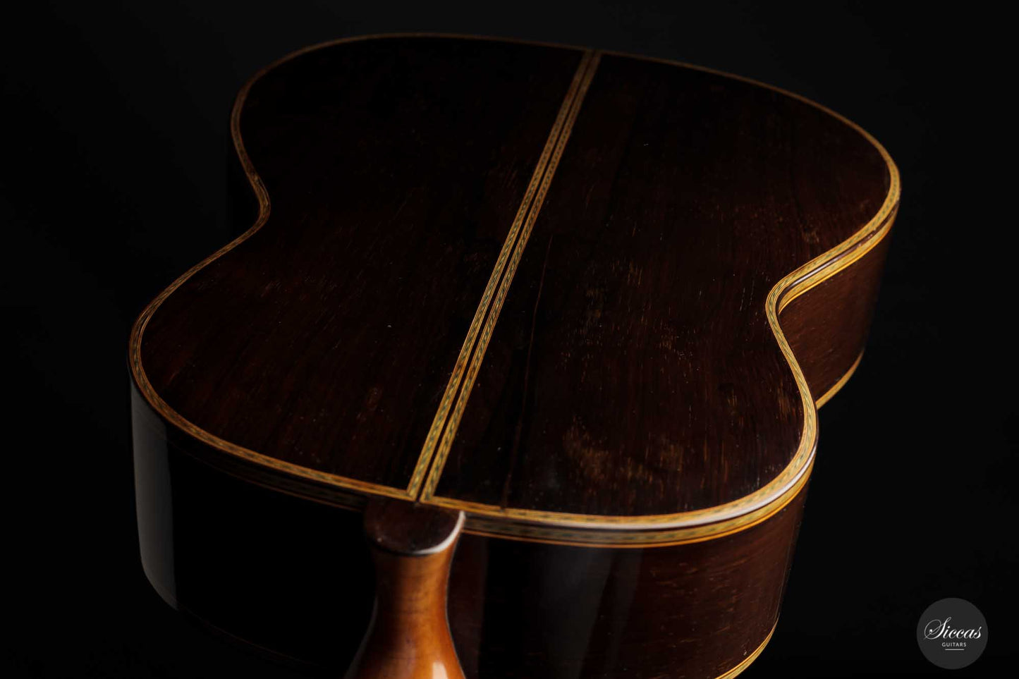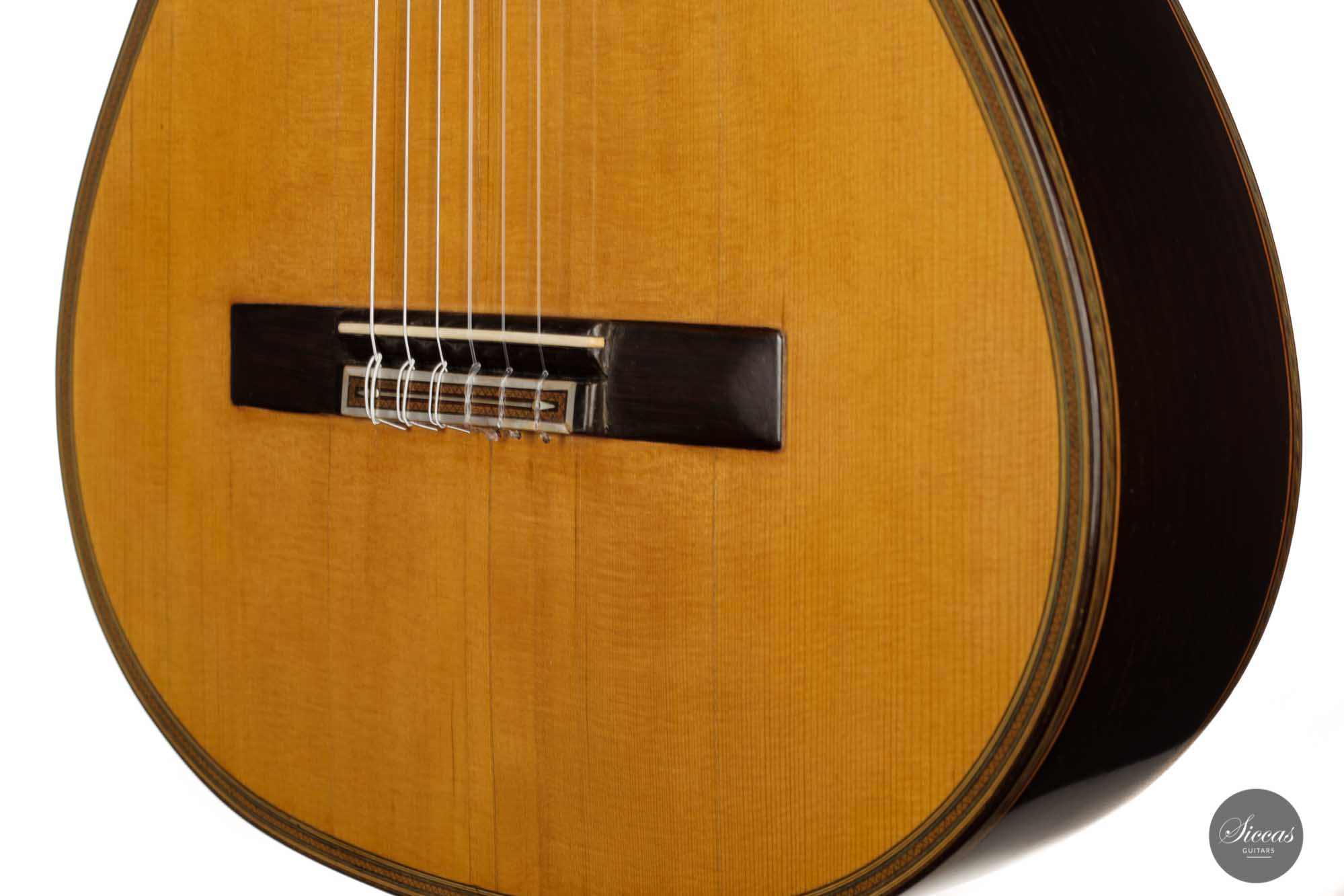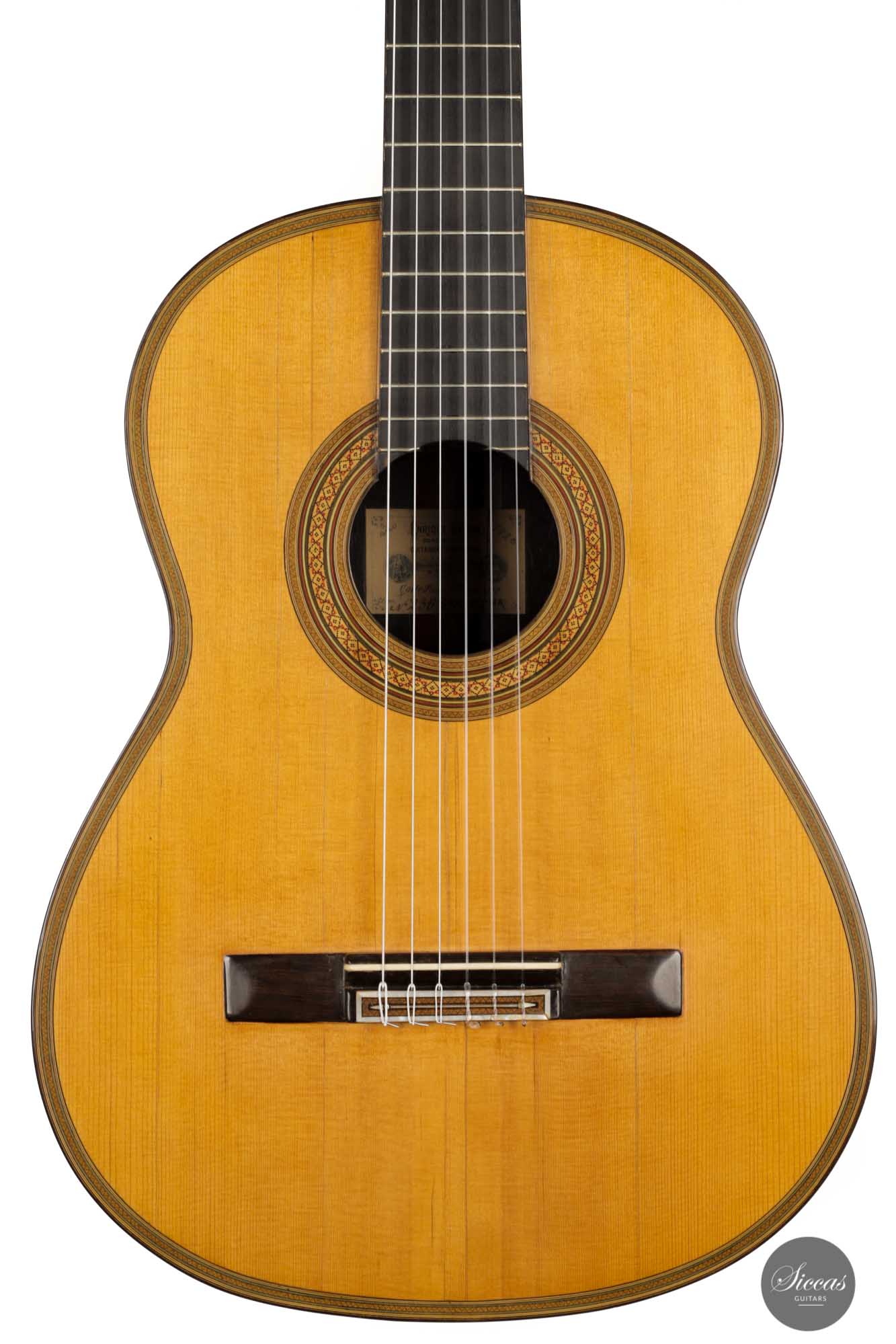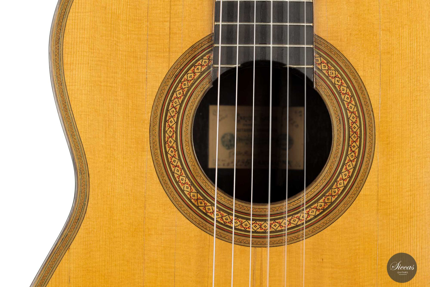 Diese 1920 gebaute Enrique-Garcia-Gitarre mit der Nummer 235 verkörpert die wesentlichen Merkmale der Gitarrenbauschule Barcelonas Anfang des 20. Jahrhunderts. FFür alle Liebhaber der katalanischen Ästhetik dieser Zeit gibt es kaum etwas Besseres, sowohl was den Klang als auch das Design betrifft. Dieses Instrument wurde gegen Ende der beruflichen Laufbahn von Enrique Garcia gebaut und ist ein seltenes, reich dekoriertes Modell. Die breite Rosette, die geschnitzte Kopfplatte, die kunstvollen Randeinlagen und das Mosaik auf der Kopfplatte machen es zu einem wahren Kunstwerk. Die eingefassten Mechaniken sind ein aufregendes Merkmal, das wir bei den Gitarren von Enrique Garcia nur selten bewundern konnten. Von vorn betrachtet sind sie völlig unsichtbar, was zeigt, mit wie viel Liebe zum Detail Enrique Garcia seine Instrumente gestaltete. DDiese Gitarre ist in ausgezeichnetem Zustand und hat einen gewaltigen Klang. Haarrisse in der Decke wurden fachmännisch restauriert, ein Riss am Boden wurde sorgfältig repariert, so dass diese außergewöhnlich seltene und sammelwürdige Gitarre nun bereit ist, gespielt und aufgezeichnet zu werden.