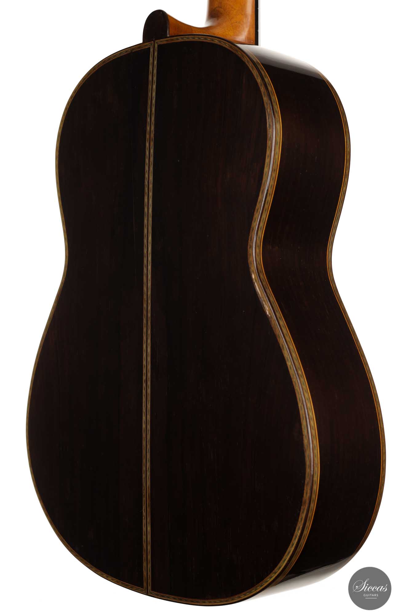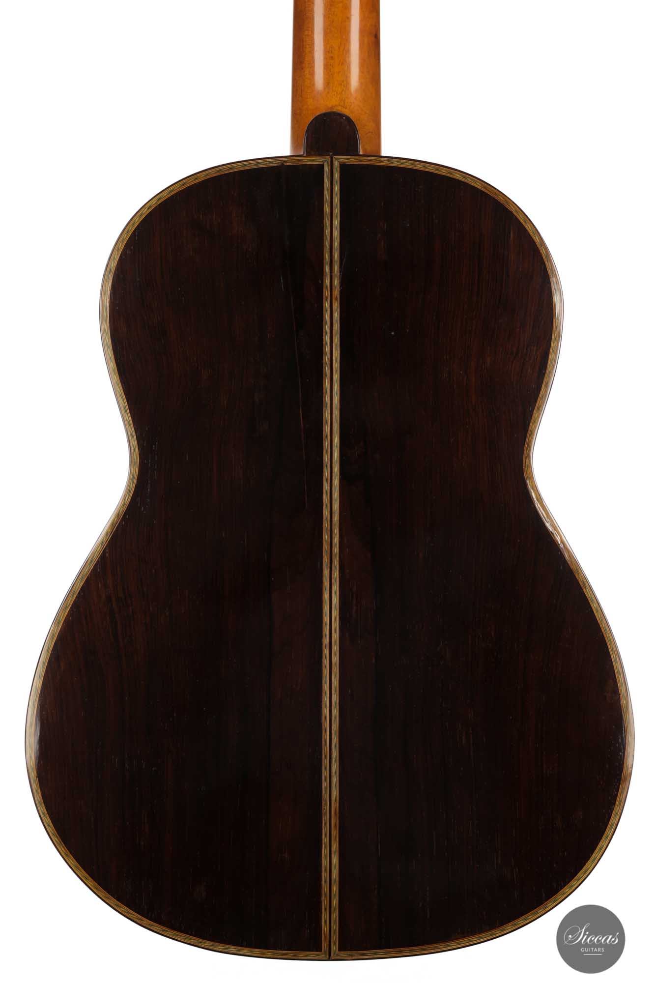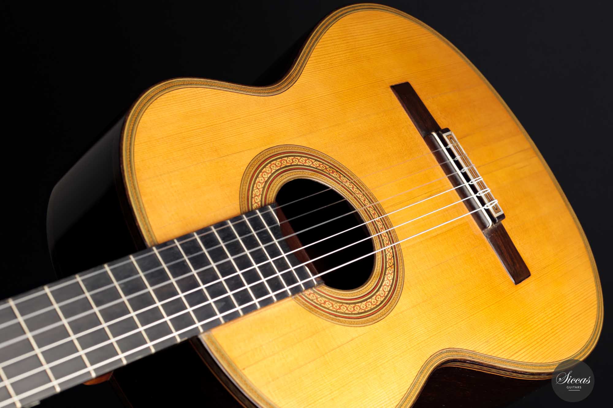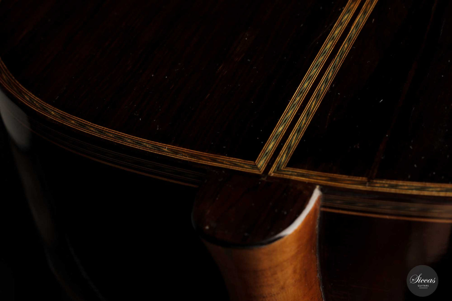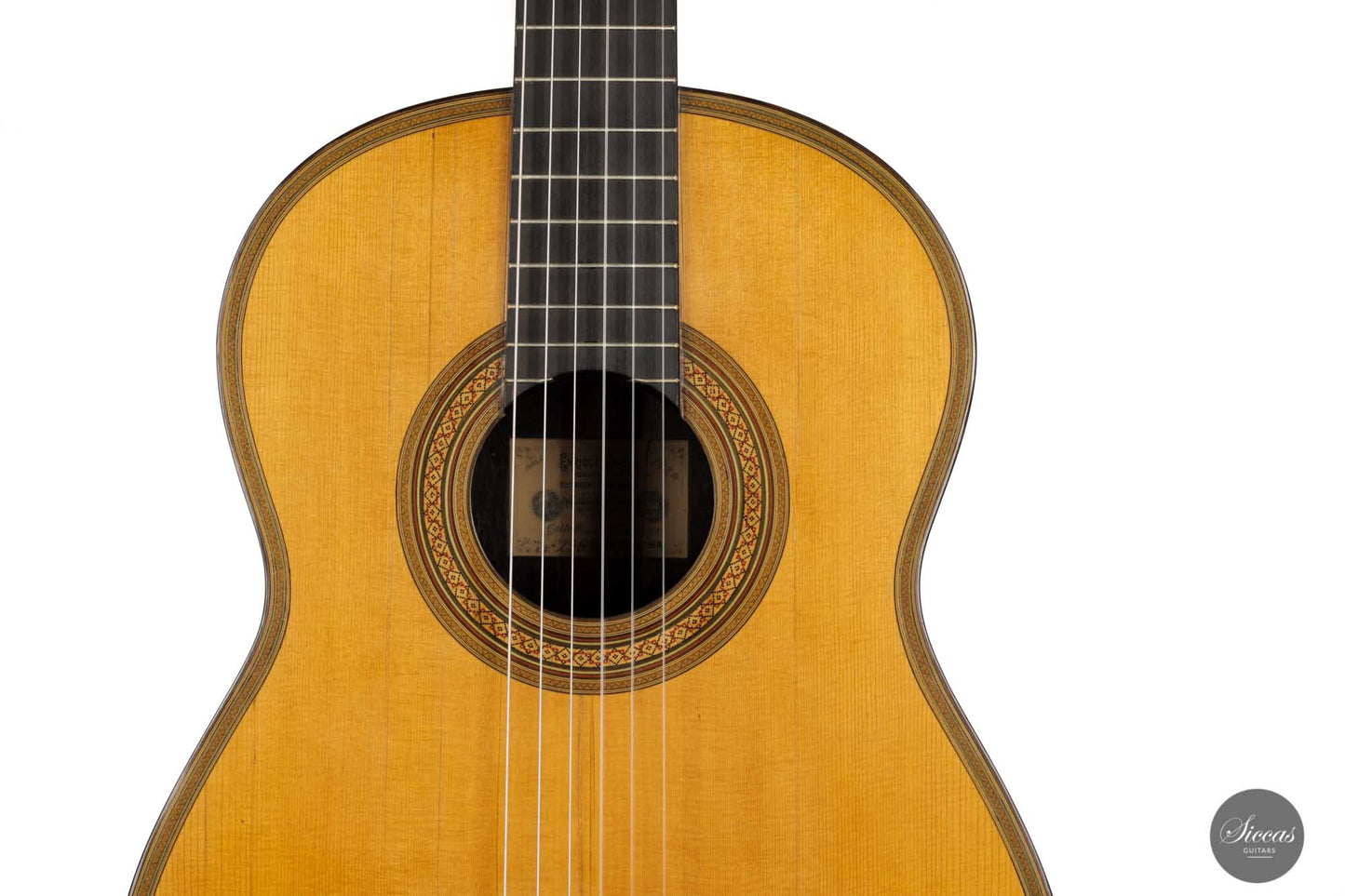 Diese 1920 gebaute Enrique-Garcia-Gitarre mit der Nummer 235 verkörpert die wesentlichen Merkmale der Gitarrenbauschule Barcelonas Anfang des 20. Jahrhunderts. FFür alle Liebhaber der katalanischen Ästhetik dieser Zeit gibt es kaum etwas Besseres, sowohl was den Klang als auch das Design betrifft. Dieses Instrument wurde gegen Ende der beruflichen Laufbahn von Enrique Garcia gebaut und ist ein seltenes, reich dekoriertes Modell. Die breite Rosette, die geschnitzte Kopfplatte, die kunstvollen Randeinlagen und das Mosaik auf der Kopfplatte machen es zu einem wahren Kunstwerk. Die eingefassten Mechaniken sind ein aufregendes Merkmal, das wir bei den Gitarren von Enrique Garcia nur selten bewundern konnten. Von vorn betrachtet sind sie völlig unsichtbar, was zeigt, mit wie viel Liebe zum Detail Enrique Garcia seine Instrumente gestaltete. DDiese Gitarre ist in ausgezeichnetem Zustand und hat einen gewaltigen Klang. Haarrisse in der Decke wurden fachmännisch restauriert, ein Riss am Boden wurde sorgfältig repariert, so dass diese außergewöhnlich seltene und sammelwürdige Gitarre nun bereit ist, gespielt und aufgezeichnet zu werden.